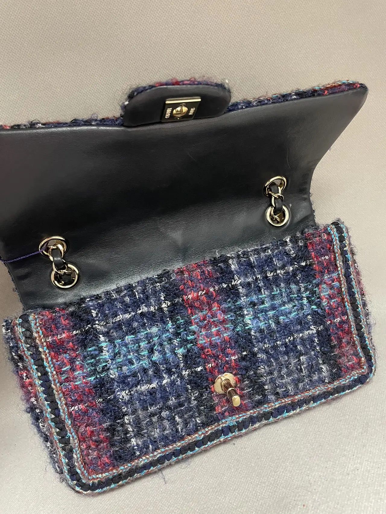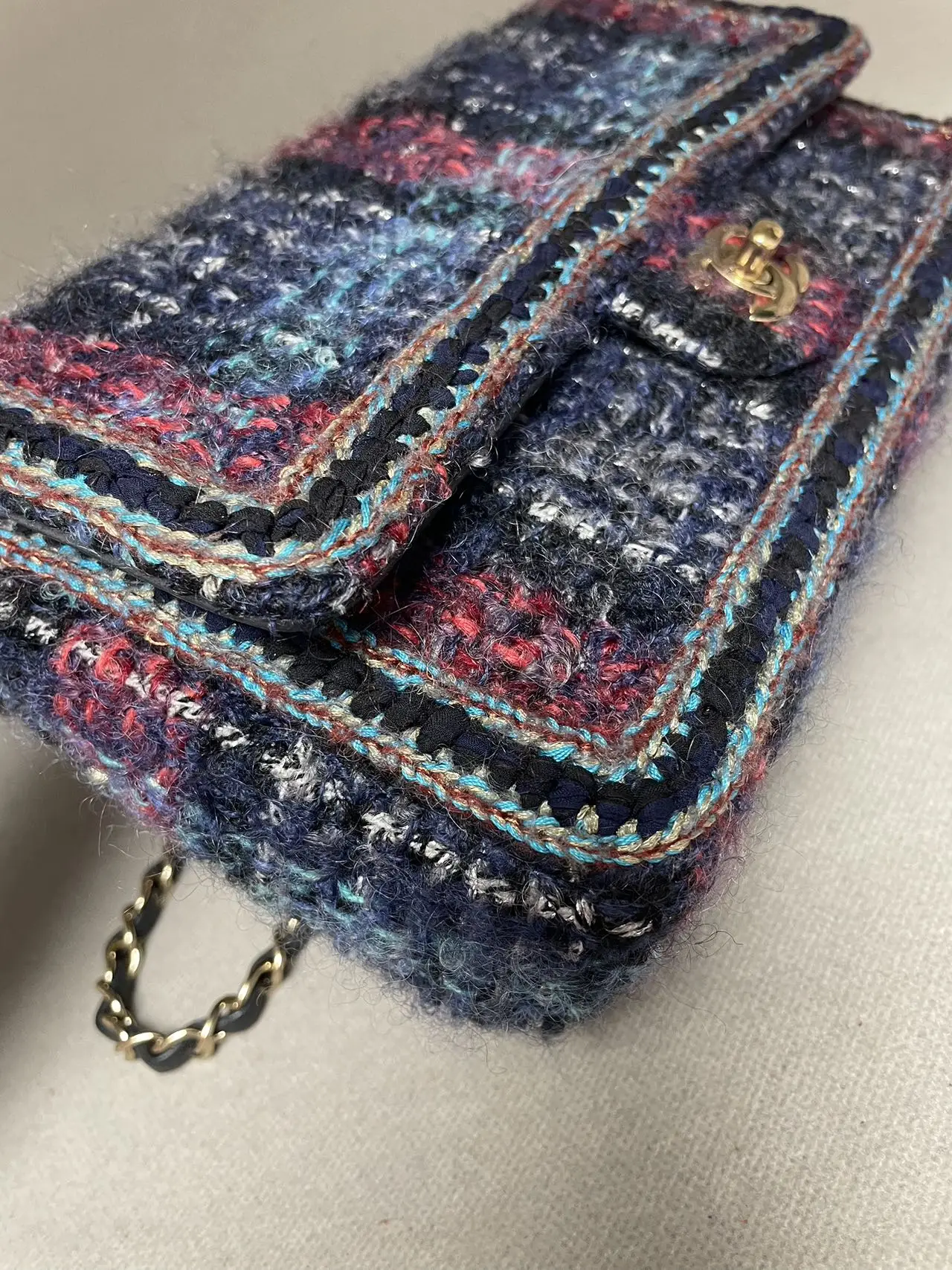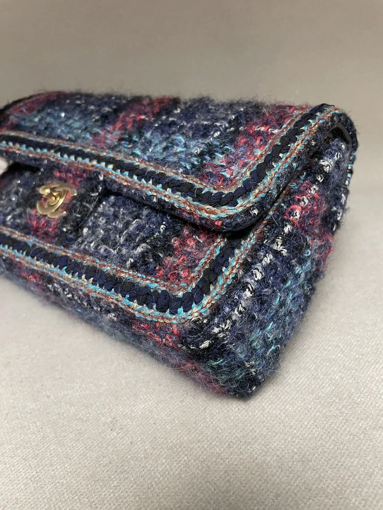The CHANEL Medium Classic Double Flap Bag in blue multicolor tweed with gold-tone hardware is a masterpiece of artisanal craftsmanship, where the iconic dual-flap silhouette and diamond quilting are reimagined in vibrant woven tweed, creating a unique statement of textured, seasonal luxury.