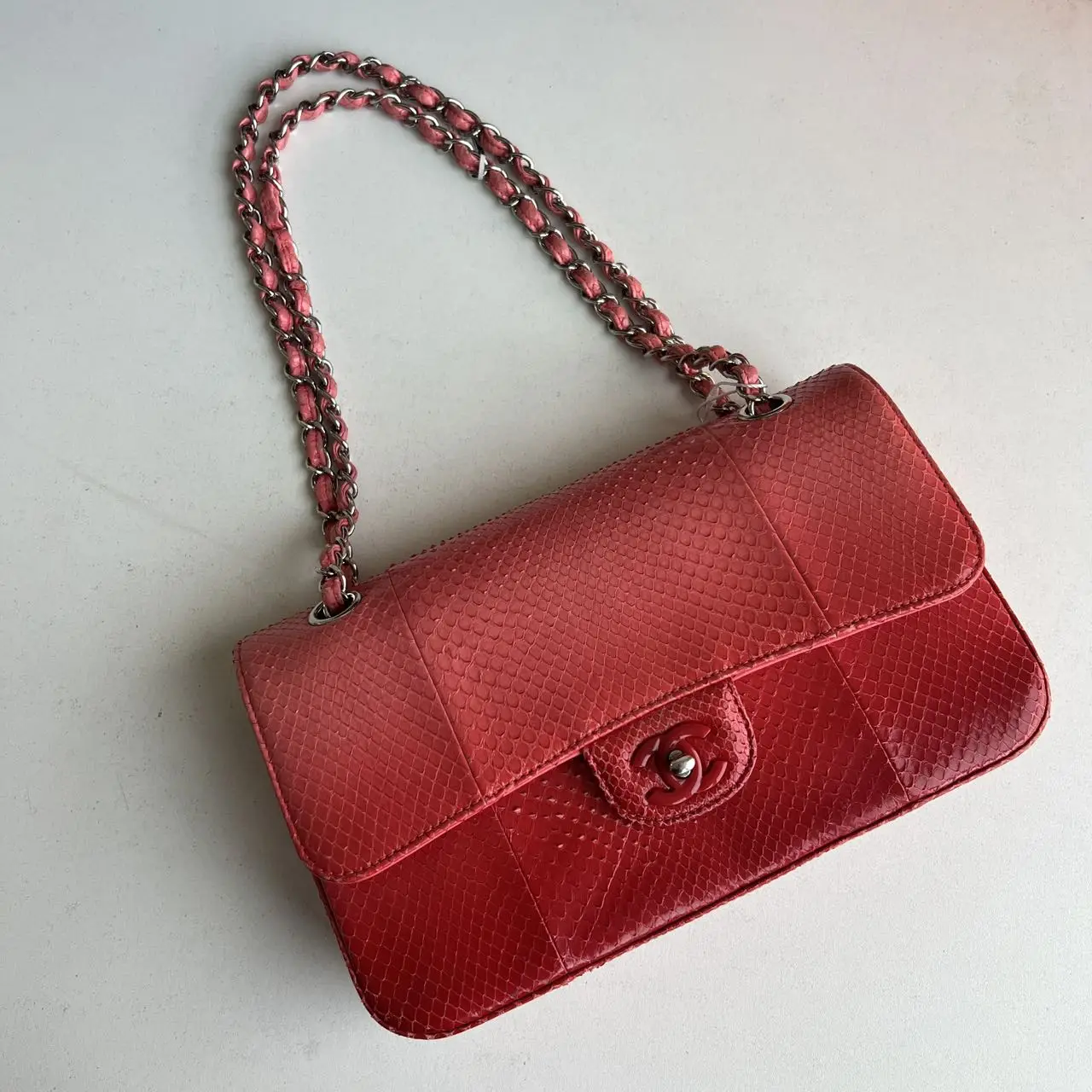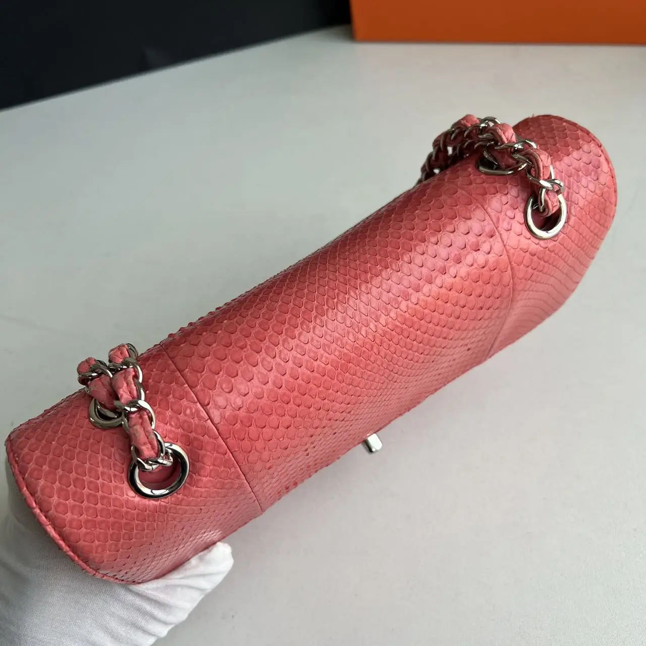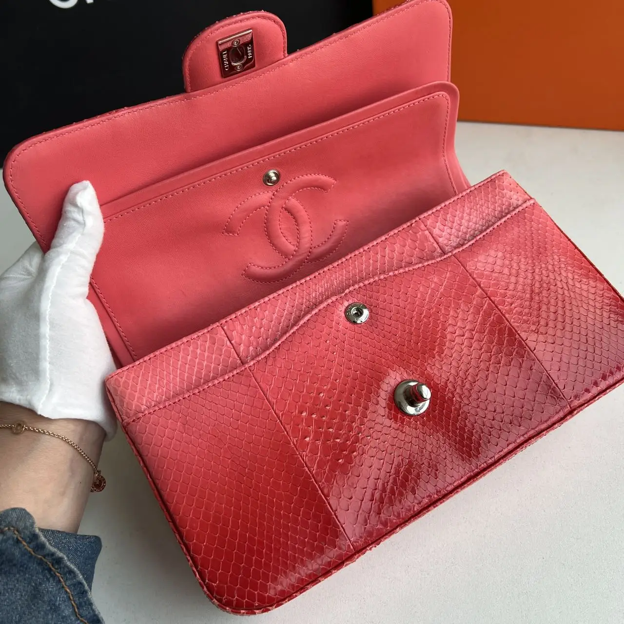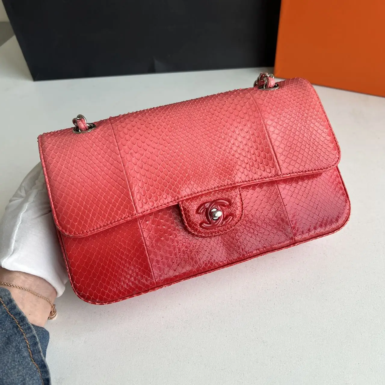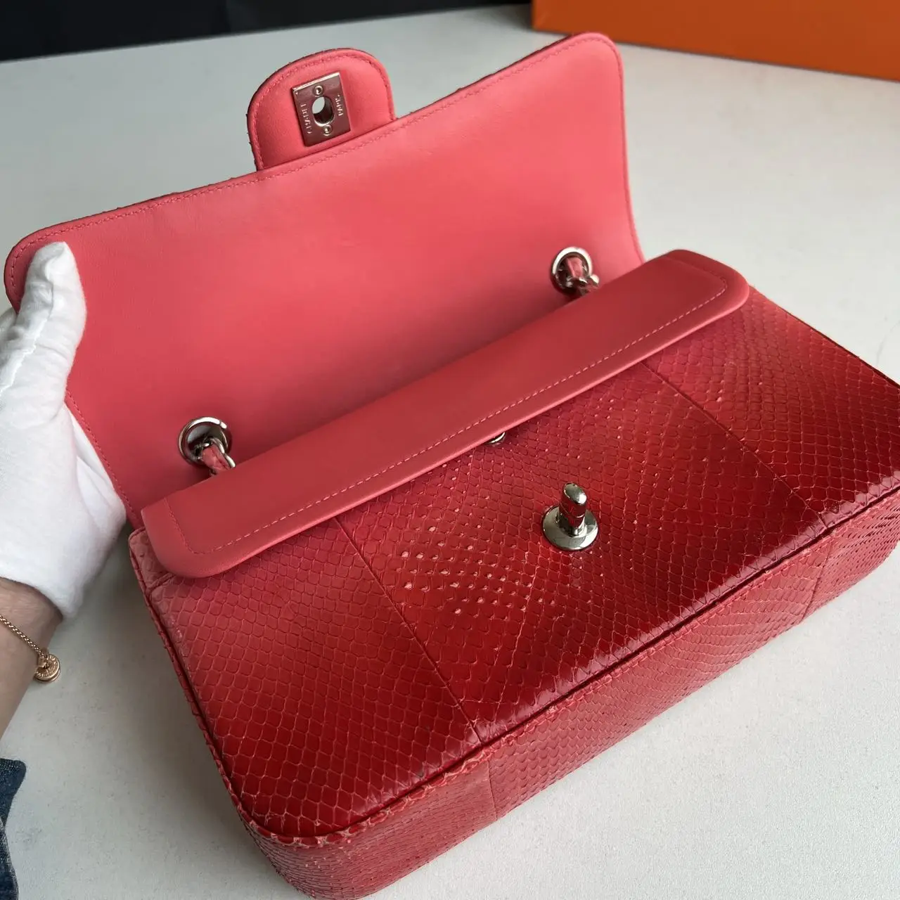 The CHANEL Medium Classic Double Flap Bag in pink ombré python is an exquisite and rare statement piece, where the iconic dual-flap silhouette and diamond quilting are rendered in the luminous, color-shifting texture of exotic python, offering a breathtaking fusion of timeless elegance and modern glamour.