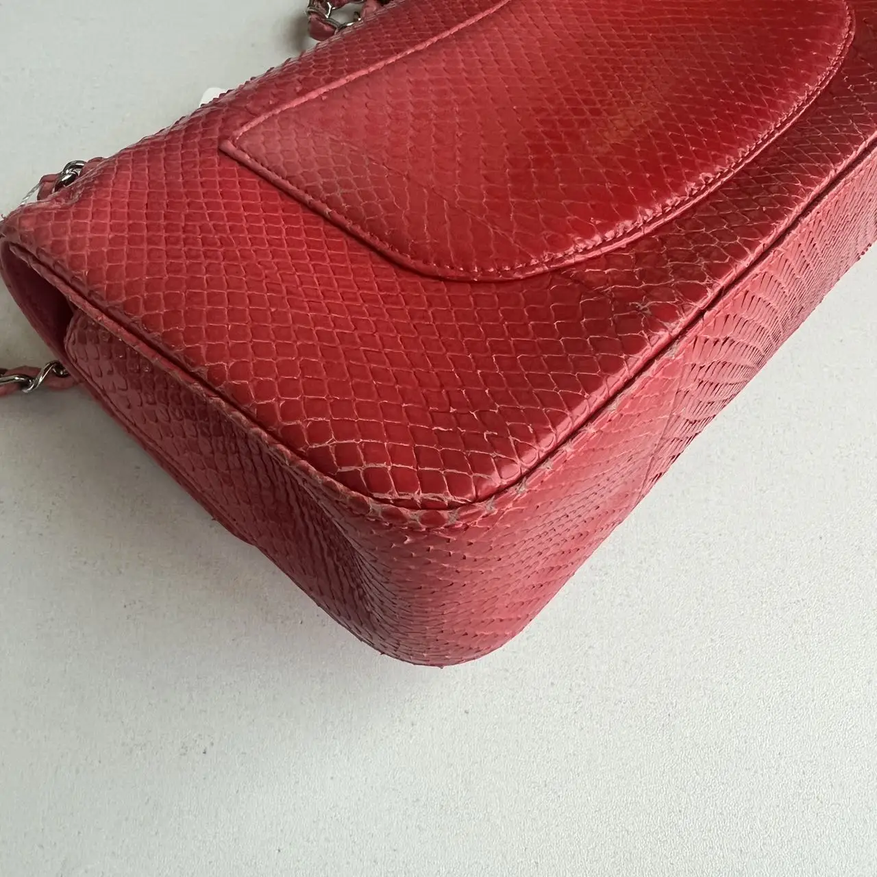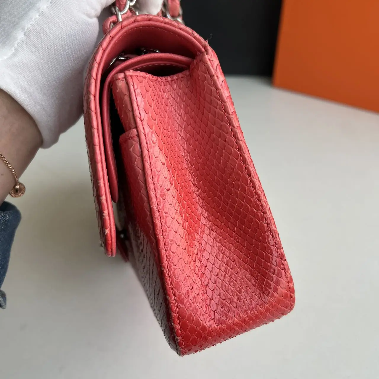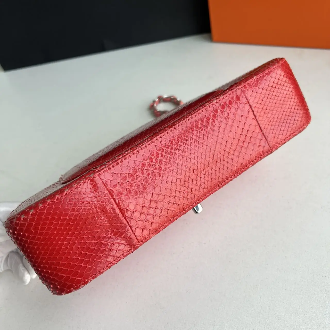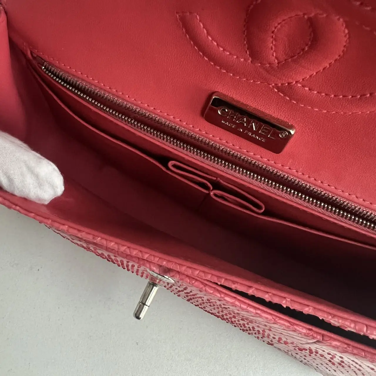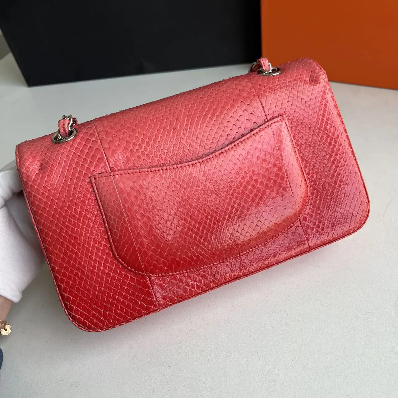 The CHANEL Medium Classic Double Flap Bag in pink ombré python is an exquisite and rare statement piece, where the iconic dual-flap silhouette and diamond quilting are rendered in the luminous, color-shifting texture of exotic python, offering a breathtaking fusion of timeless elegance and modern glamour.