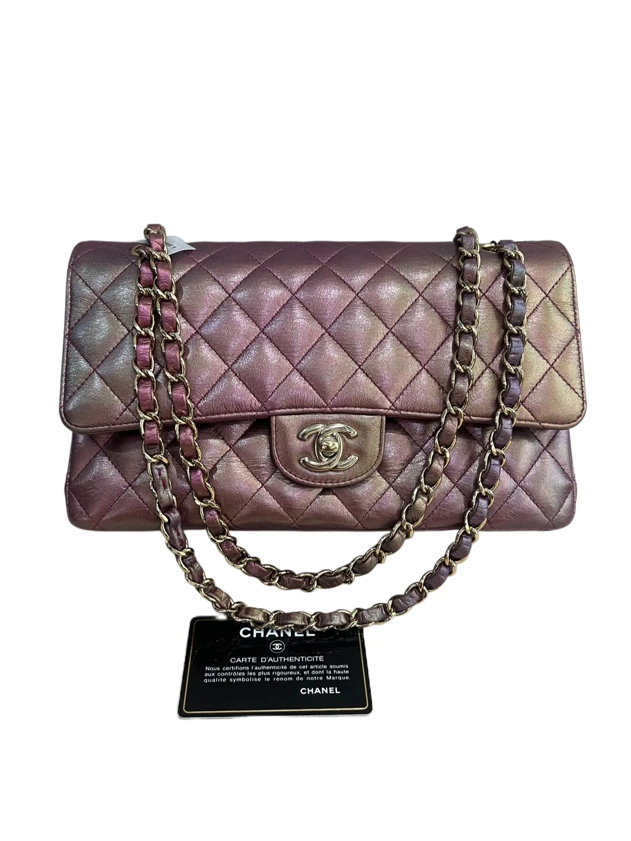 This Chanel Medium Classic Double Flap is crafted from stunning iridescent purple quilted leather with gold hardware. A rare and eye-catching variation of the iconic Chanel design, combining timeless elegance with a unique metallic sheen.