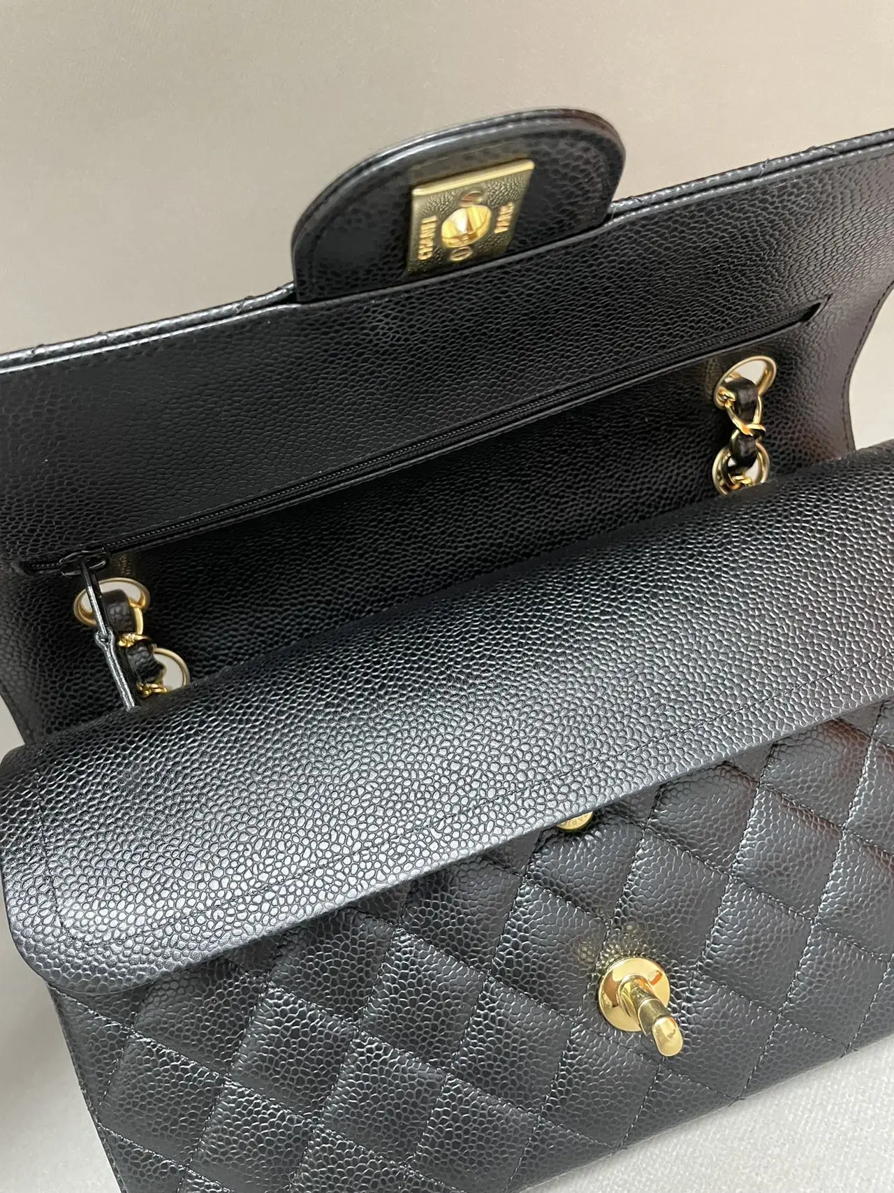 The CHANEL Medium Classic Double Flap Bag in black caviar leather is the quintessential icon of timeless luxury, defined by its structured dual-flap design, durable diamond-quilted texture, and the gleaming interlocking CC turn-lock, offering unparalleled elegance and sophistication. Product details • Brand: Chanel • Model: Classic Flap • Medium Size • Material:  Caviar leather • …