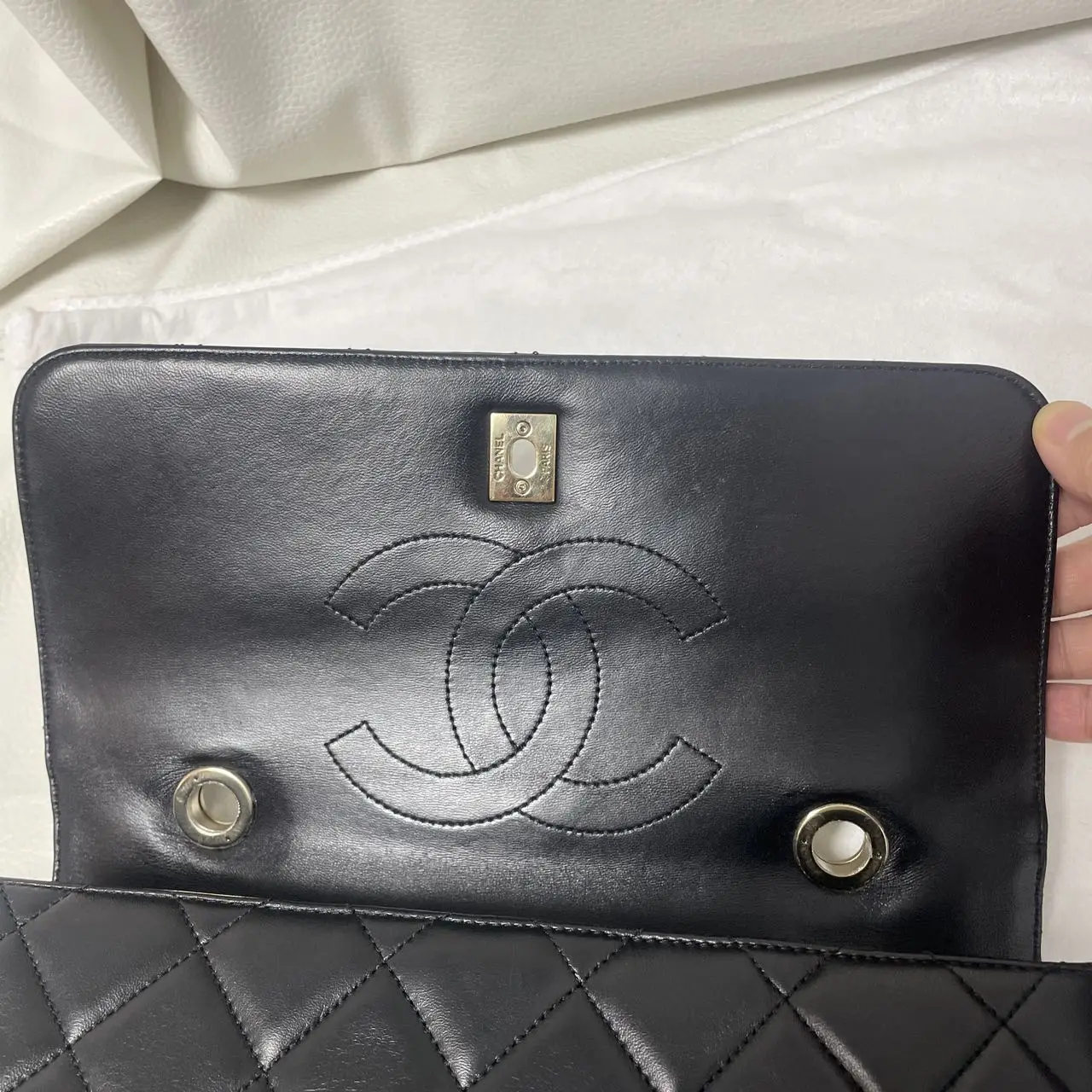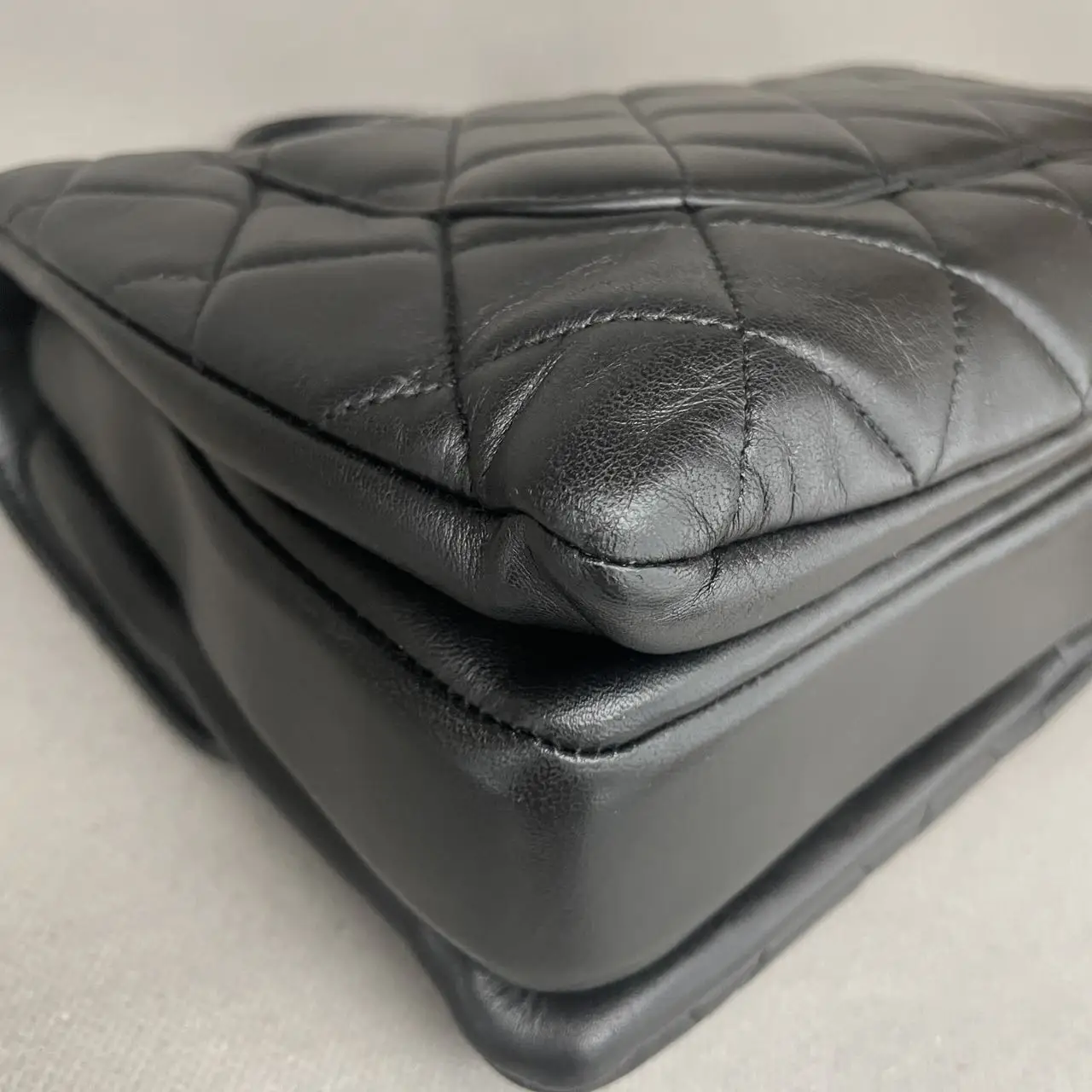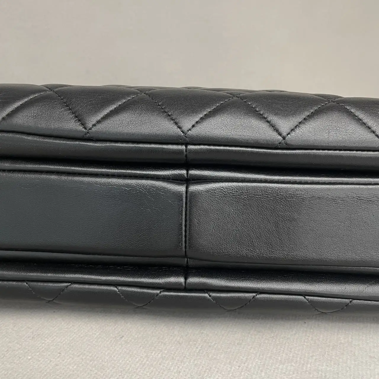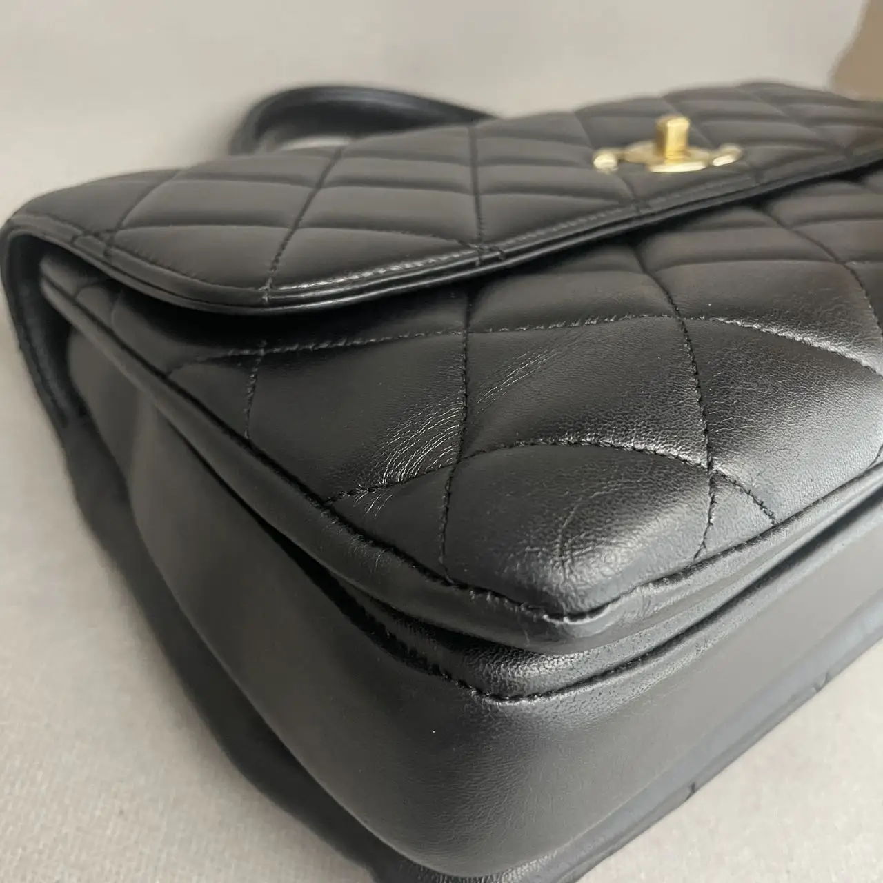 The CHANEL Medium Trendy CC Top Handle Bag in black lambskin combines a structured silhouette, iconic quilted leather, and a signature CC turn-lock closure, offering timeless sophistication for modern elegance.