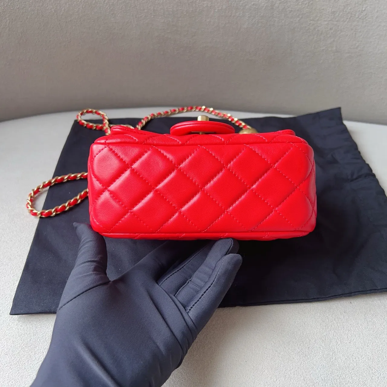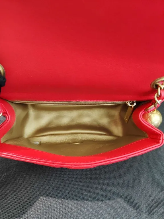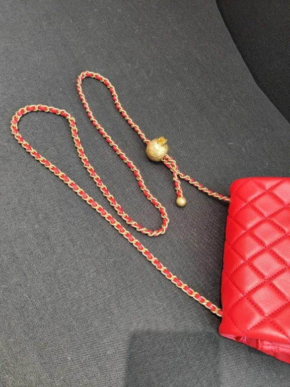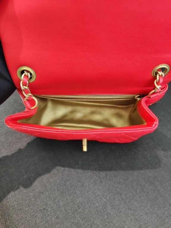 The CHANEL Mini Rectangular Classic Flap in red lambskin presents the iconic diamond-quilted design and interlocking CC turn-lock in a fresh, vibrant hue, offering a timeless yet modern accessory.