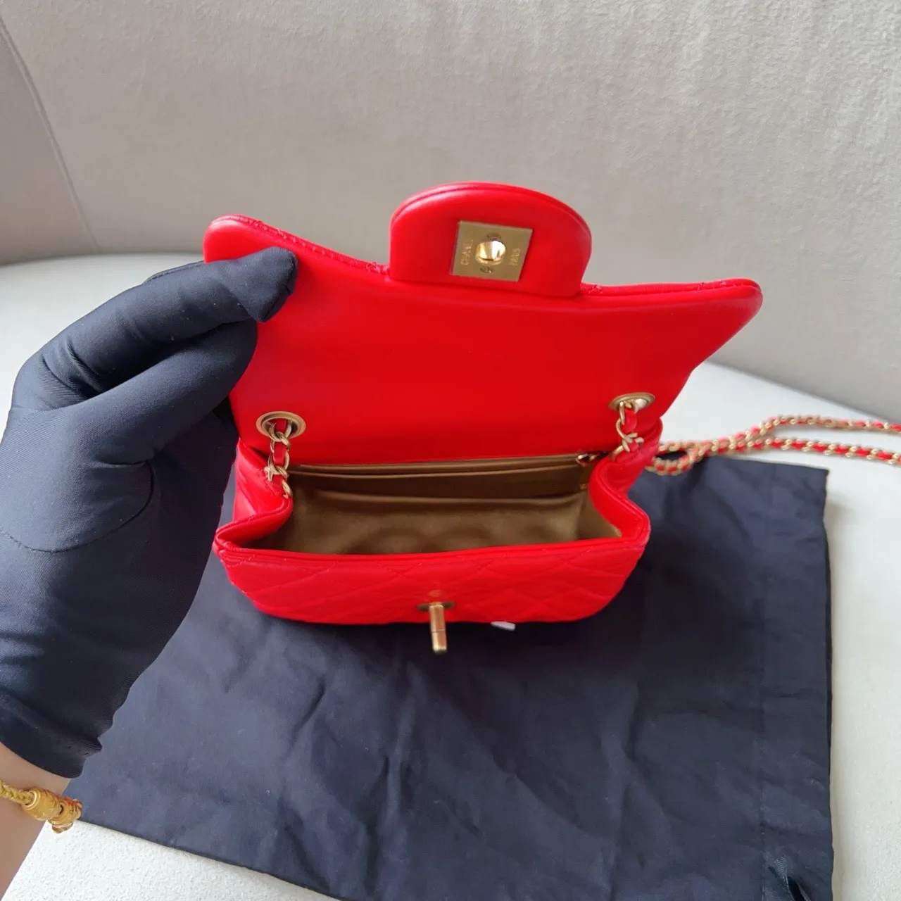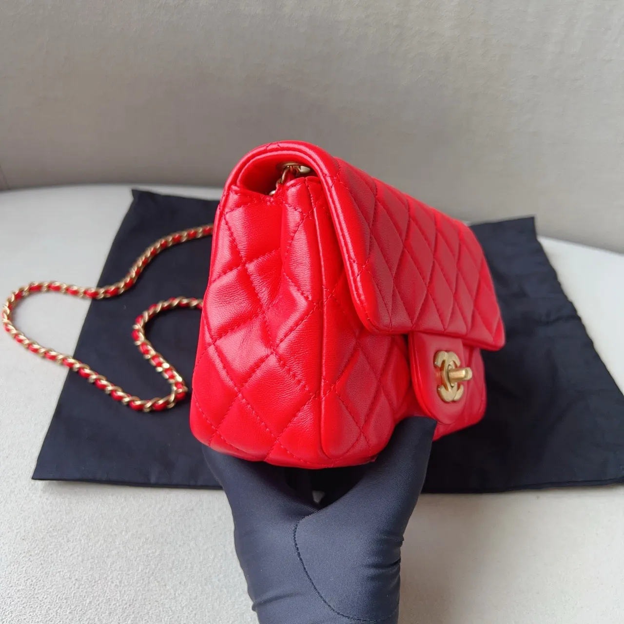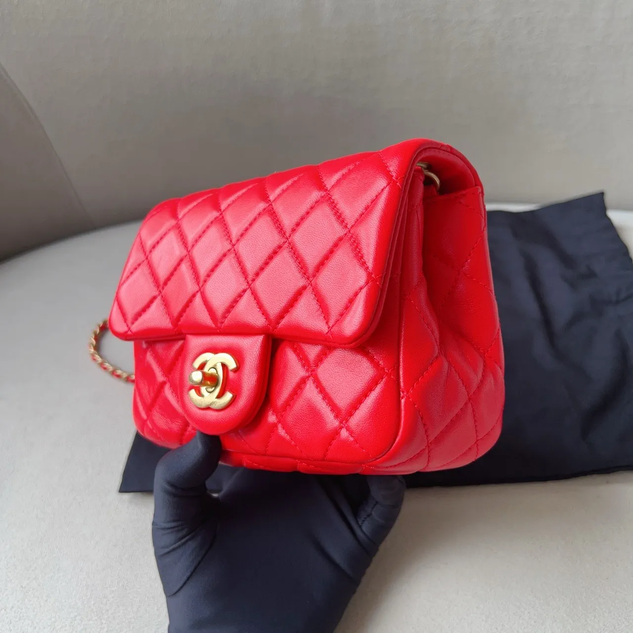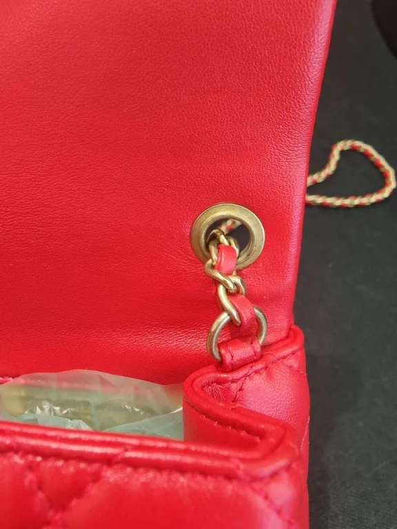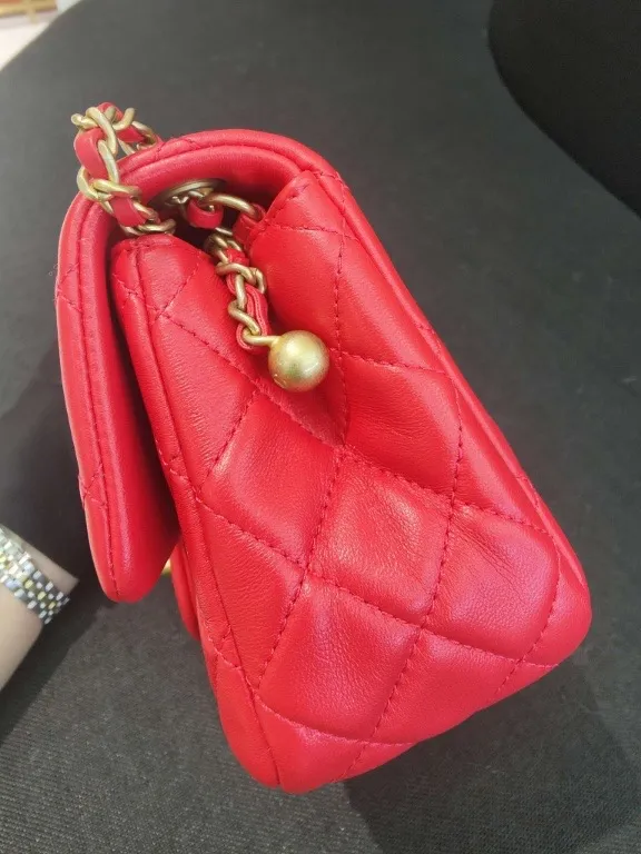 A highly sought-after CHANEL Mini Rectangular Flap in red lambskin, offered at an exceptional UK price of £3300.