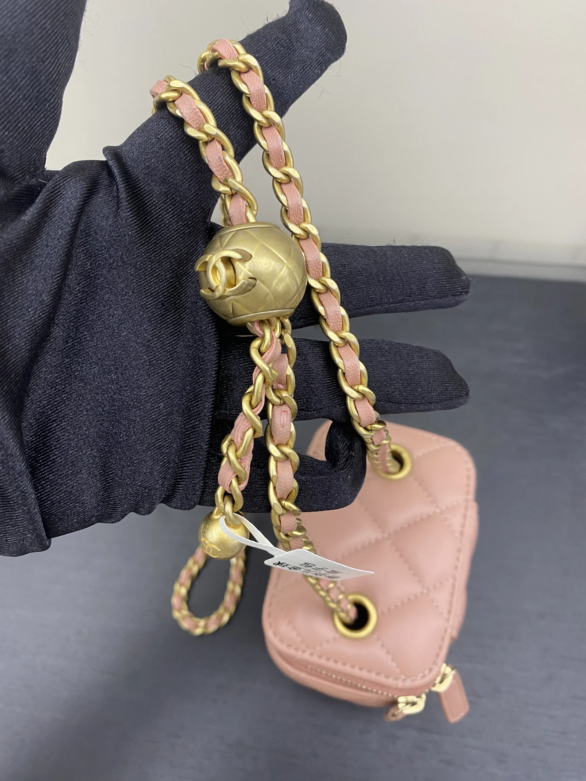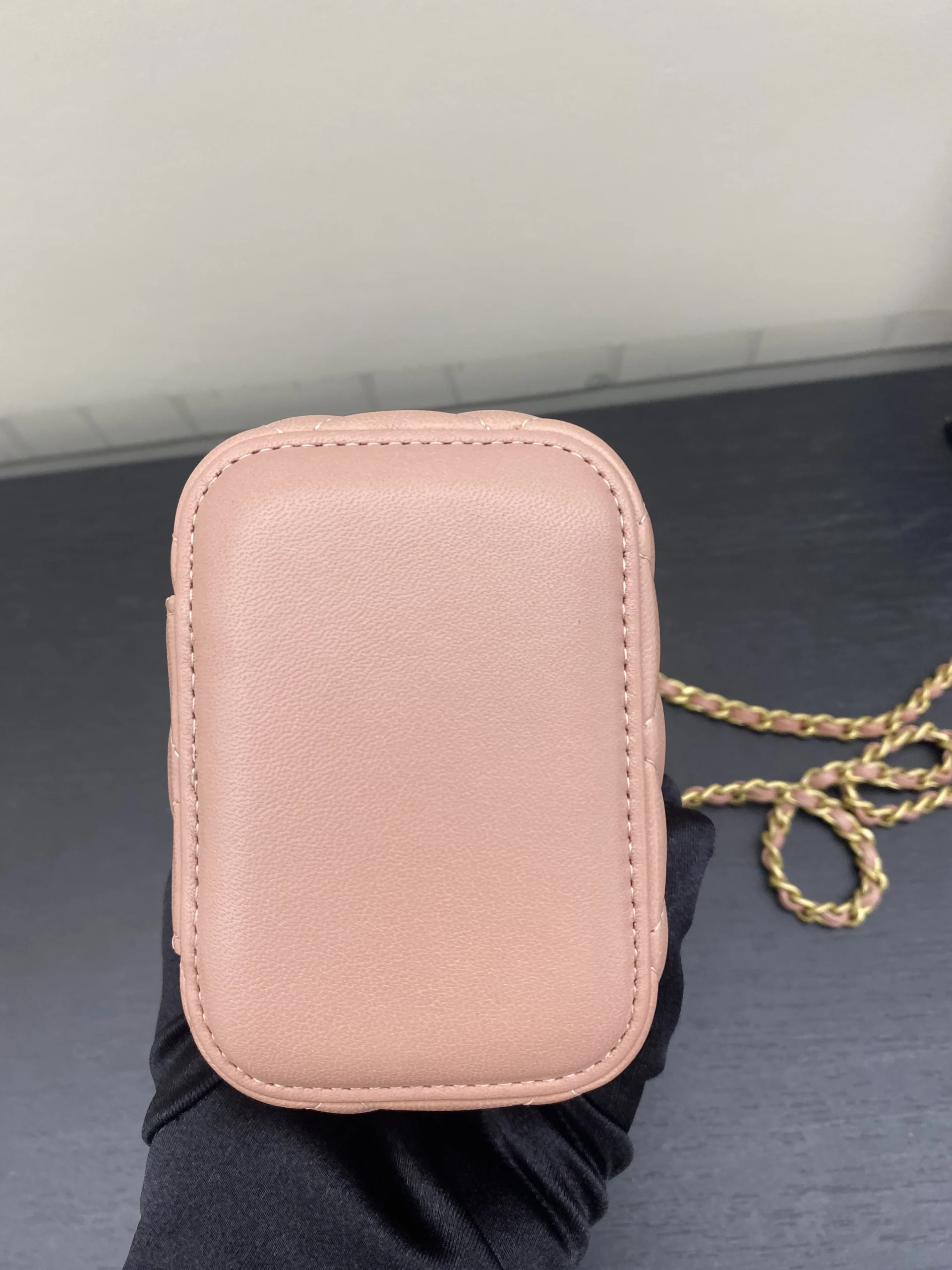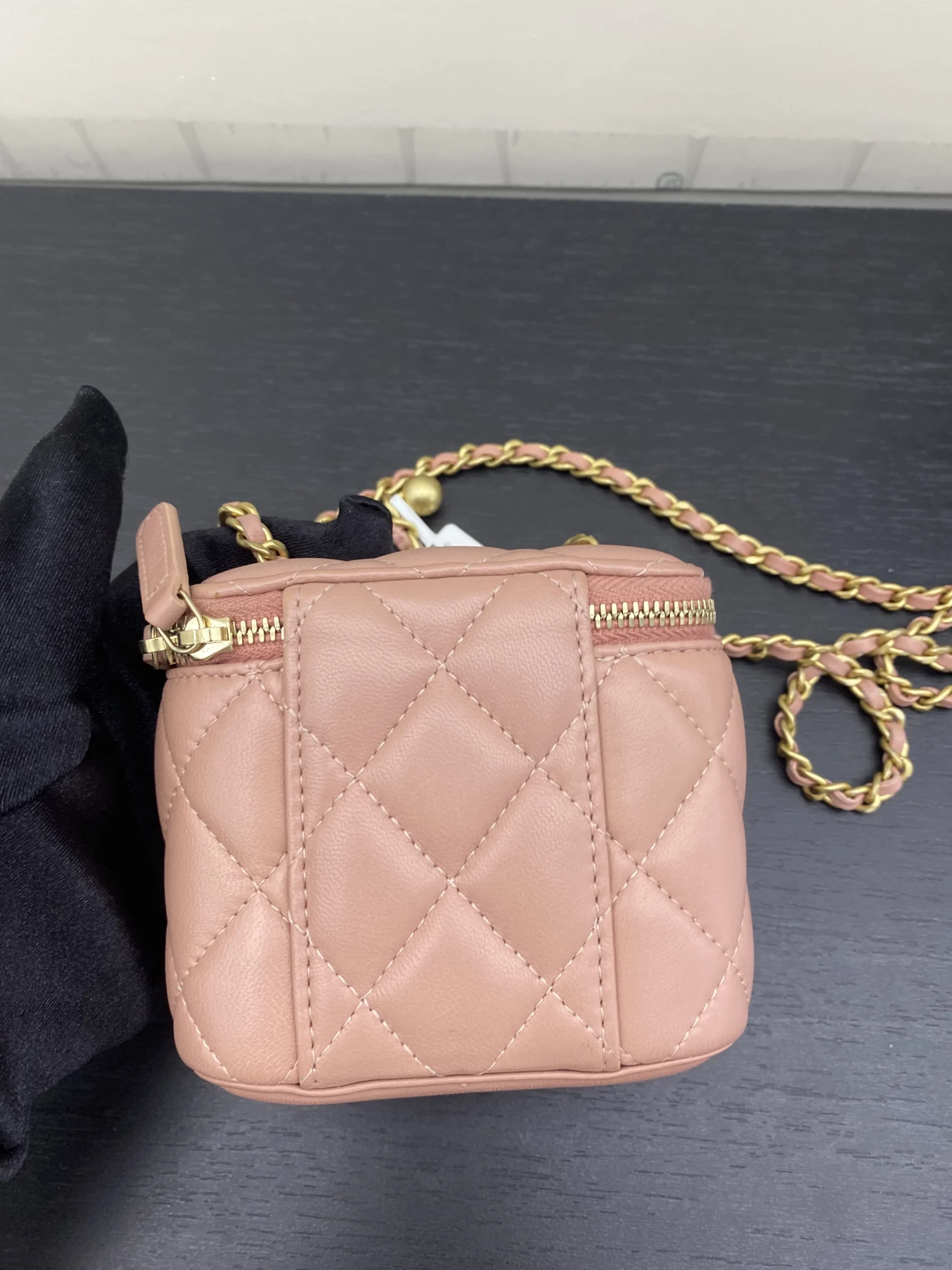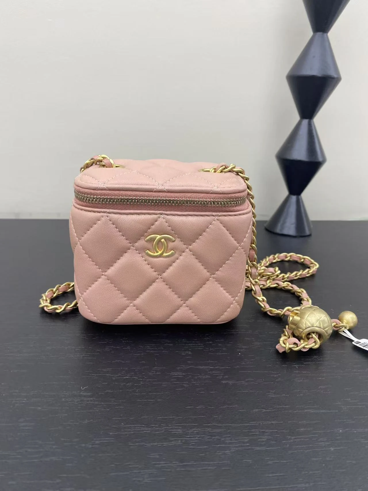 Chanel Vanity Case Pink Lambskin Gold Ball Chain Bag is a highly sought-after modern classic, blending iconic design with playful versatility.Crafted from soft quilted lambskin in a vibrant pink tone, this compact vanity bag features the signature CC logo and an elegant gold ball-adjustable chain, allowing flexible wear as a shoulder or crossbody bag. The structured box silhouette offers a chic yet practical interior, perfect for daily essentials or evening styling.