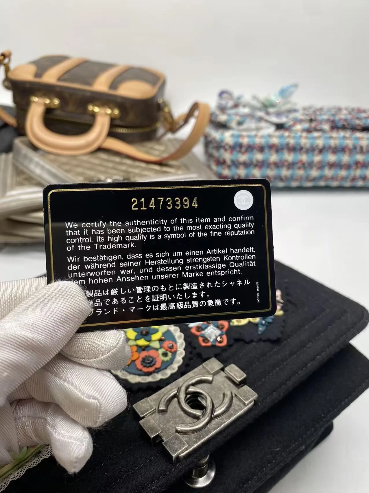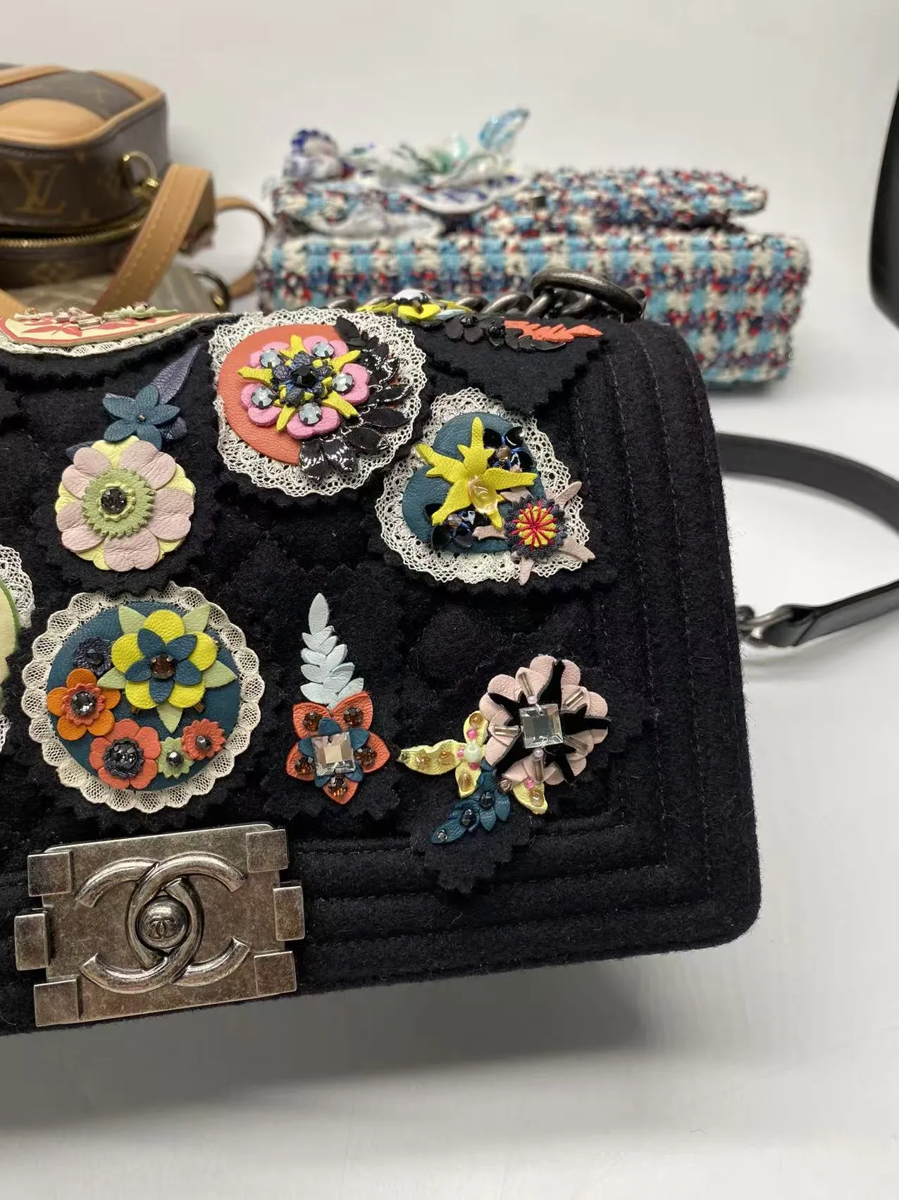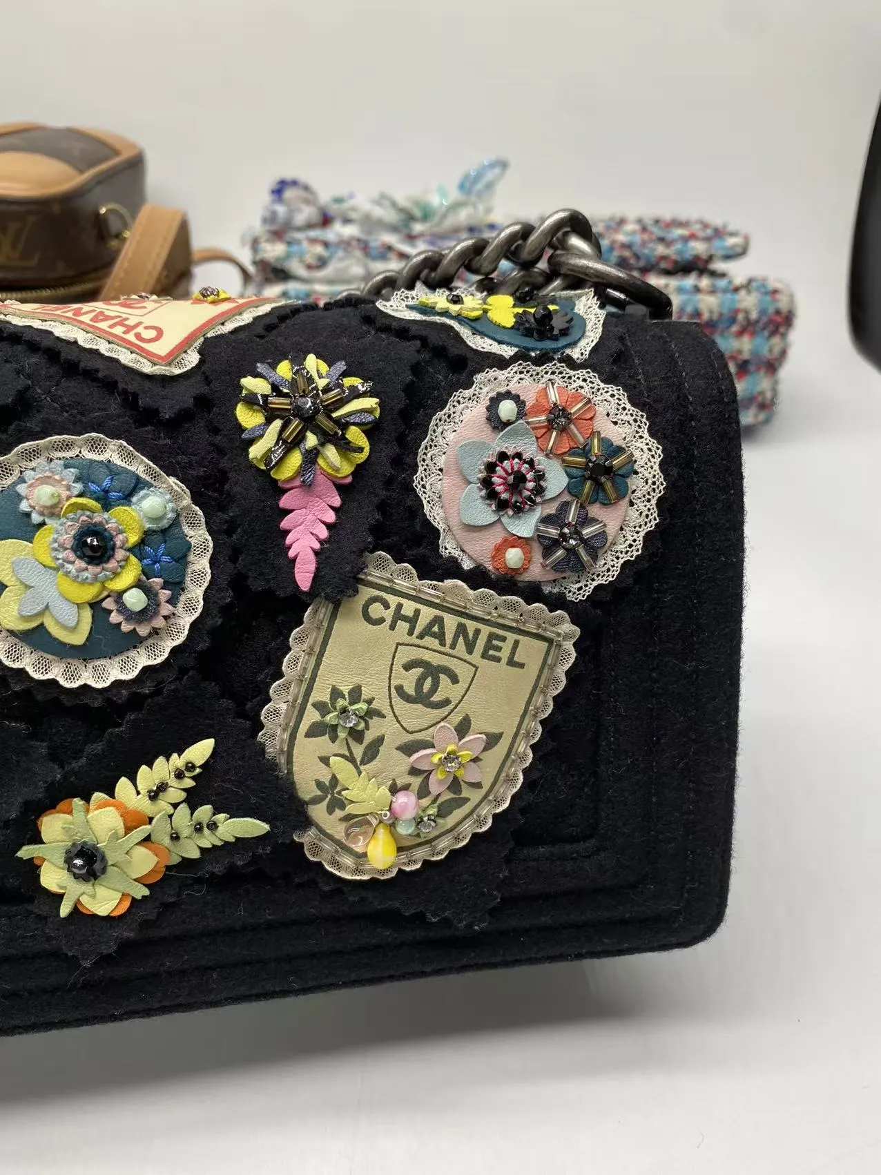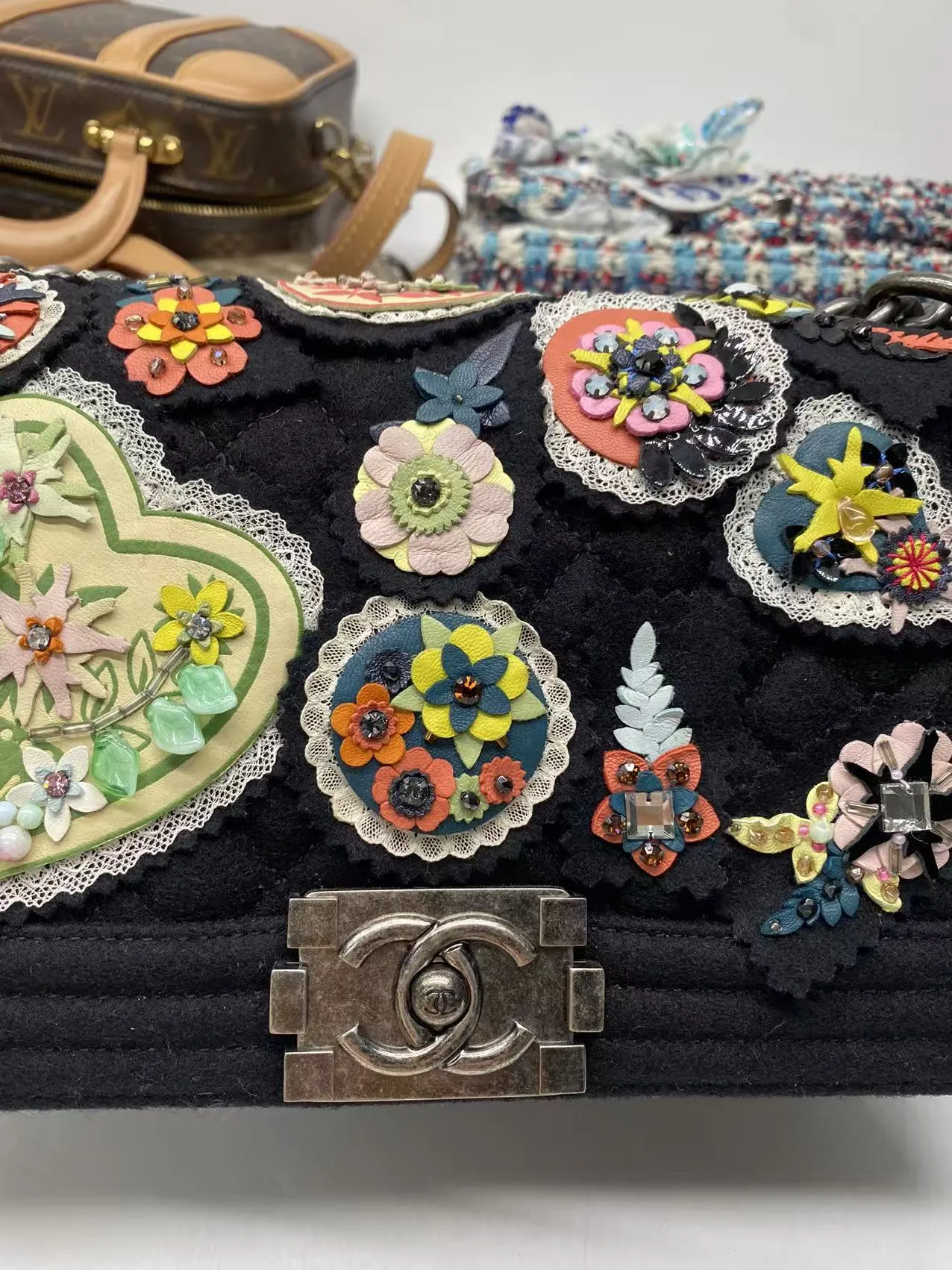 • Chanel Paris-Salzburg Metiers D’Art Boy Flap Bag with Embellishments. Silver tone hardware with push lock double C closure