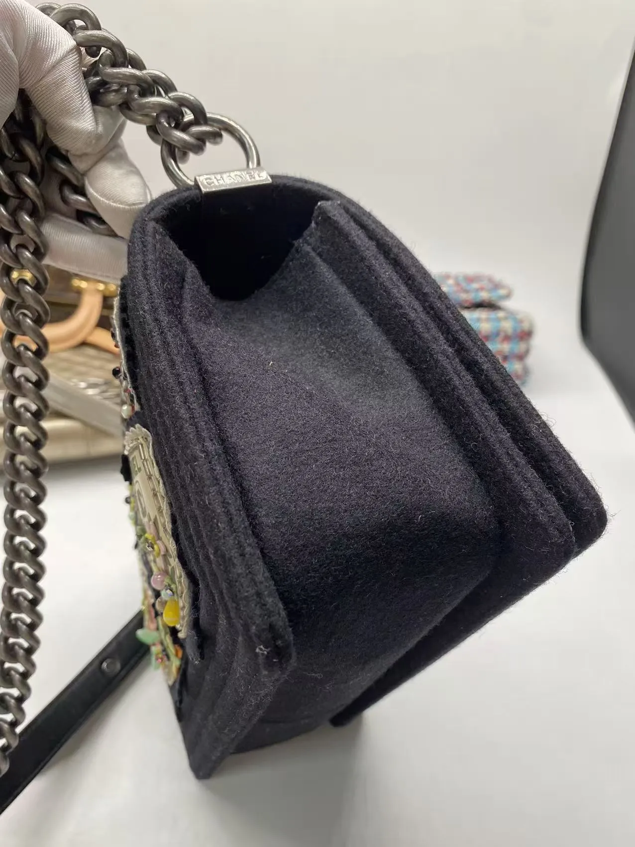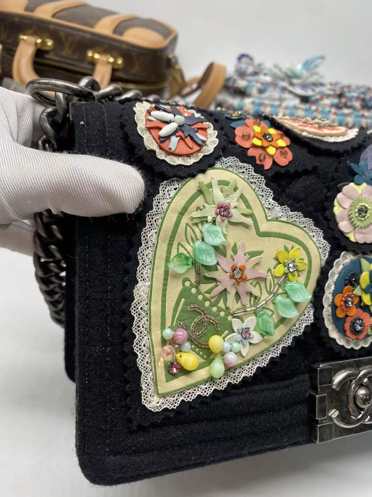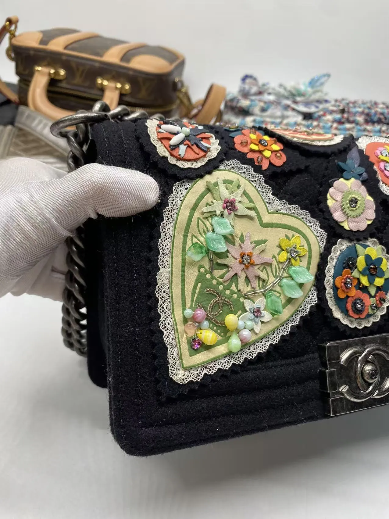 The CHANEL Paris-Salzburg Medium Boy Bag New is an rare 2015 Collector’s Edition. A rare piece of fashion history with this brand new Chanel Boy Bag. Hand-finished by artisans, it features a unique embroidered quilted felt exterior and gunmetal hardware, ensuring a look you won’t find elsewhere. This complete collector’s item, made in France, is offered at £3,999.