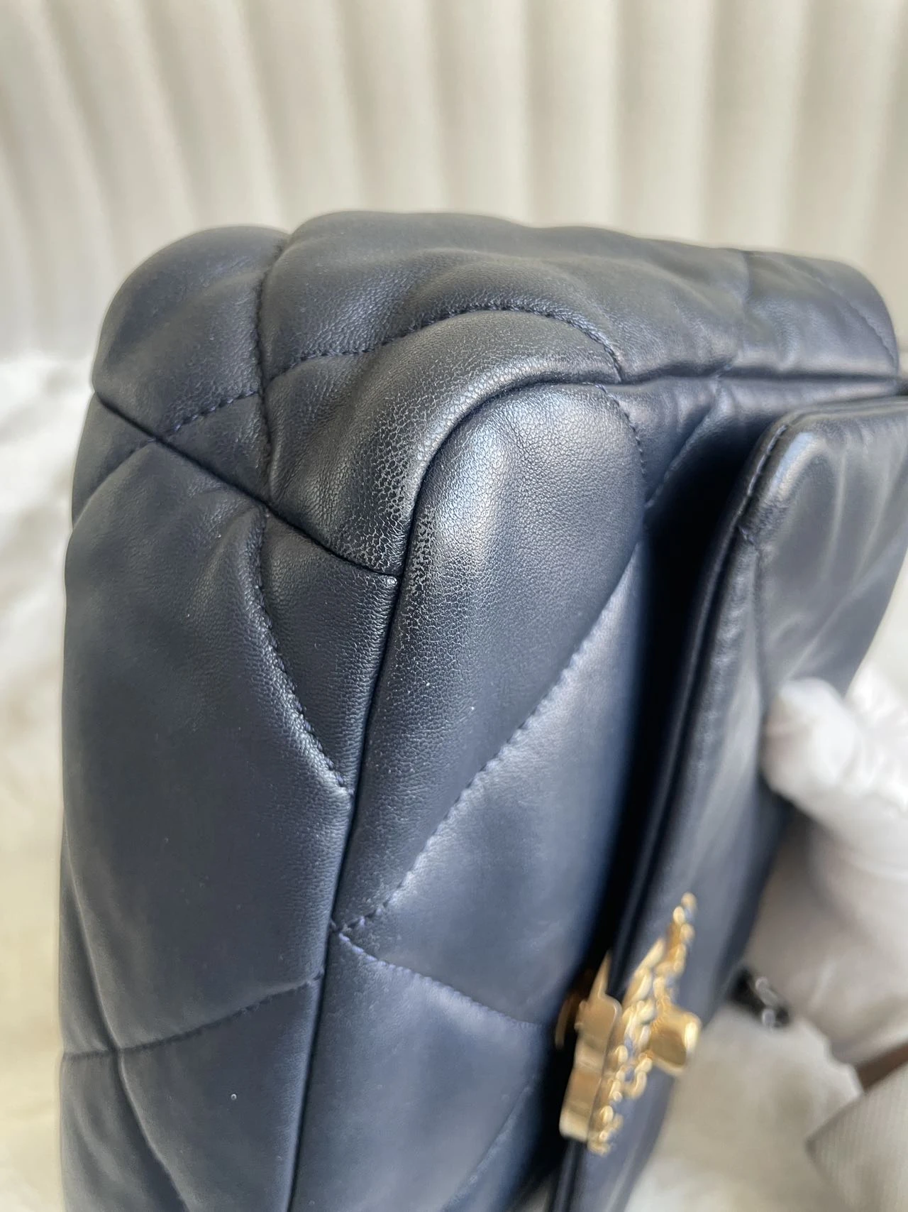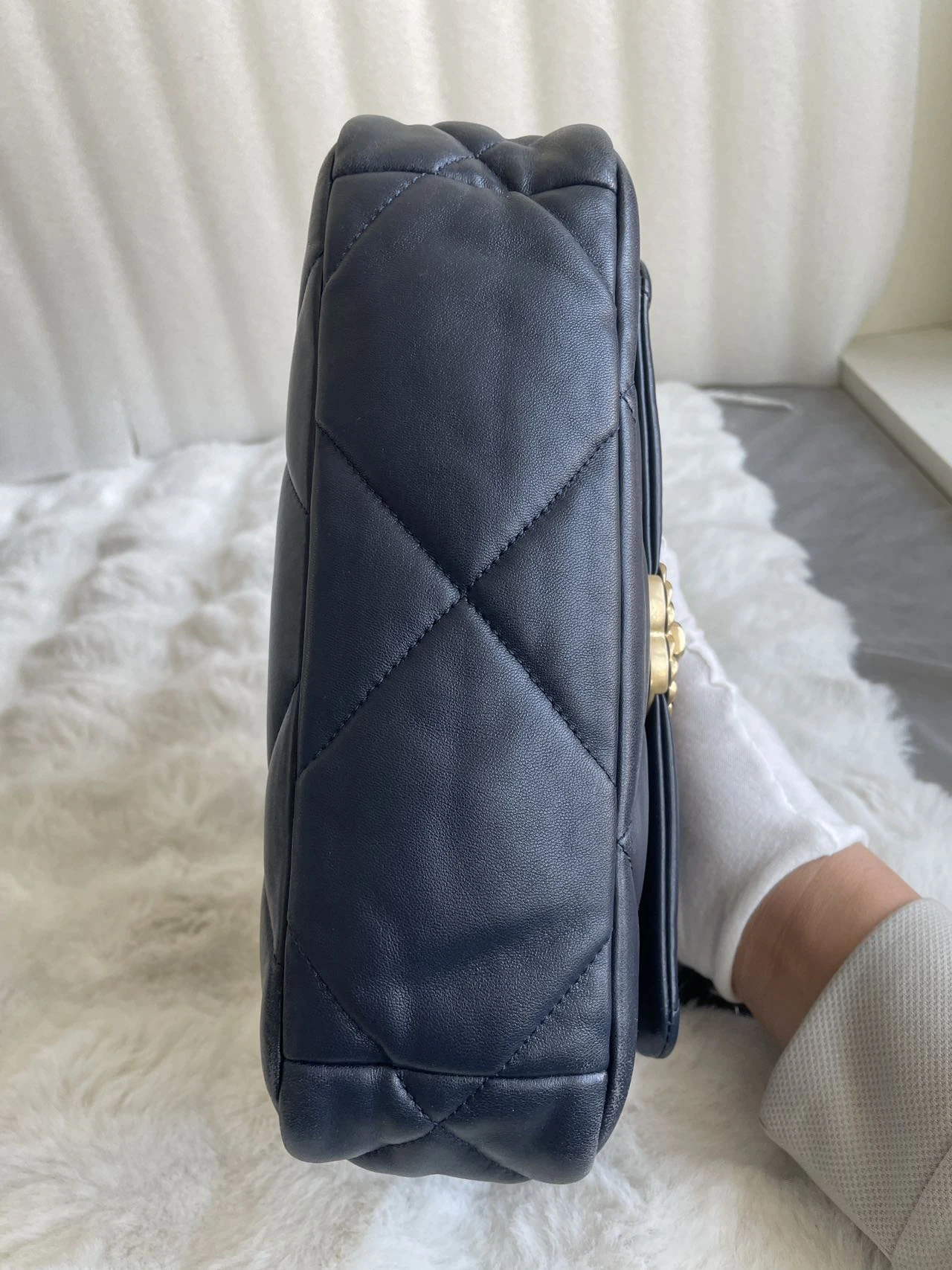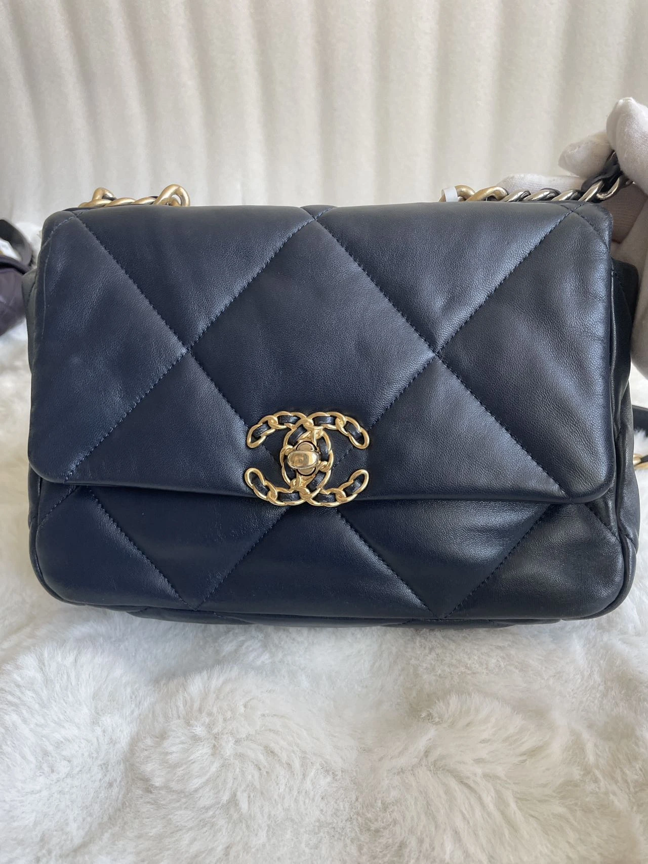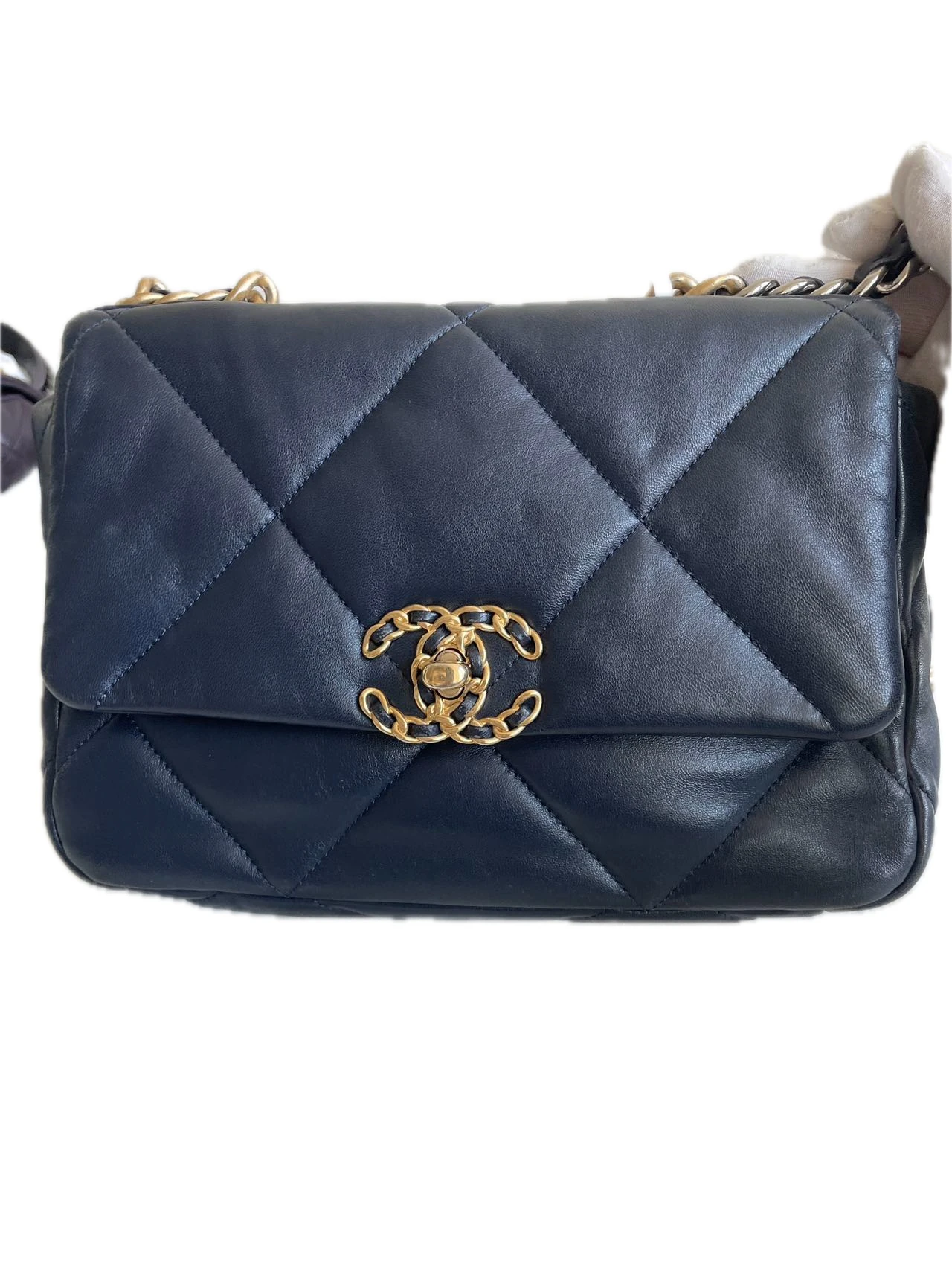 CHANEL Small 19 Navy Blue Lambskin Handbag features a deep navy blue lambskin that gives off a soft, luxurious sheen. This compact yet chic bag retains the iconic quilted pattern while embodying a modern, effortless elegance.
