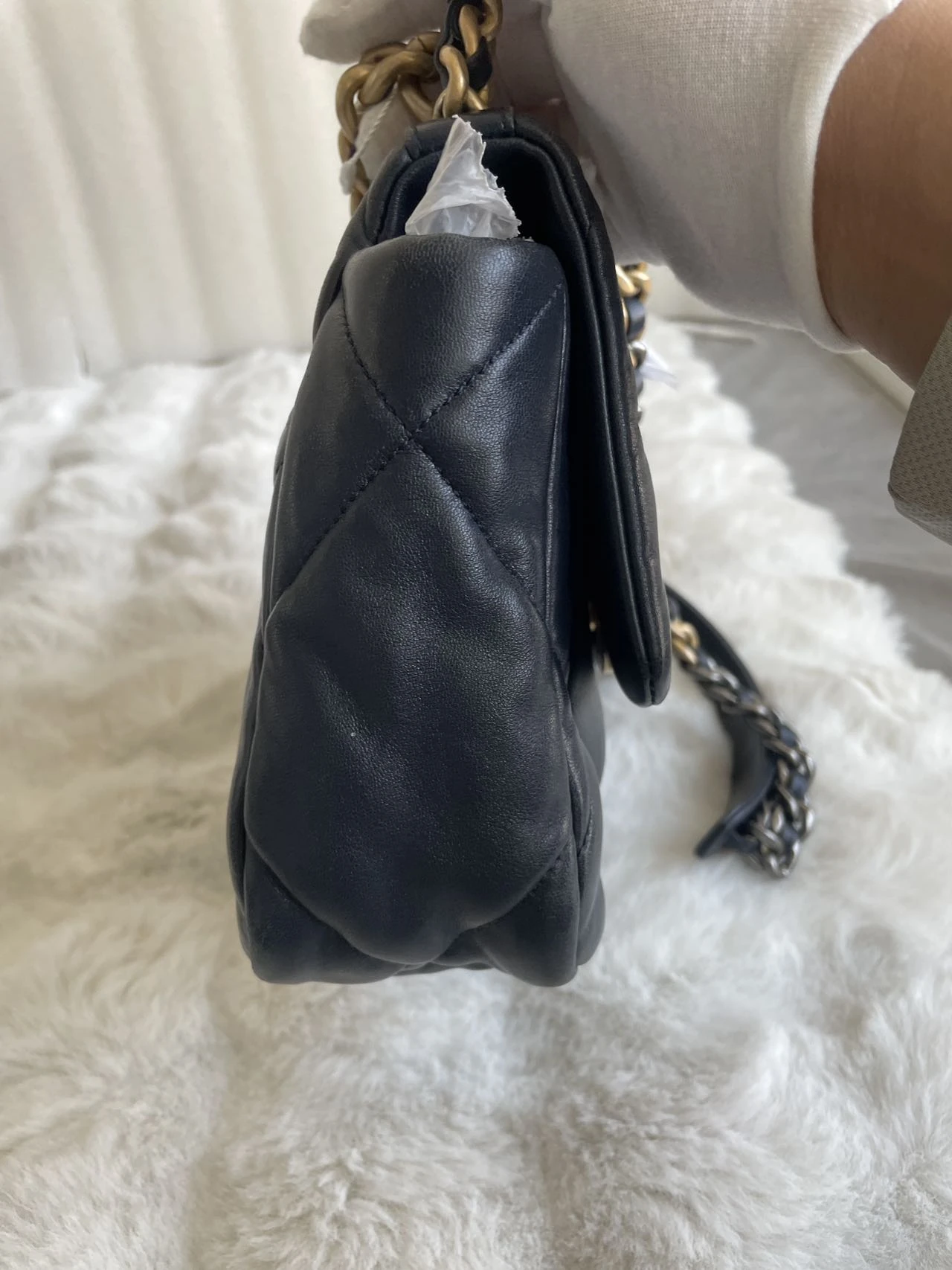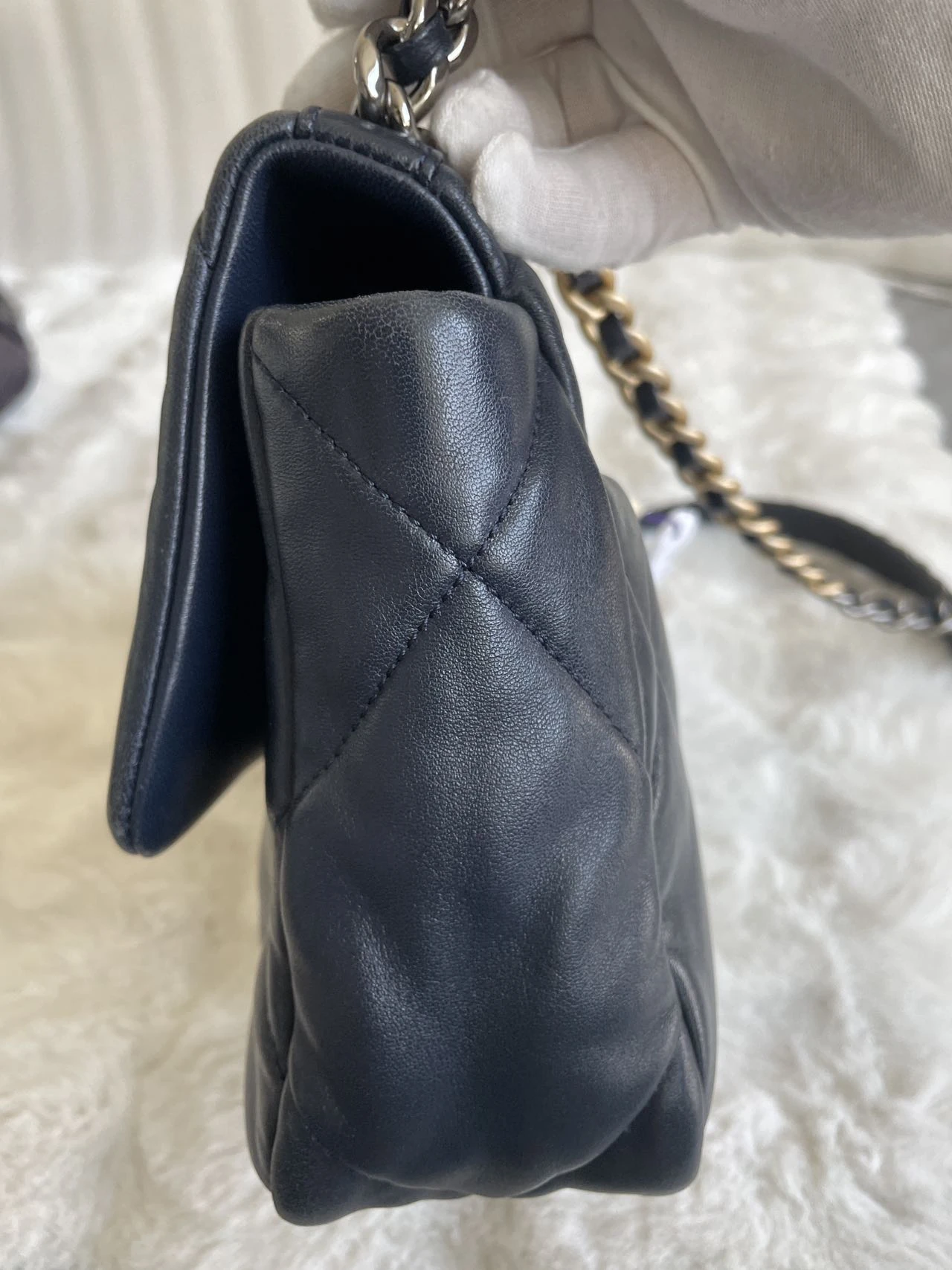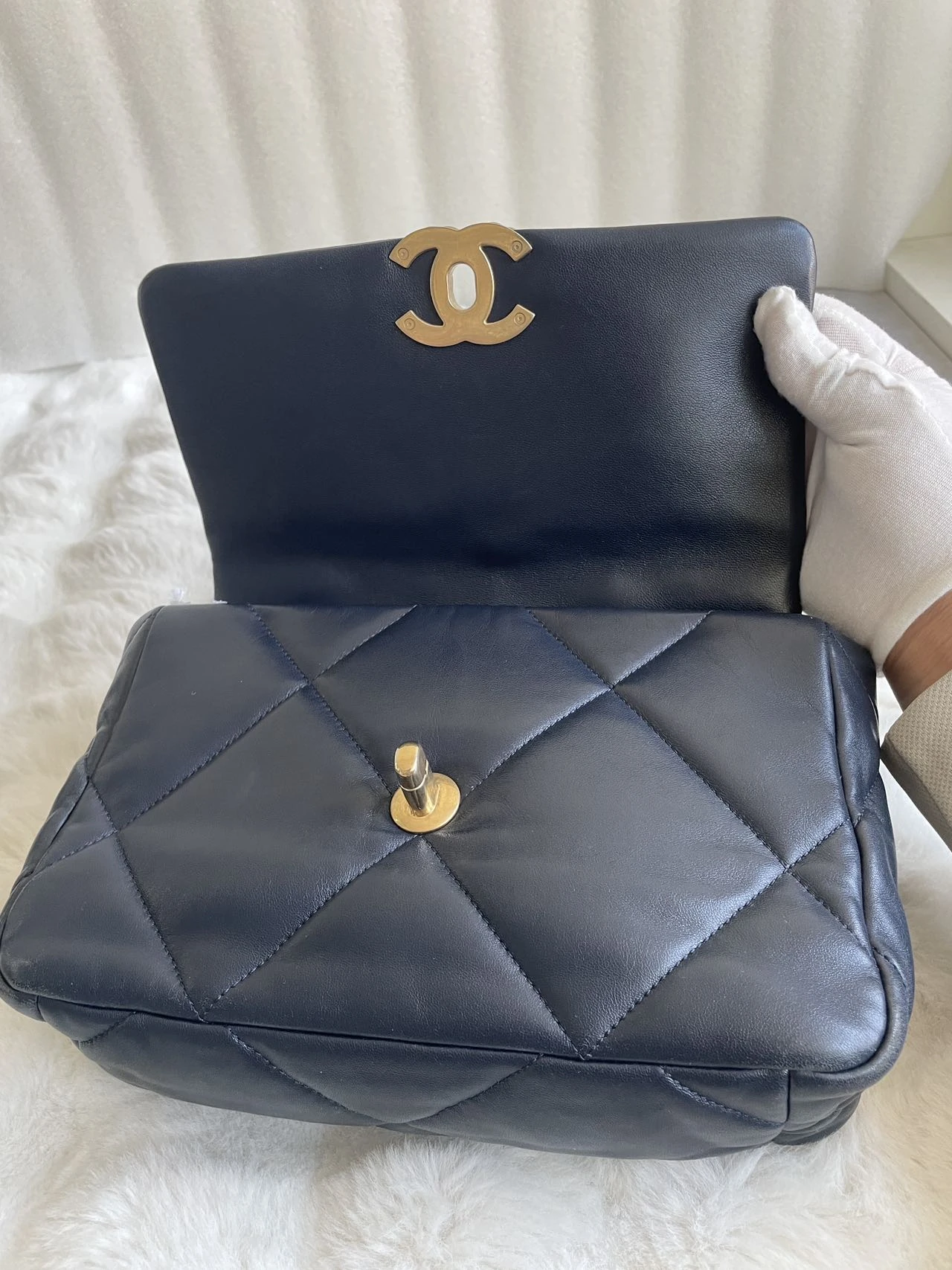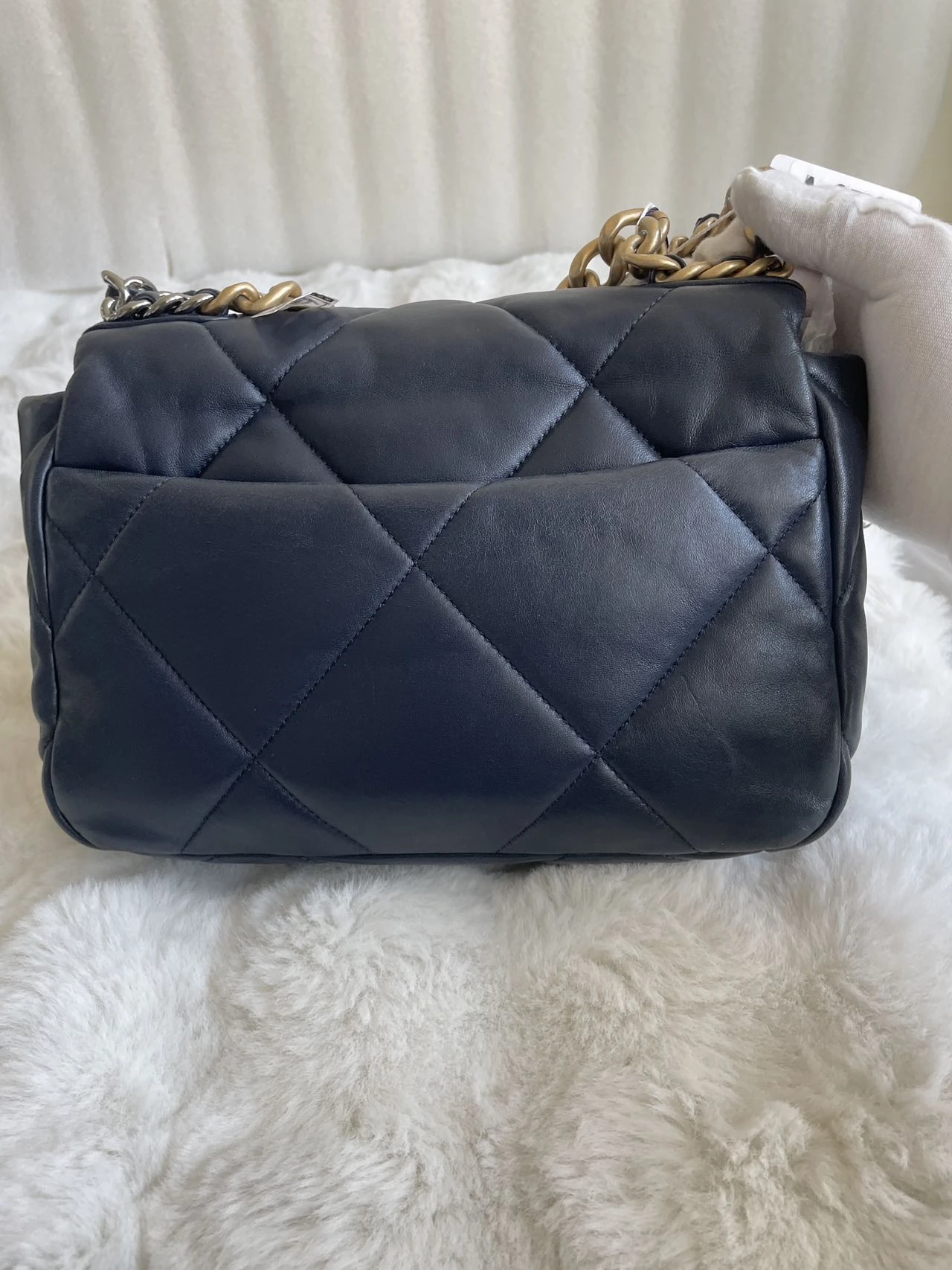 CHANEL Small 19 Navy Blue Lambskin Handbag features a deep navy blue lambskin that gives off a soft, luxurious sheen. This compact yet chic bag retains the iconic quilted pattern while embodying a modern, effortless elegance.