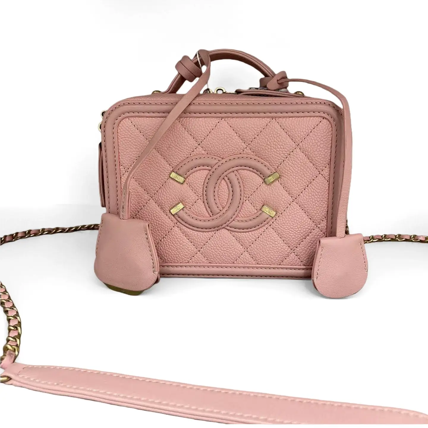 The CHANEL Small CC Filigree Vanity Bag in pink caviar leather is a masterpiece of intricate craftsmanship, where the textured durability of caviar leather is artfully combined with delicate metal filigree work and the iconic CC turn-lock, creating a statement of bold femininity and refined elegance.