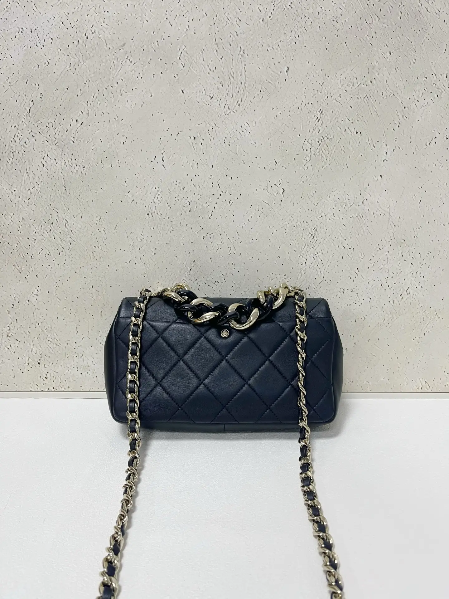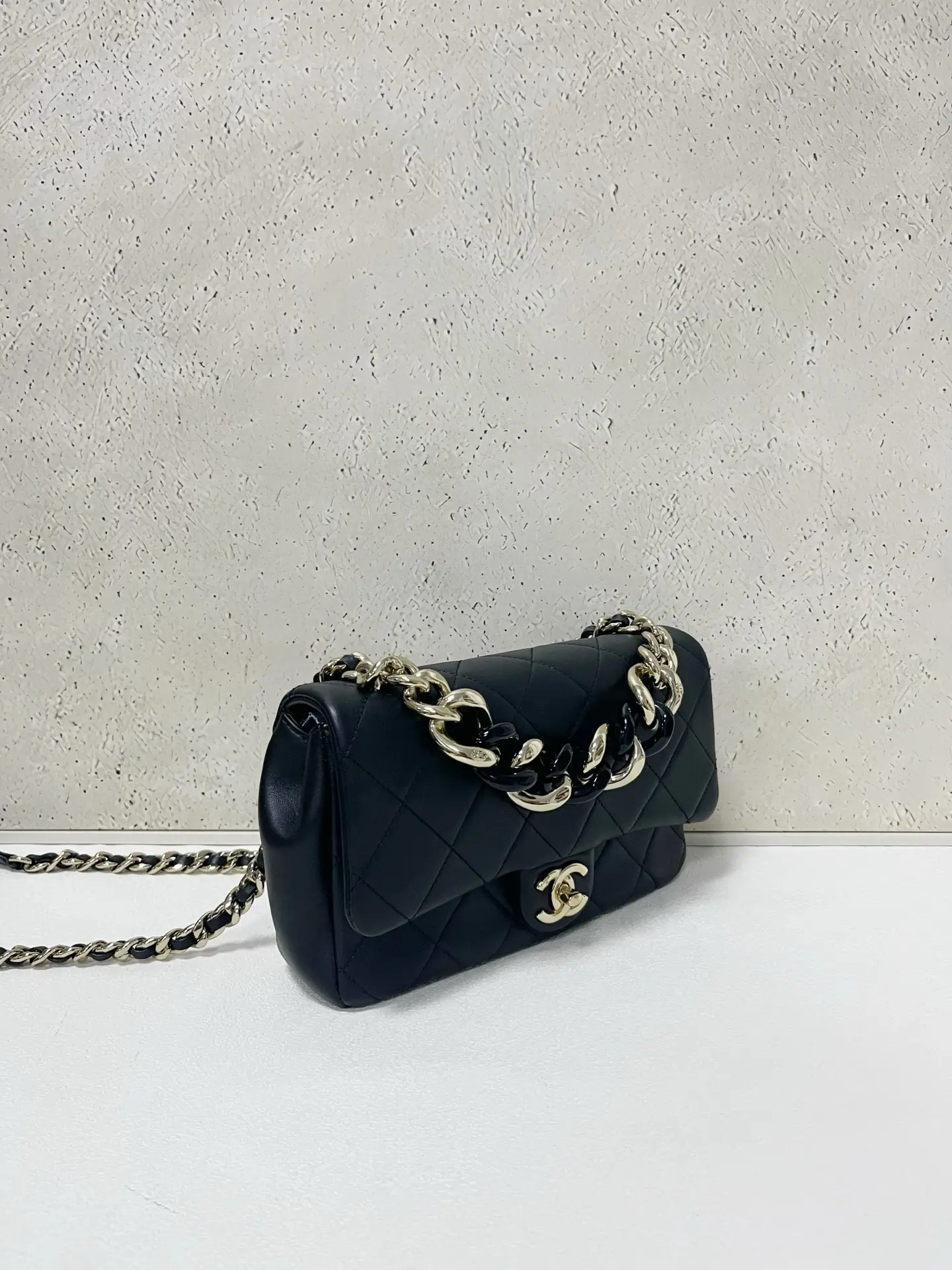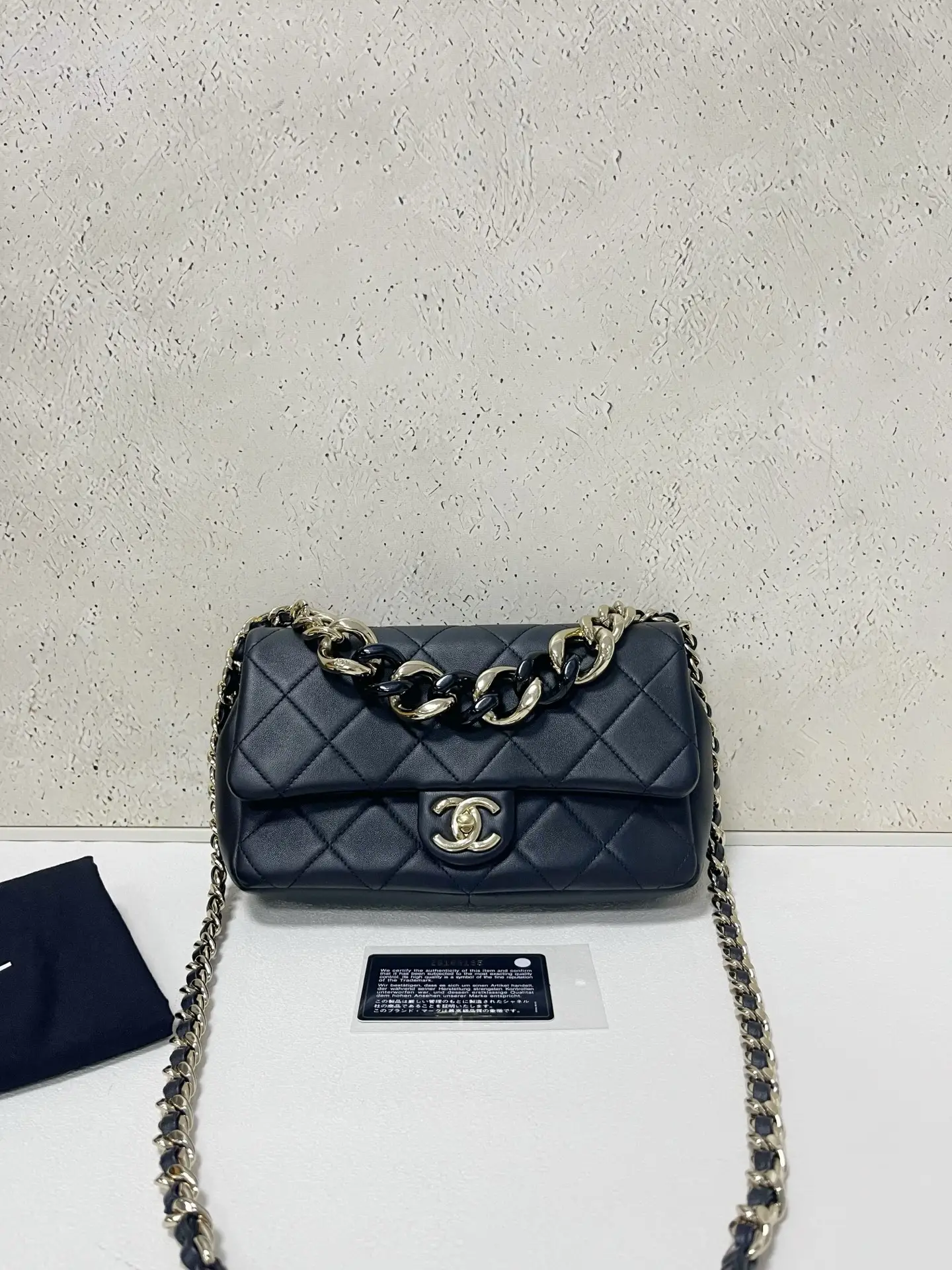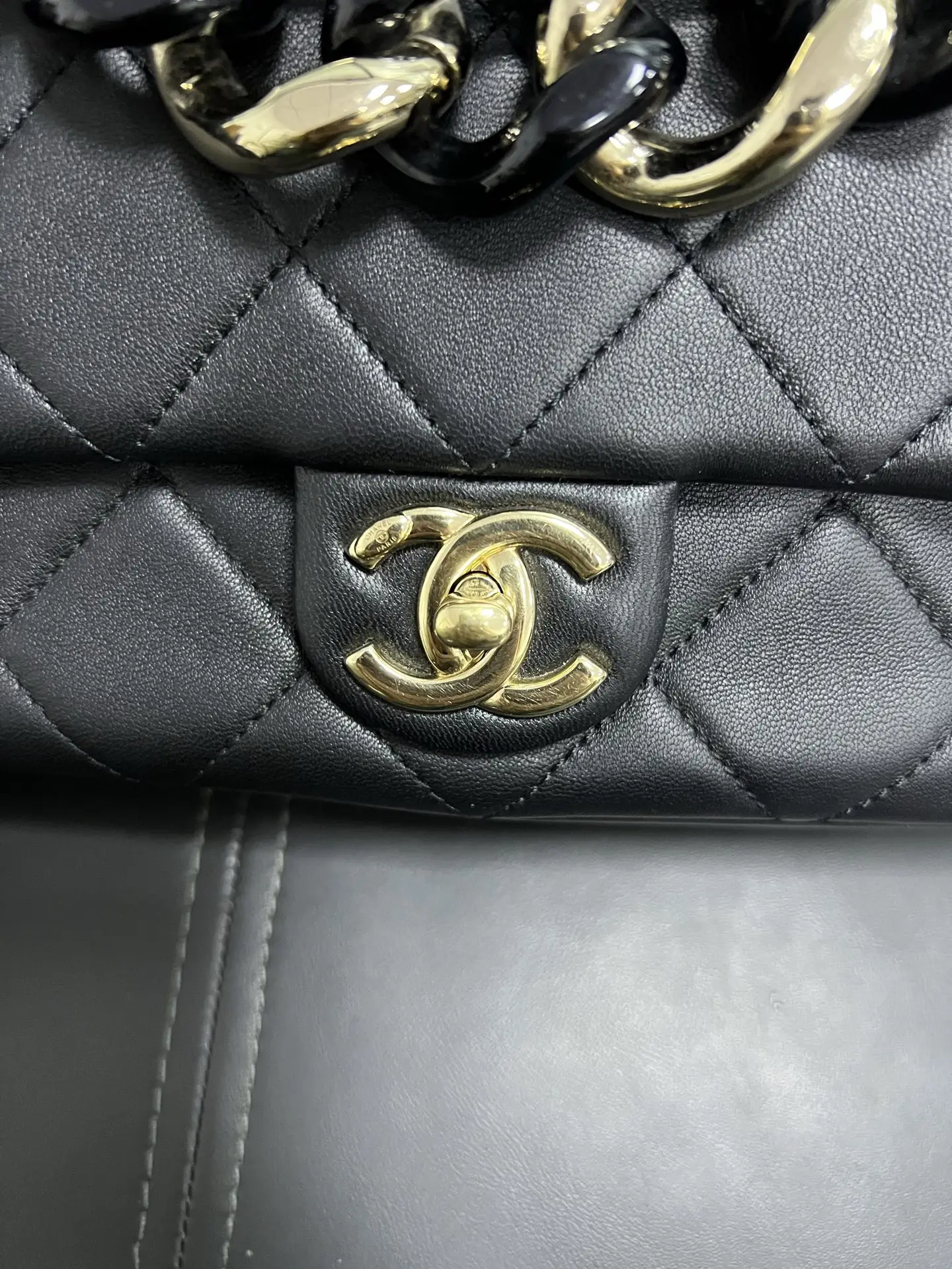 The CHANEL Small Classic Flap Bag in black lambskin with an elegant chain is a refined icon, where the supple leather and iconic diamond quilting are perfectly complemented by a distinctive, possibly enameled or intricately designed chain strap and the gleaming CC turn-lock, creating a statement of sophisticated luxury. Product details • Brand: Chanel • …