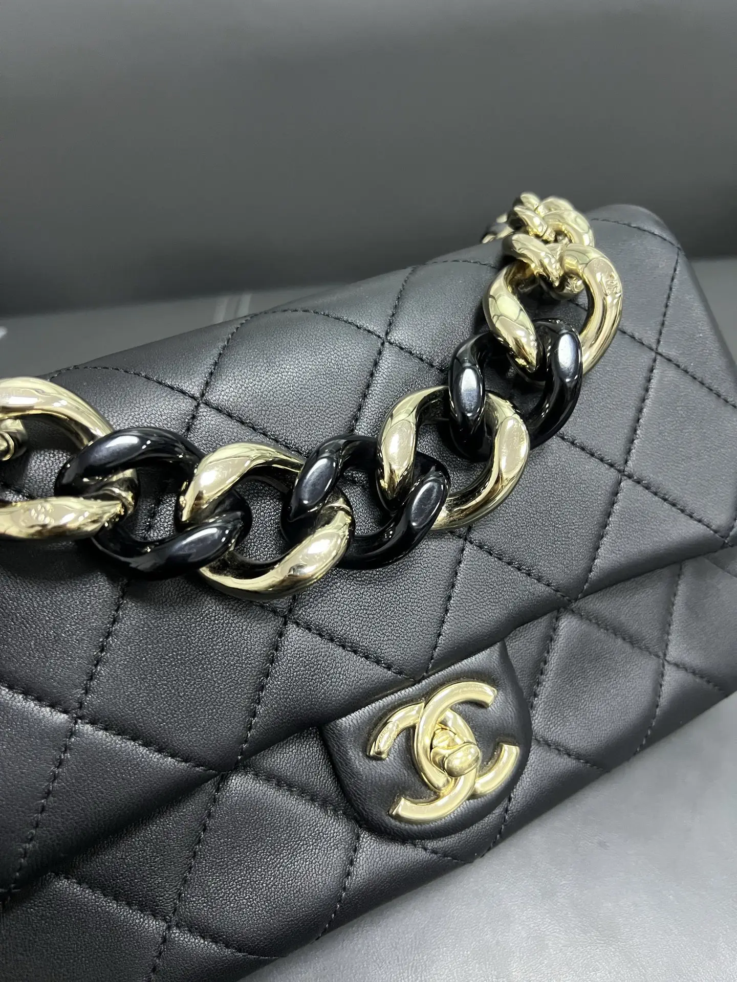 The CHANEL Small Classic Flap Bag in black lambskin with an elegant chain is a refined icon, where the supple leather and iconic diamond quilting are perfectly complemented by a distinctive, possibly enameled or intricately designed chain strap and the gleaming CC turn-lock, creating a statement of sophisticated luxury.