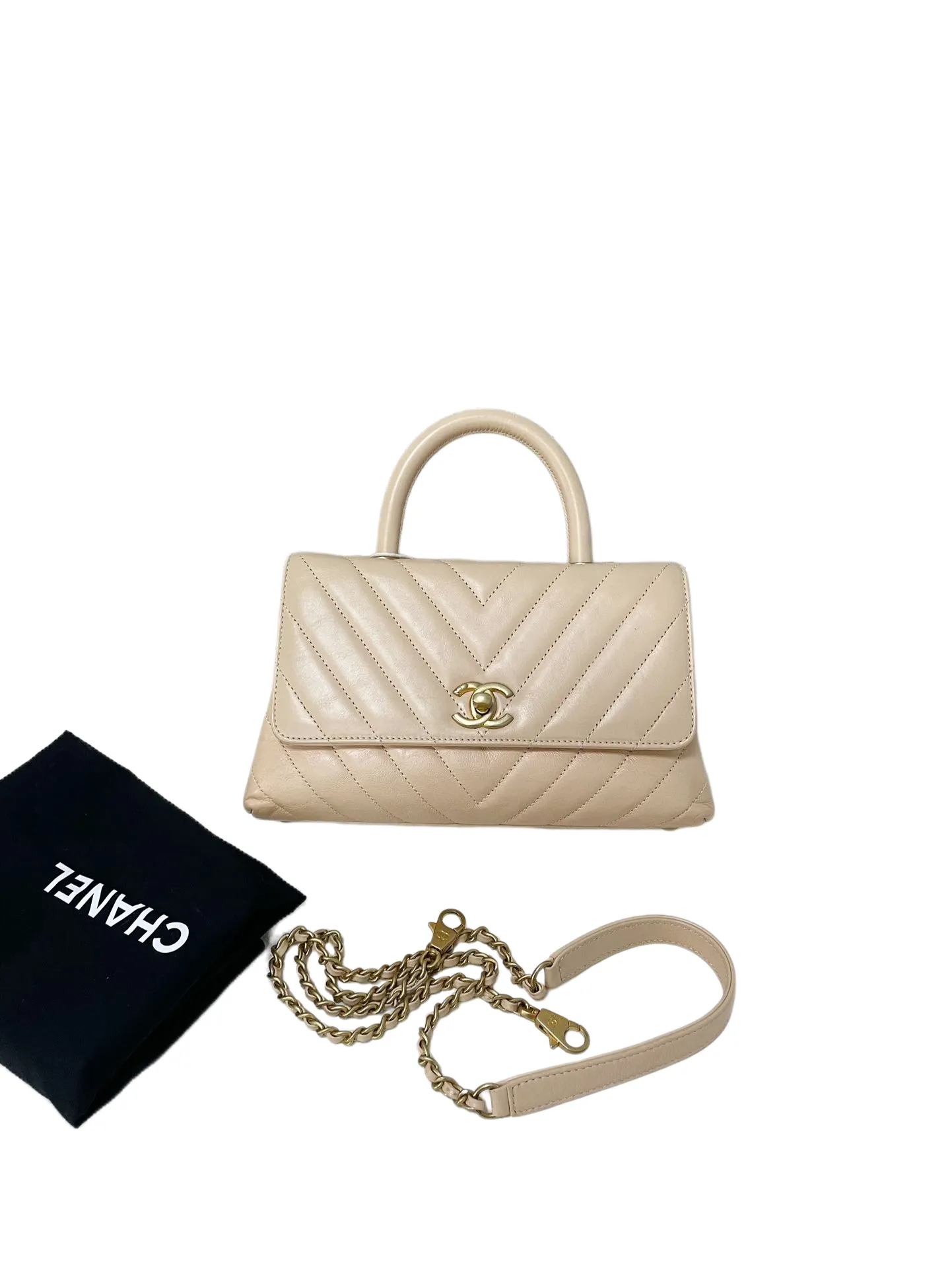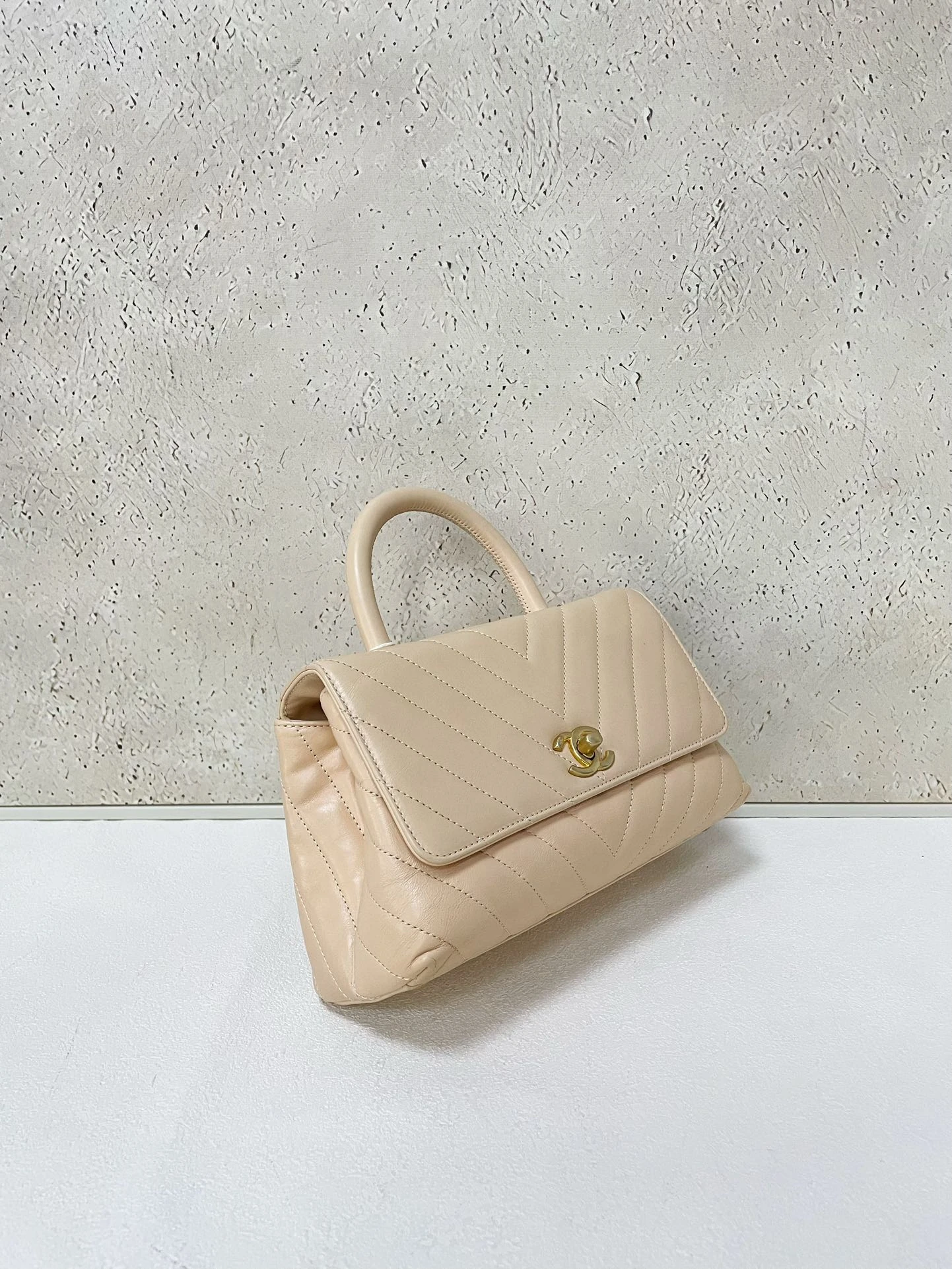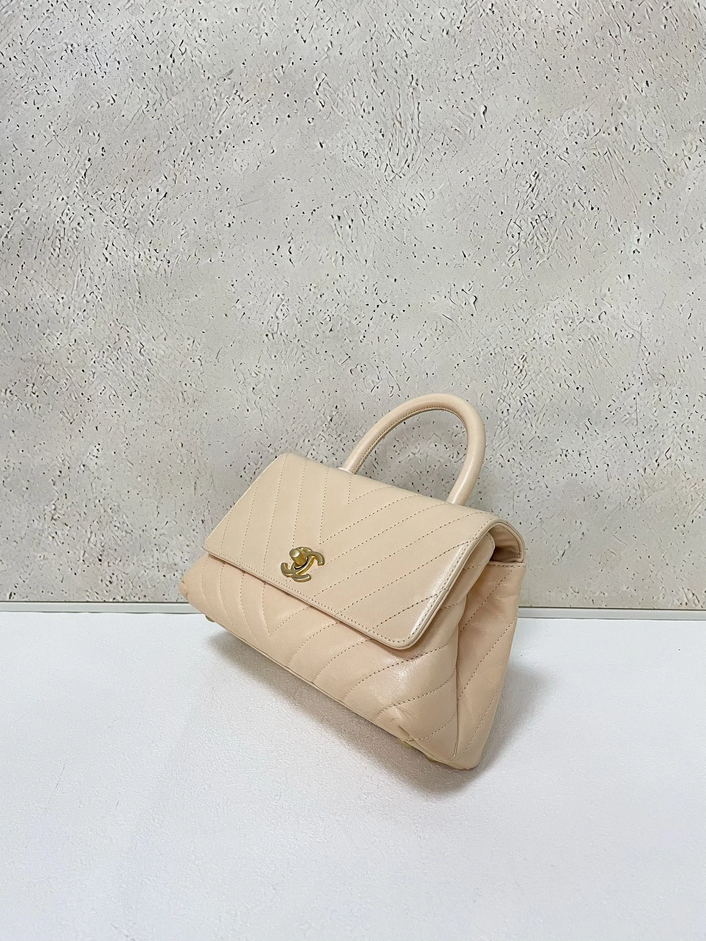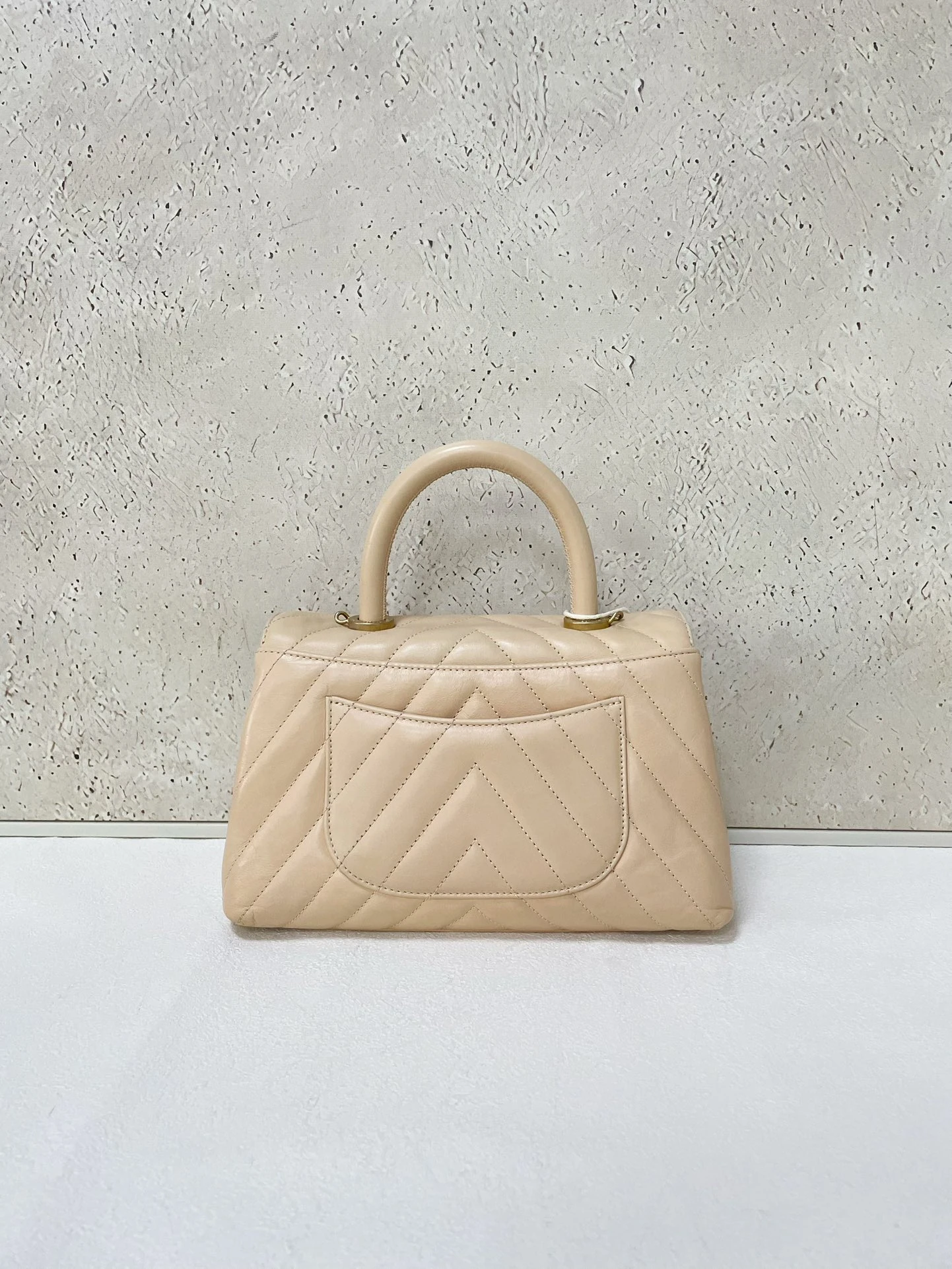 This Chanel Coco Handle bag is crafted in elegant beige/nude chevron quilted leather with gold hardware. Featuring a structured silhouette, signature CC turn lock, and top handle with detachable strap, it offers timeless Chanel sophistication.