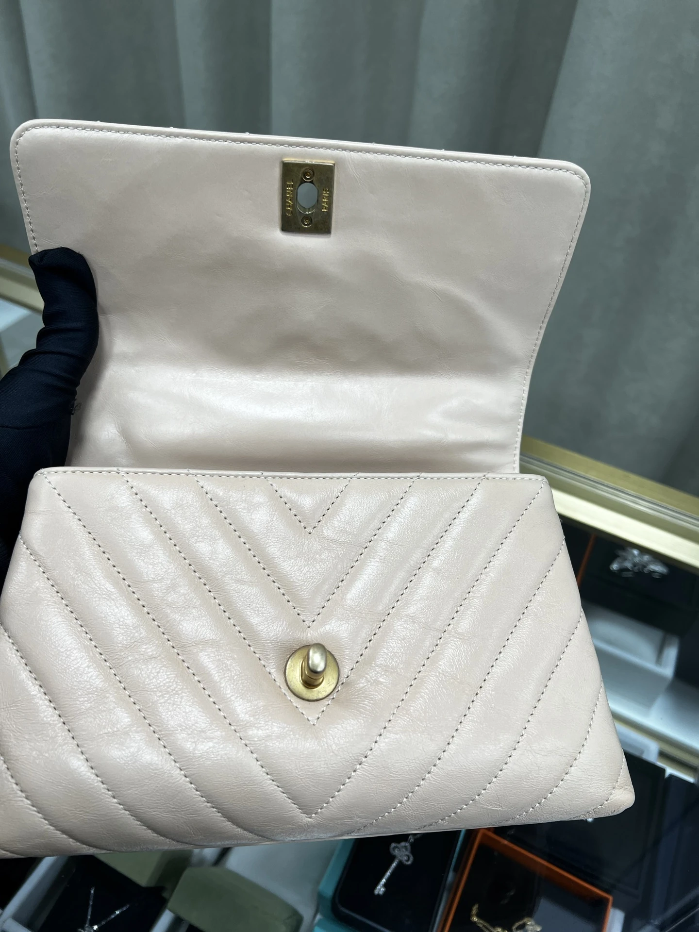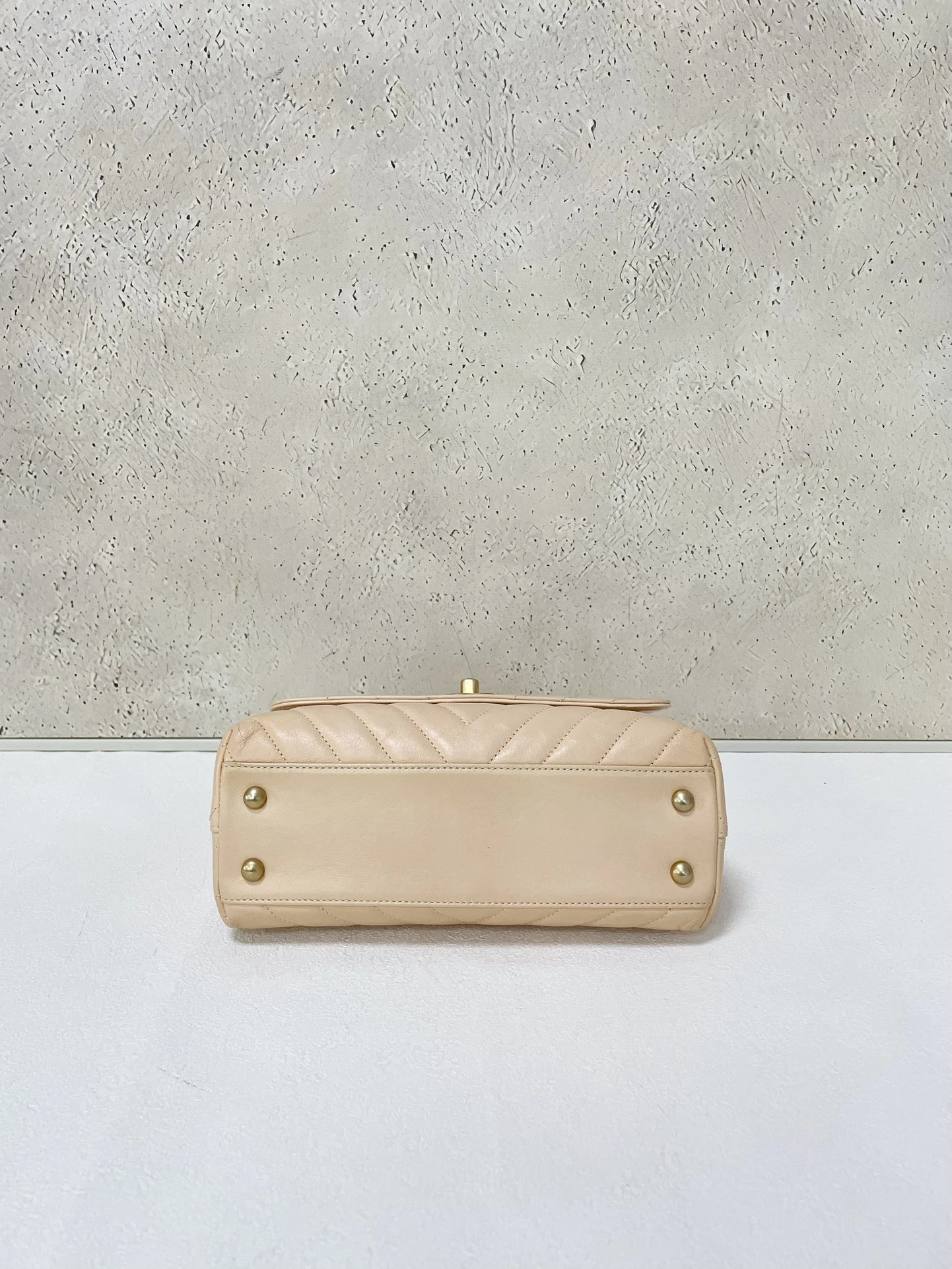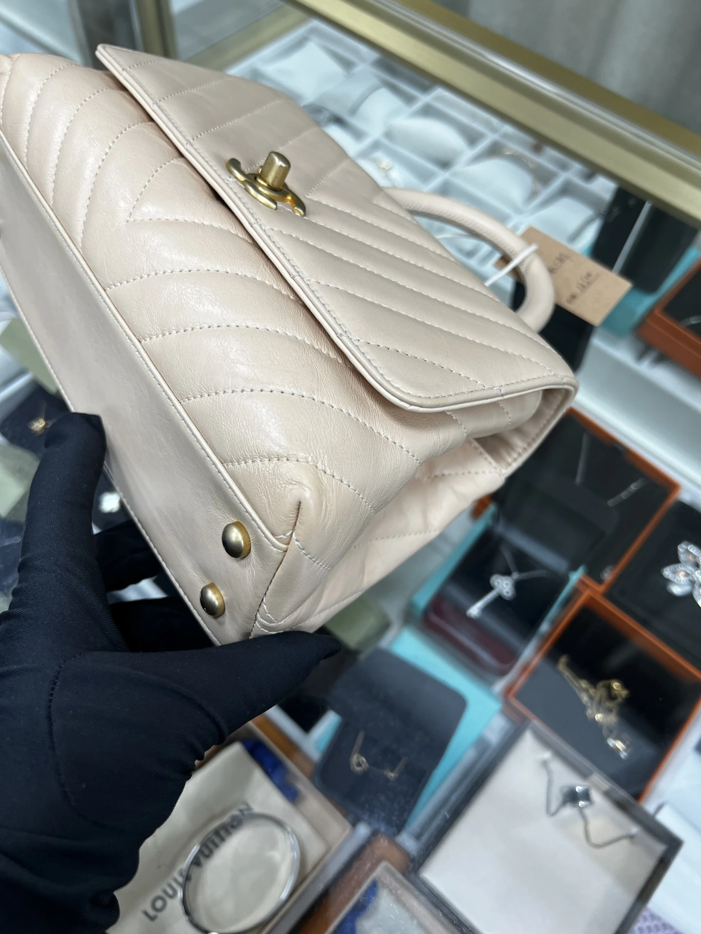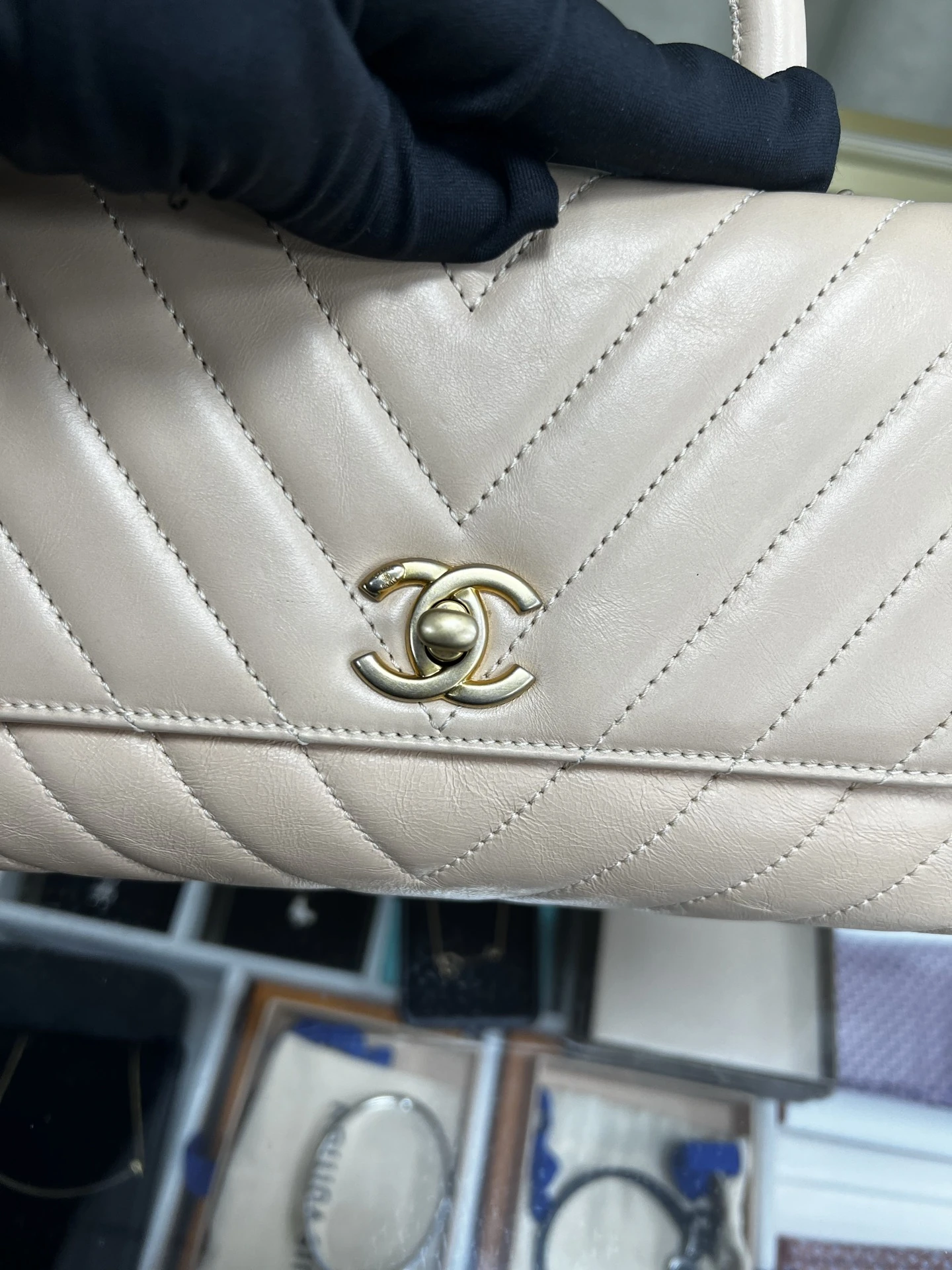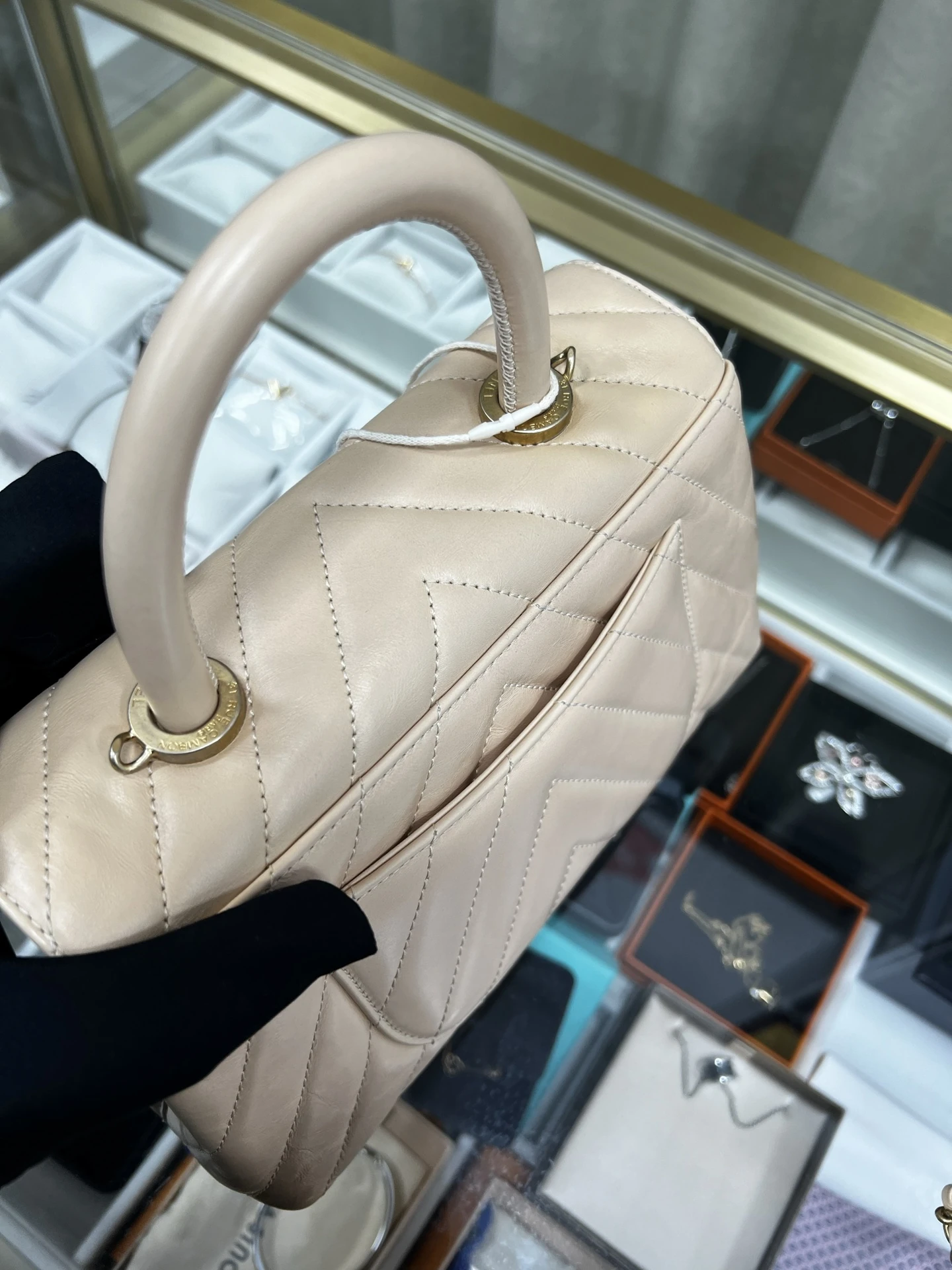 This Chanel Coco Handle bag is crafted in elegant beige/nude chevron quilted leather with gold hardware. Featuring a structured silhouette, signature CC turn lock, and top handle with detachable strap, it offers timeless Chanel sophistication.