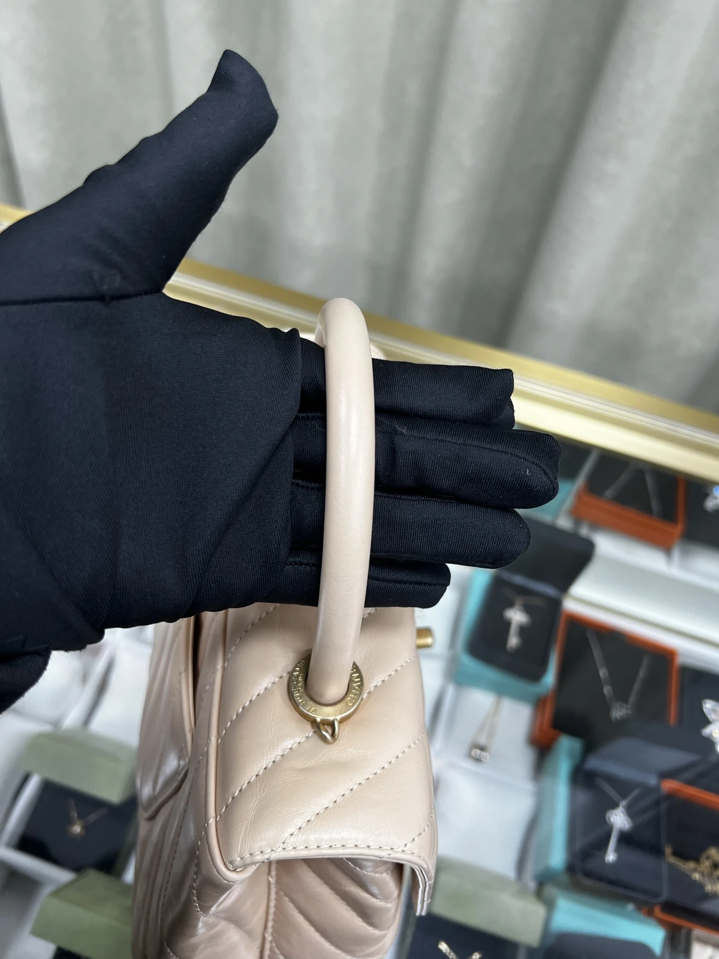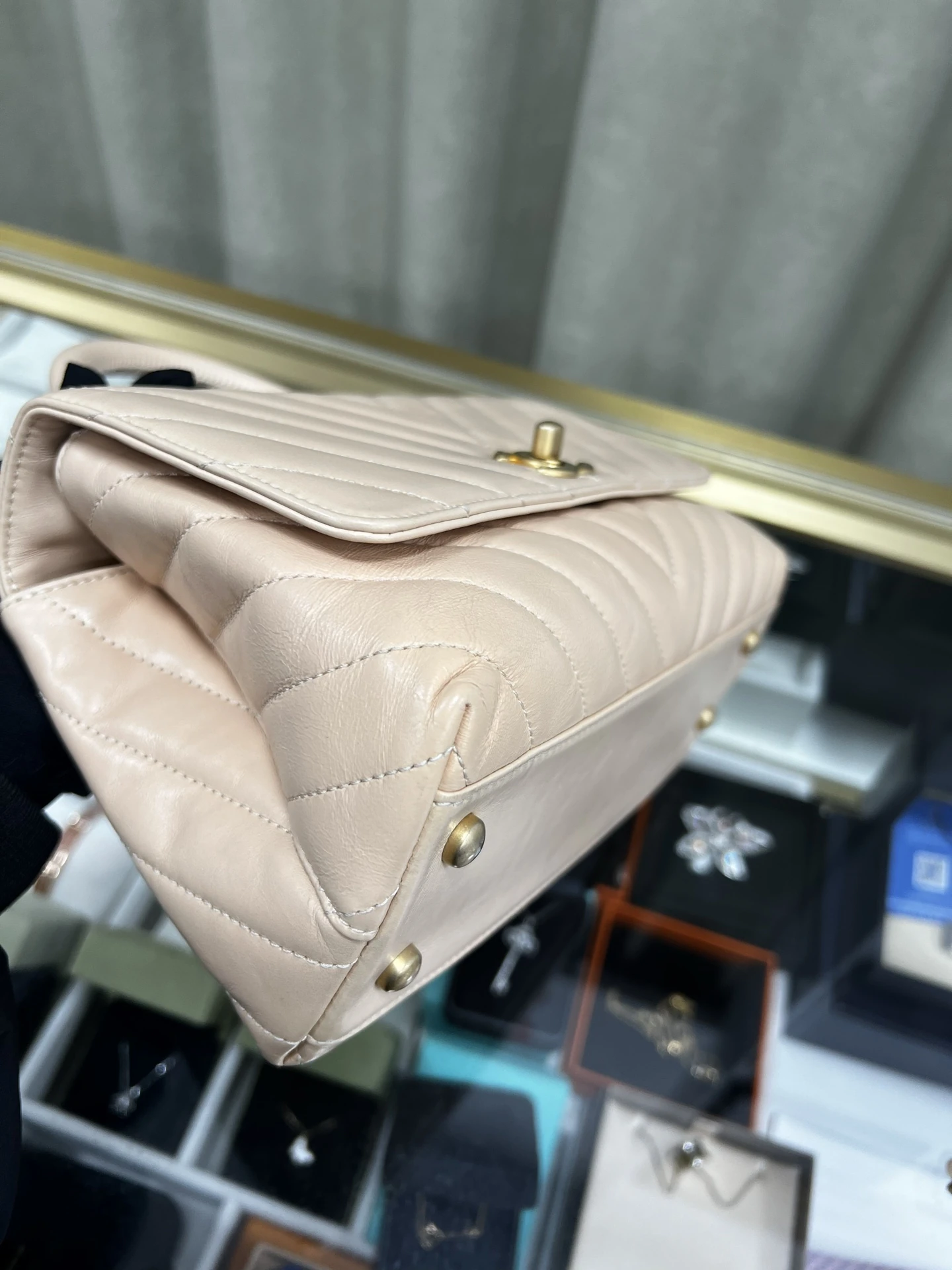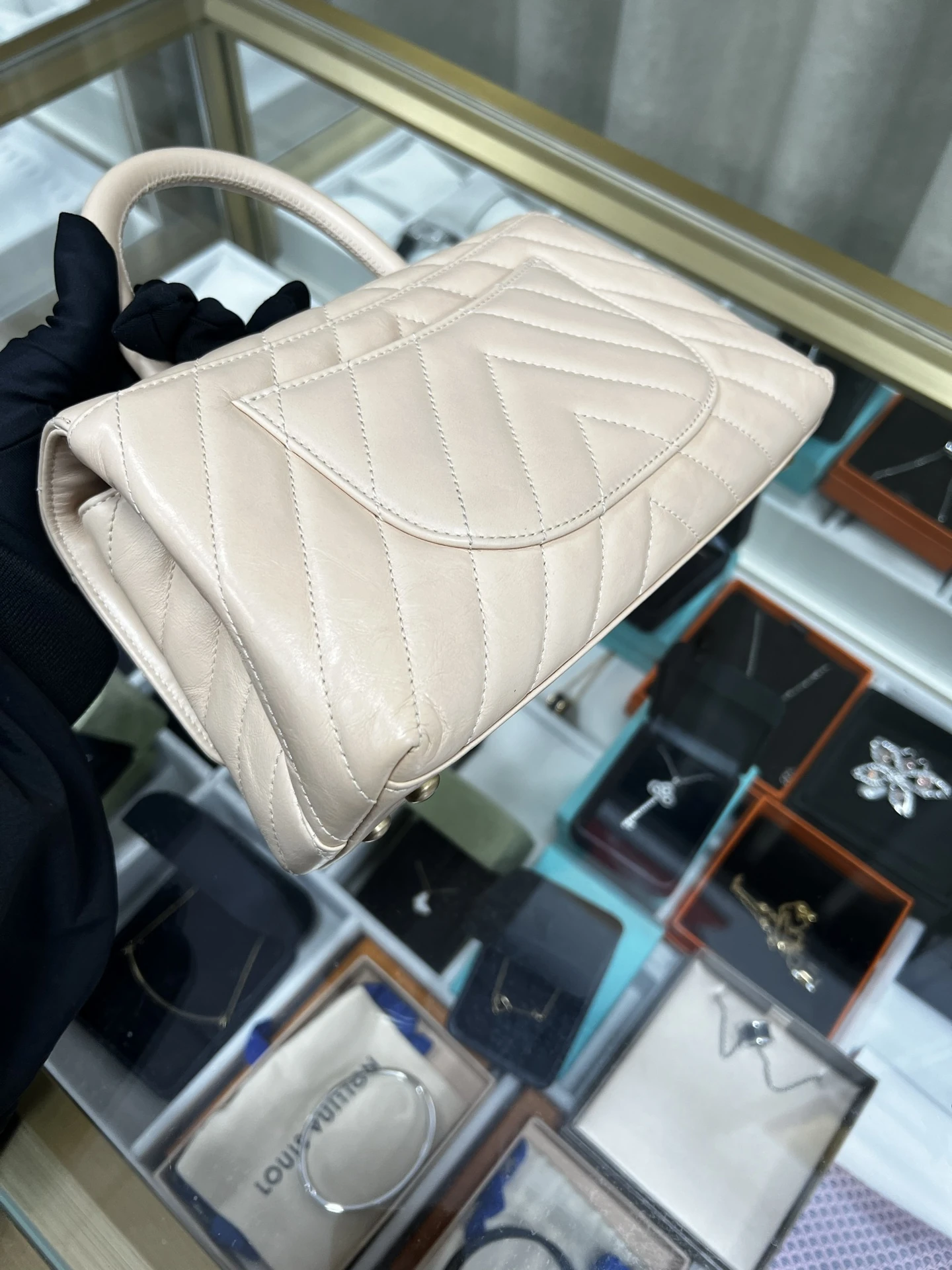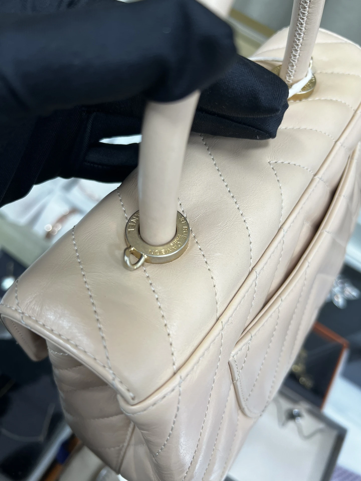 This Chanel Coco Handle bag is crafted in elegant beige/nude chevron quilted leather with gold hardware. Featuring a structured silhouette, signature CC turn lock, and top handle with detachable strap, it offers timeless Chanel sophistication.
