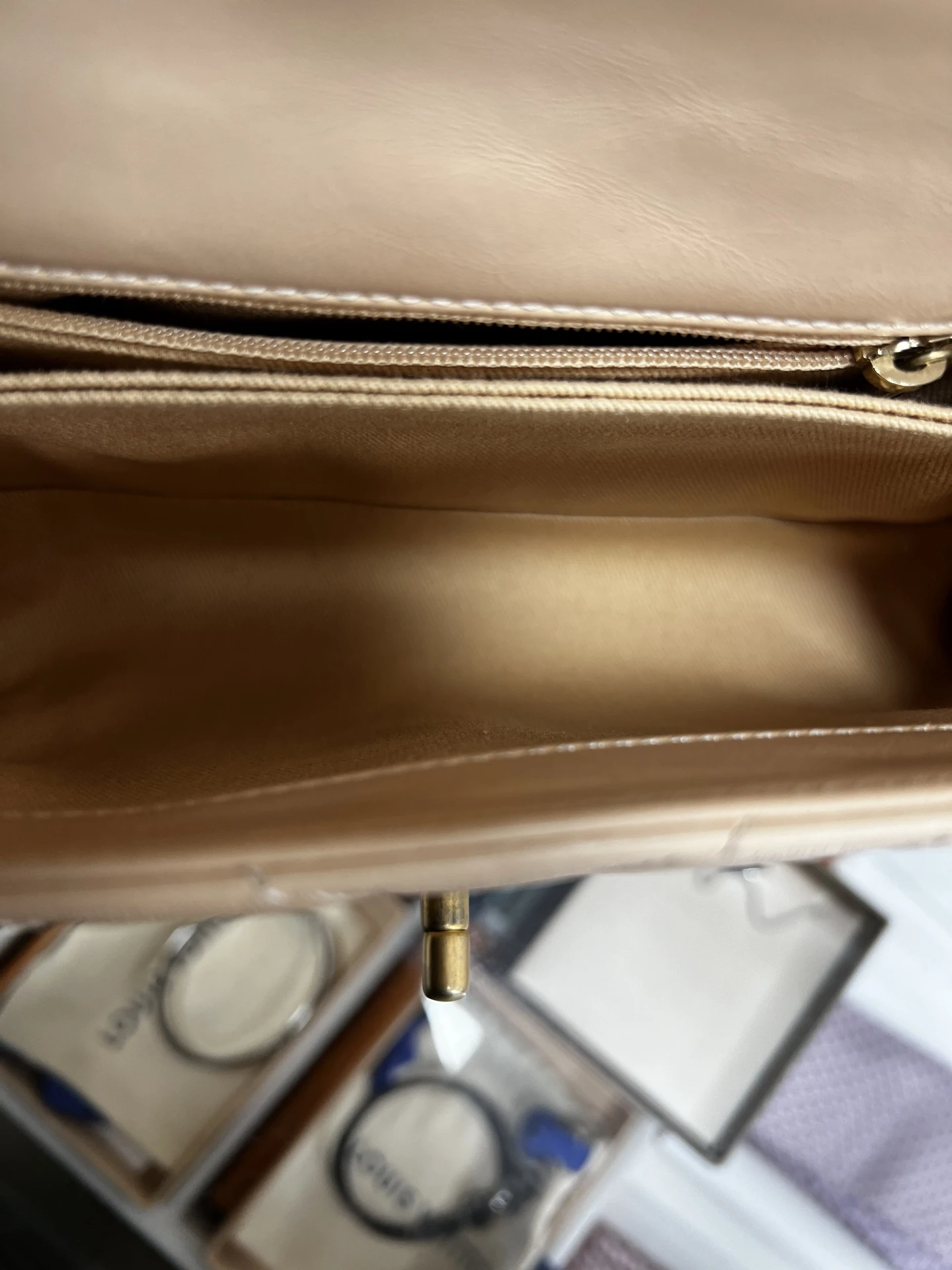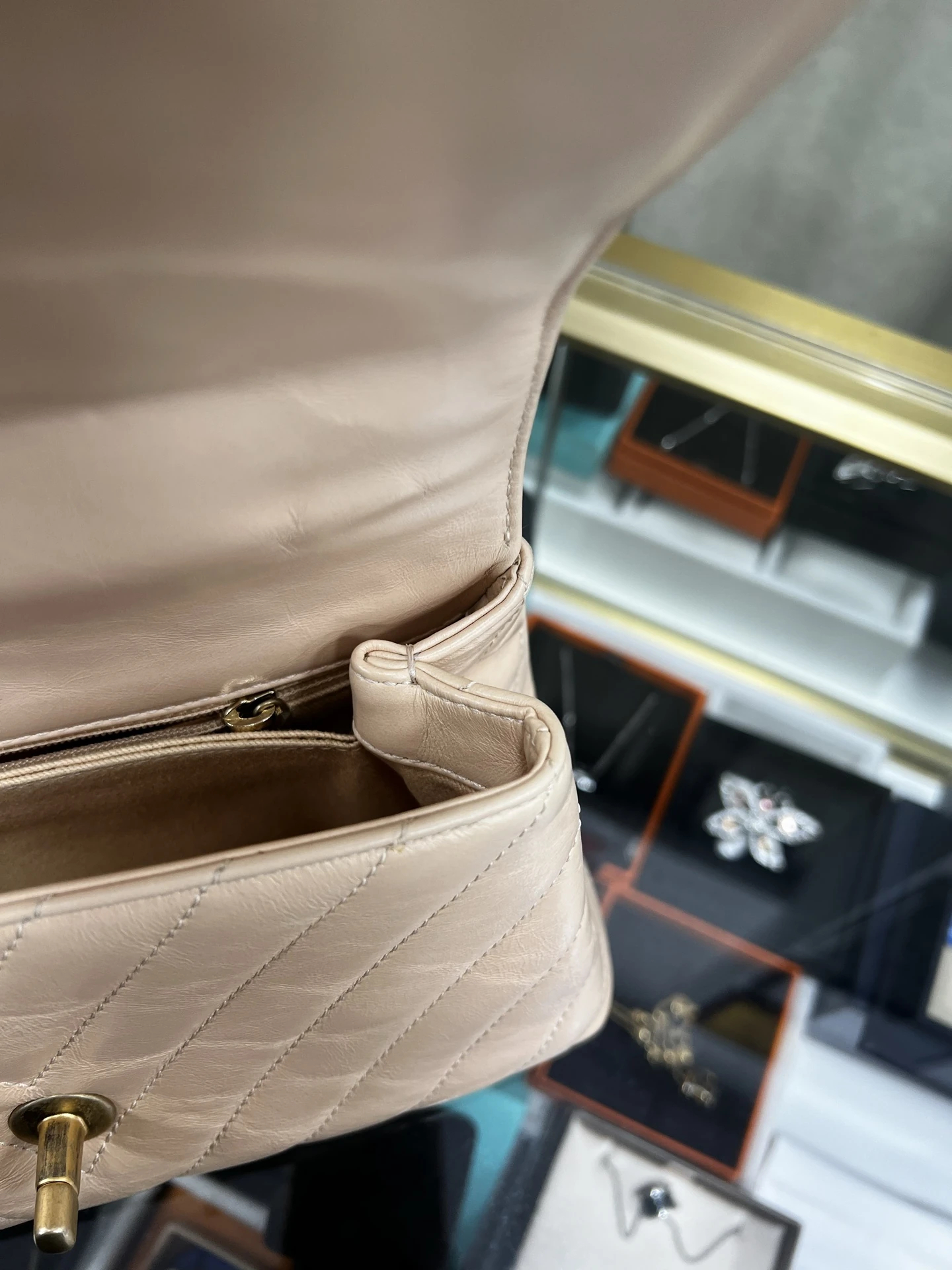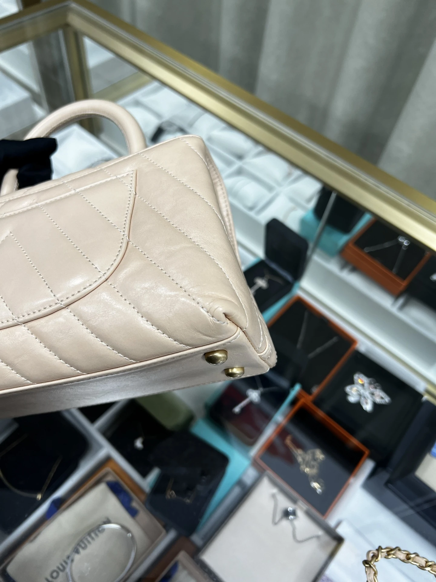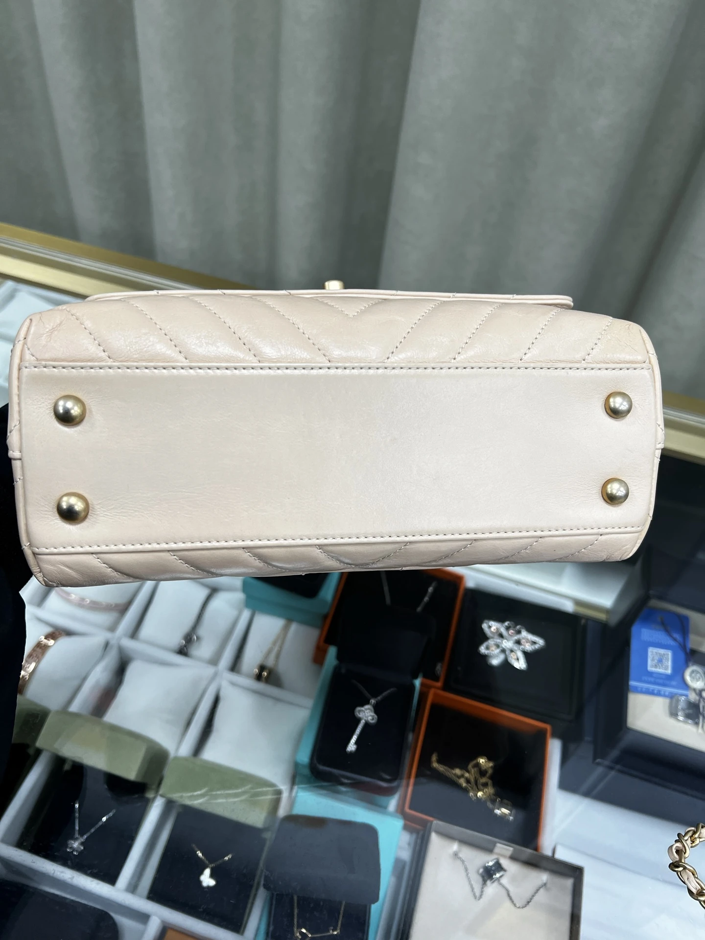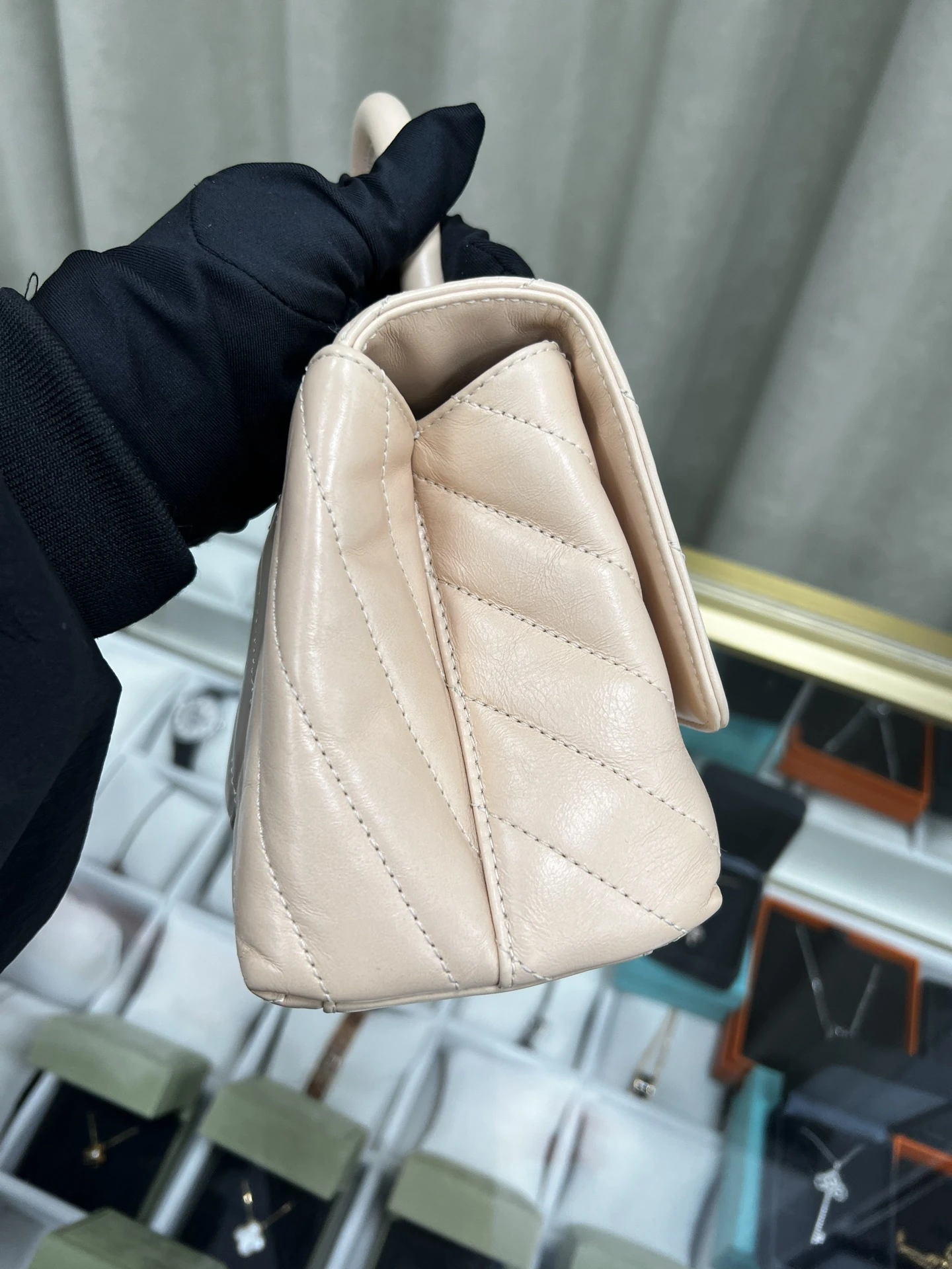 This Chanel Coco Handle bag is crafted in elegant beige/nude chevron quilted leather with gold hardware. Featuring a structured silhouette, signature CC turn lock, and top handle with detachable strap, it offers timeless Chanel sophistication.