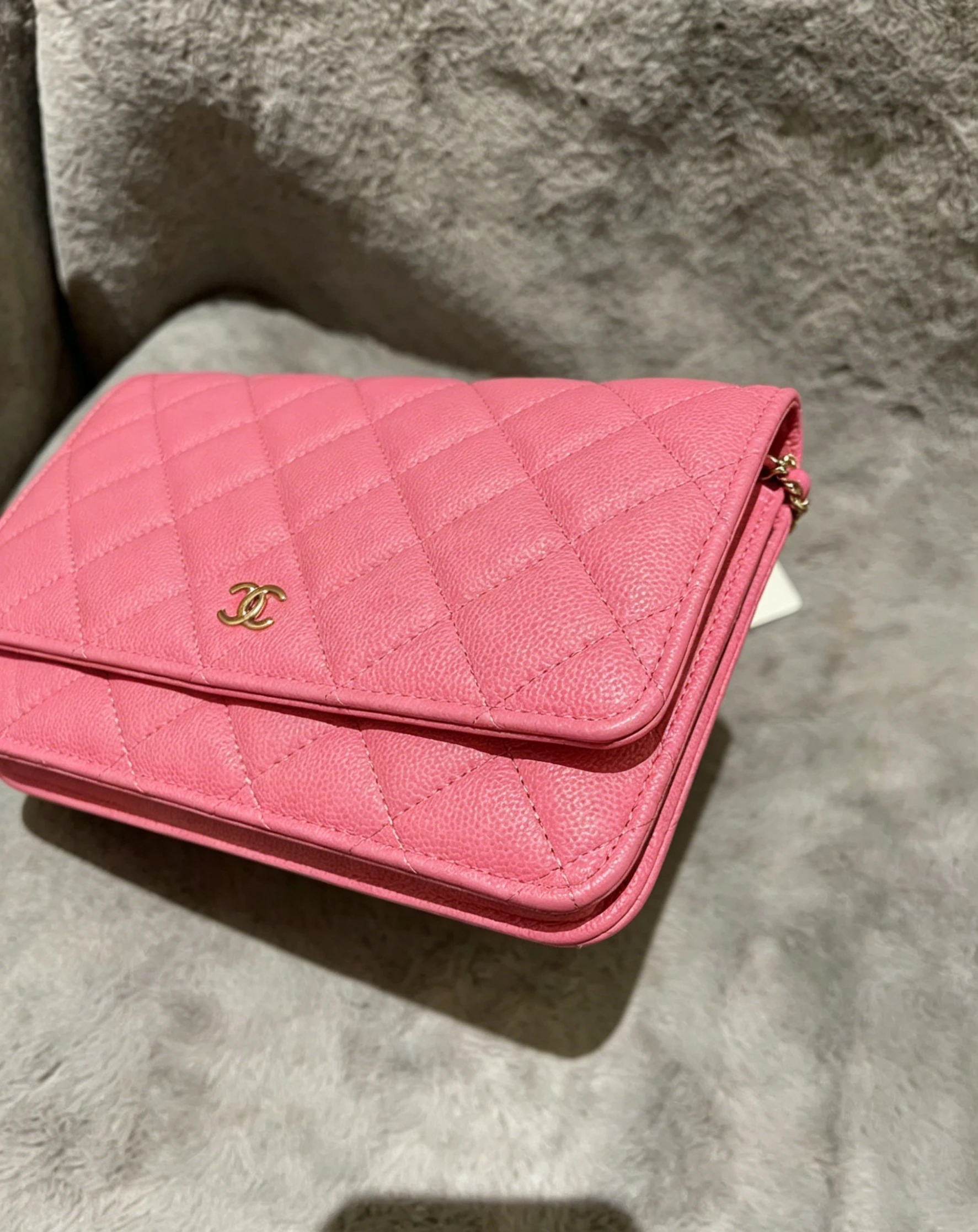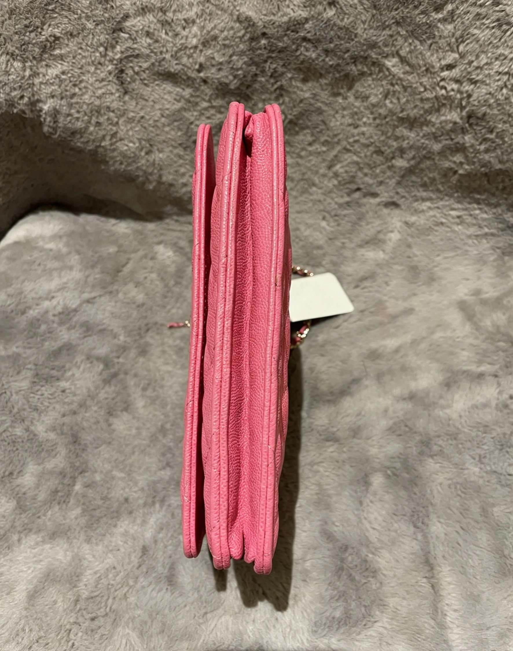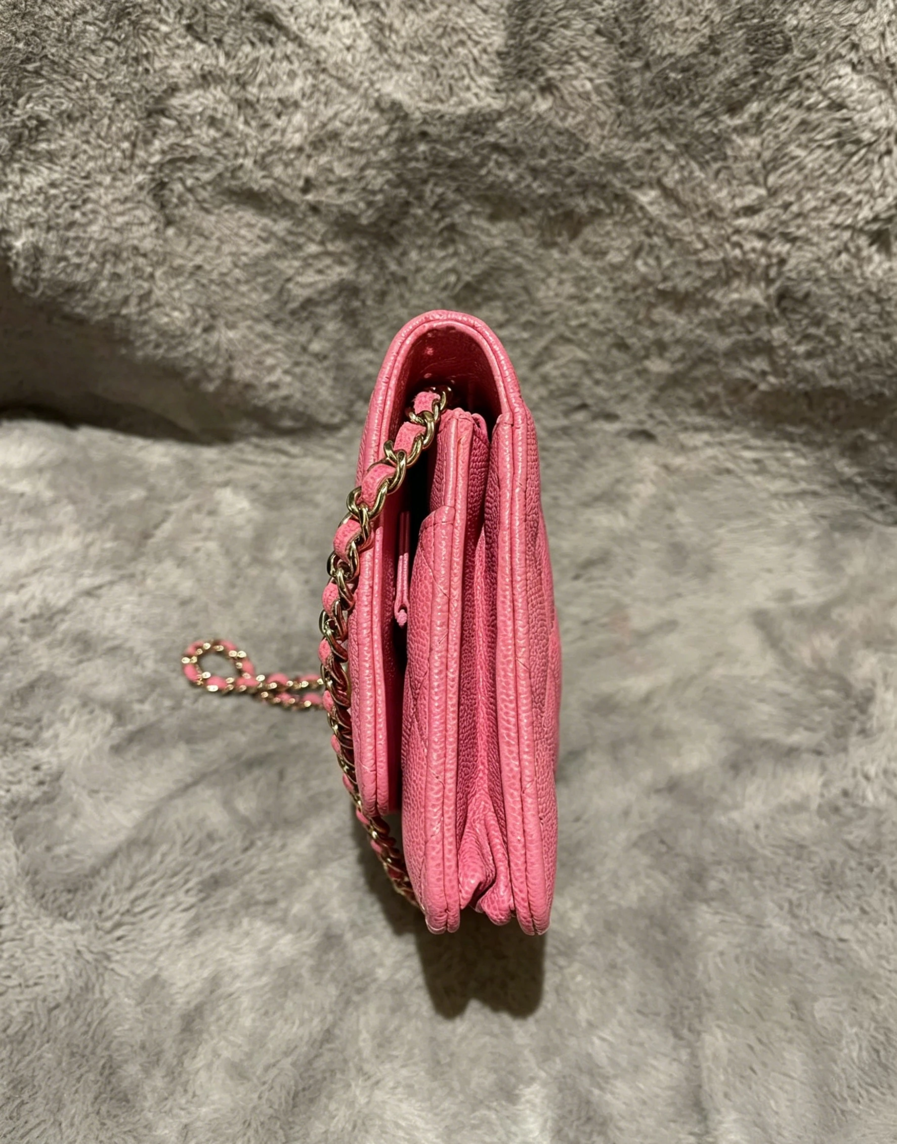 CHANE Wallet On Chain crafted in pink caviar leather with gold hardware. Featuring the iconic quilted design and compact silhouette, this elegant WOC is perfect for day-to-evening wear.