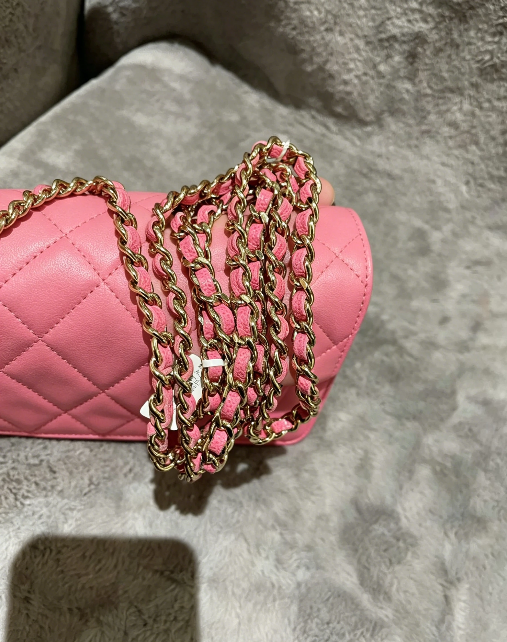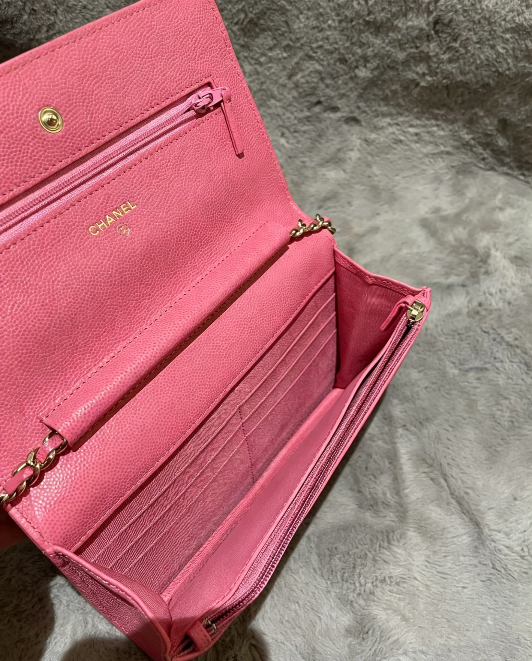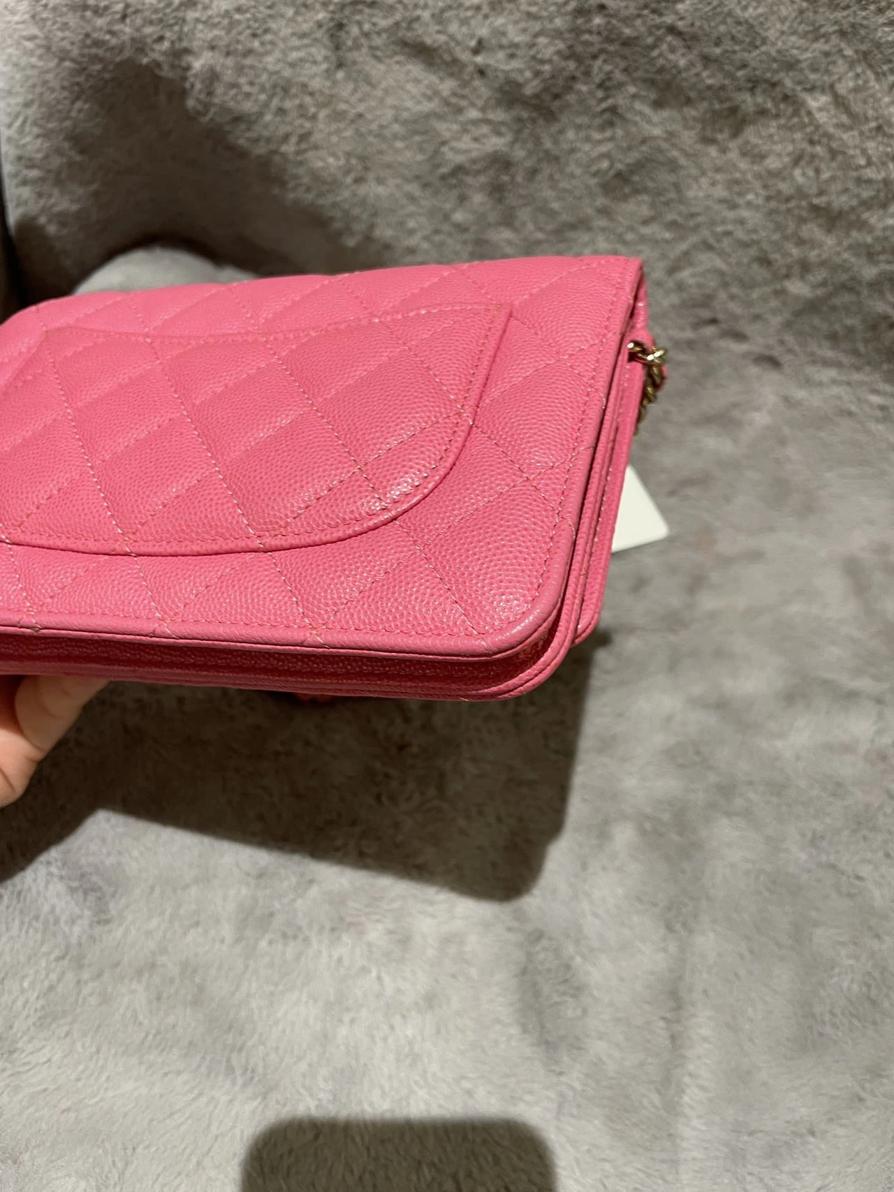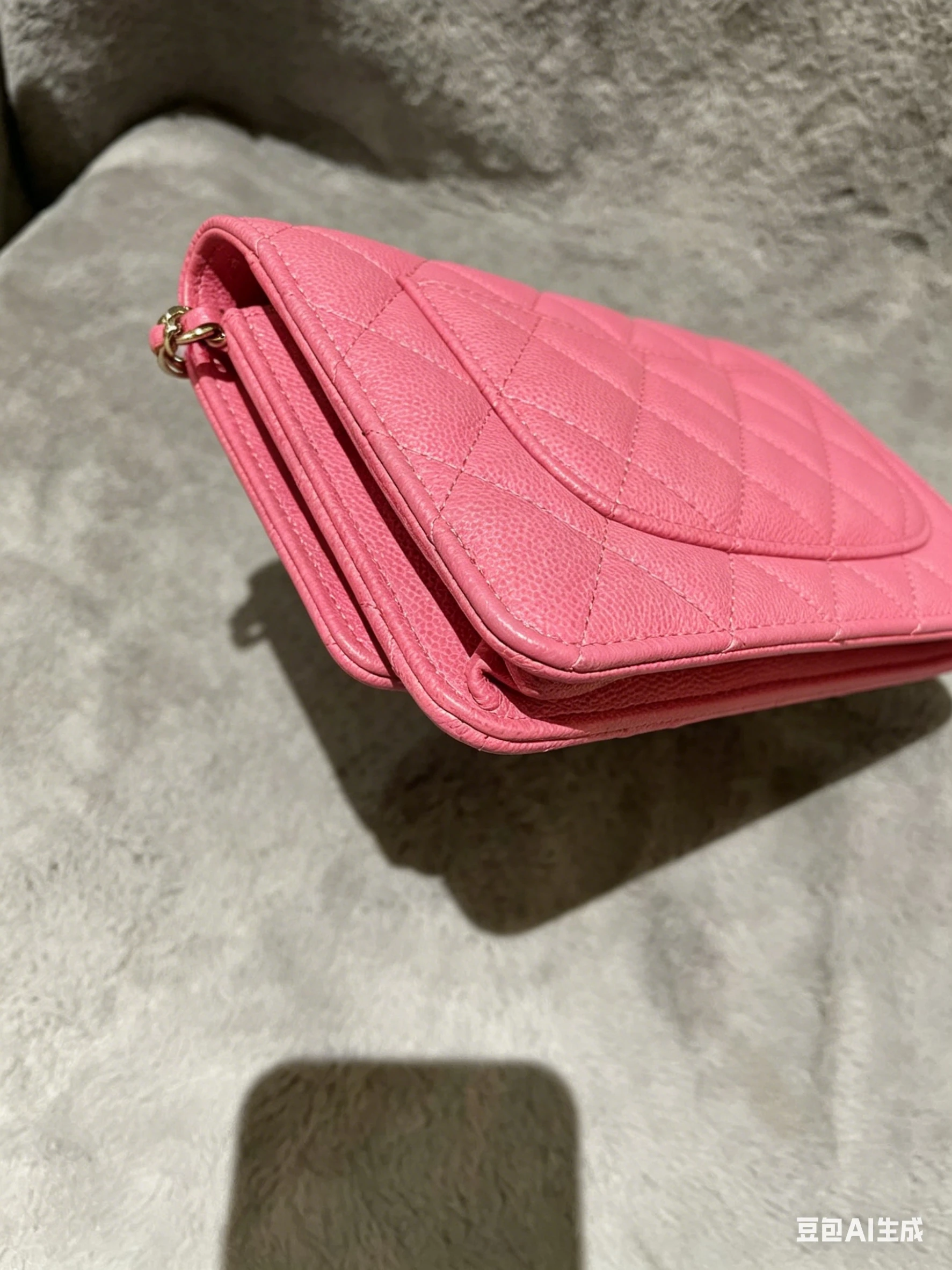 CHANE Wallet On Chain crafted in pink caviar leather with gold hardware. Featuring the iconic quilted design and compact silhouette, this elegant WOC is perfect for day-to-evening wear.