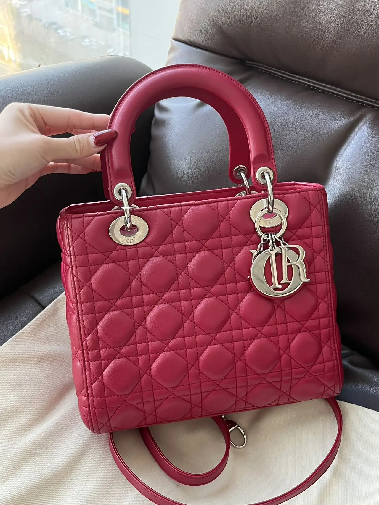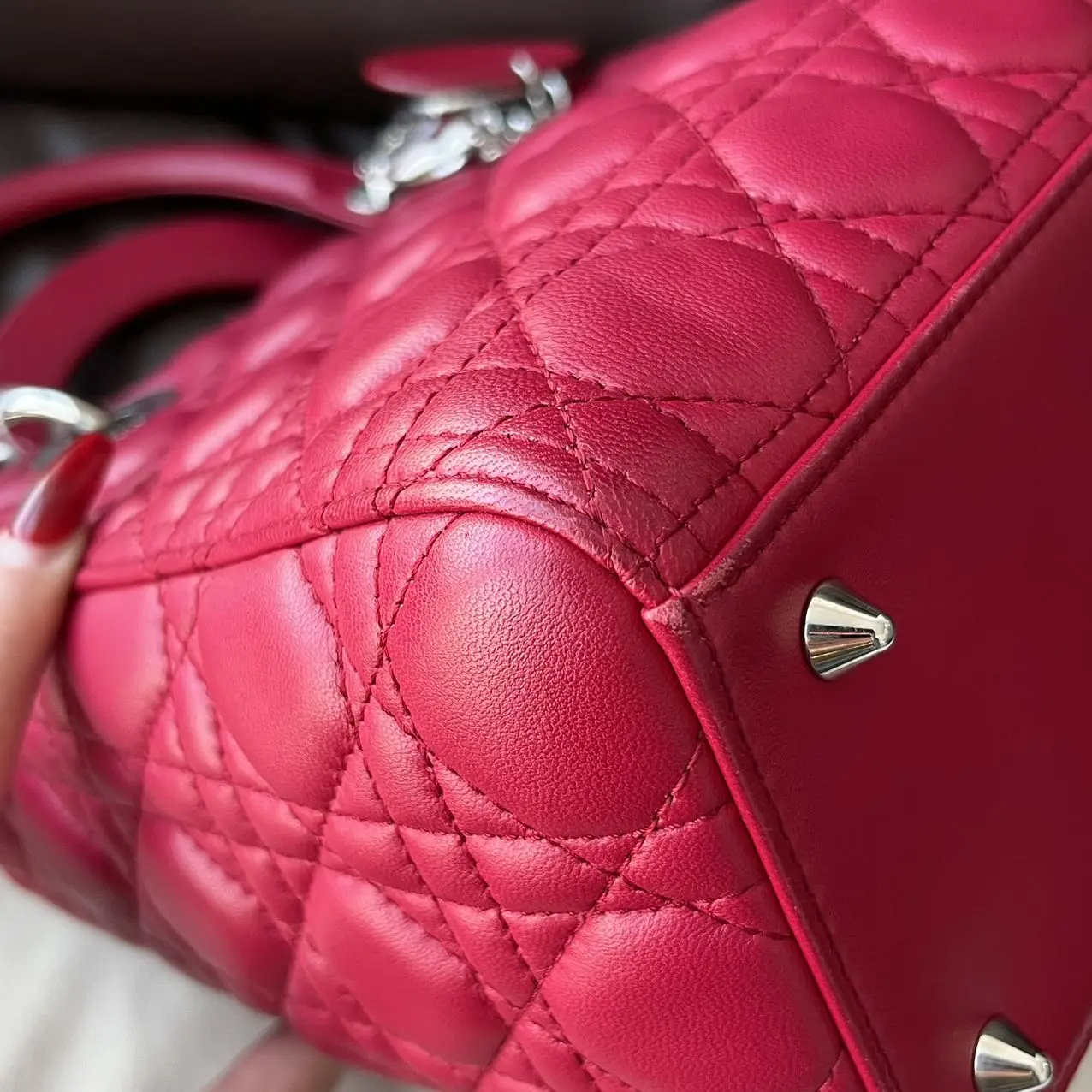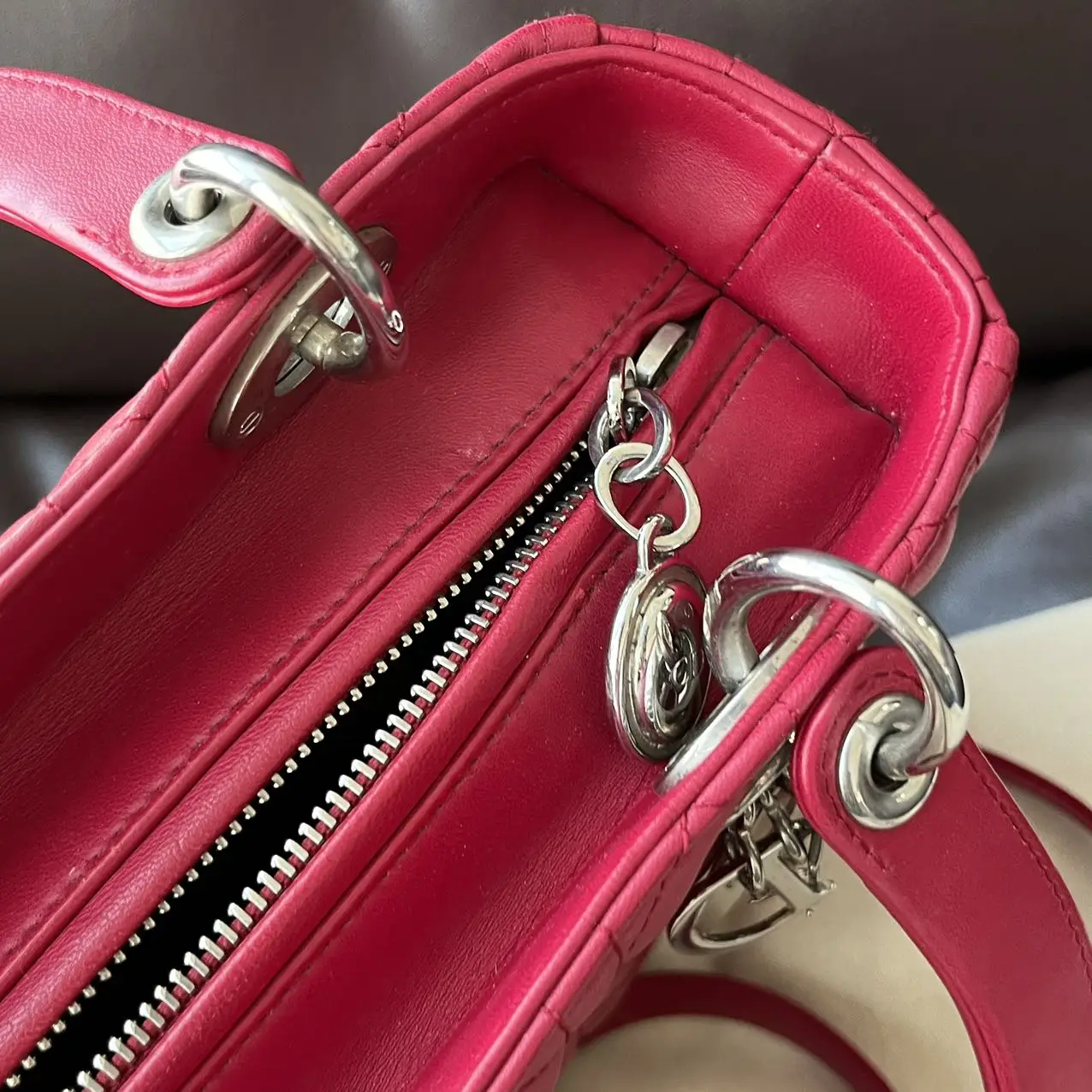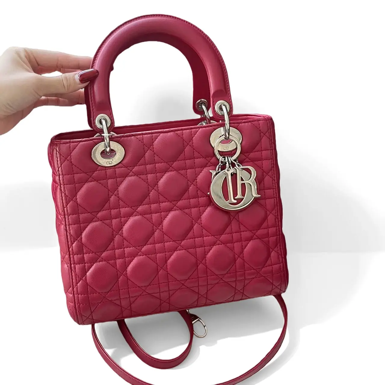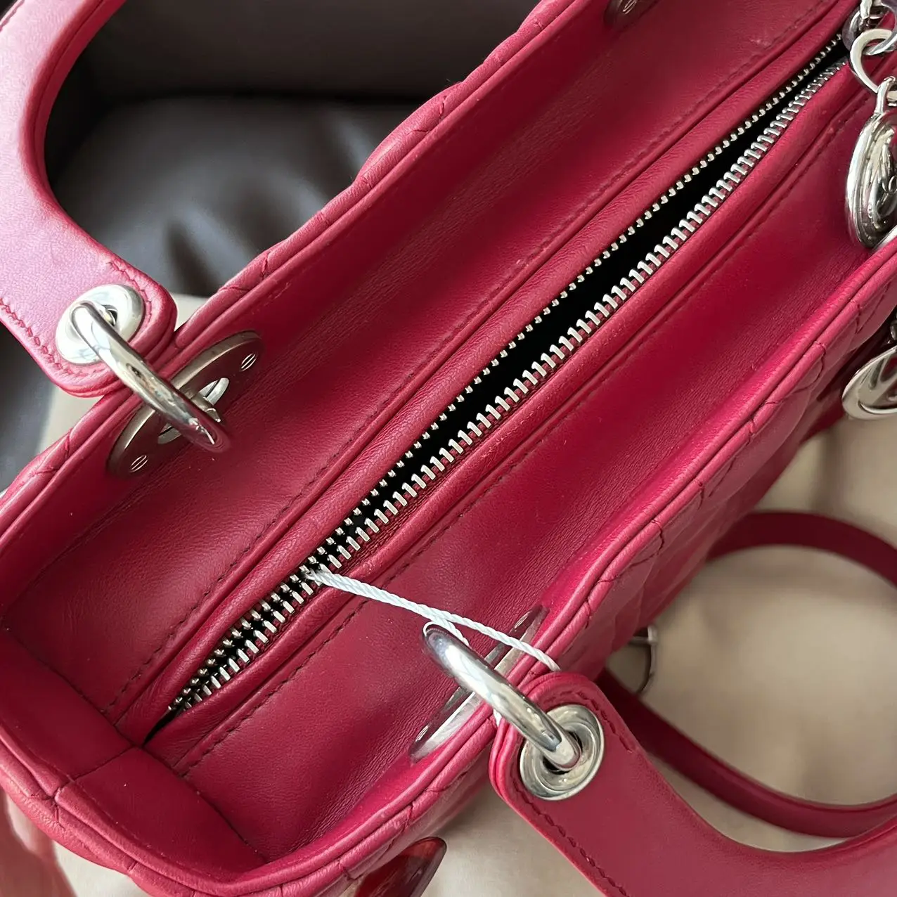 The DIOR Medium Lady Dior Bag in pink lambskin is a soft and timeless statement of elegance, where the delicate hue beautifully highlights the iconic Cannage quilting and polished ‘D.I.O.R.’ charms, offering a perfect blend of classic femininity and modern sophistication.