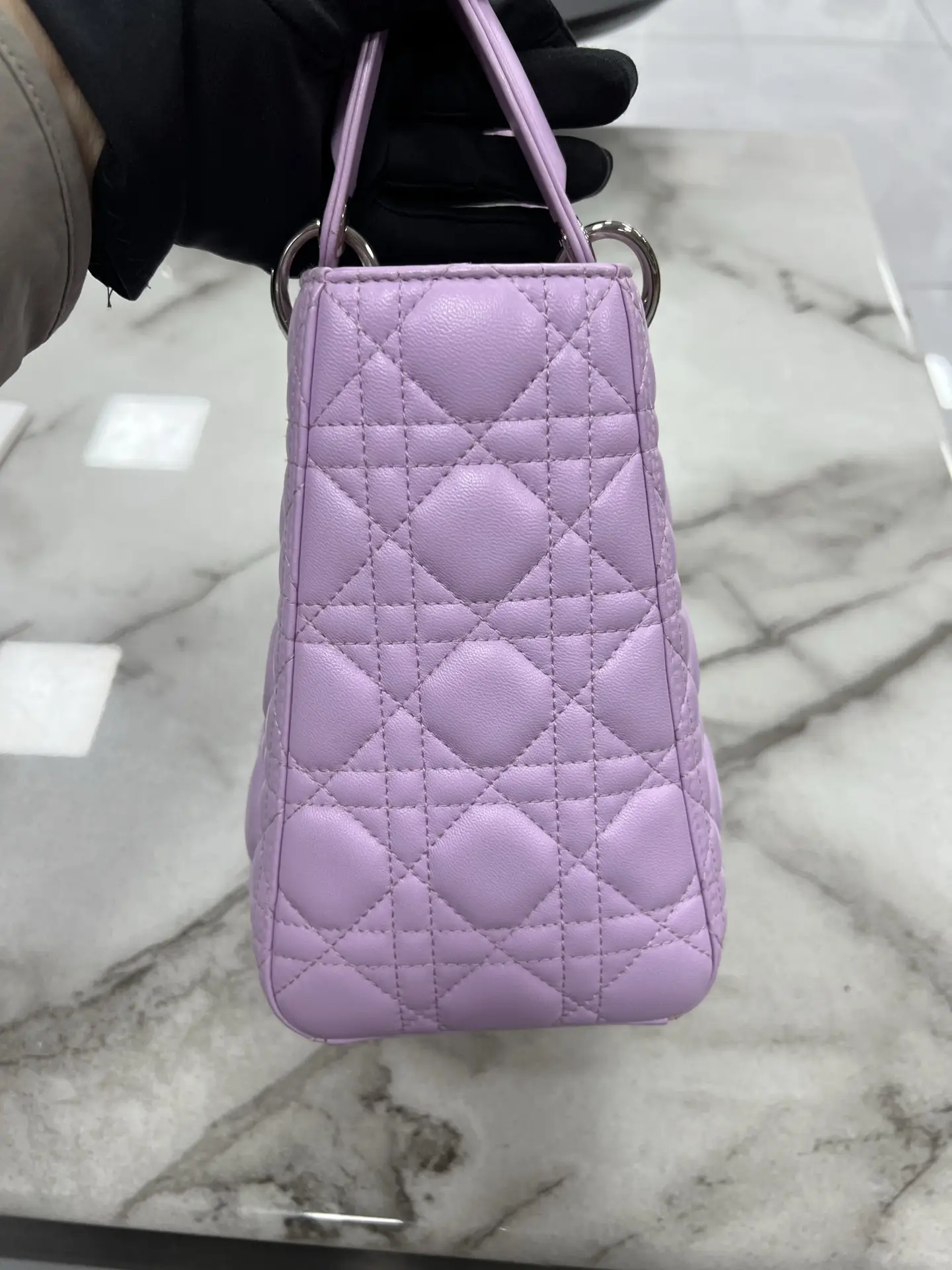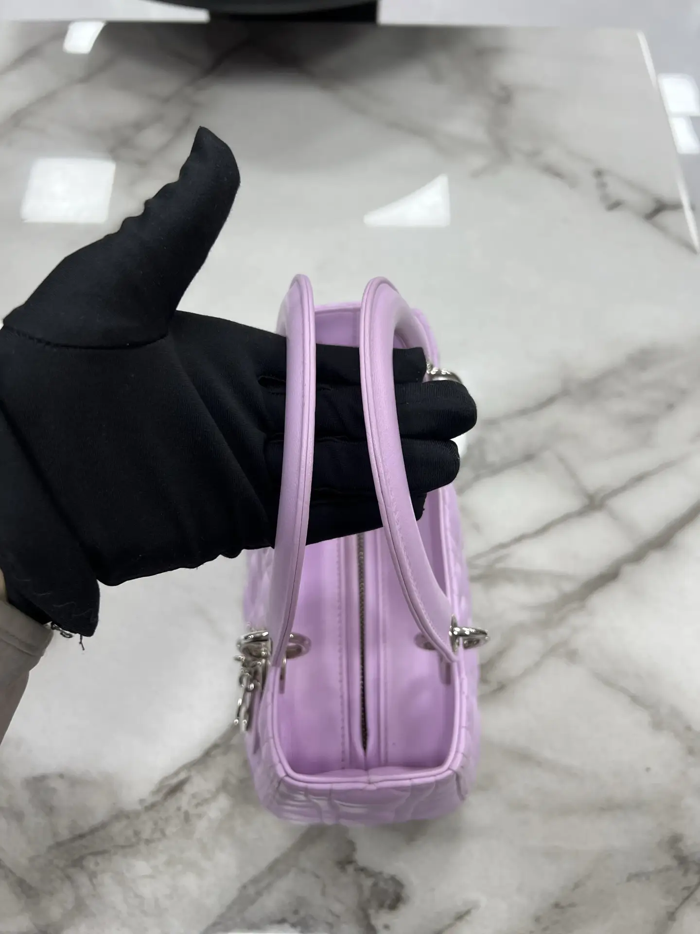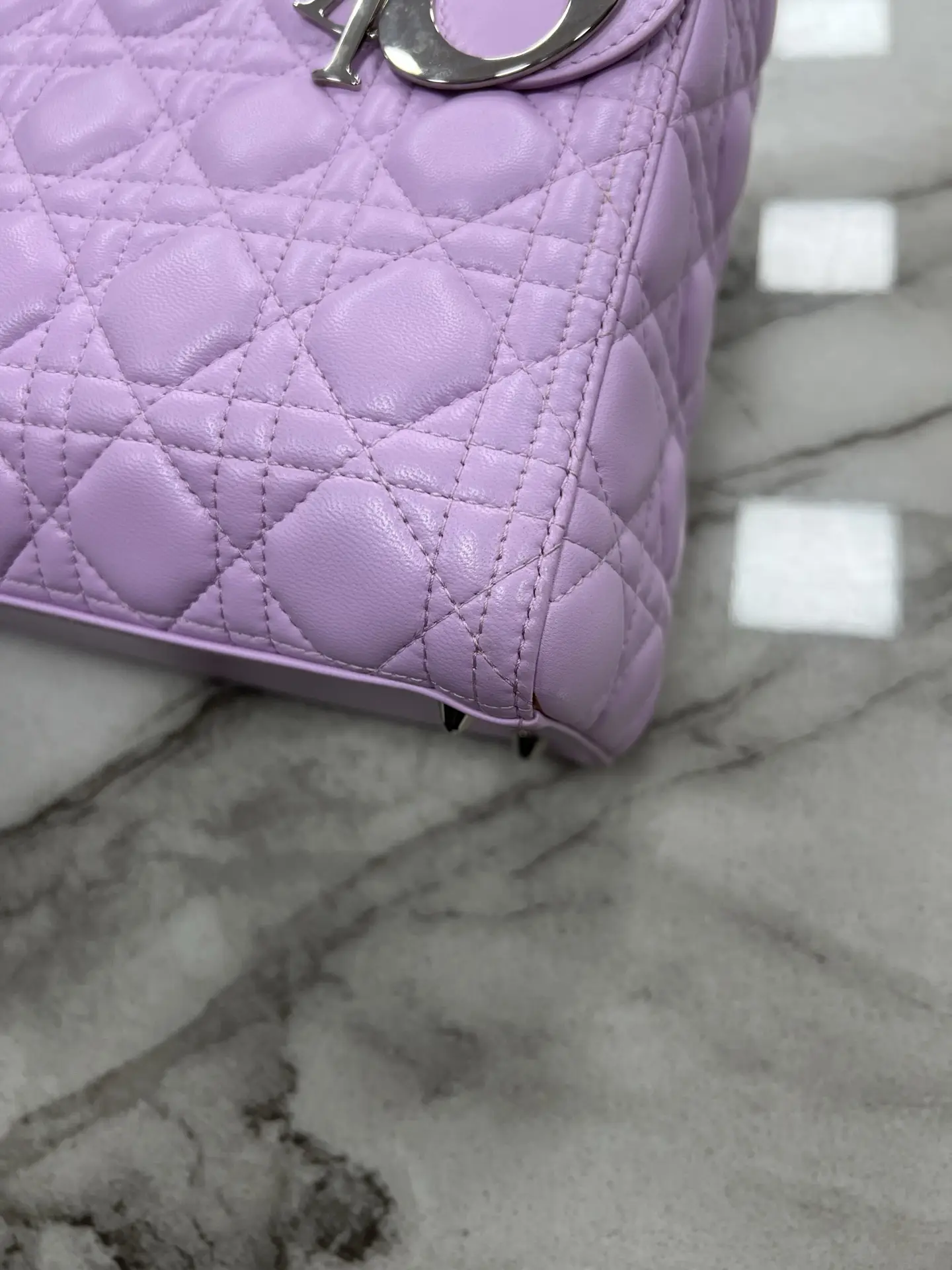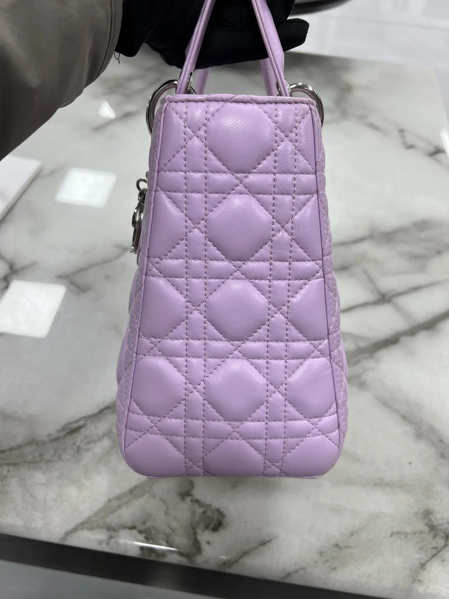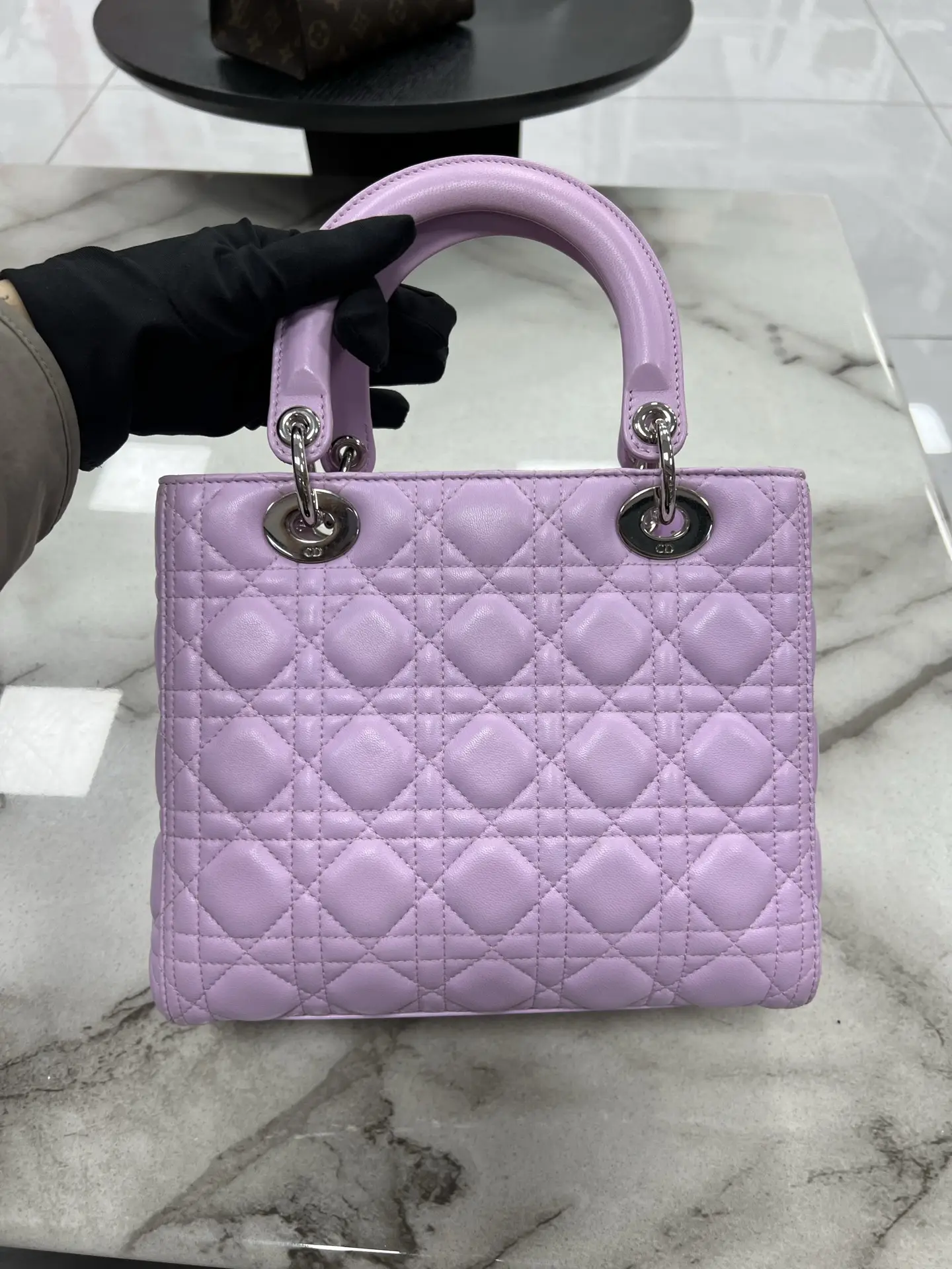 The DIOR Medium Lady Dior Bag in lilac lambskin is a soft and elegant statement, where the delicate pastel hue beautifully highlights the iconic Cannage quilting and polished ‘D.I.O.R.’ charms, offering a fresh and feminine interpretation of timeless luxury.