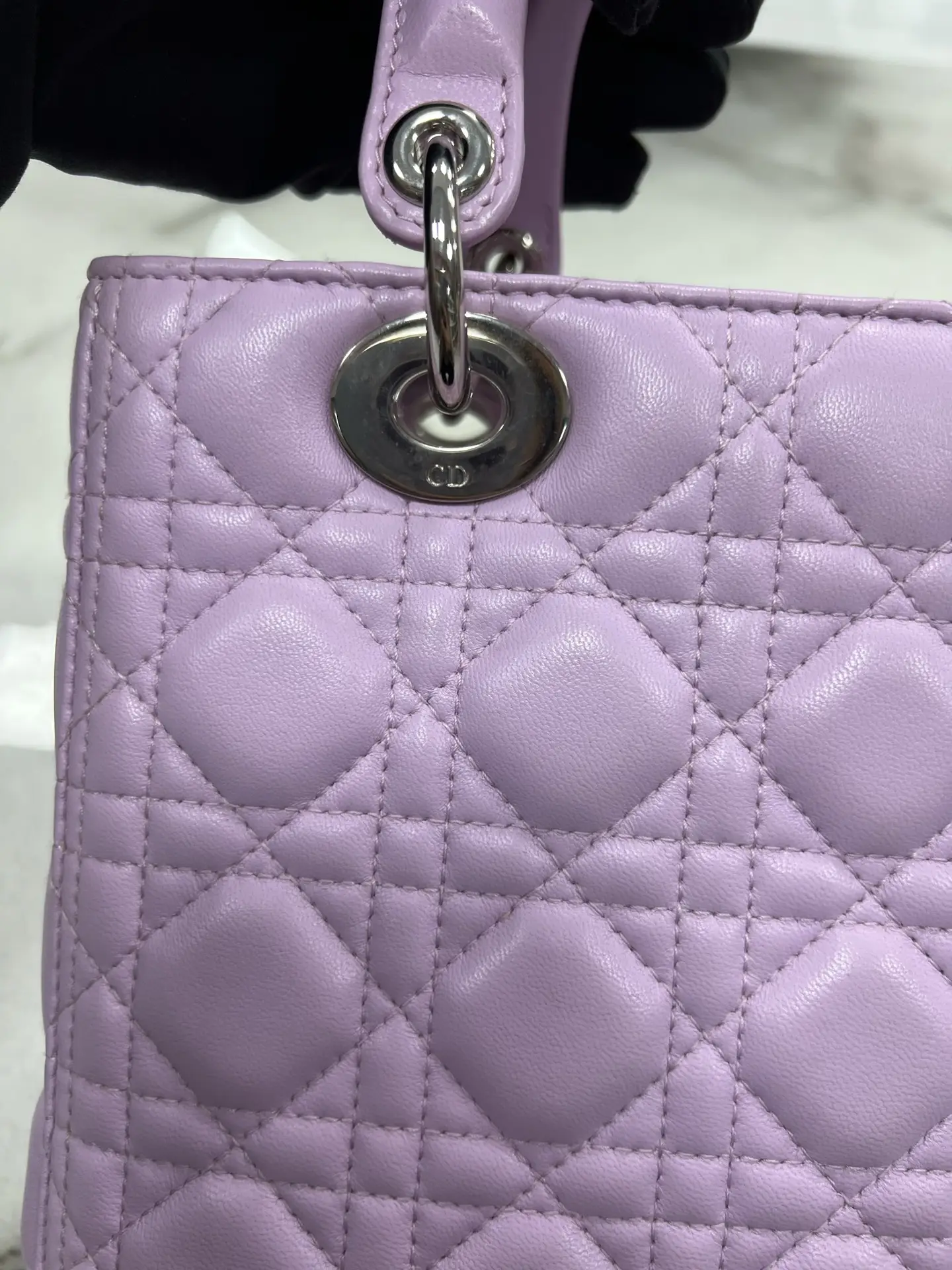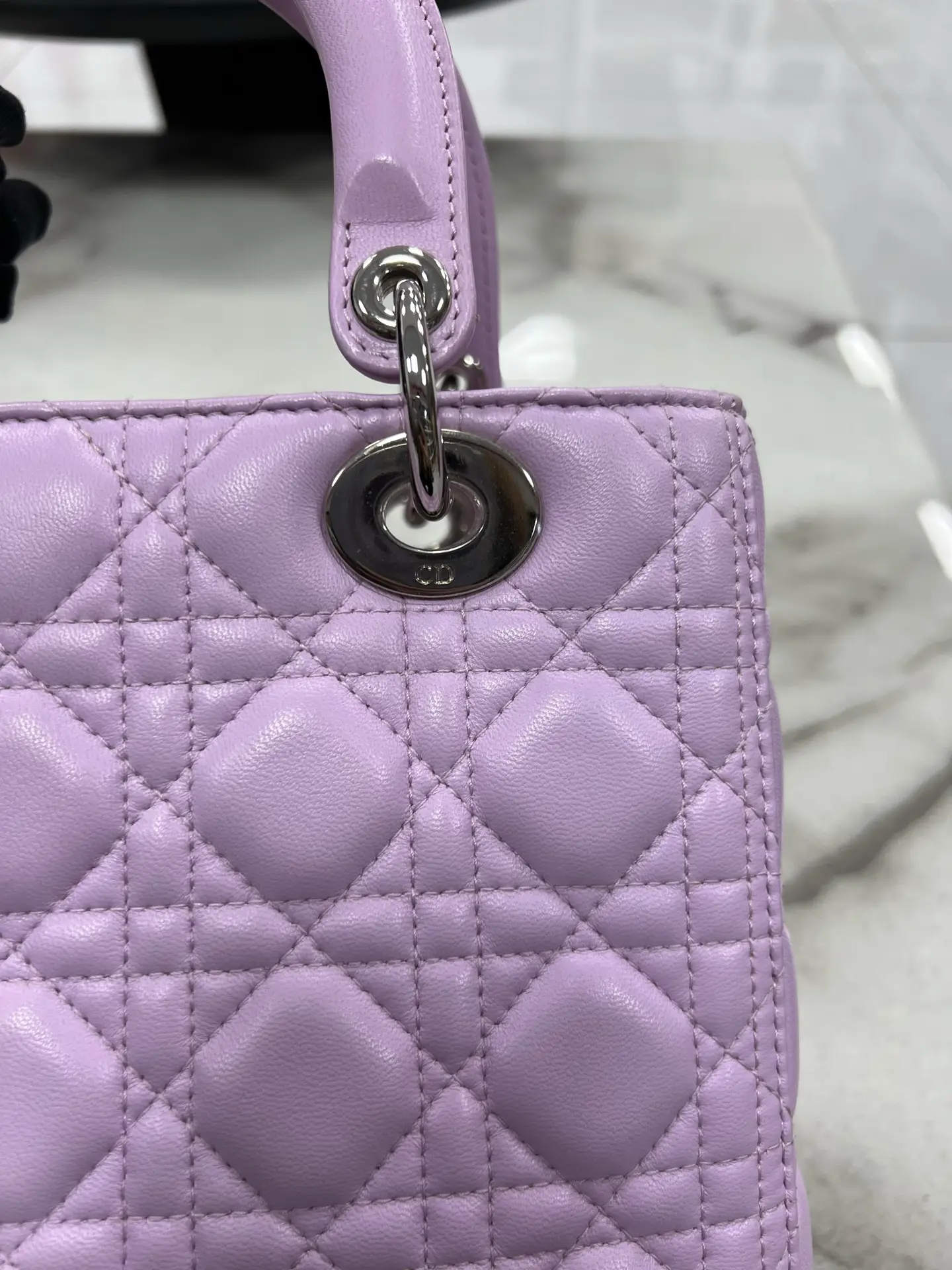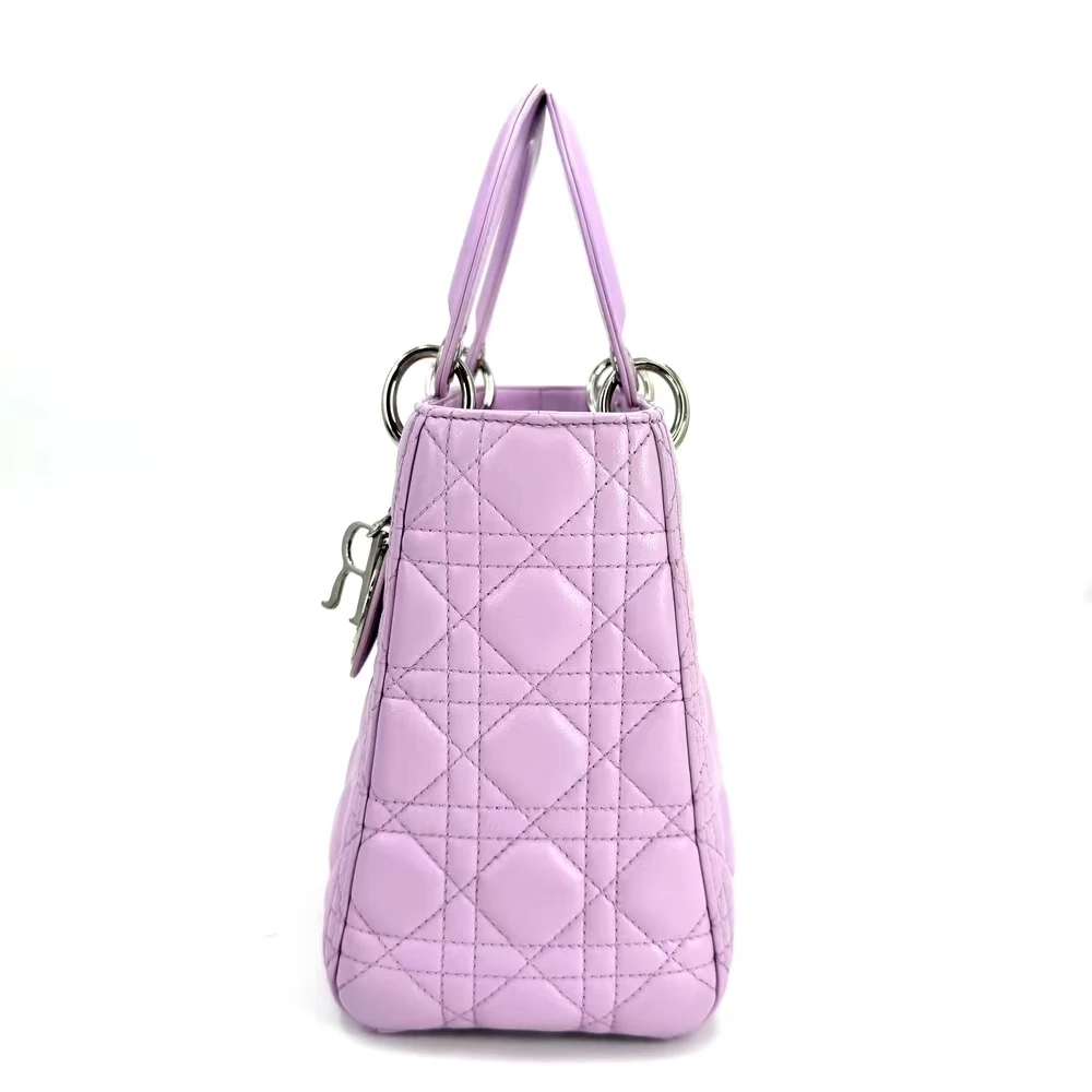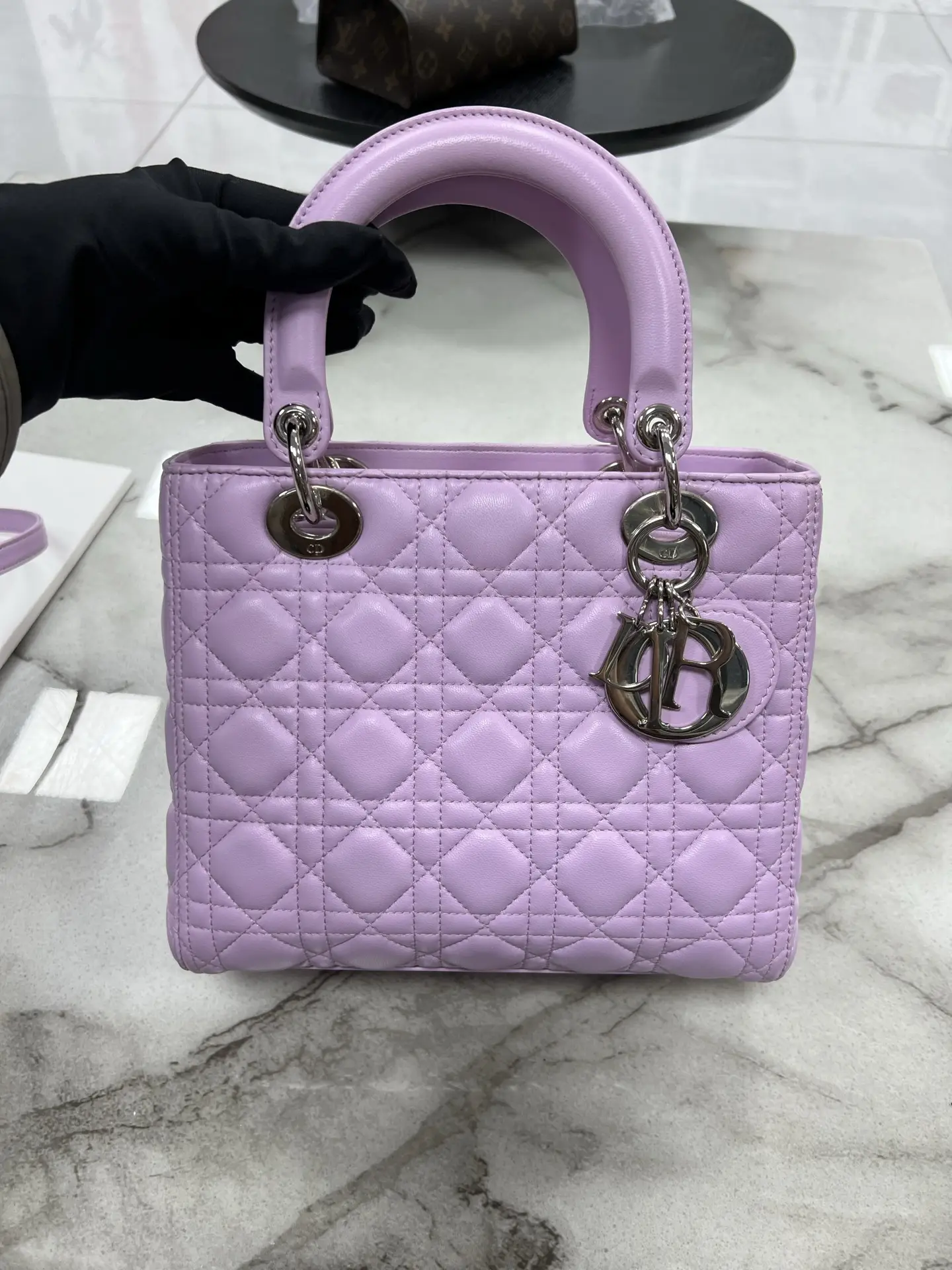 The DIOR Medium Lady Dior Bag in lilac lambskin is a soft and elegant statement, where the delicate pastel hue beautifully highlights the iconic Cannage quilting and polished ‘D.I.O.R.’ charms, offering a fresh and feminine interpretation of timeless luxury.