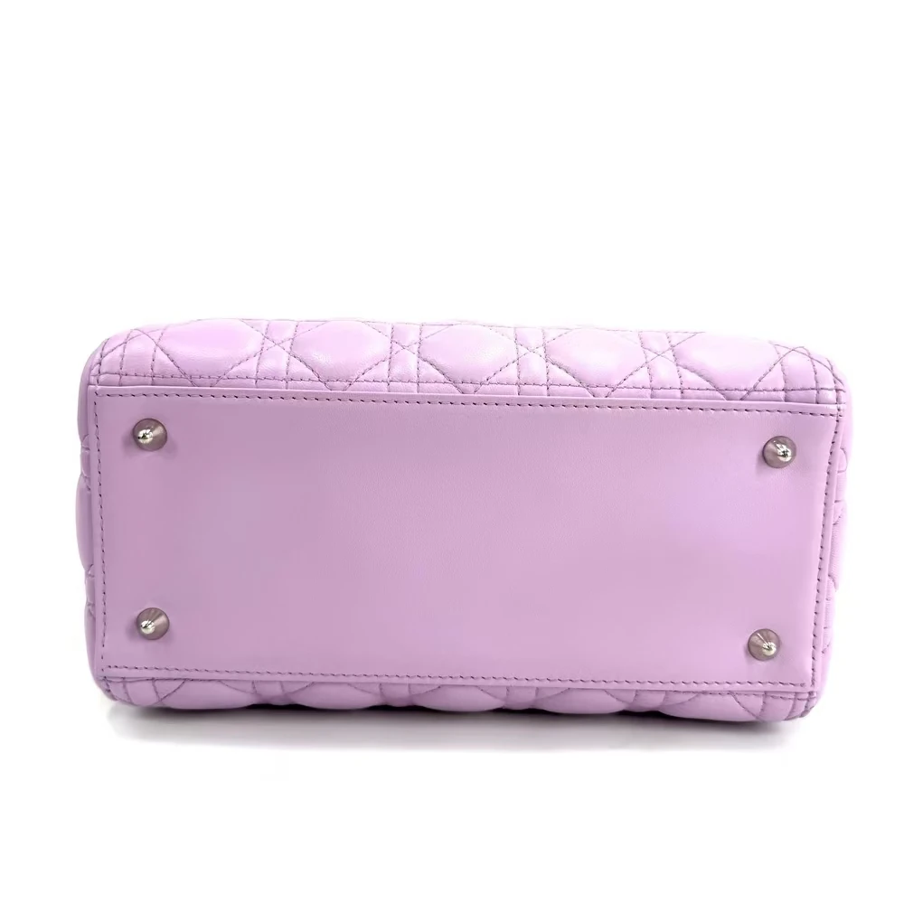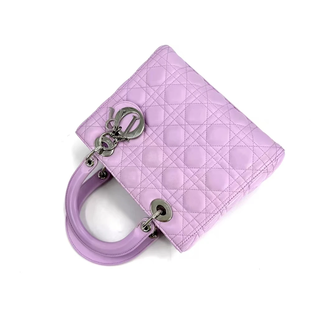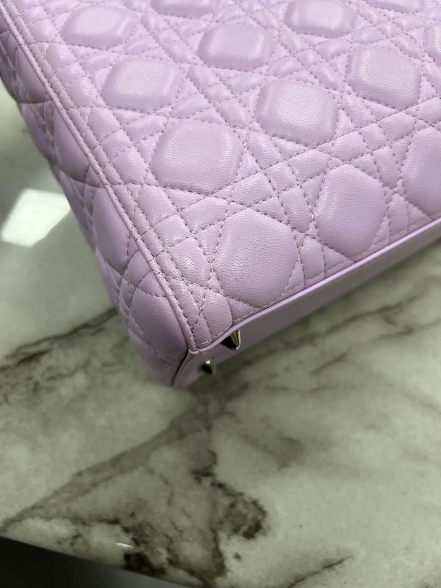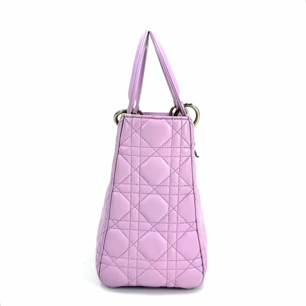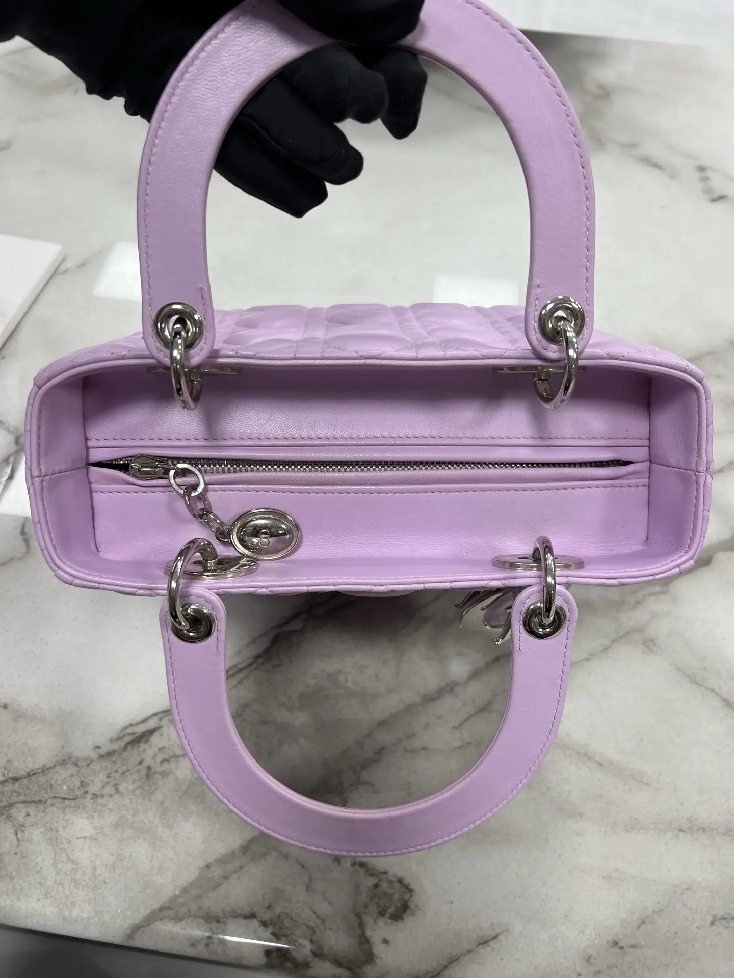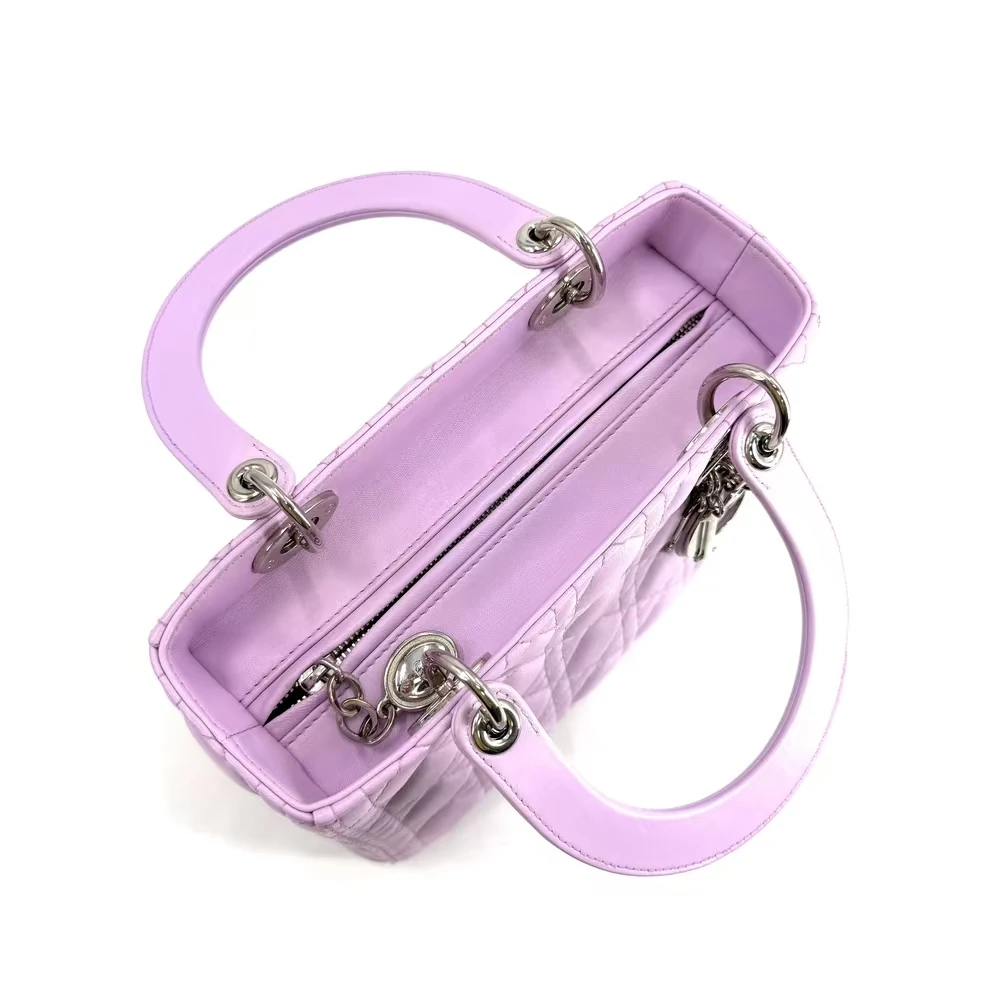 The DIOR Medium Lady Dior Bag in lilac lambskin is a soft and elegant statement, where the delicate pastel hue beautifully highlights the iconic Cannage quilting and polished ‘D.I.O.R.’ charms, offering a fresh and feminine interpretation of timeless luxury.