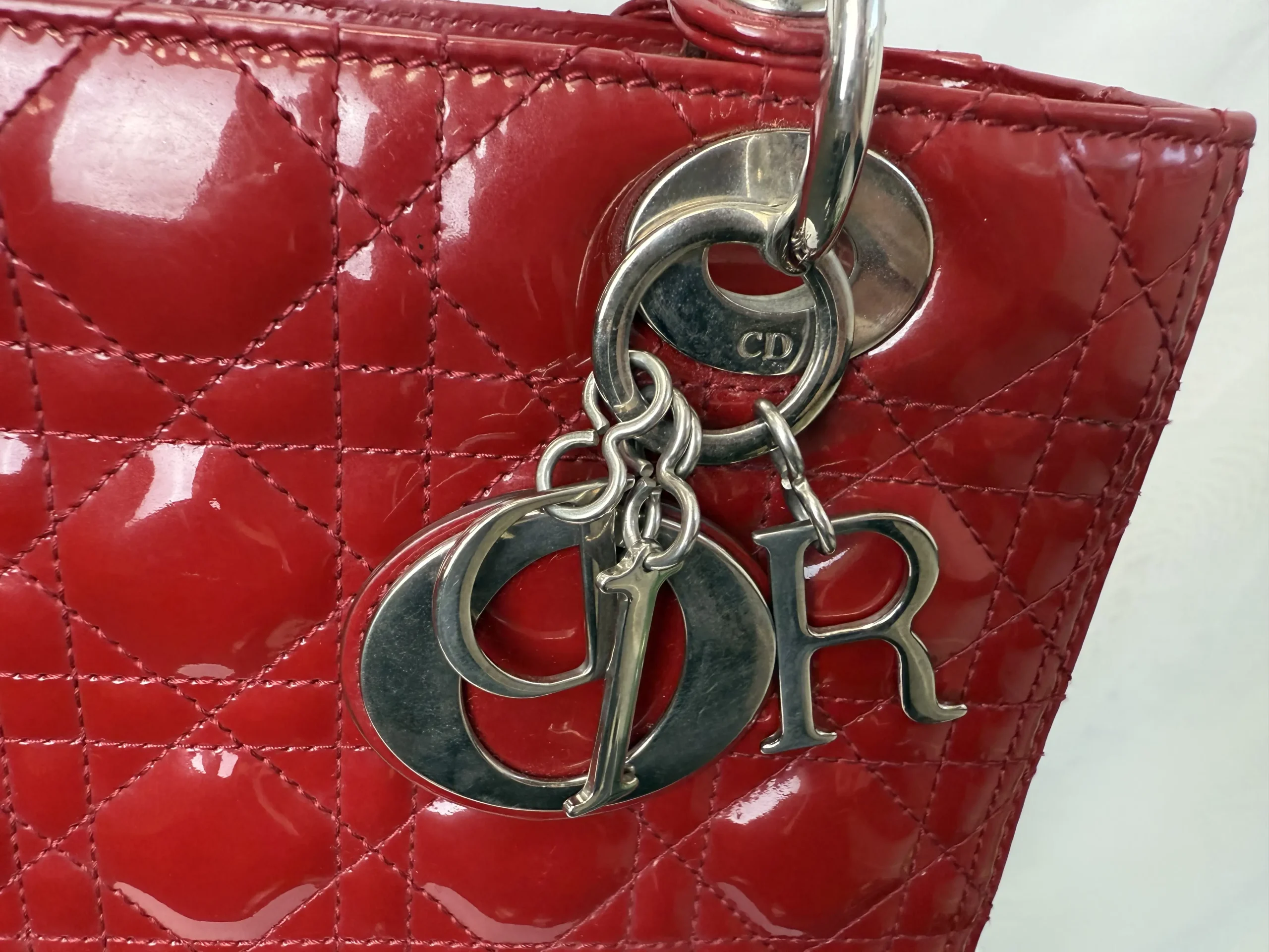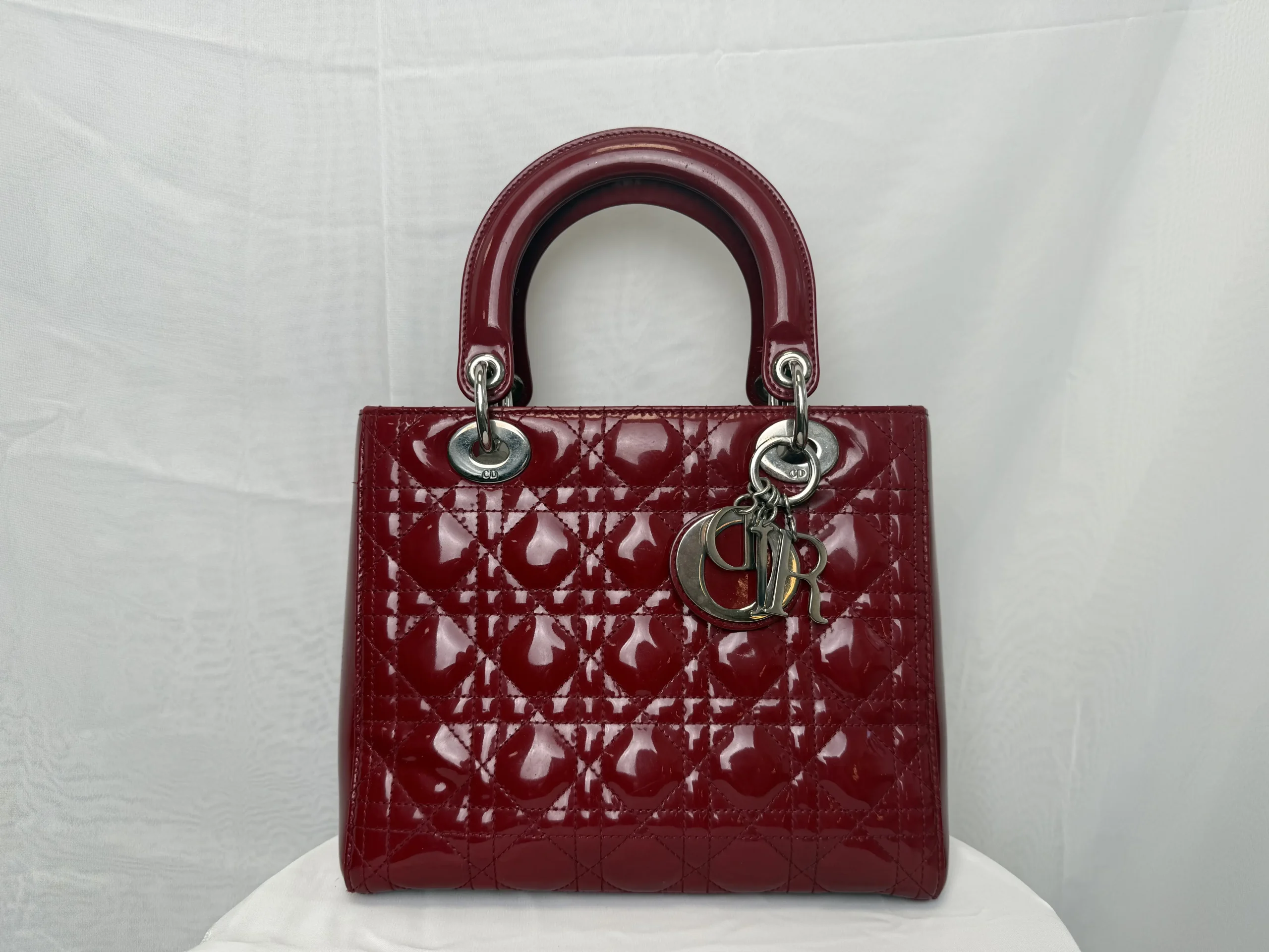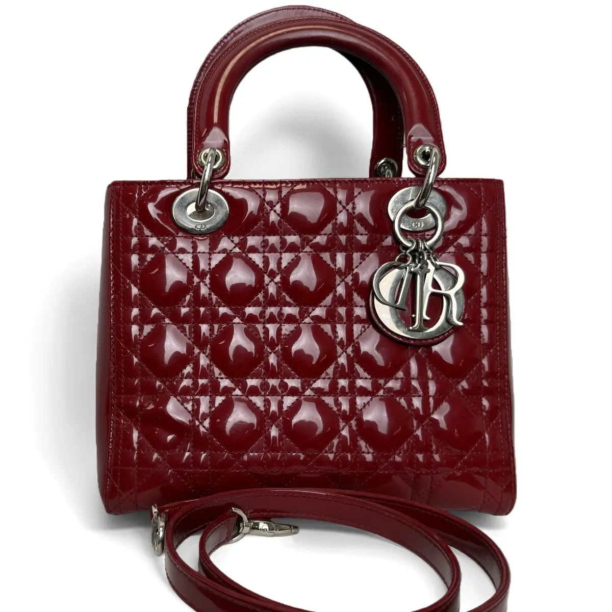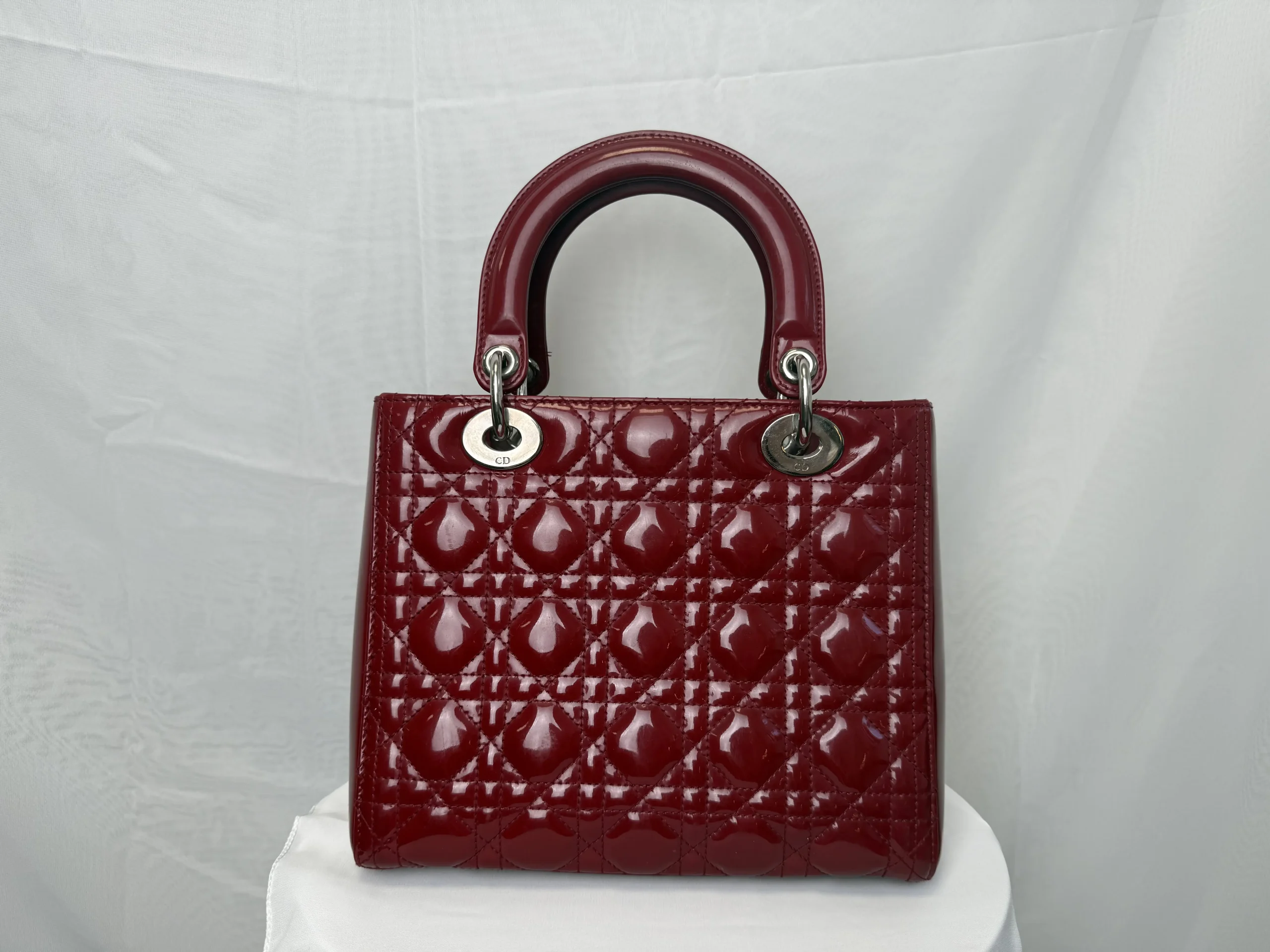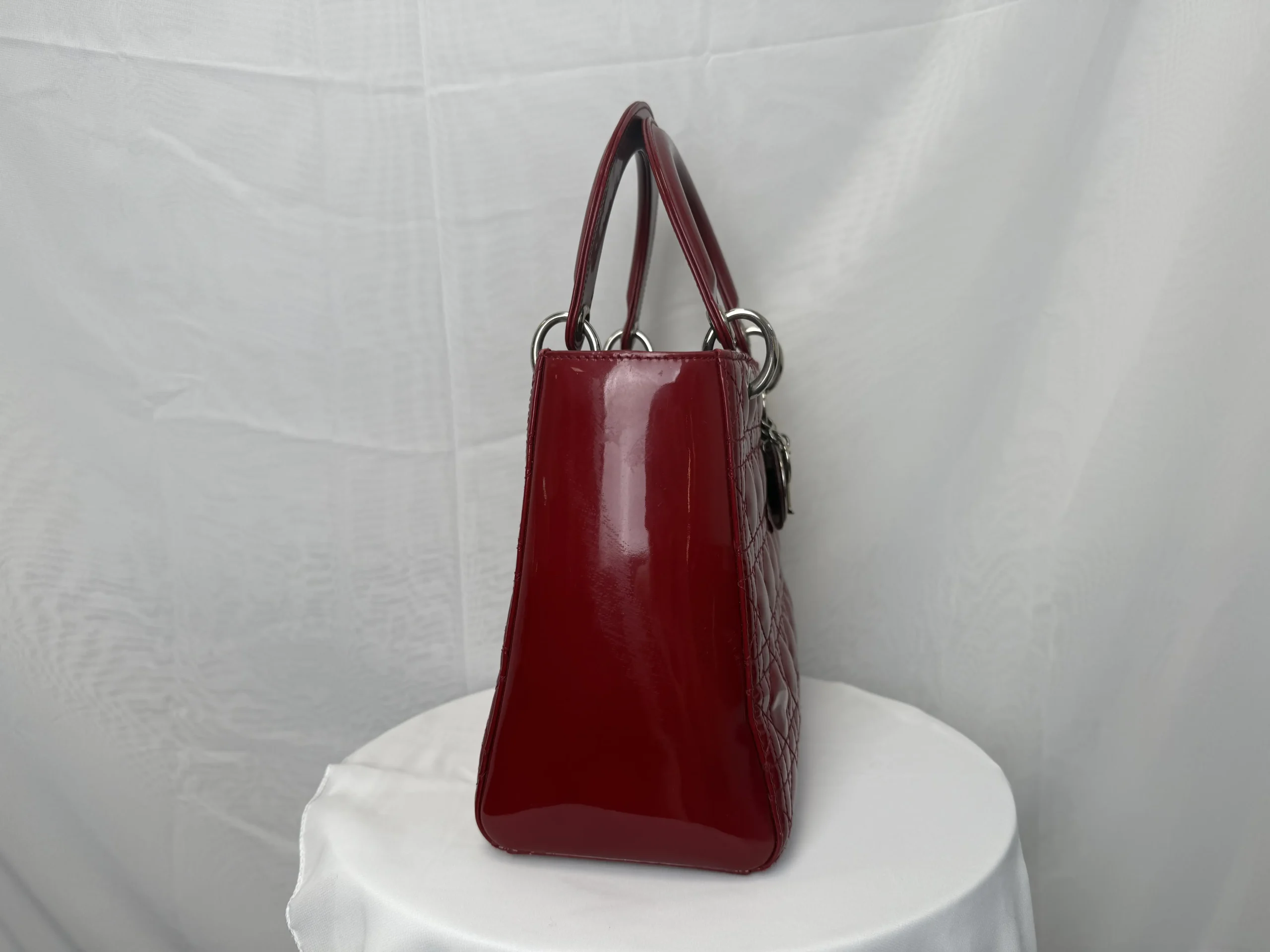 The DIOR Medium Lady Dior Bag in red patent leather is a bold and glamorous statement, where the iconic Cannage quilting and polished ‘D.I.O.R.’ charms are rendered in a high-shine finish, exuding modern sophistication and timeless allure.