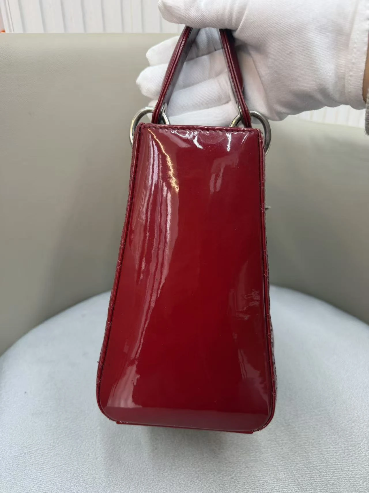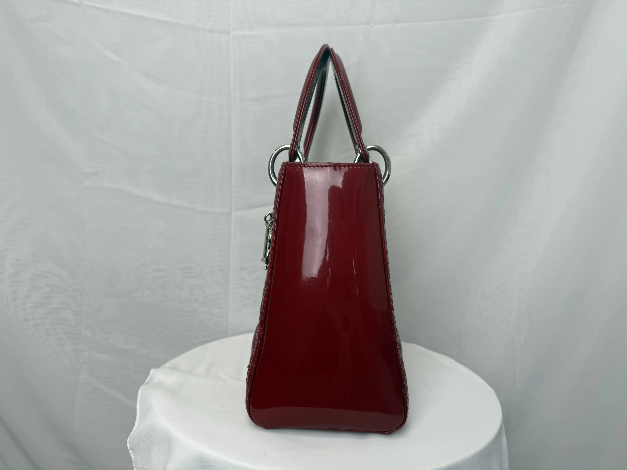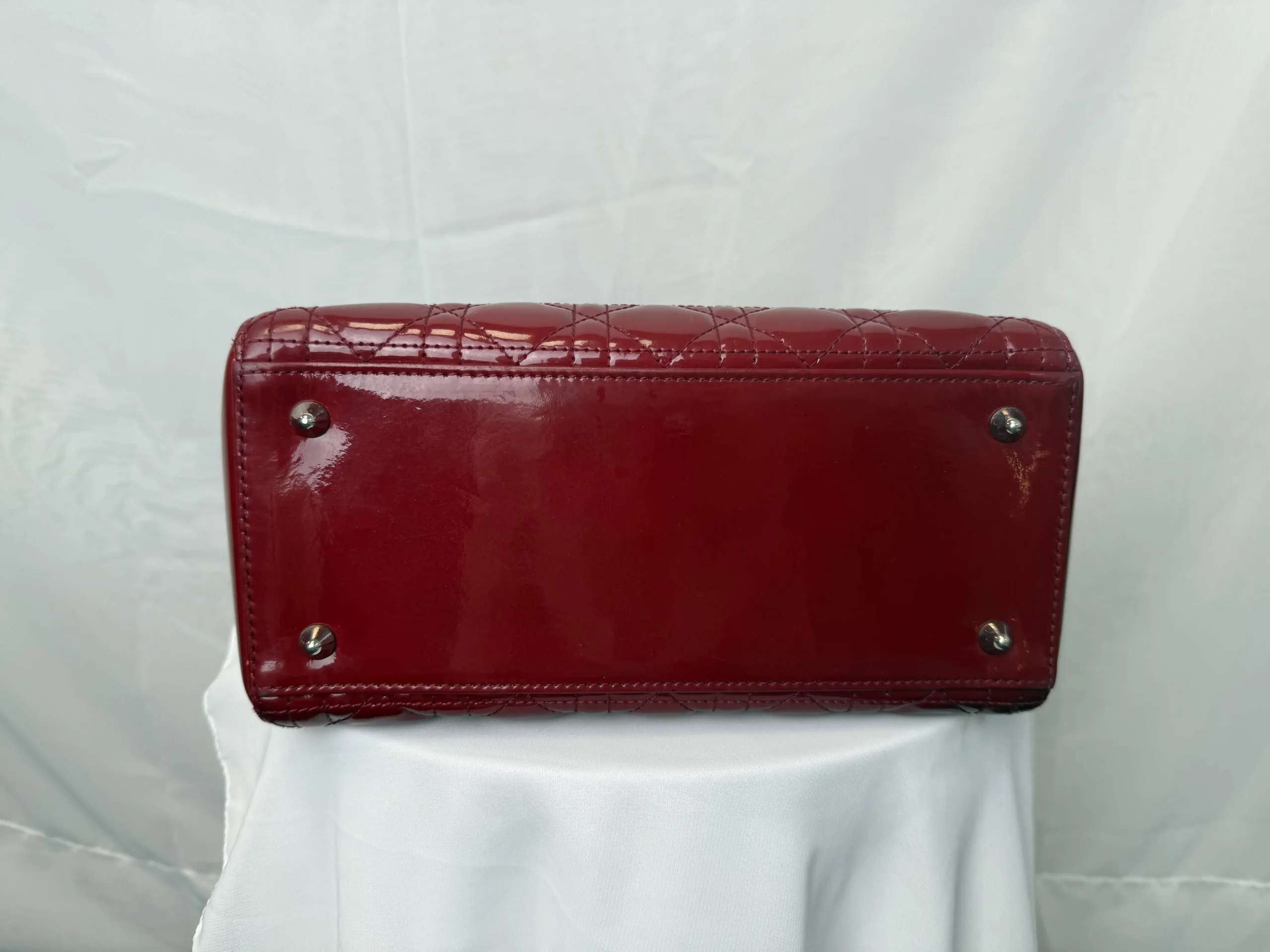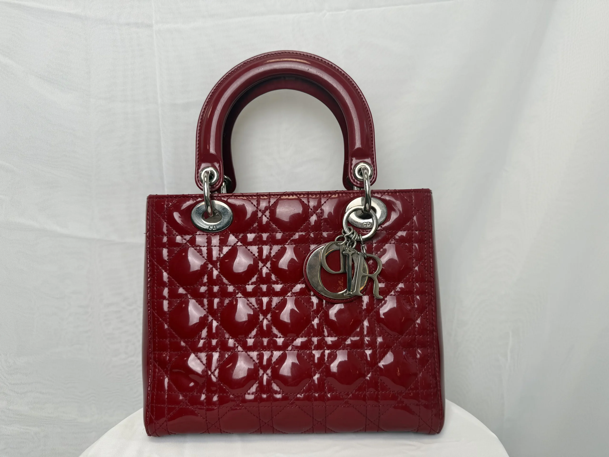 The DIOR Medium Lady Dior Bag in red patent leather is a bold and glamorous statement, where the iconic Cannage quilting and polished ‘D.I.O.R.’ charms are rendered in a high-shine finish, exuding modern sophistication and timeless allure.