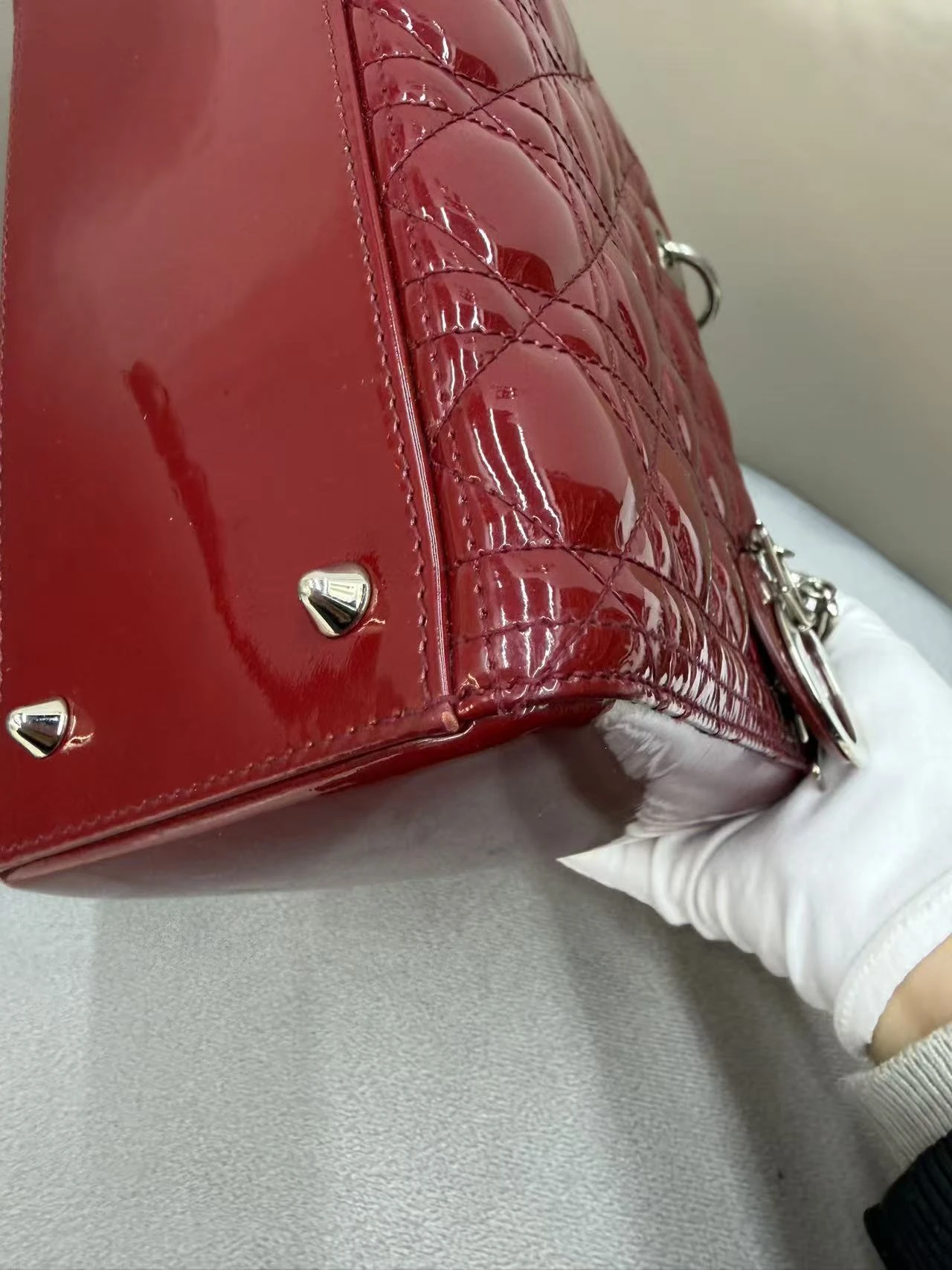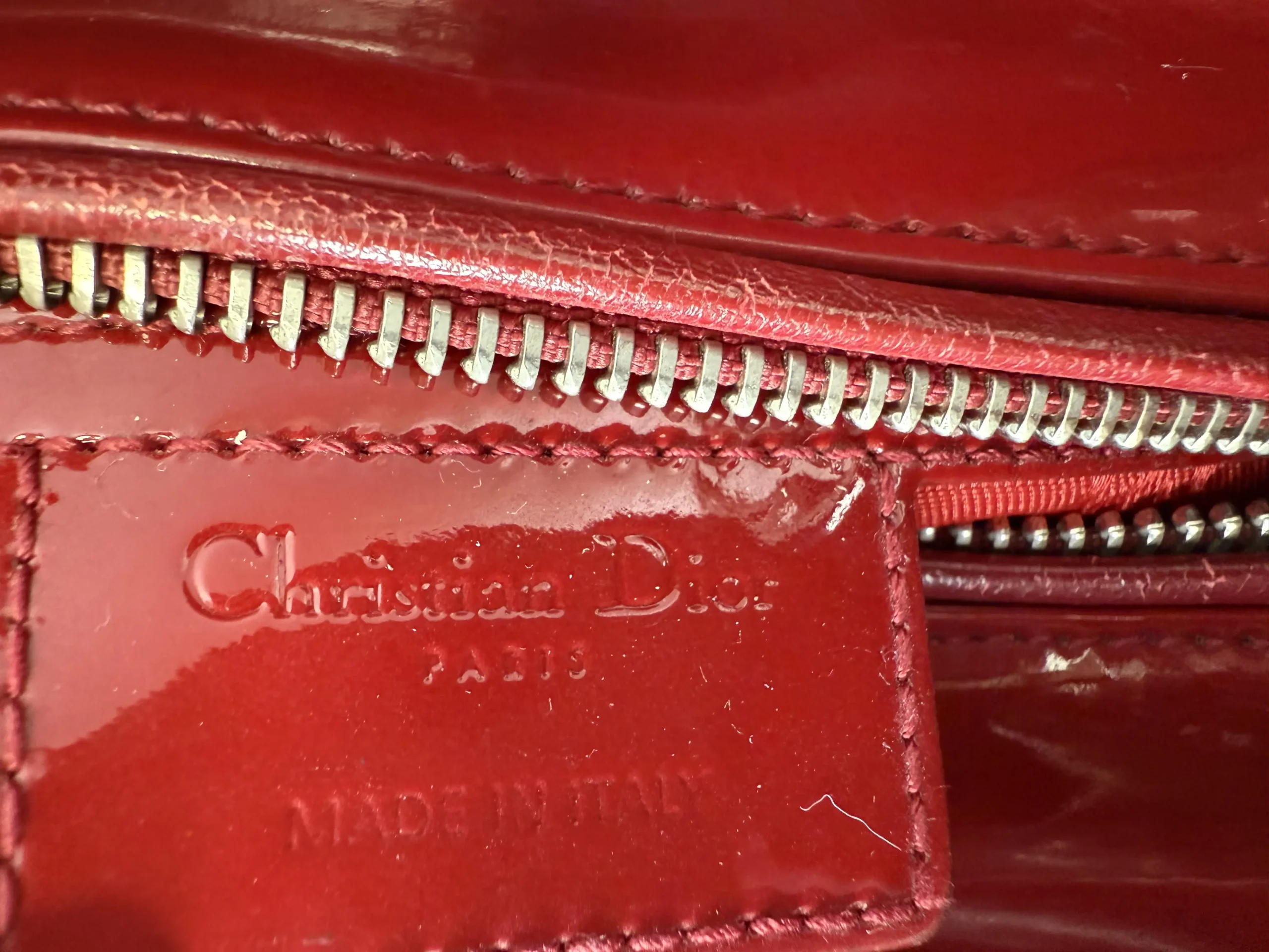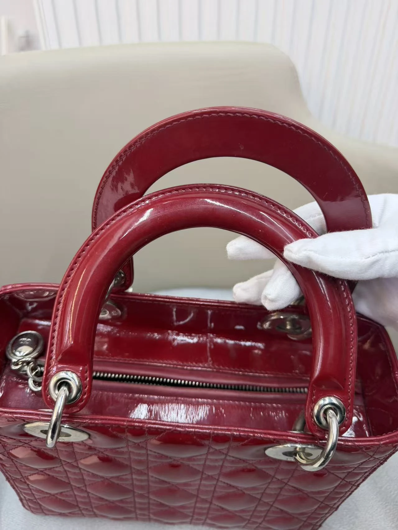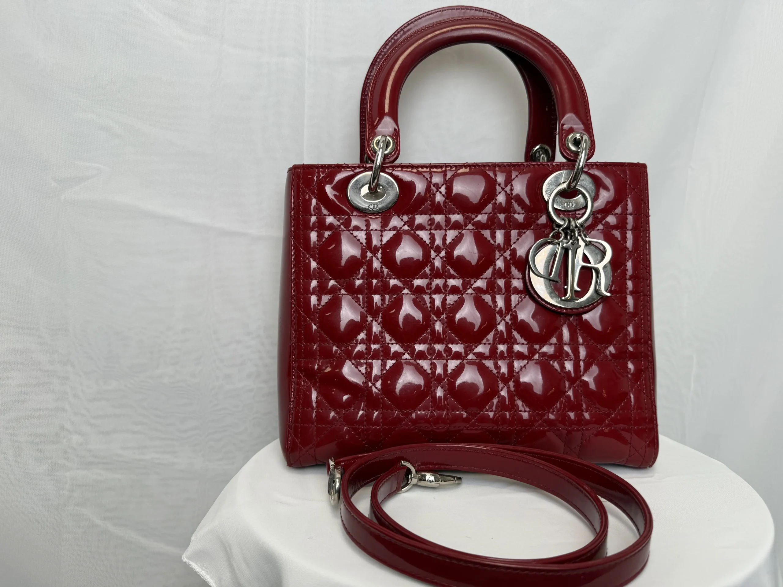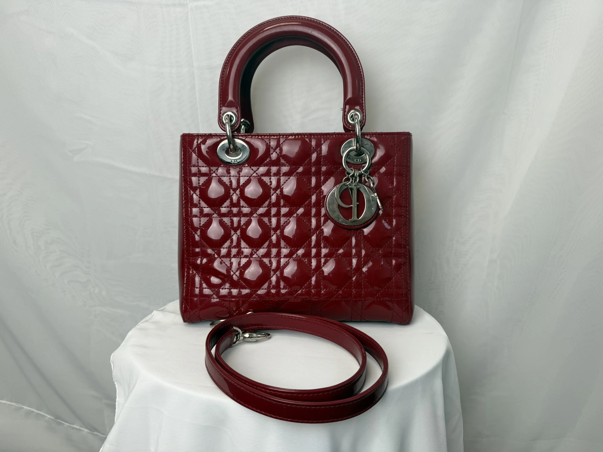 The DIOR Medium Lady Dior Bag in red patent leather is a bold and glamorous statement, where the iconic Cannage quilting and polished ‘D.I.O.R.’ charms are rendered in a high-shine finish, exuding modern sophistication and timeless allure.