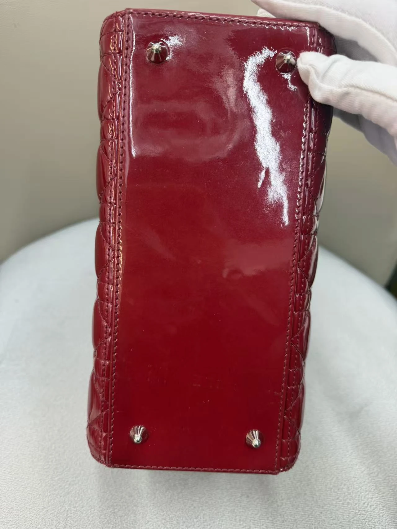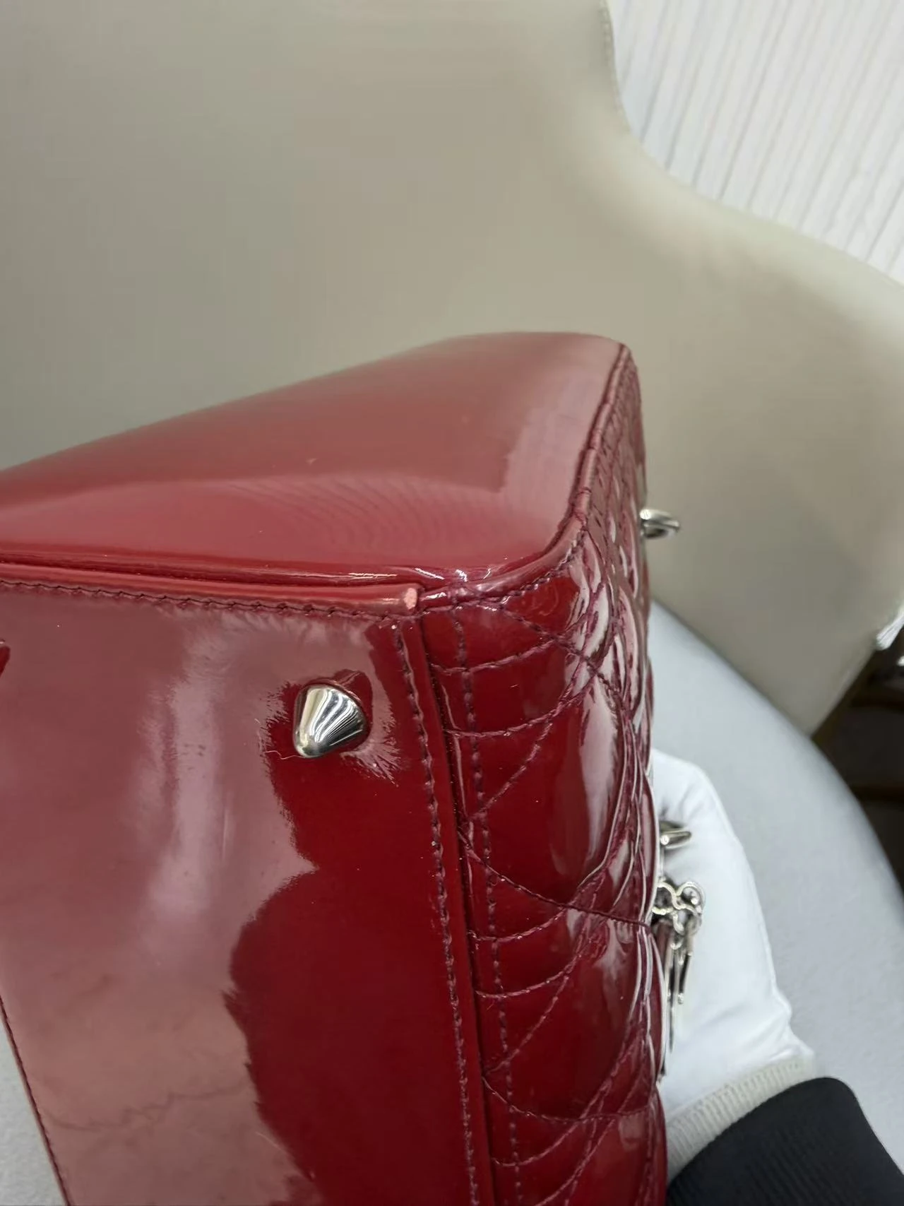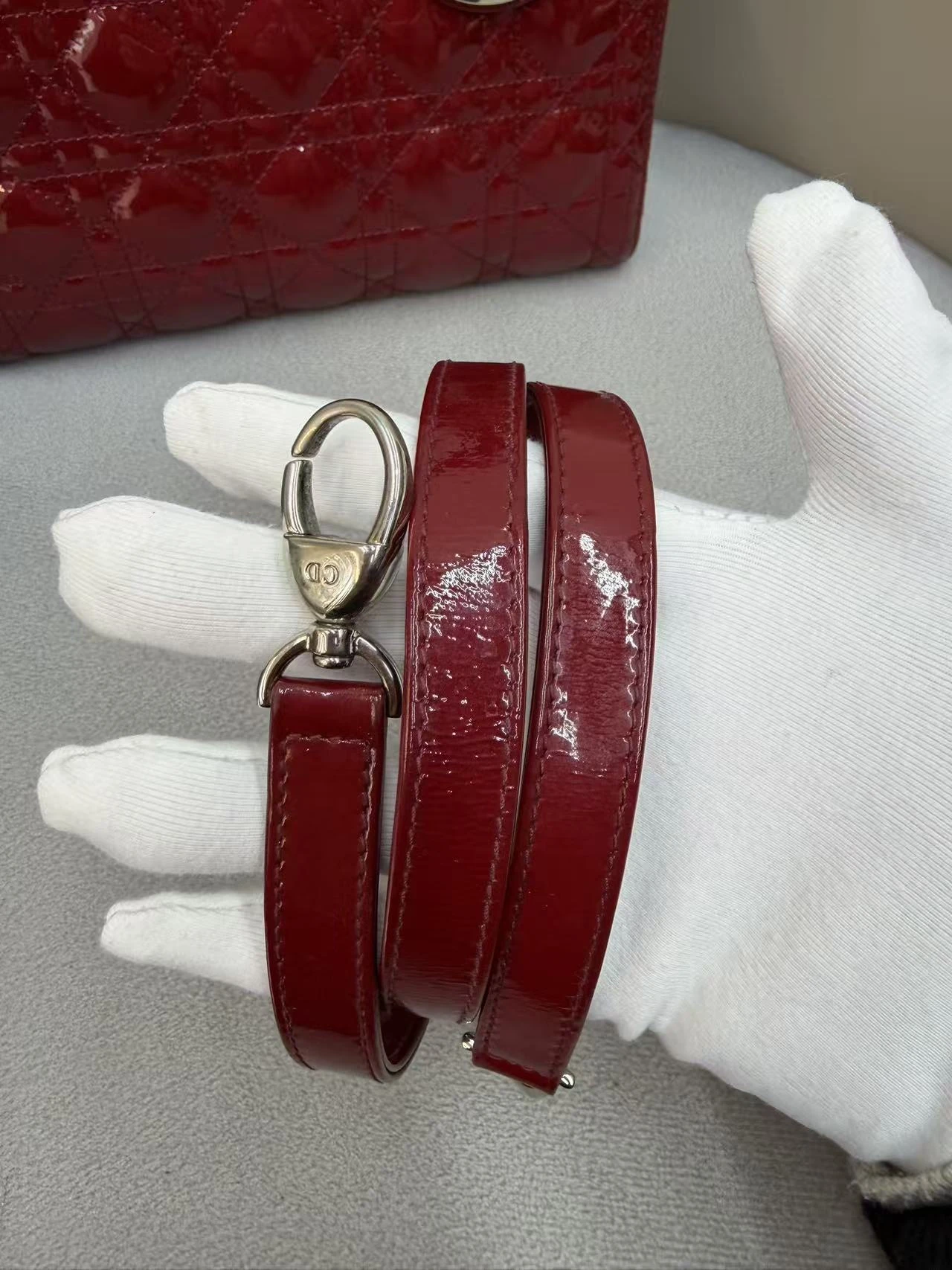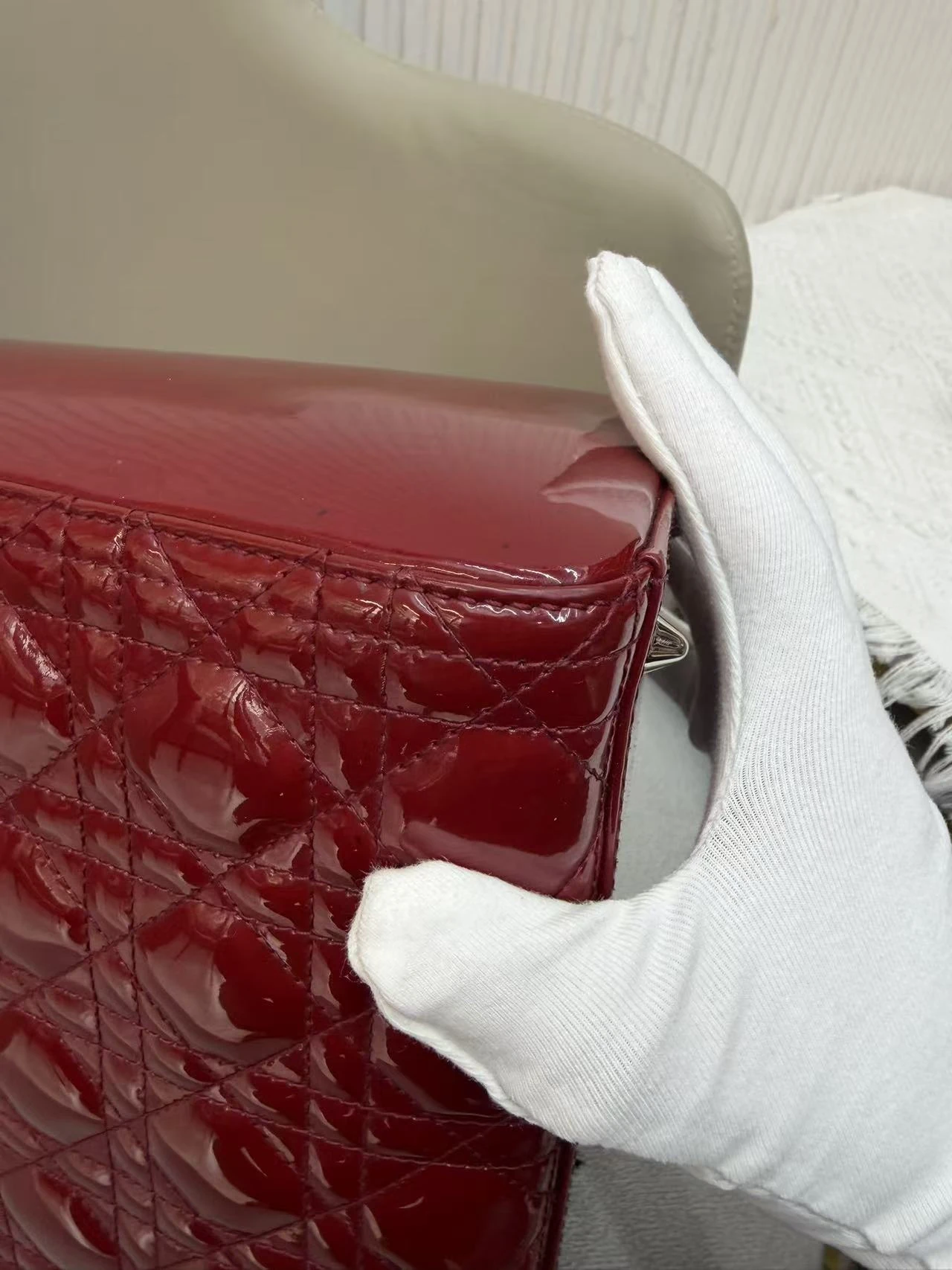 The DIOR Medium Lady Dior Bag in red patent leather is a bold and glamorous statement, where the iconic Cannage quilting and polished ‘D.I.O.R.’ charms are rendered in a high-shine finish, exuding modern sophistication and timeless allure.