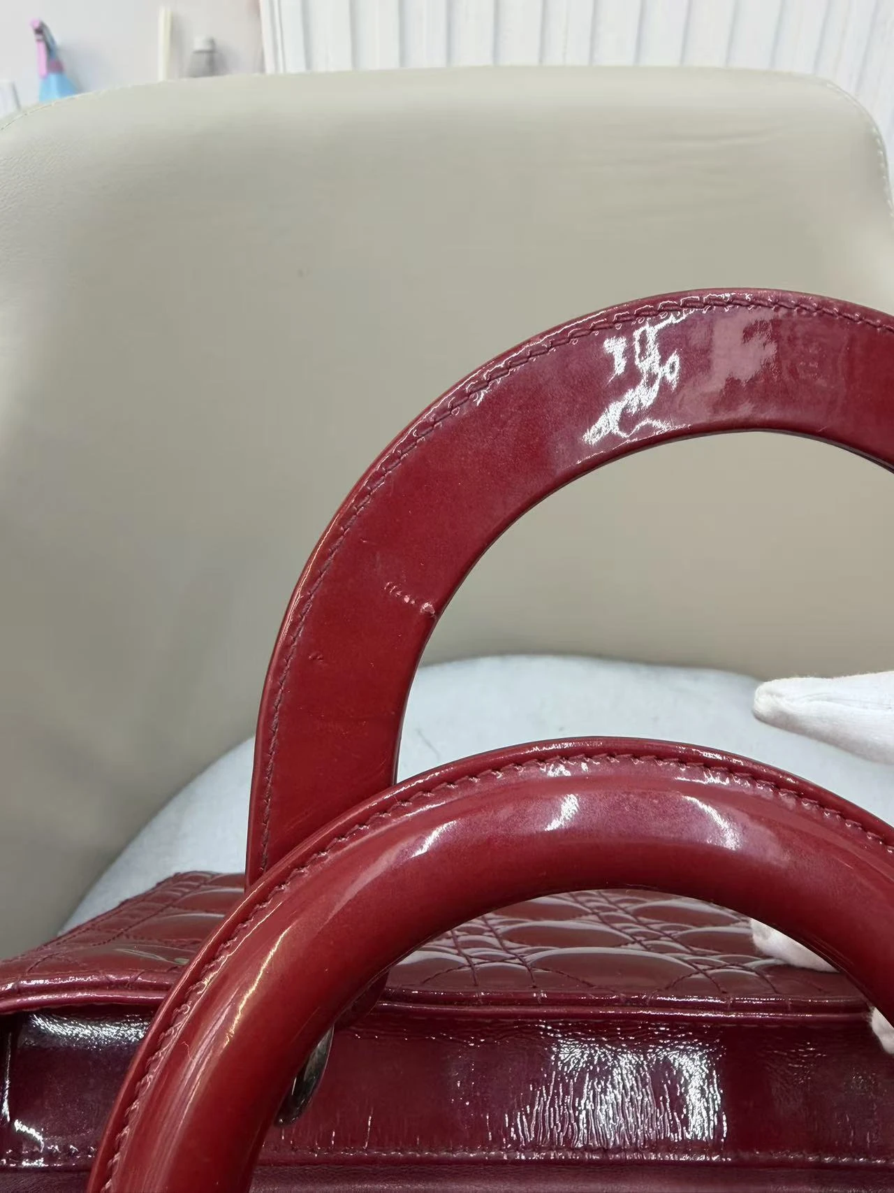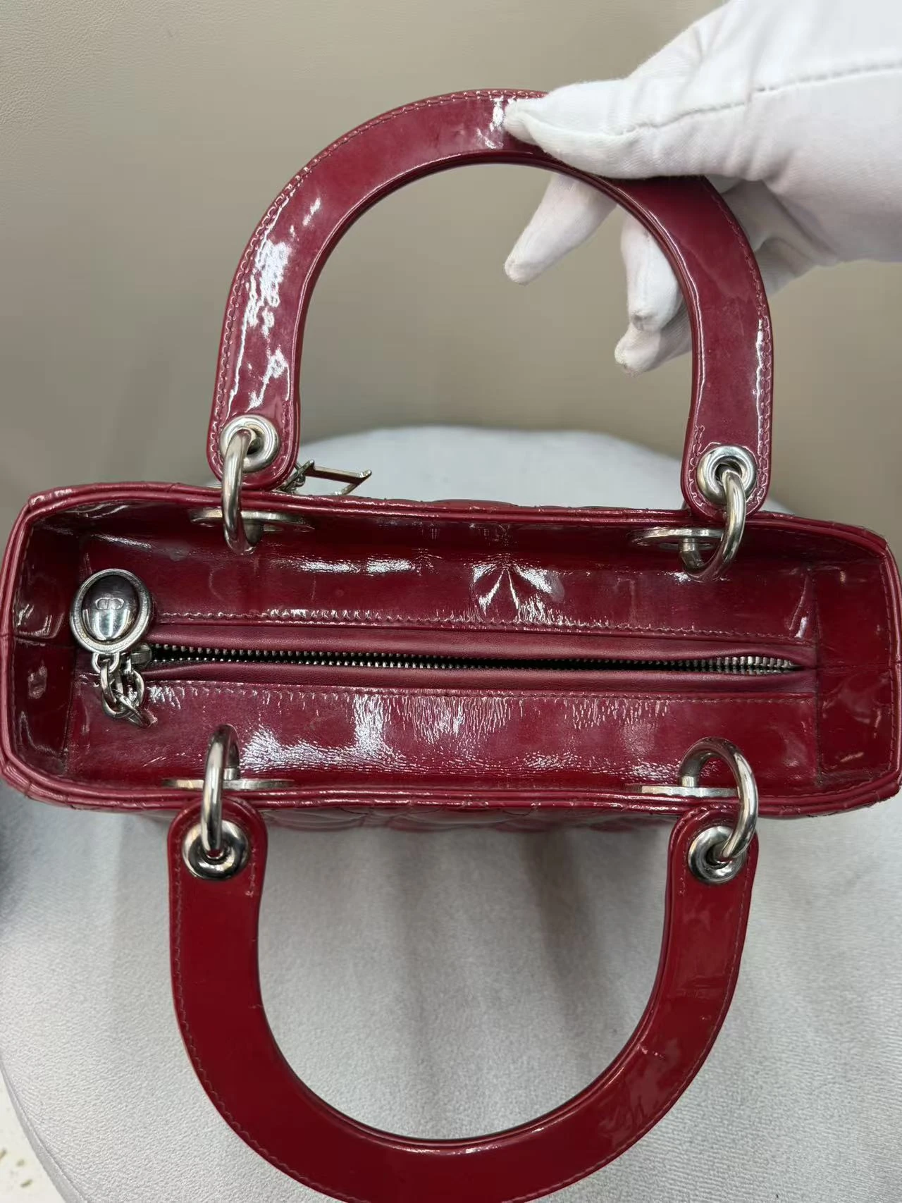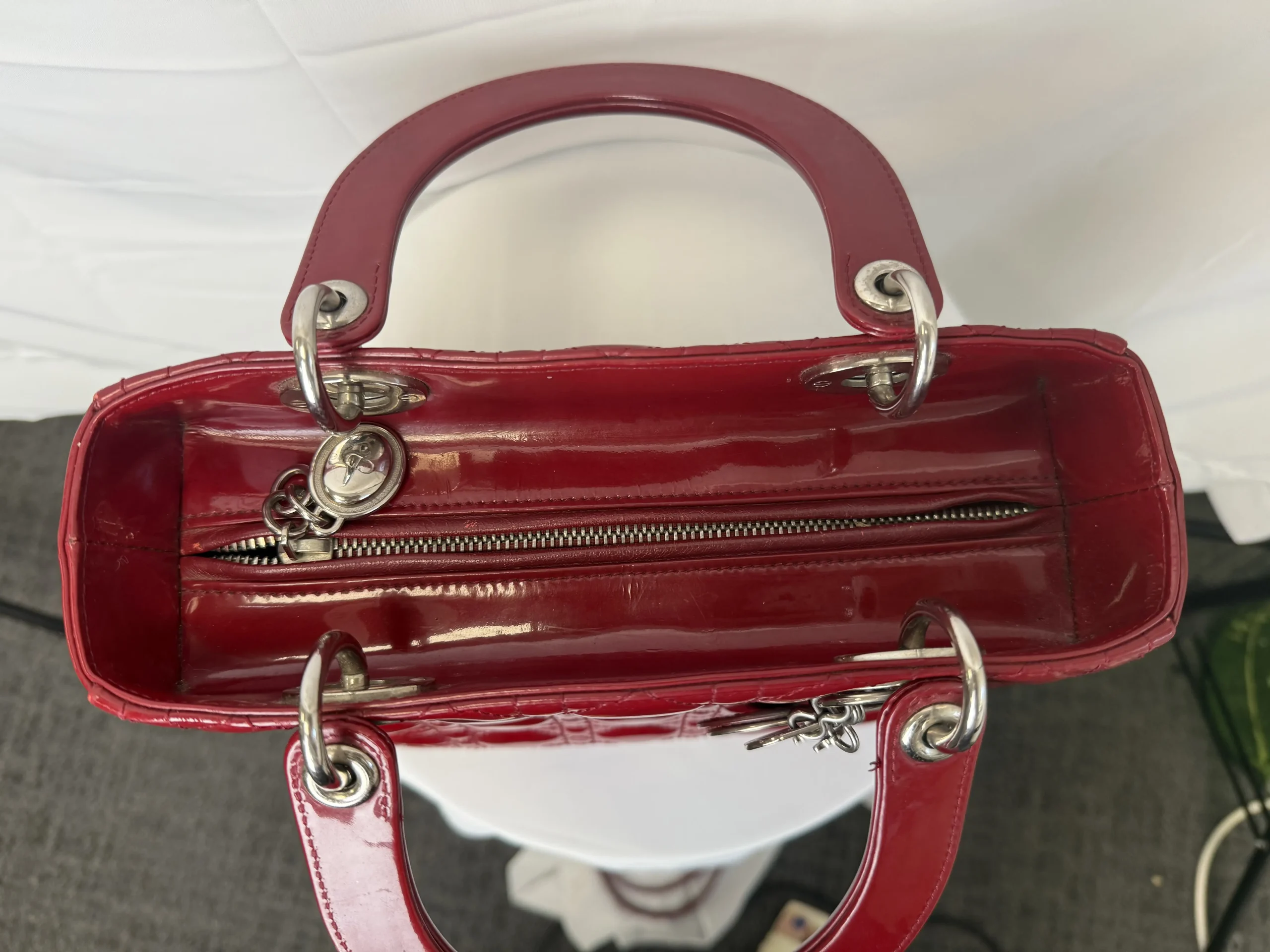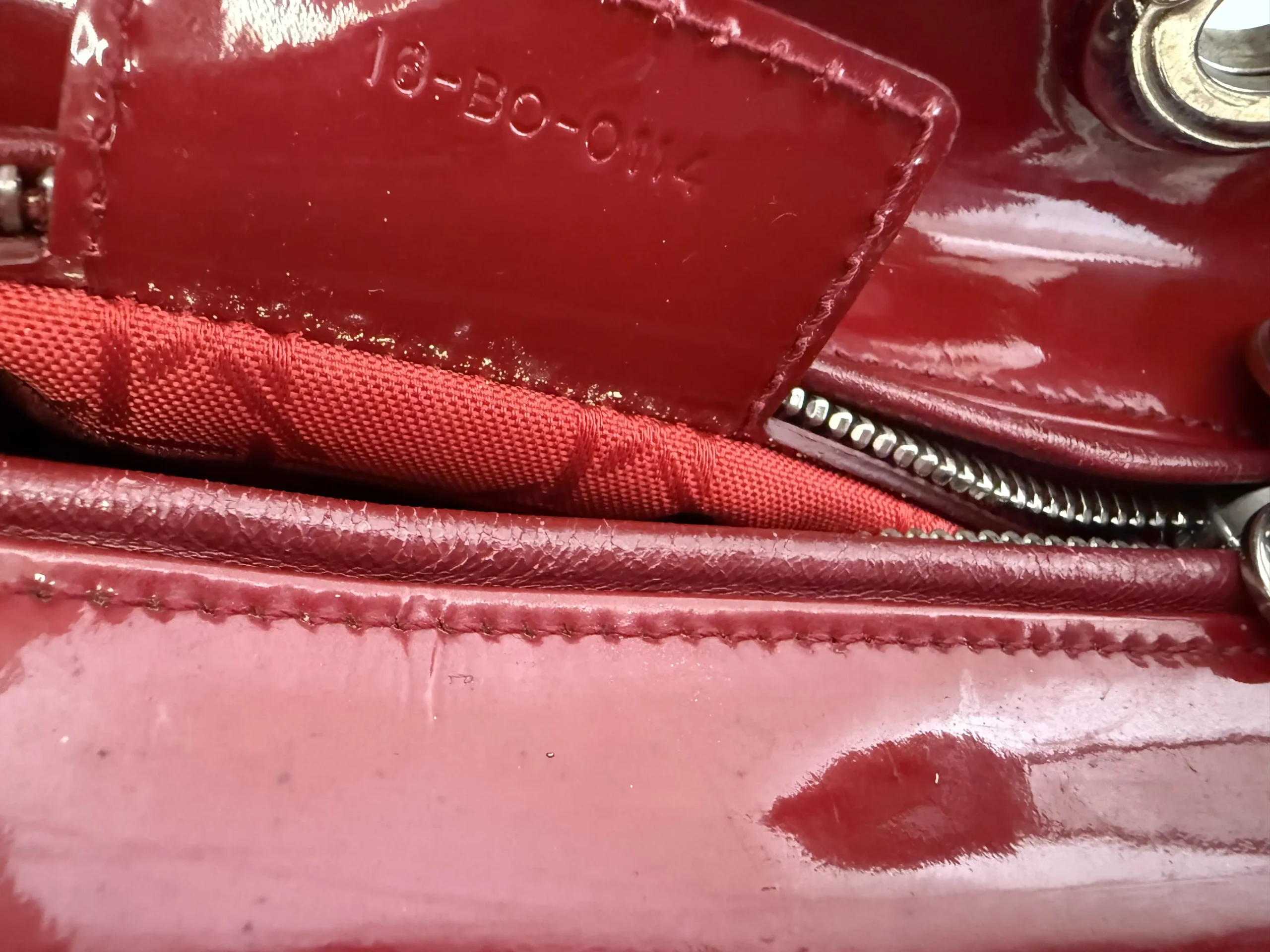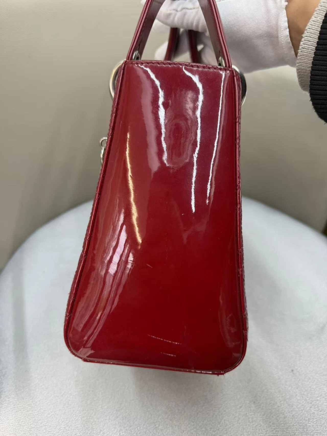 The DIOR Medium Lady Dior Bag in red patent leather is a bold and glamorous statement, where the iconic Cannage quilting and polished ‘D.I.O.R.’ charms are rendered in a high-shine finish, exuding modern sophistication and timeless allure.
