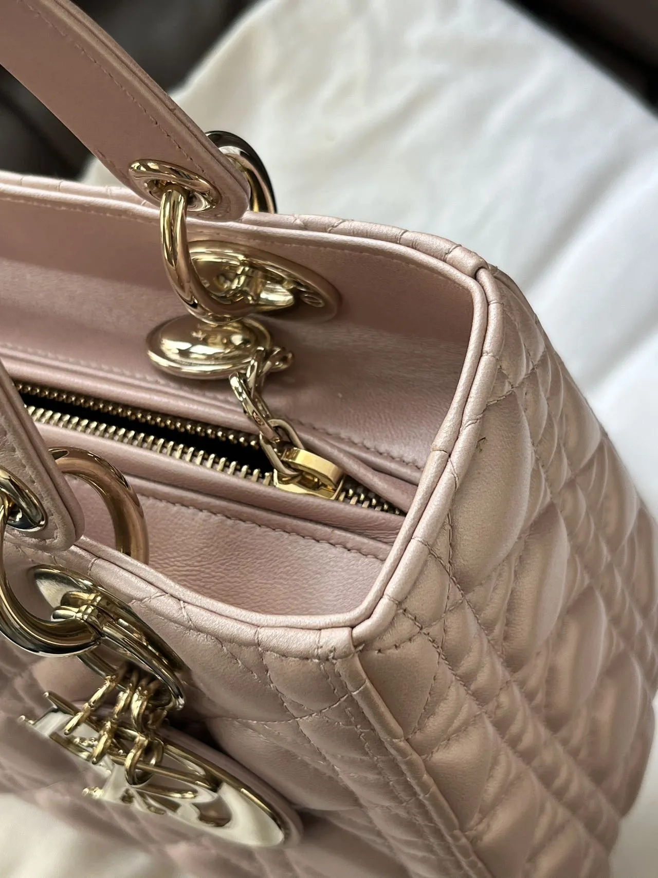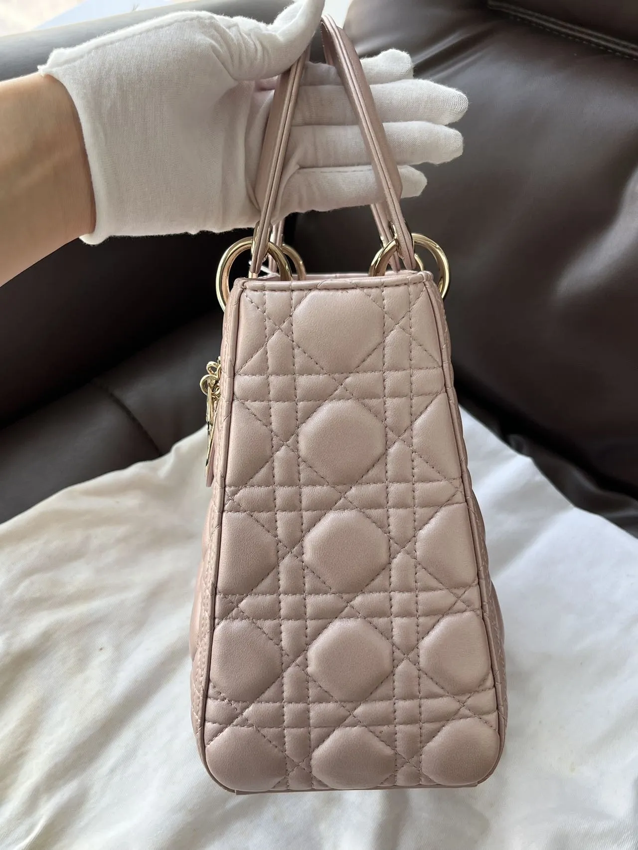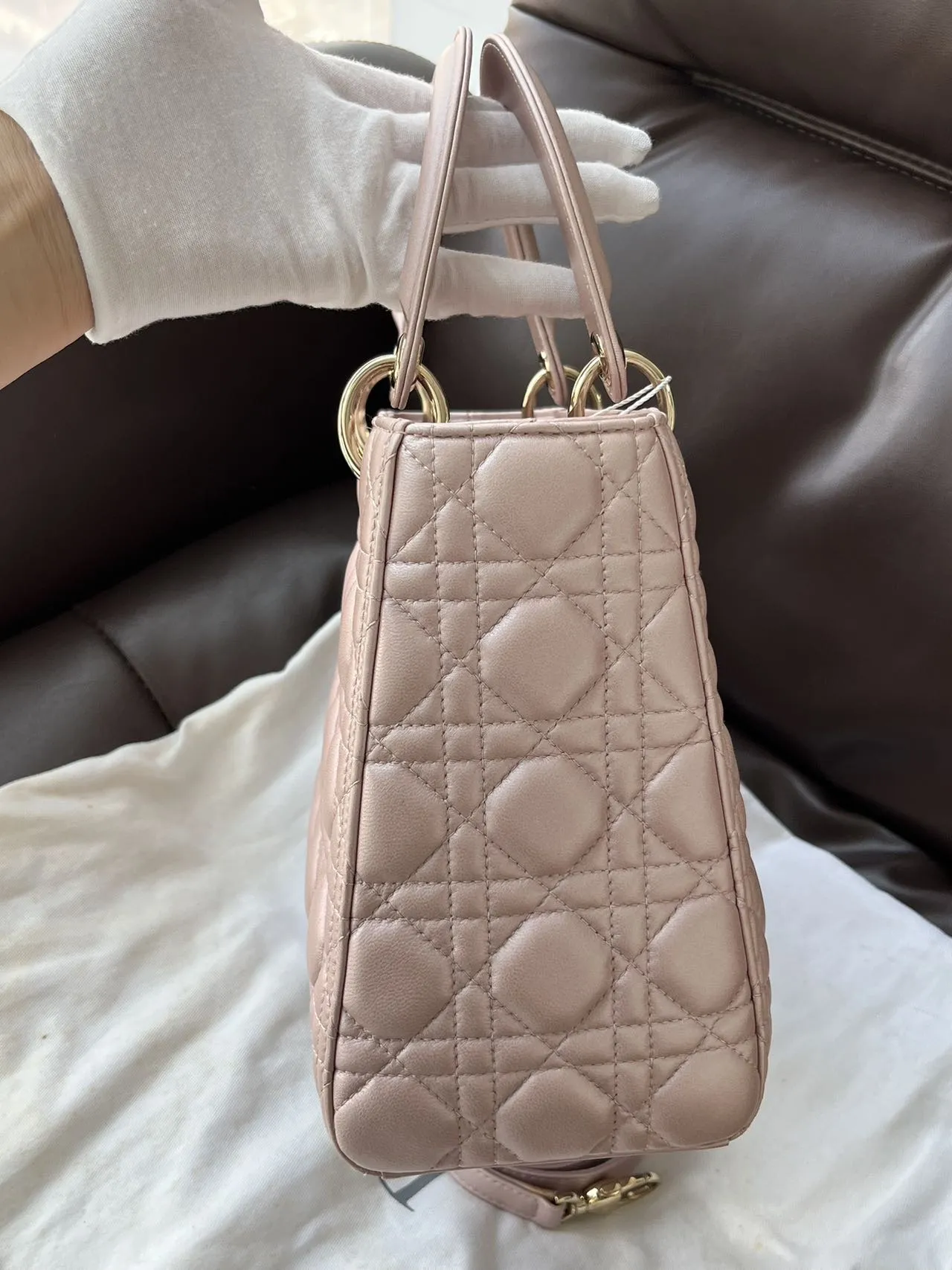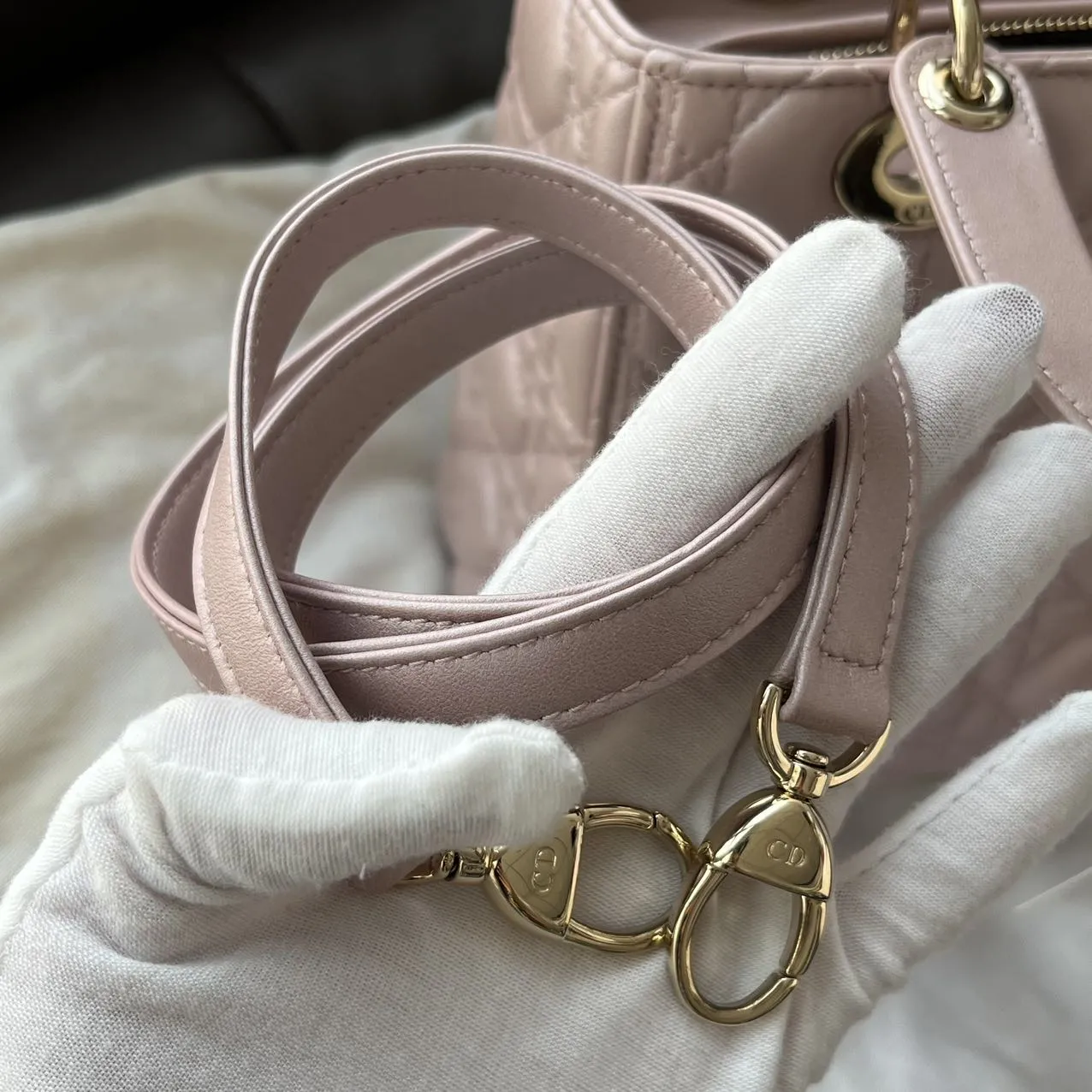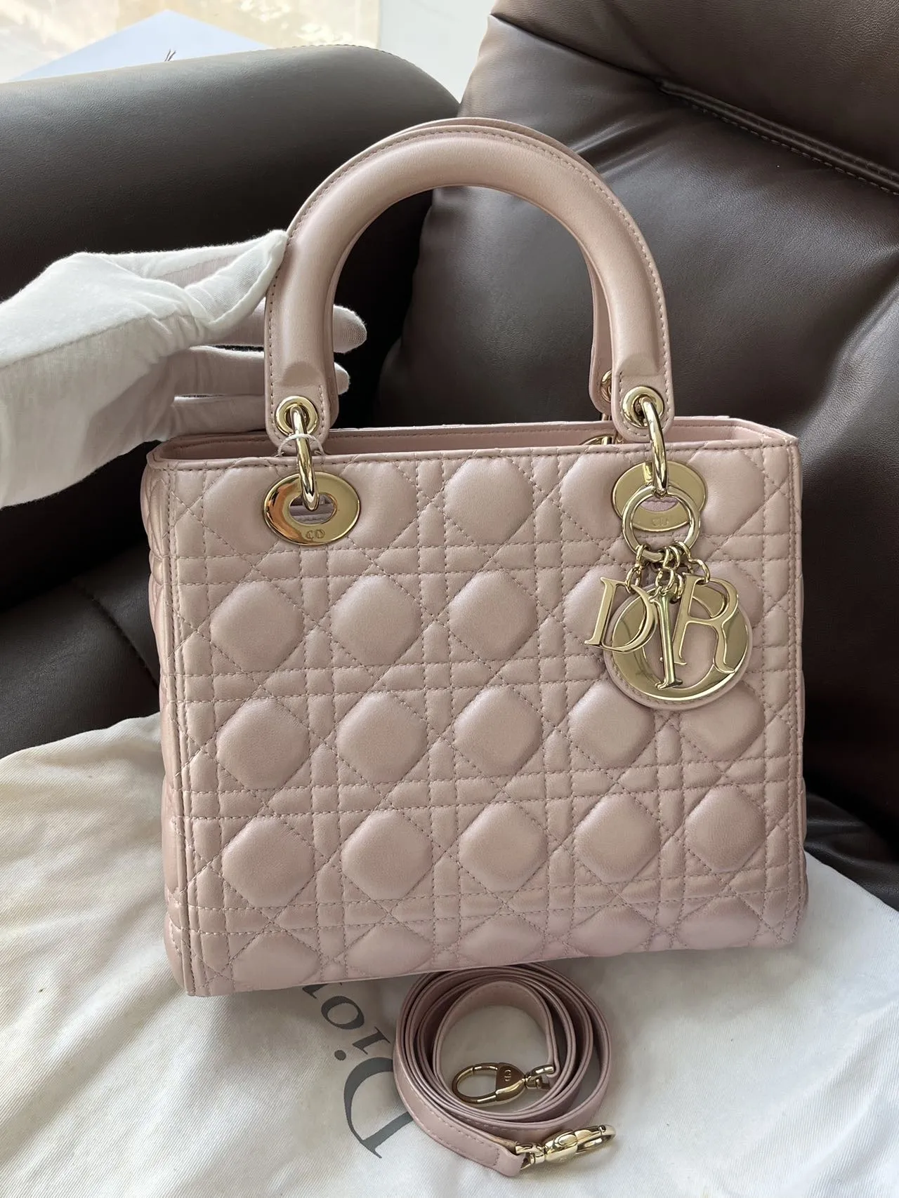 DIOR Medium Lady Dior Bag Pearl Pink Lambskin epitomizes the House’s vision of elegance and beauty. Sleek and refined, the style is timeless. It is crafted in black patent calfskin with Cannage stitching, creating the instantly recognizable quilted texture. Pale gold-finish metal signature D.I.O.R. charms complete and illuminate its silhouette. Featuring a thin, removable leather strap, the medium Lady Dior bag can be carried by hand or worn crossbody.