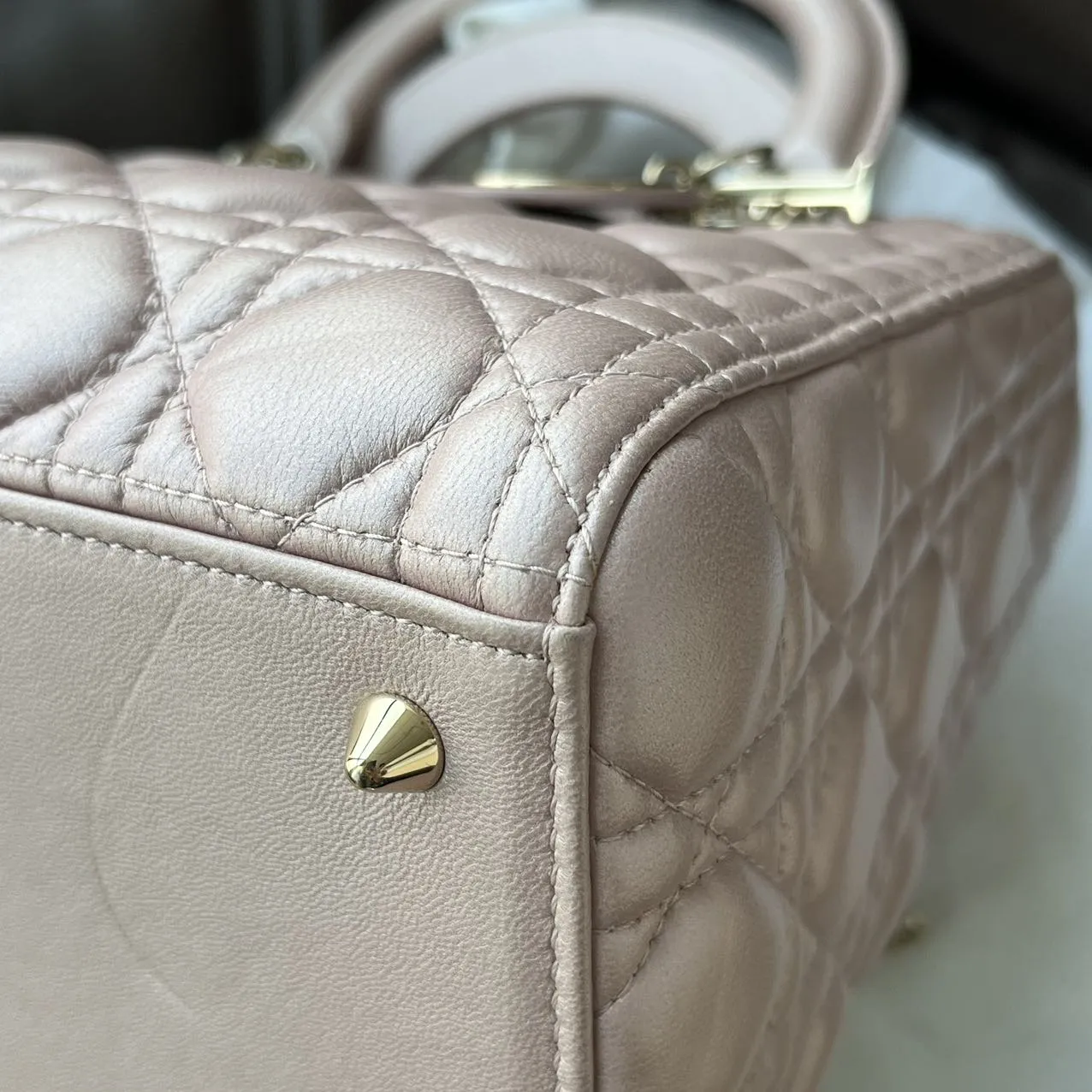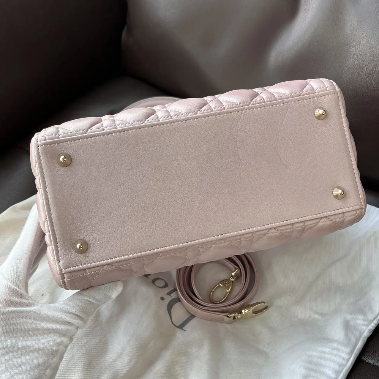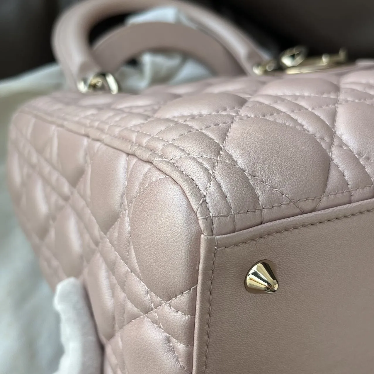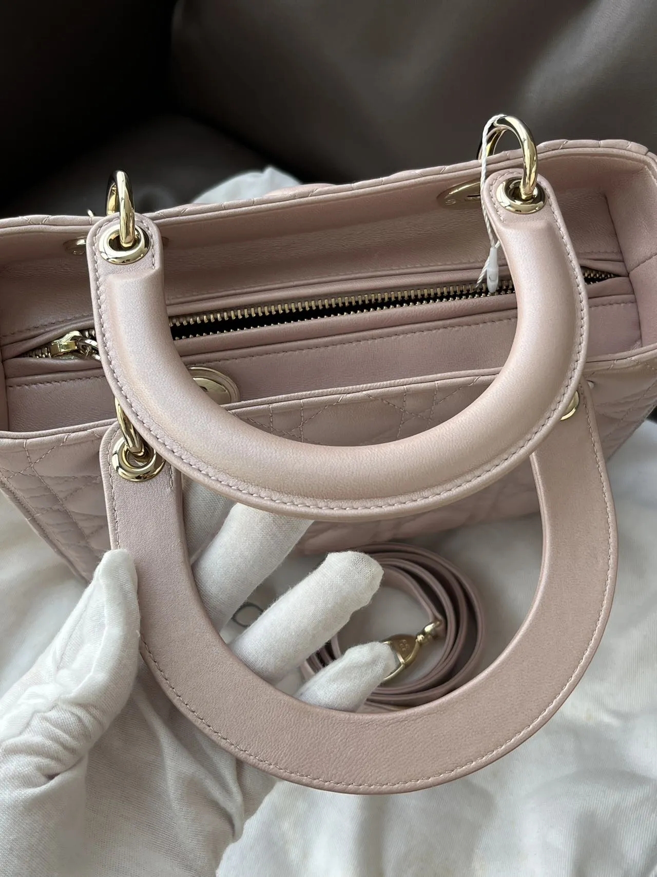 DIOR Medium Lady Dior Bag Pearl Pink Lambskin epitomizes the House’s vision of elegance and beauty. Sleek and refined, the style is timeless. It is crafted in black patent calfskin with Cannage stitching, creating the instantly recognizable quilted texture. Pale gold-finish metal signature D.I.O.R. charms complete and illuminate its silhouette. Featuring a thin, removable leather strap, the medium Lady Dior bag can be carried by hand or worn crossbody.