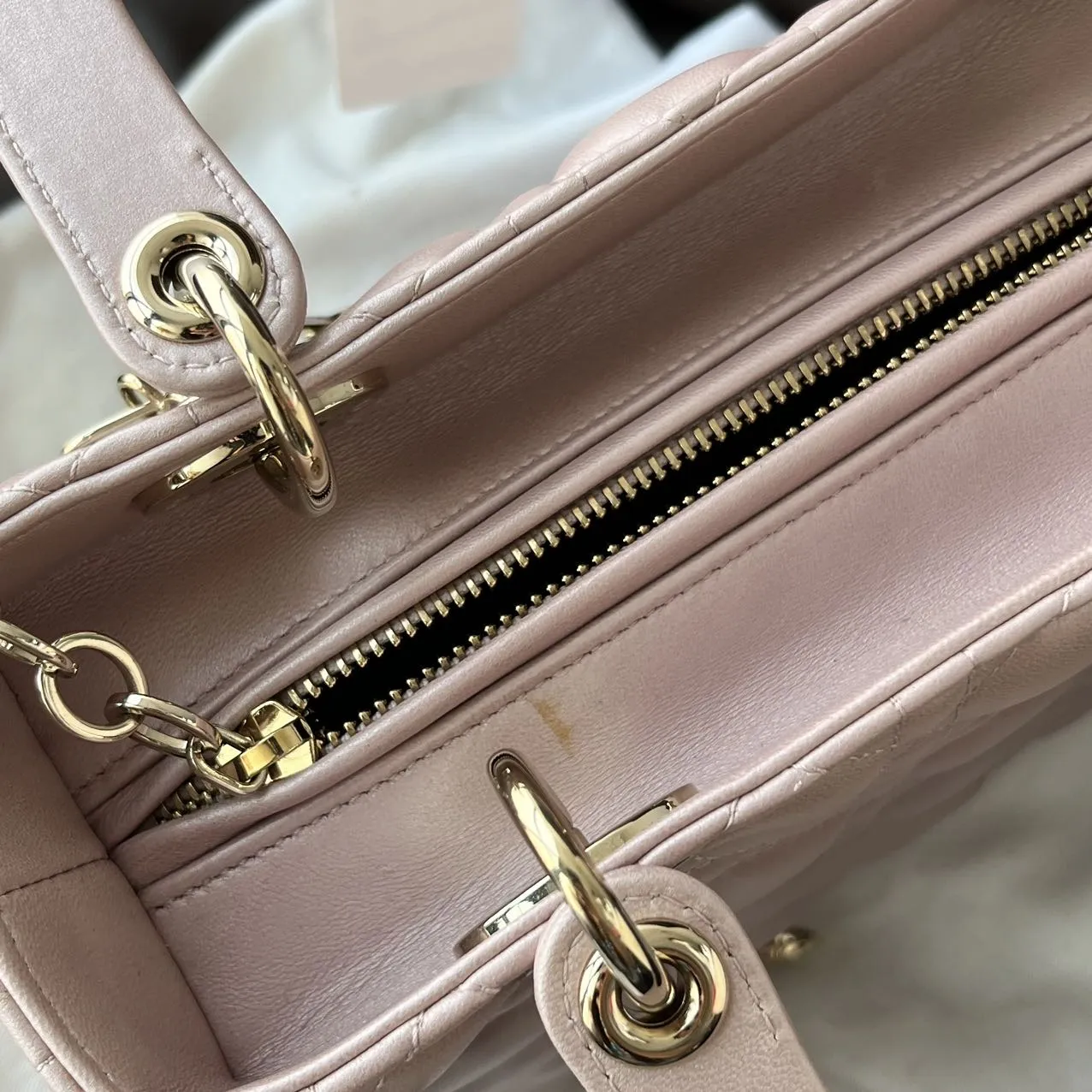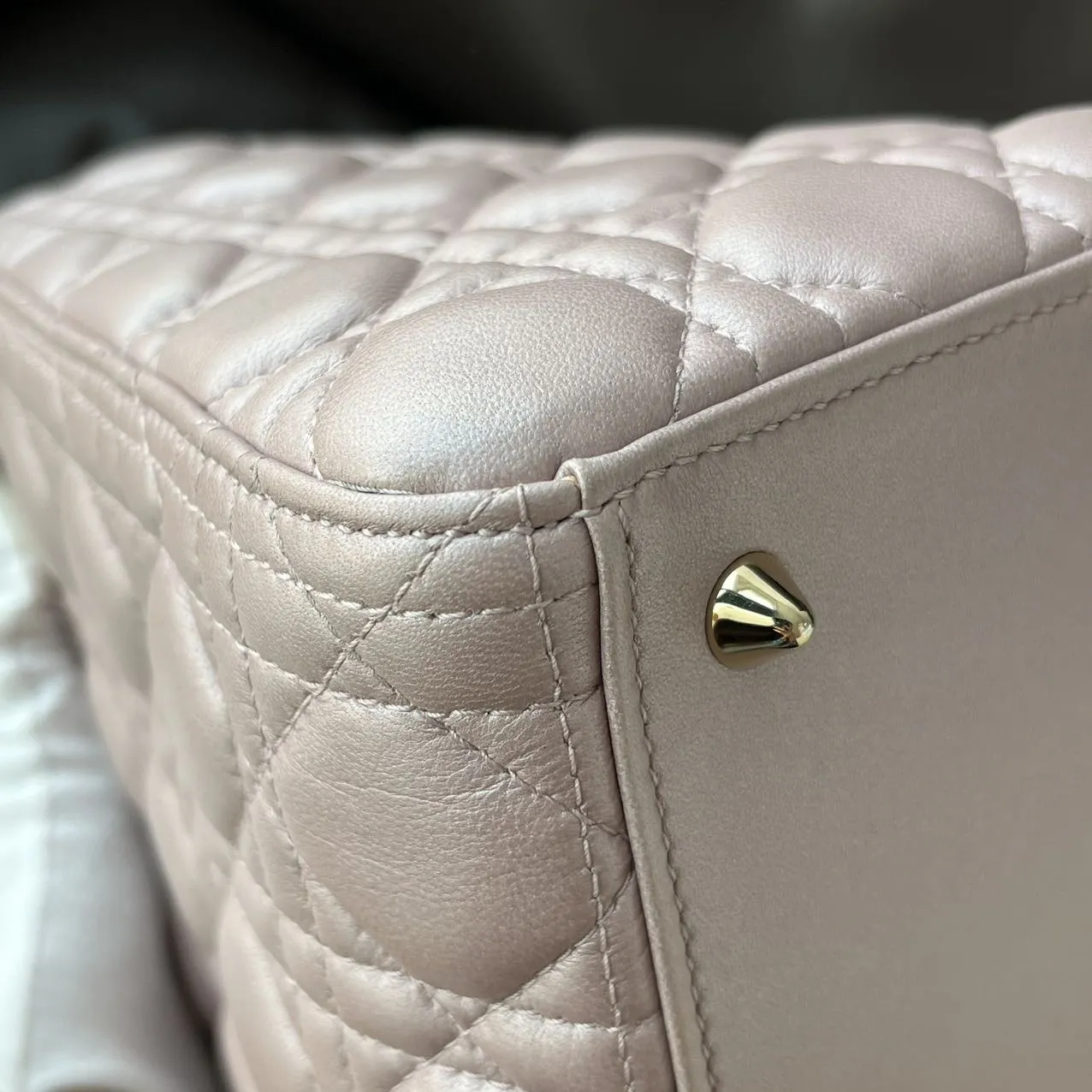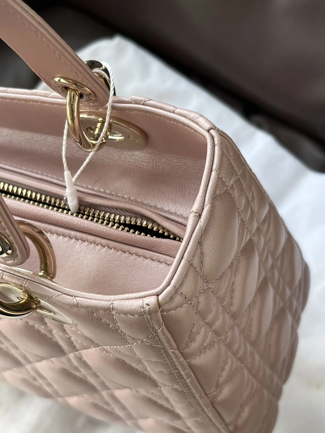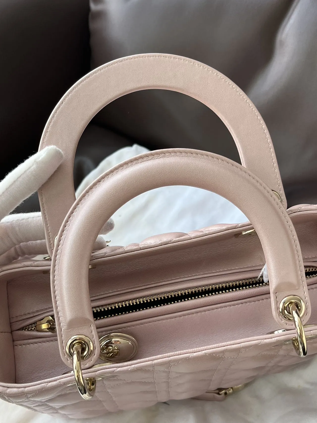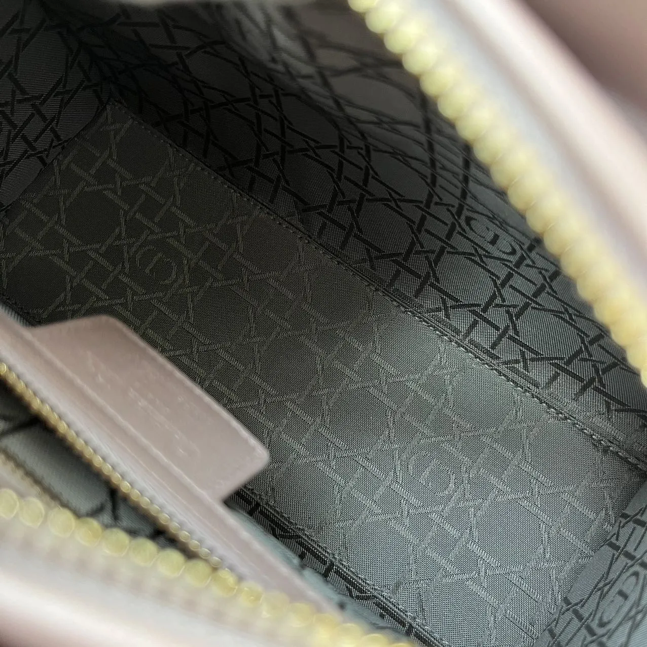 DIOR Medium Lady Dior Bag Pearl Pink Lambskin epitomizes the House’s vision of elegance and beauty. Sleek and refined, the style is timeless. It is crafted in black patent calfskin with Cannage stitching, creating the instantly recognizable quilted texture. Pale gold-finish metal signature D.I.O.R. charms complete and illuminate its silhouette. Featuring a thin, removable leather strap, the medium Lady Dior bag can be carried by hand or worn crossbody.