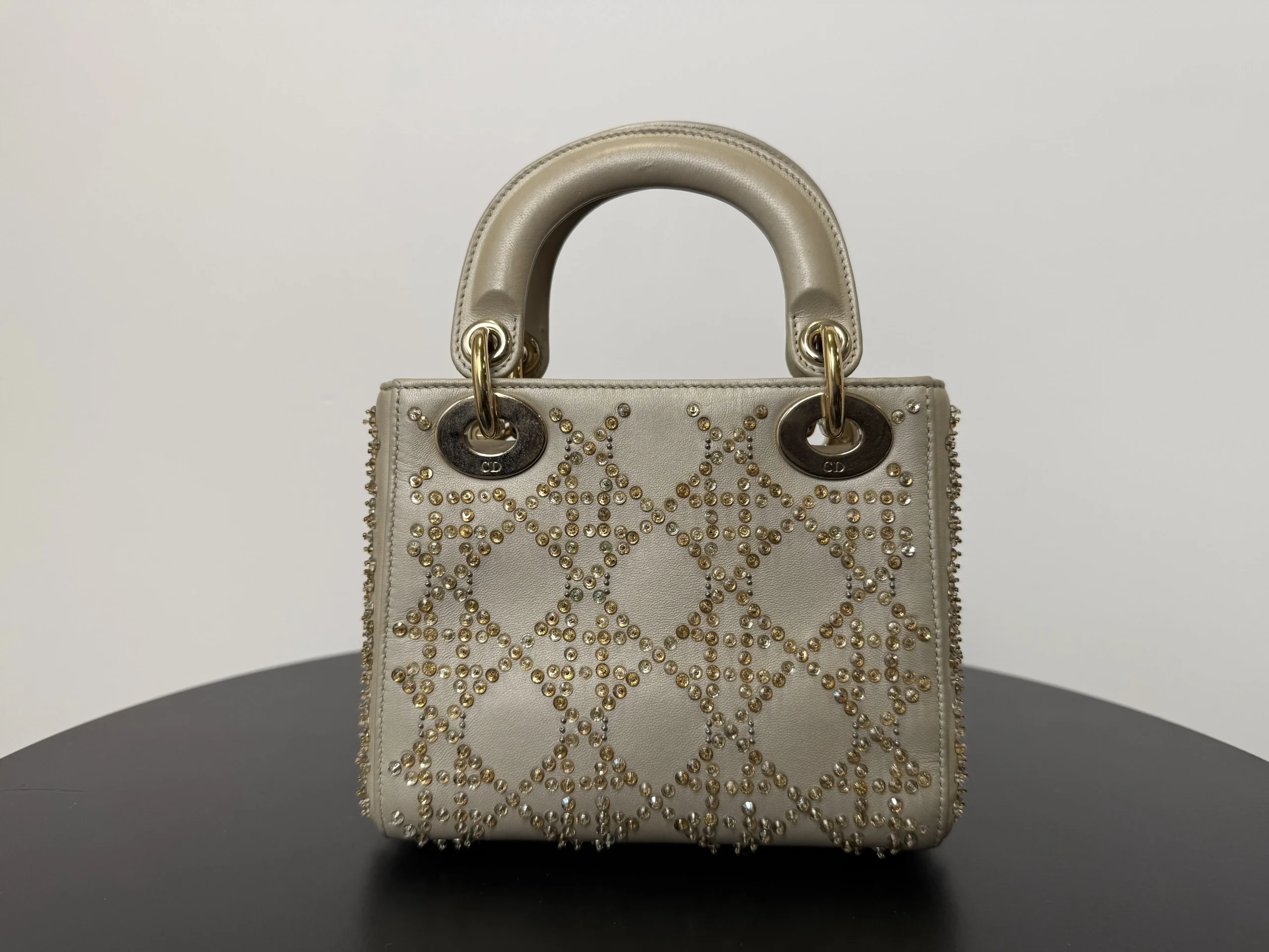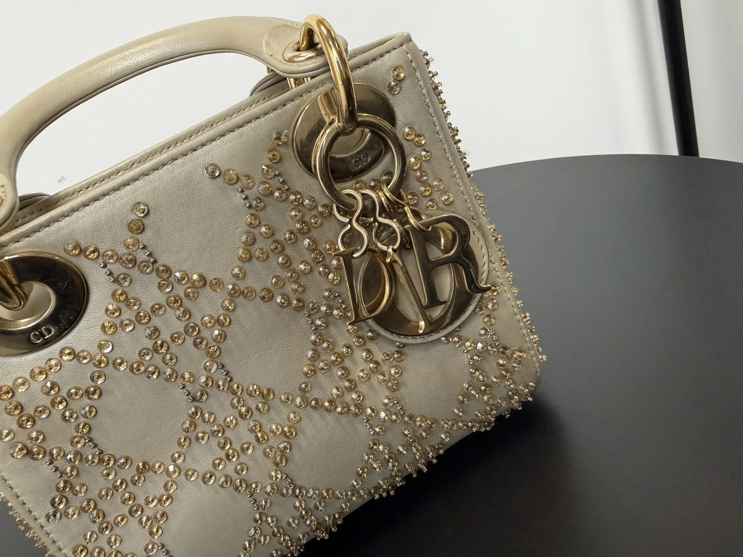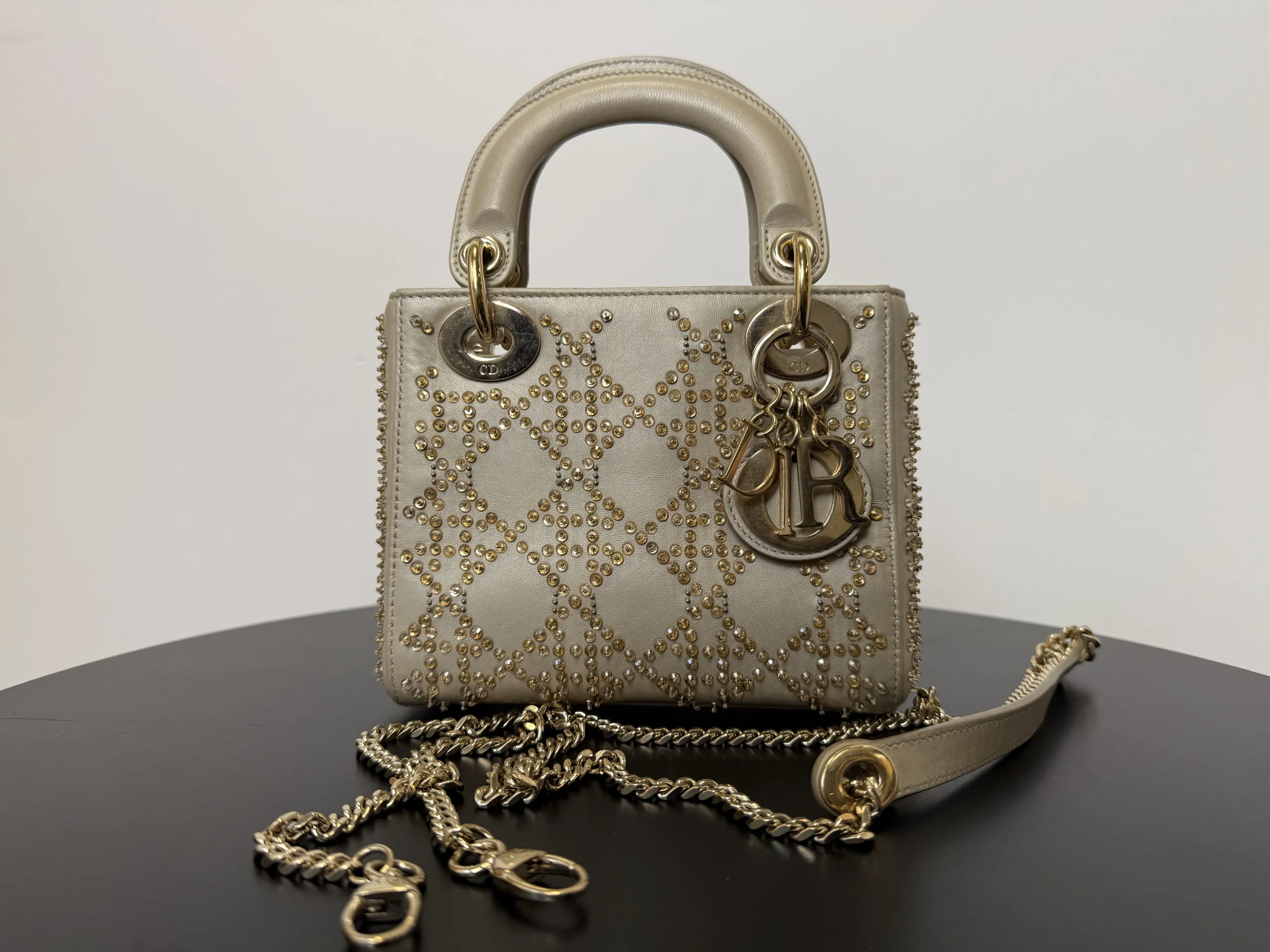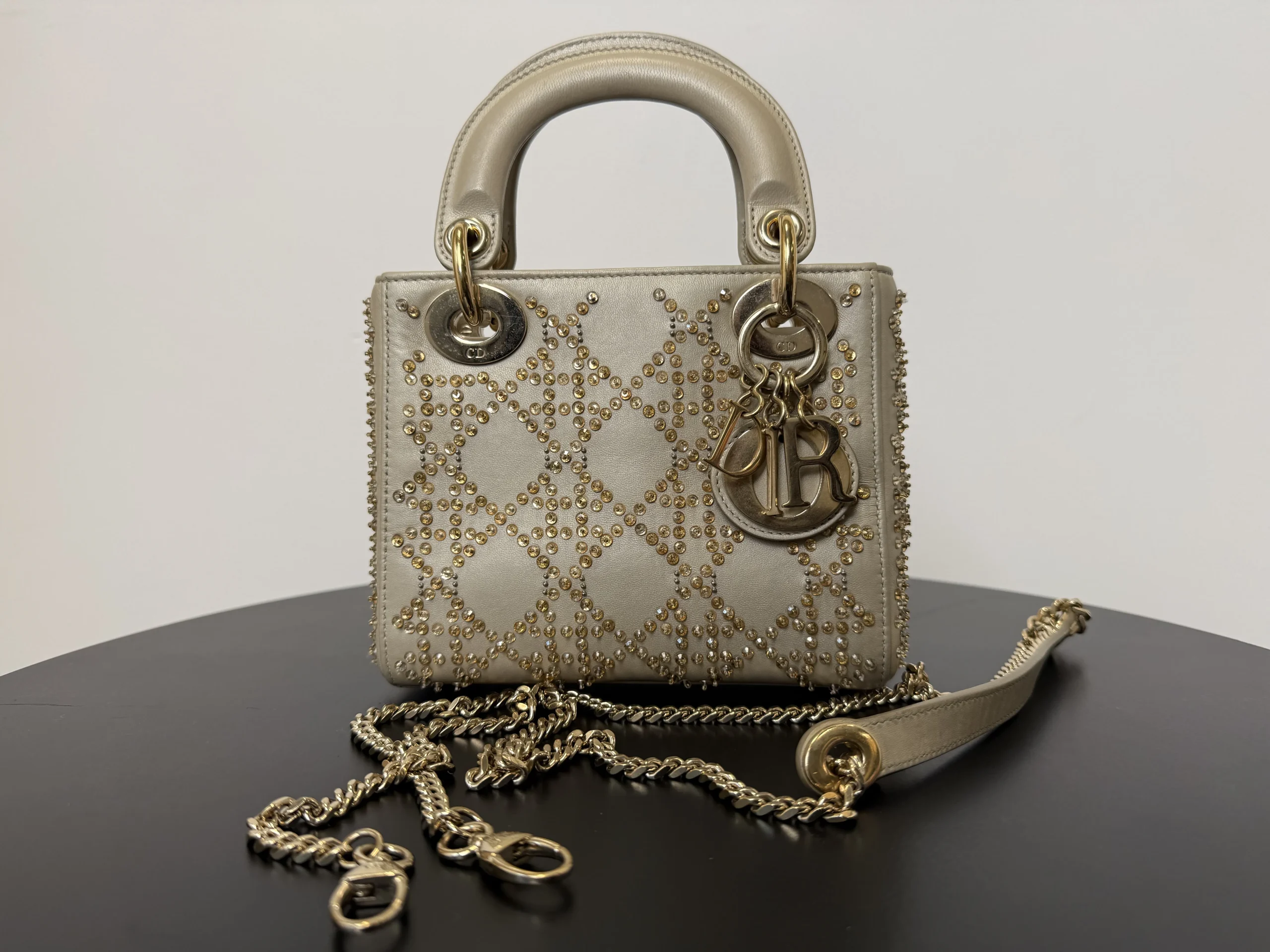 DIOR Mini Lady Dior Bag Platinum-Tone Metallic Cannage Lambskin with Beaded Embroidery embodies Dior’s vision of elegance and beauty. Sleek and refined, the timeless yet modern style is crafted in platinum-tone metallic lambskin and embroidered with faceted beads that capture the light and create the Cannage motif, while pale gold-finish metal D.I.O.R. charms further embellish its silhouette. The miniature style, an ideal evening wear companion, has a removable chain shoulder strap.
