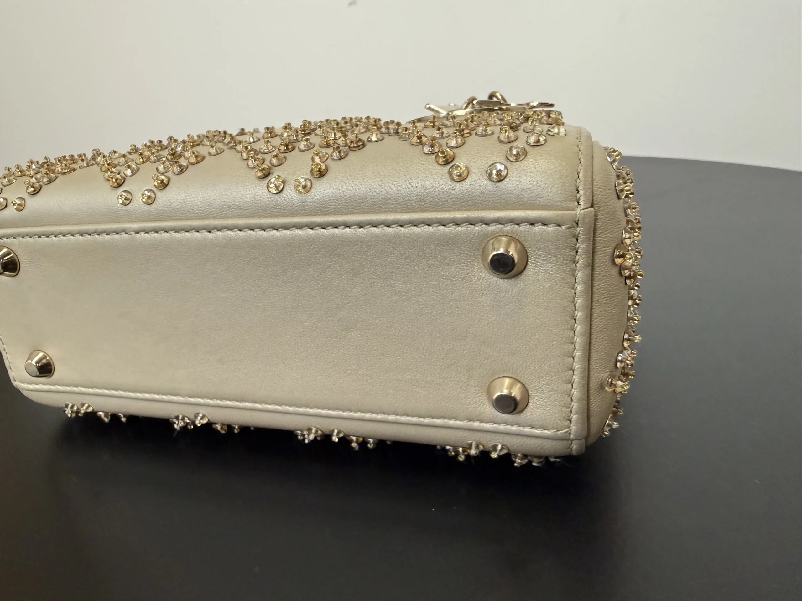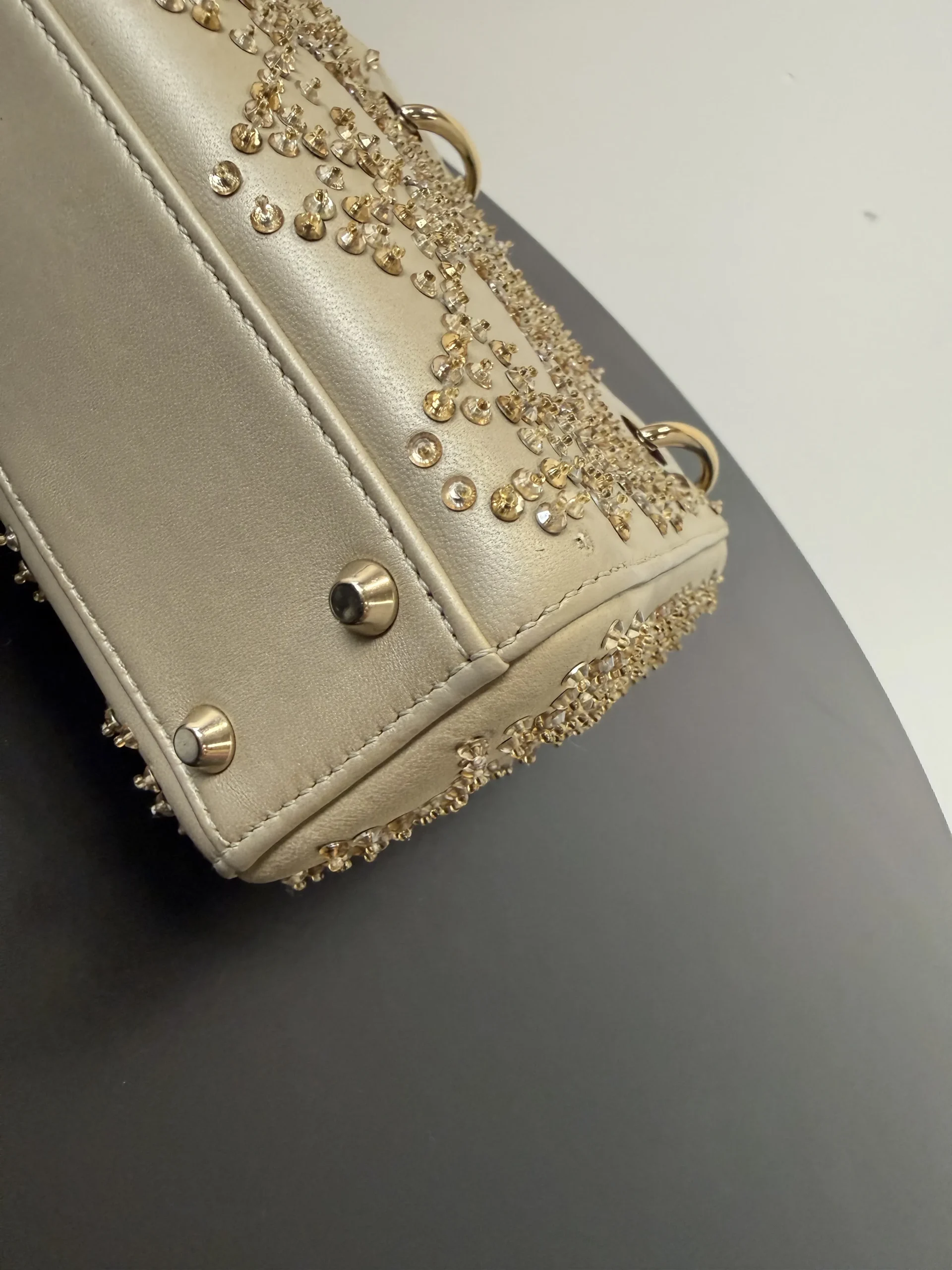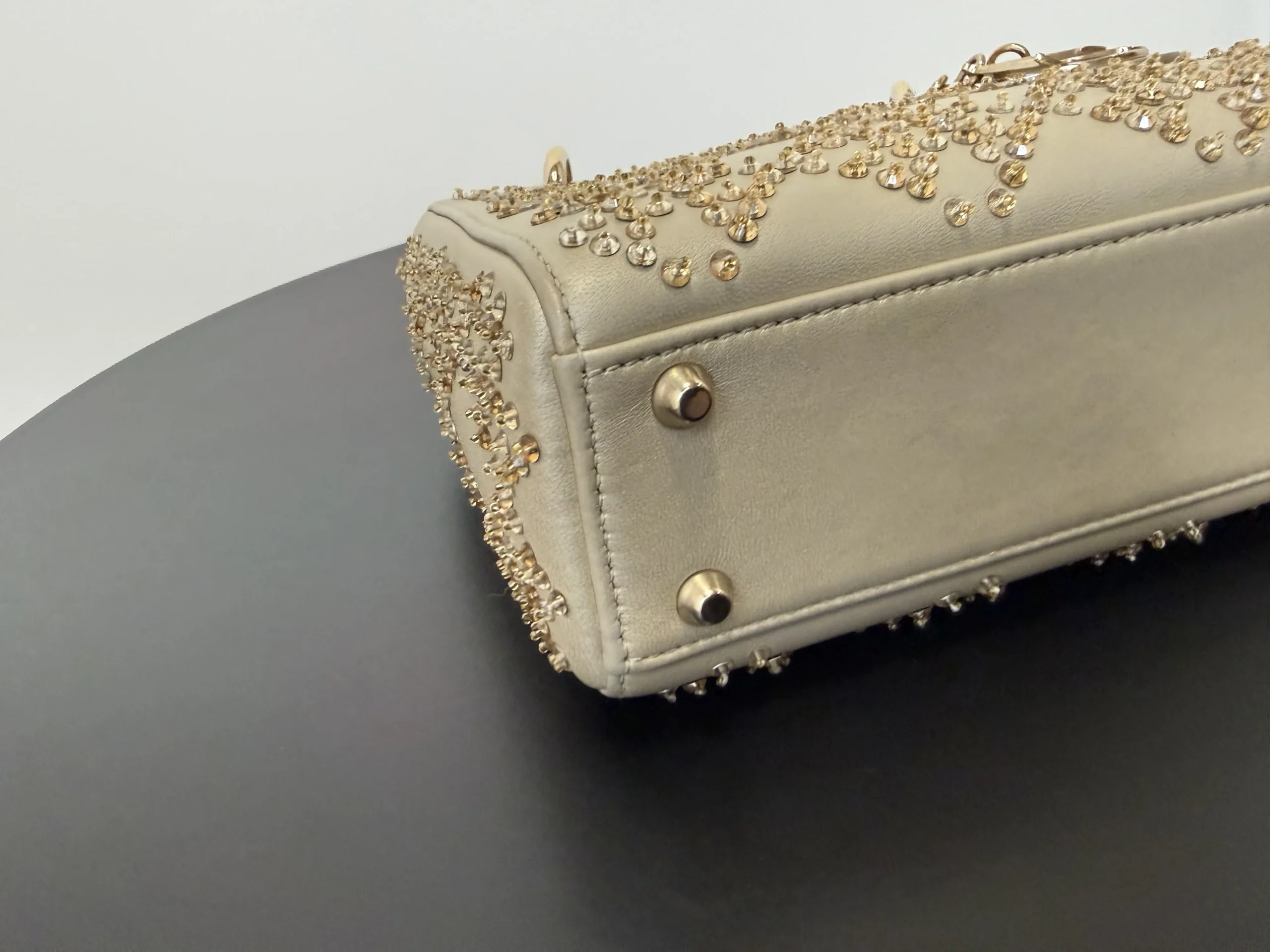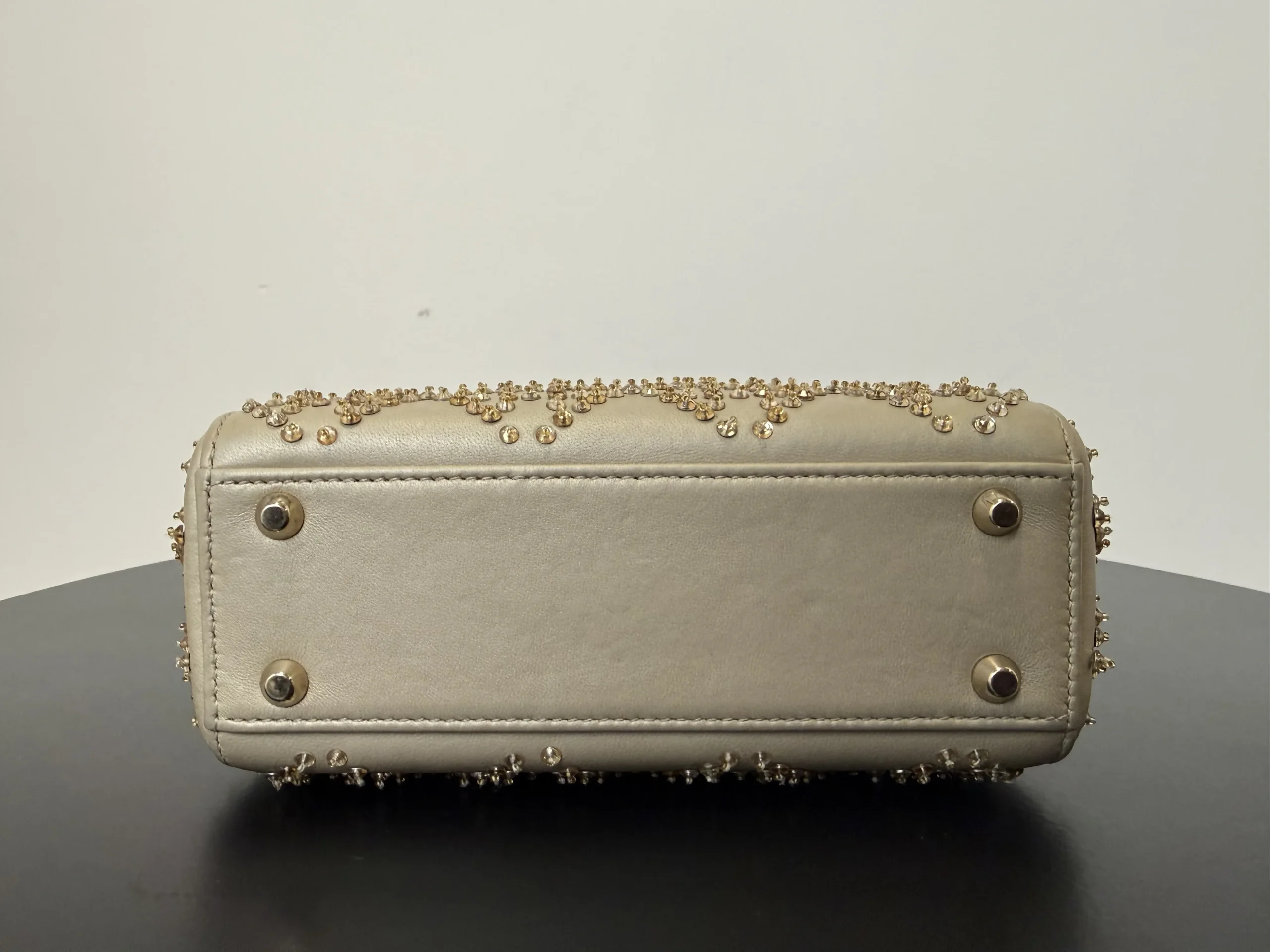 DIOR Mini Lady Dior Bag Platinum-Tone Metallic Cannage Lambskin with Beaded Embroidery embodies Dior’s vision of elegance and beauty. Sleek and refined, the timeless yet modern style is crafted in platinum-tone metallic lambskin and embroidered with faceted beads that capture the light and create the Cannage motif, while pale gold-finish metal D.I.O.R. charms further embellish its silhouette. The miniature style, an ideal evening wear companion, has a removable chain shoulder strap.