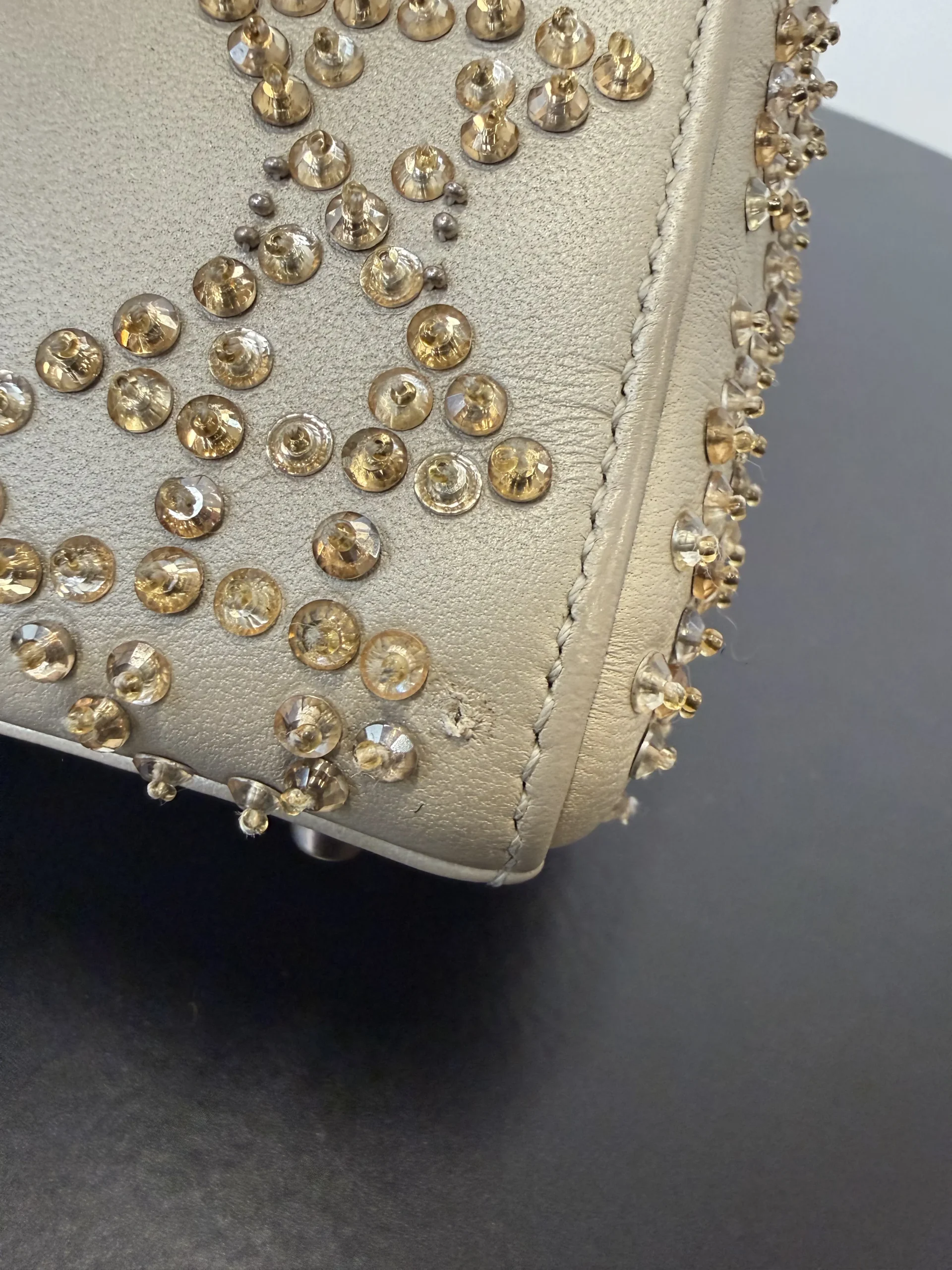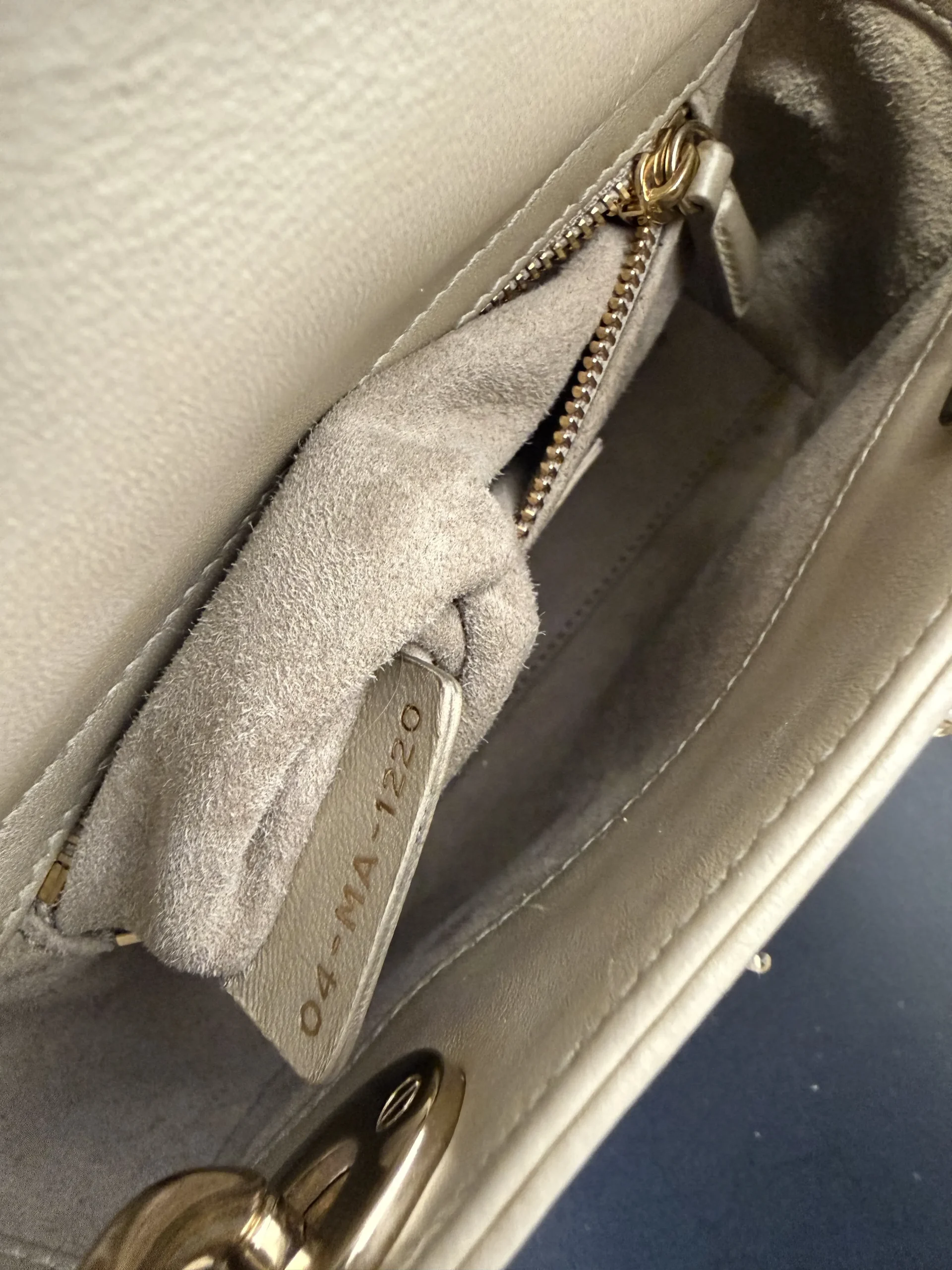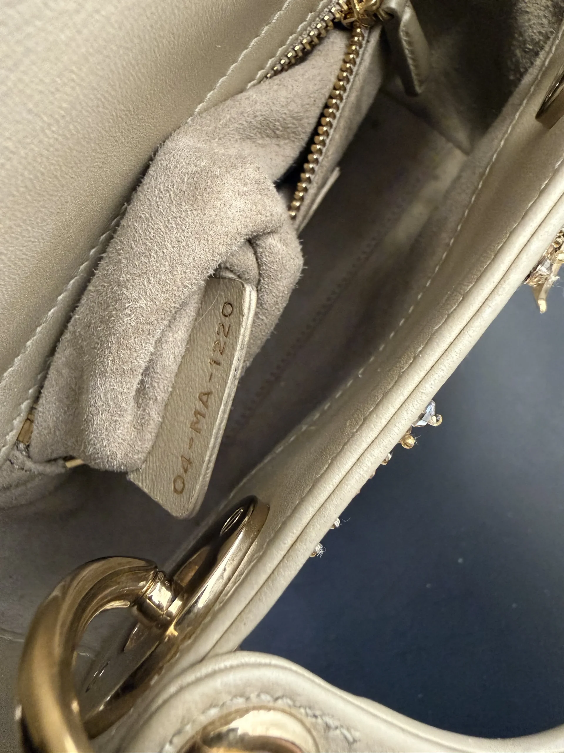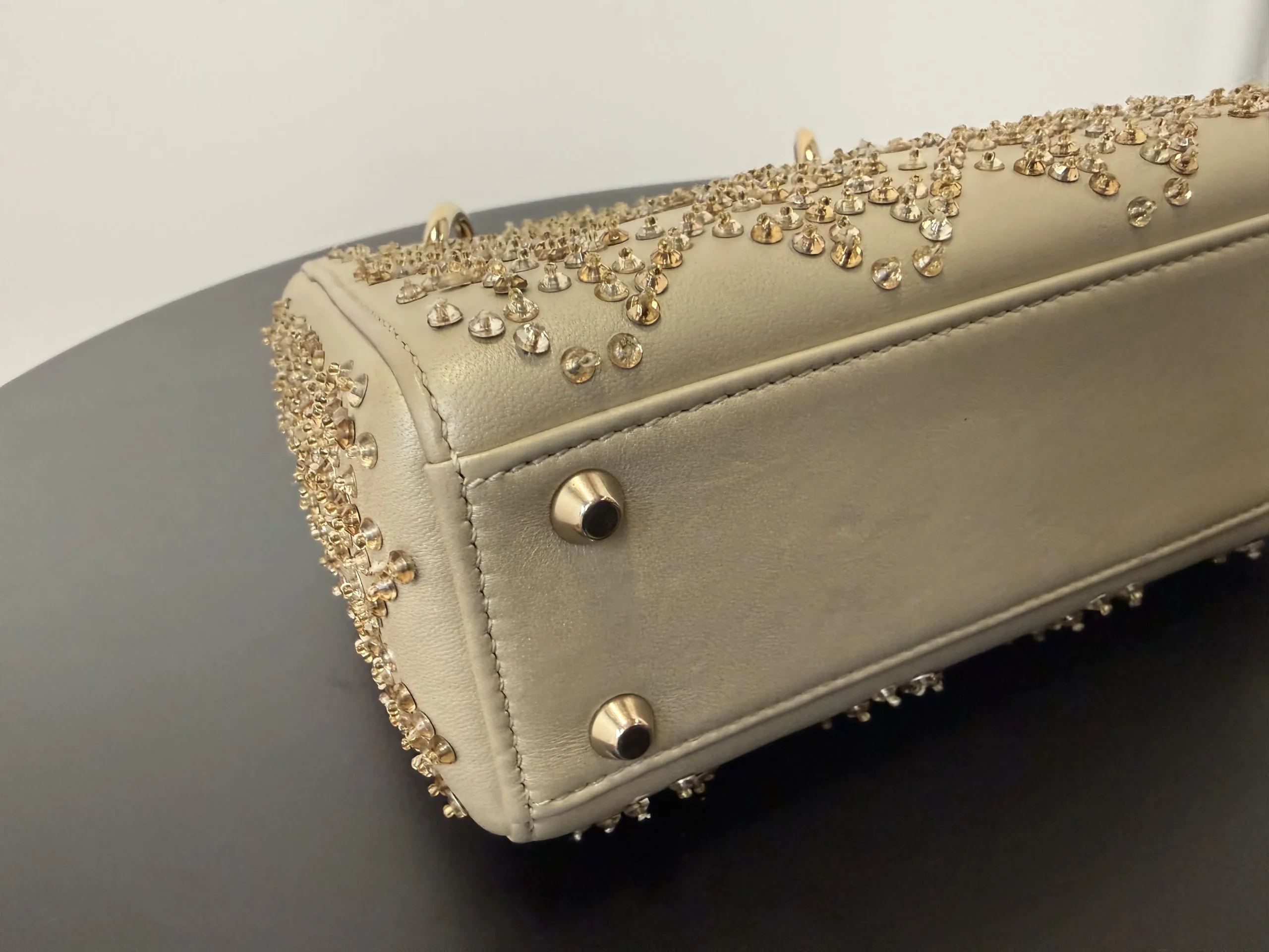 DIOR Mini Lady Dior Bag Platinum-Tone Metallic Cannage Lambskin with Beaded Embroidery embodies Dior’s vision of elegance and beauty. Sleek and refined, the timeless yet modern style is crafted in platinum-tone metallic lambskin and embroidered with faceted beads that capture the light and create the Cannage motif, while pale gold-finish metal D.I.O.R. charms further embellish its silhouette. The miniature style, an ideal evening wear companion, has a removable chain shoulder strap.