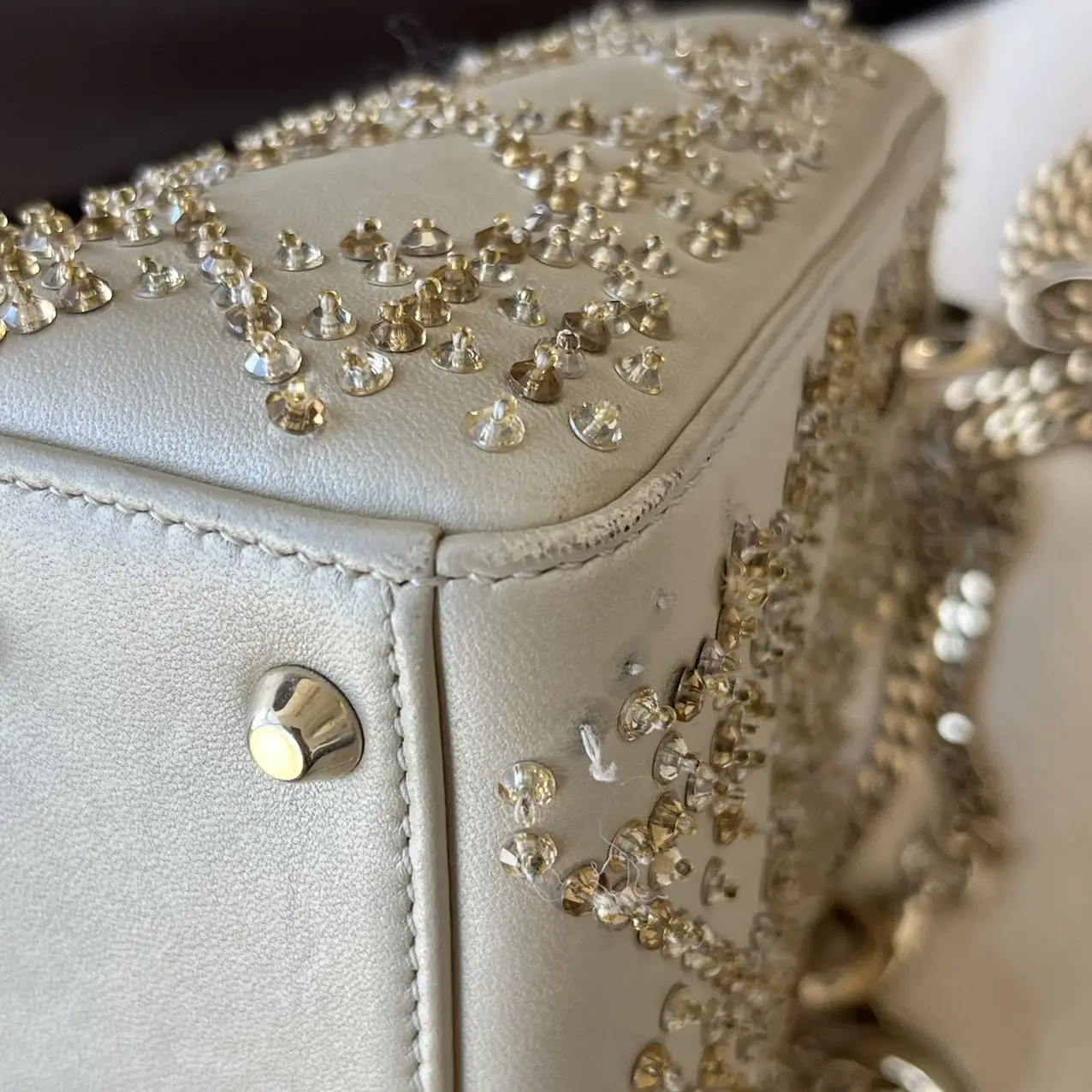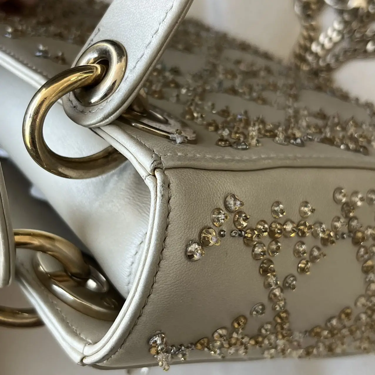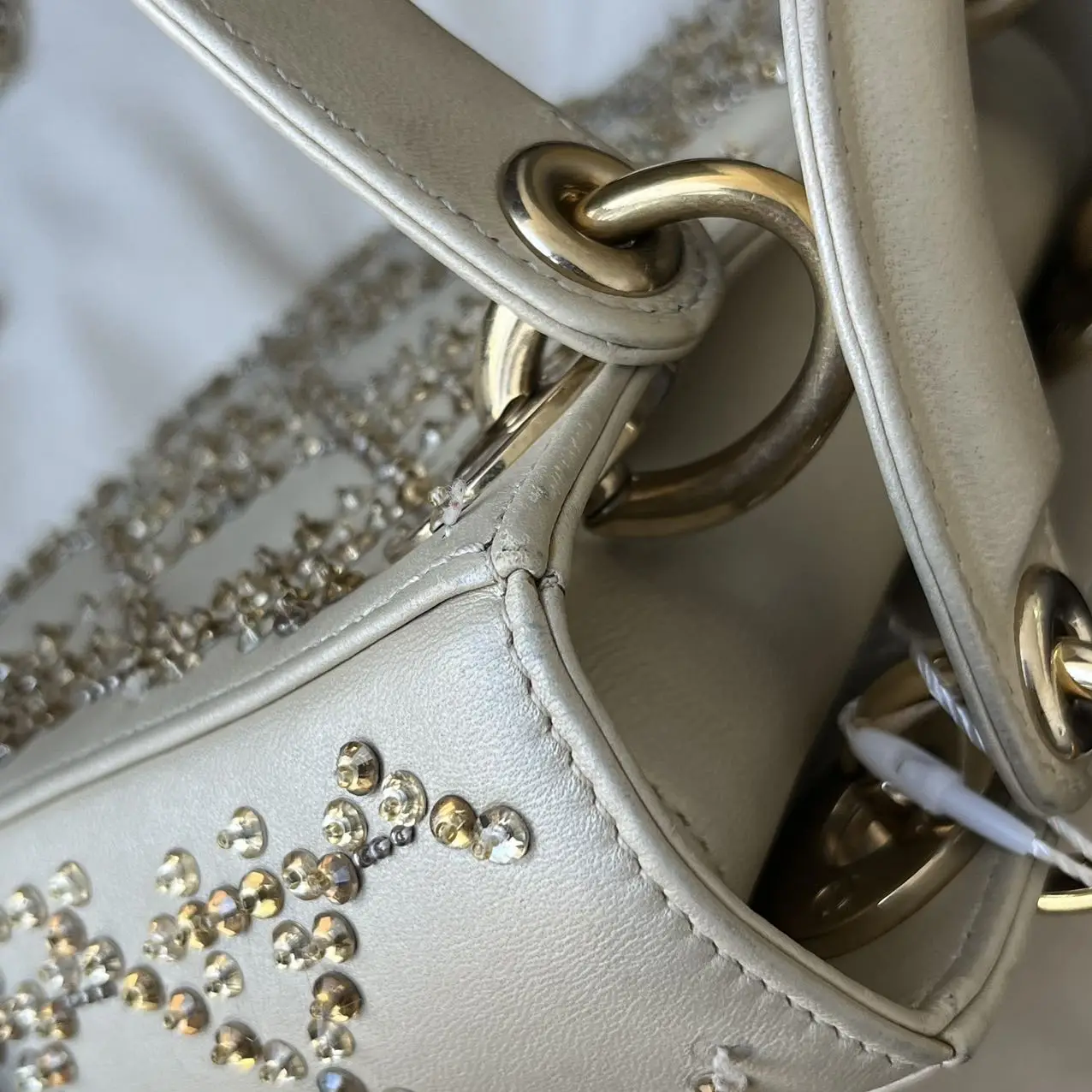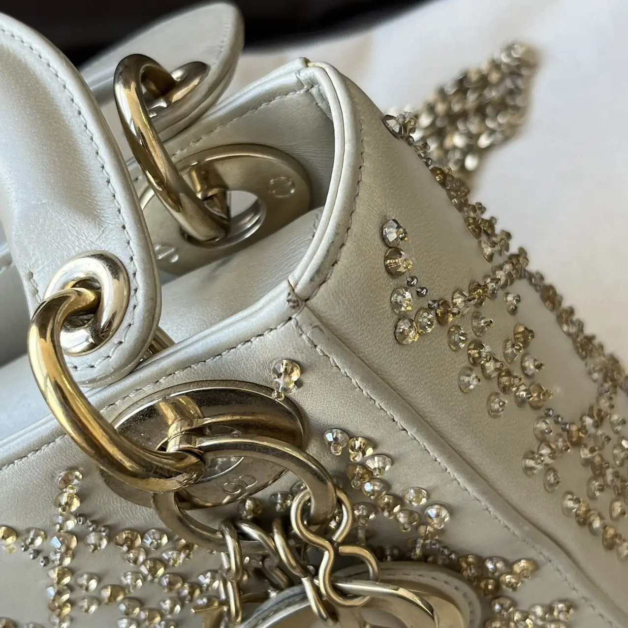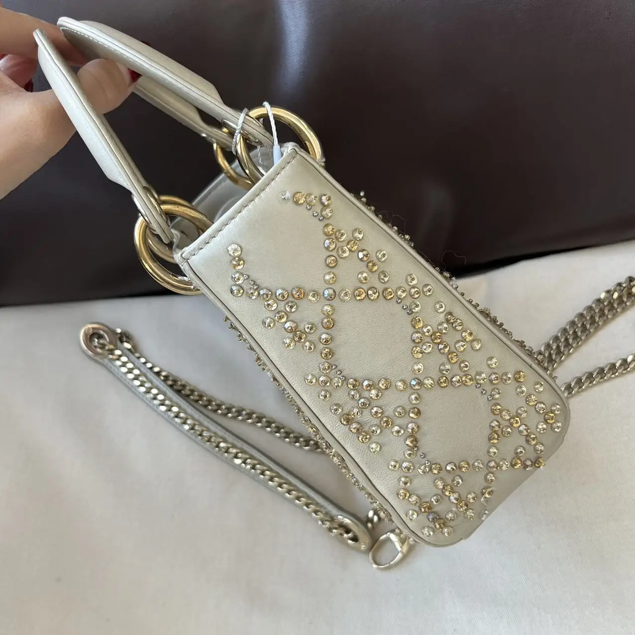 The DIOR Mini Lady Dior Bag in gold calfskin leather with crystals and gold-tone hardware is a dazzling statement of opulence, where the luminous metallic leather and sparkling crystal accents elevate the iconic Cannage quilting into a celebratory and radiant symbol of luxury.