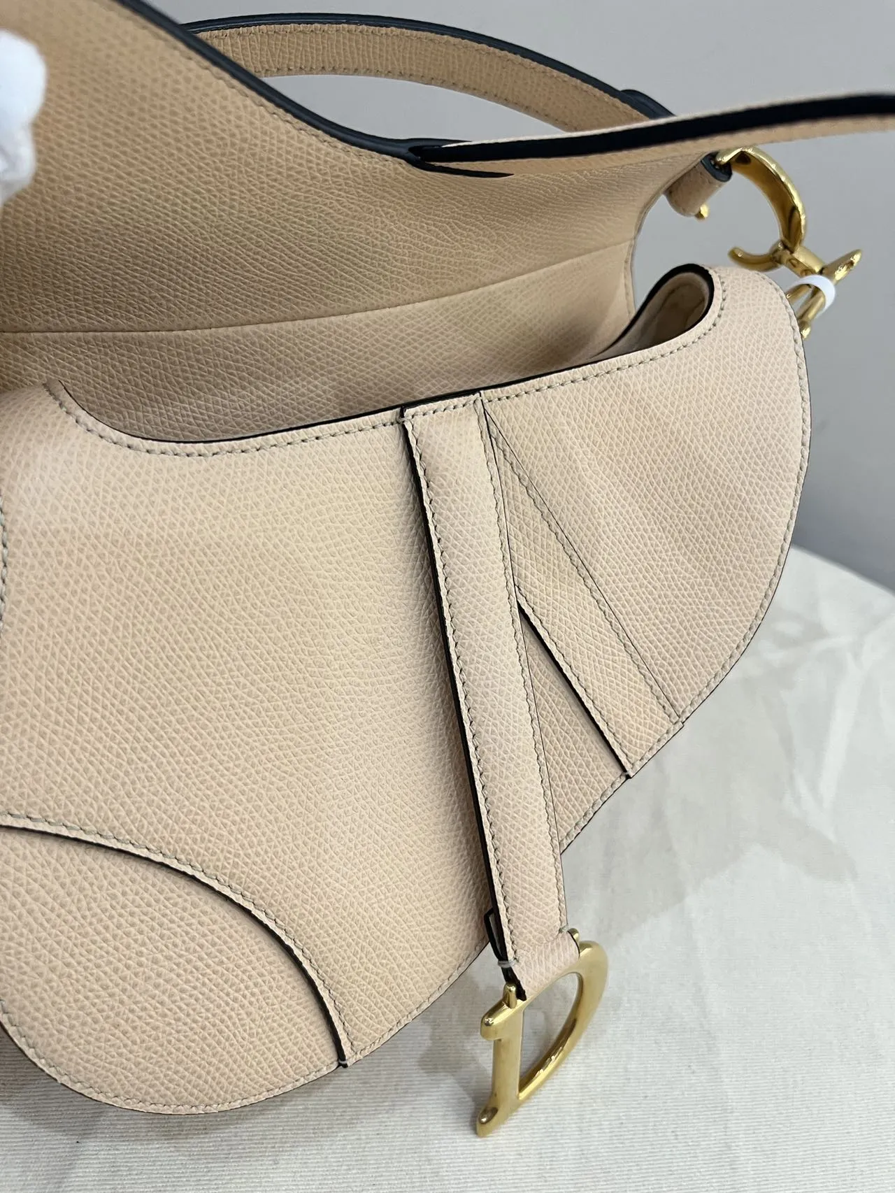 The Dior Mini Saddle Bag in beige caviar leather is a modern and durable statement, reinterpreting the iconic asymmetrical silhouette in the brand’s signature textured leather, offering a compact yet bold twist on a timeless design.