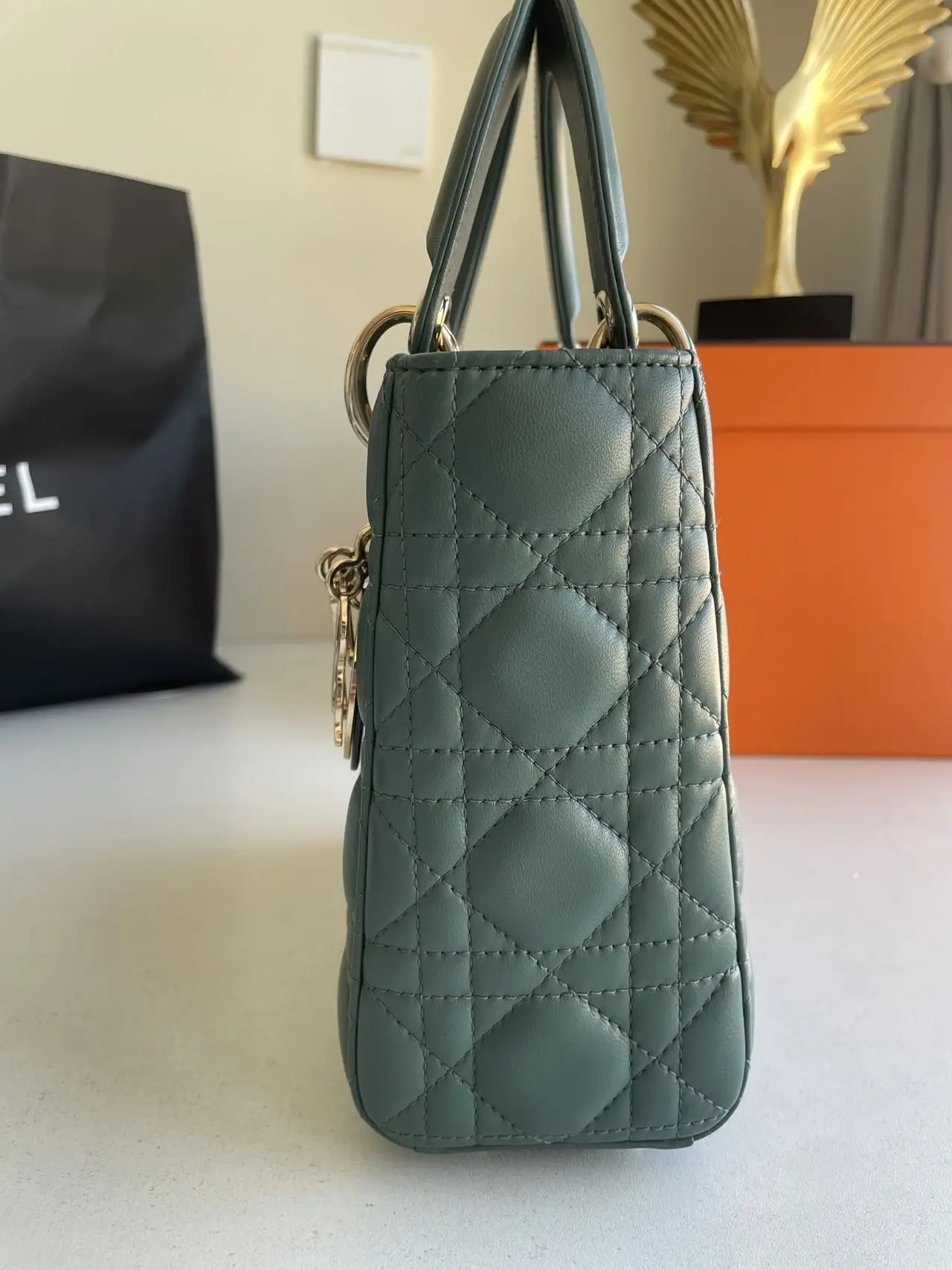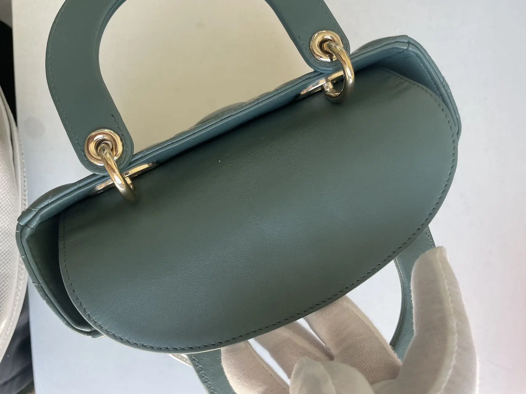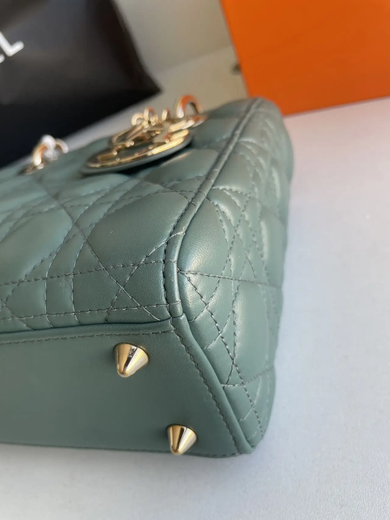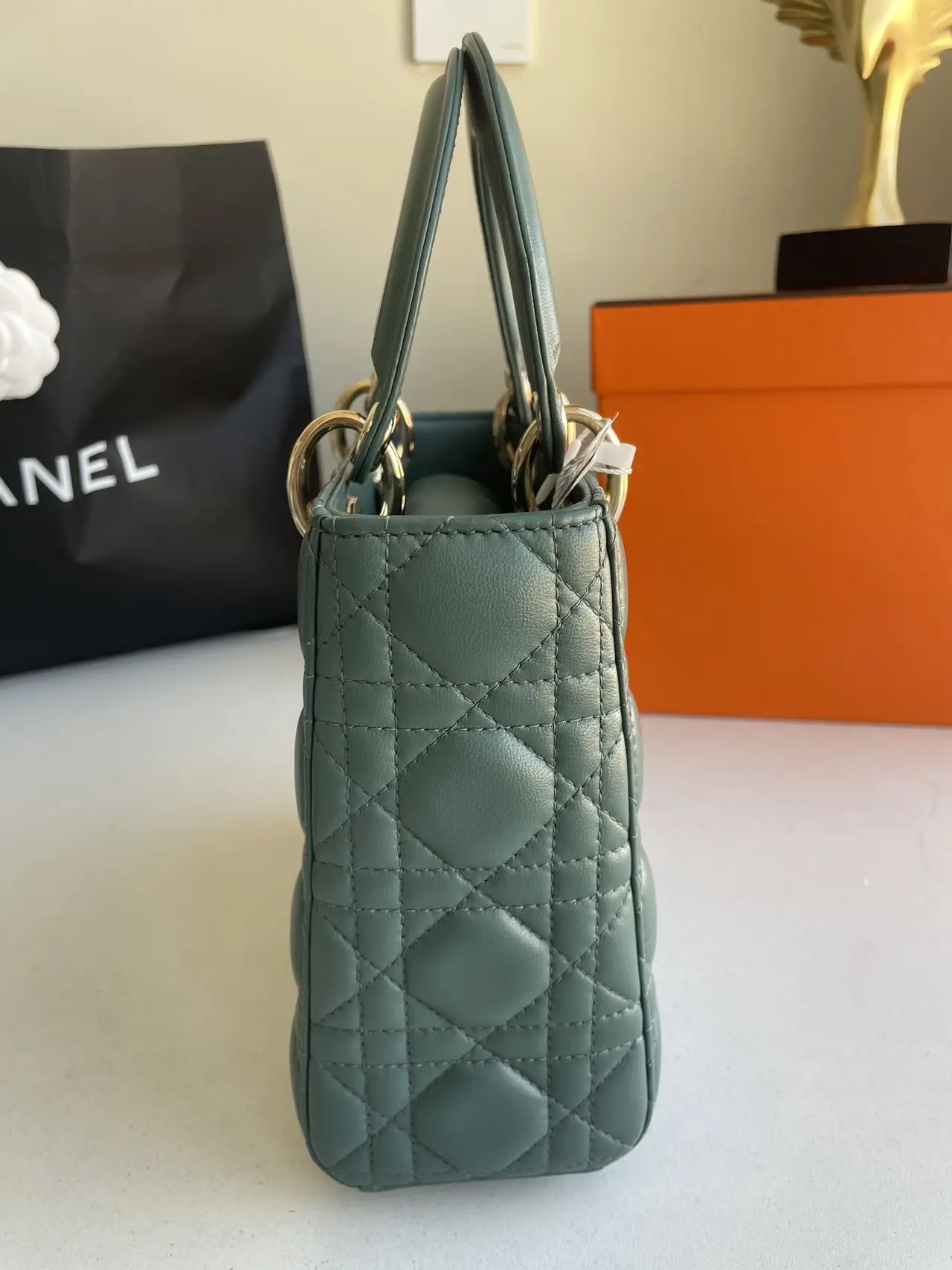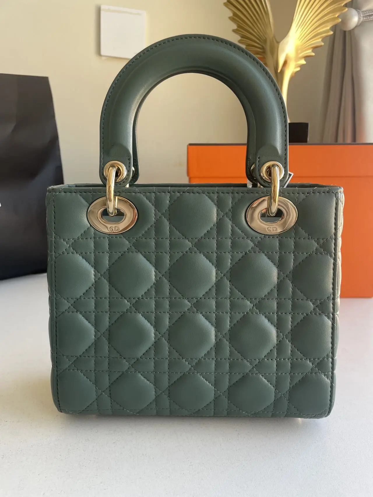 The DIOR Small Lady Dior Bag in green lambskin with gold-tone hardware embodies fresh elegance, its vibrant hue showcasing the iconic Cannage quilting and polished ‘D.I.O.R.’ charms for a timeless yet modern statement.