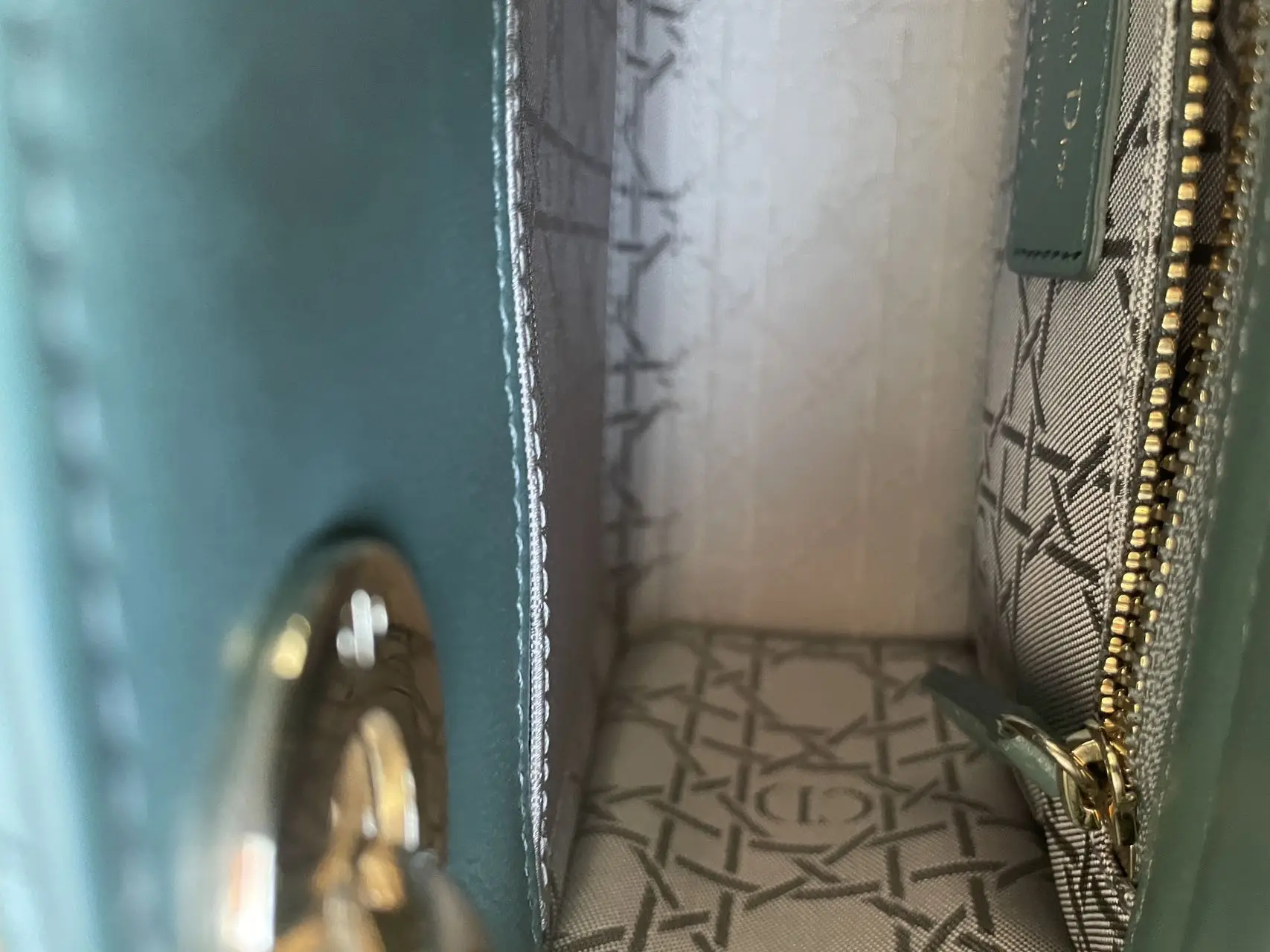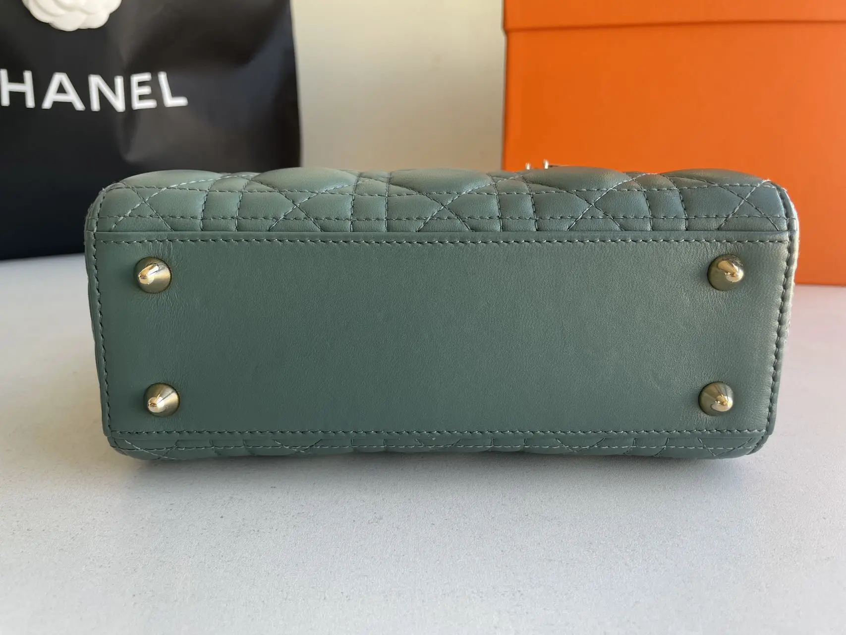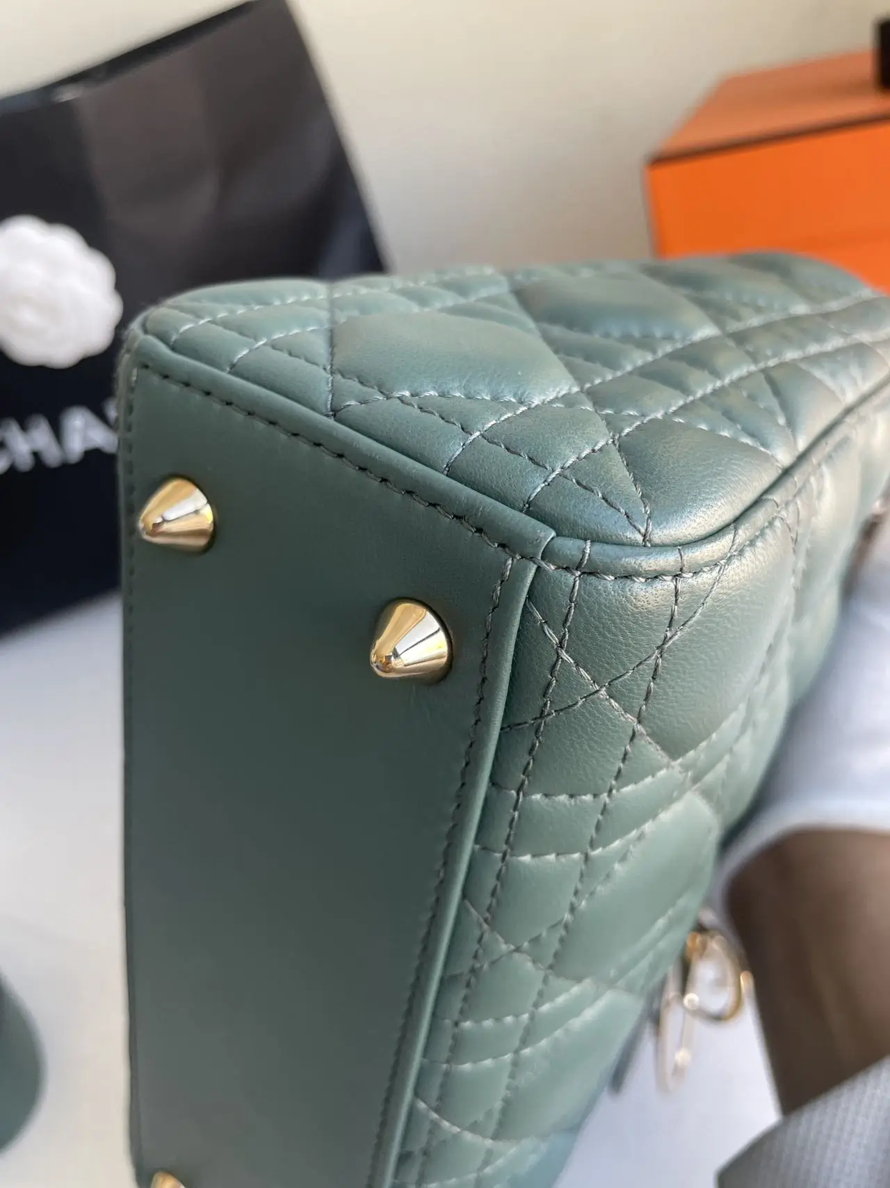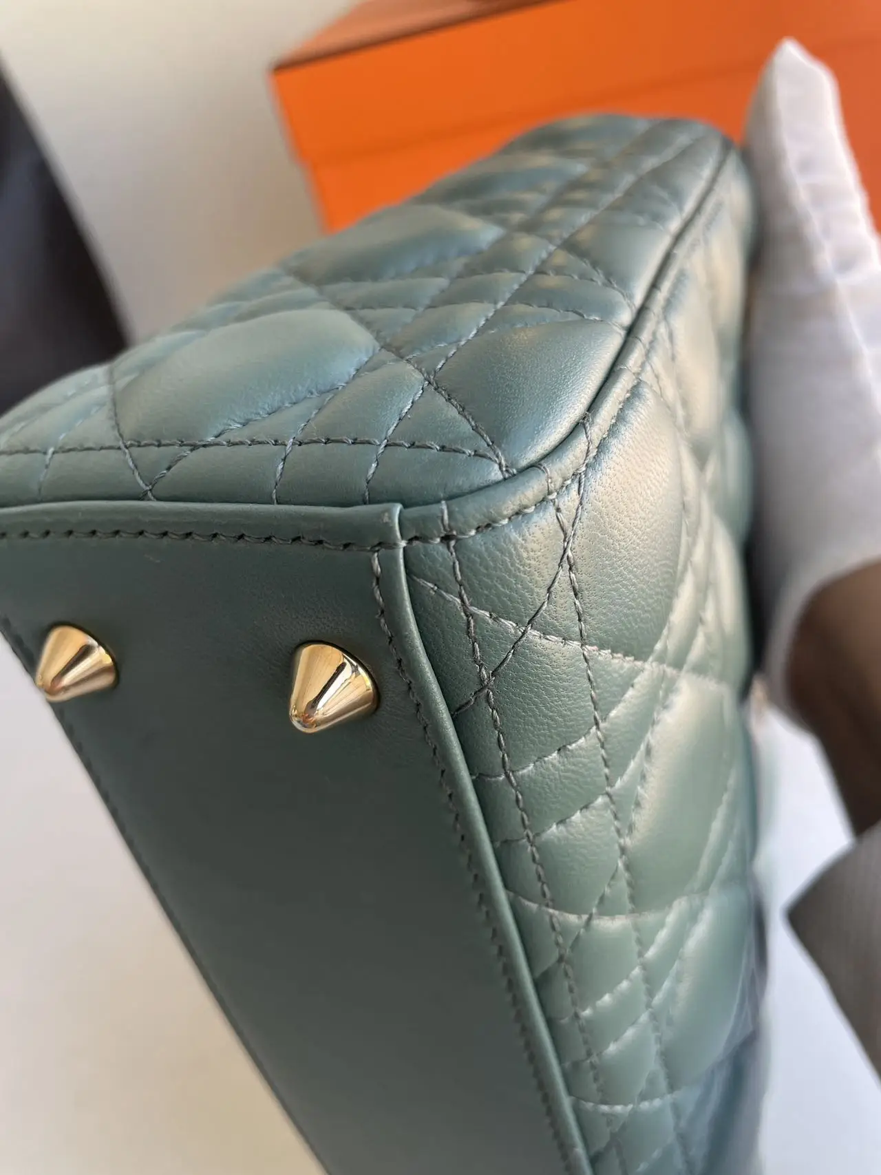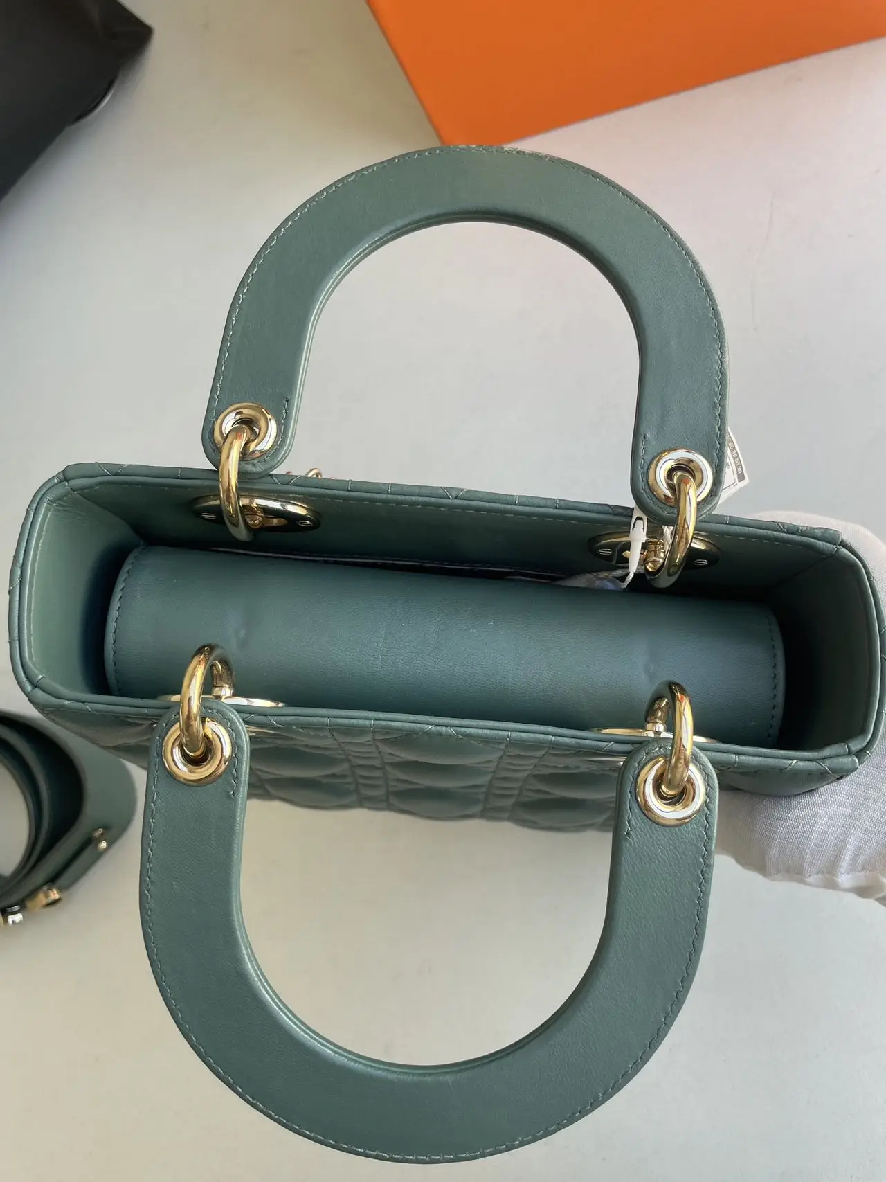 The DIOR Small Lady Dior Bag in green lambskin with gold-tone hardware embodies fresh elegance, its vibrant hue showcasing the iconic Cannage quilting and polished ‘D.I.O.R.’ charms for a timeless yet modern statement.