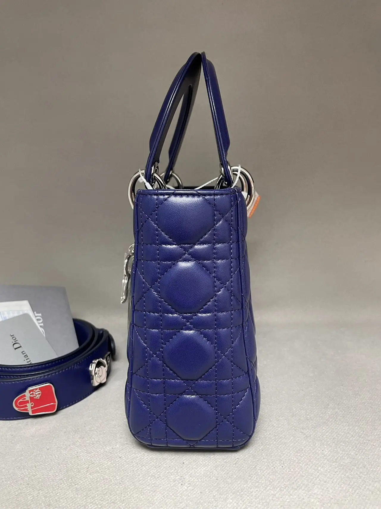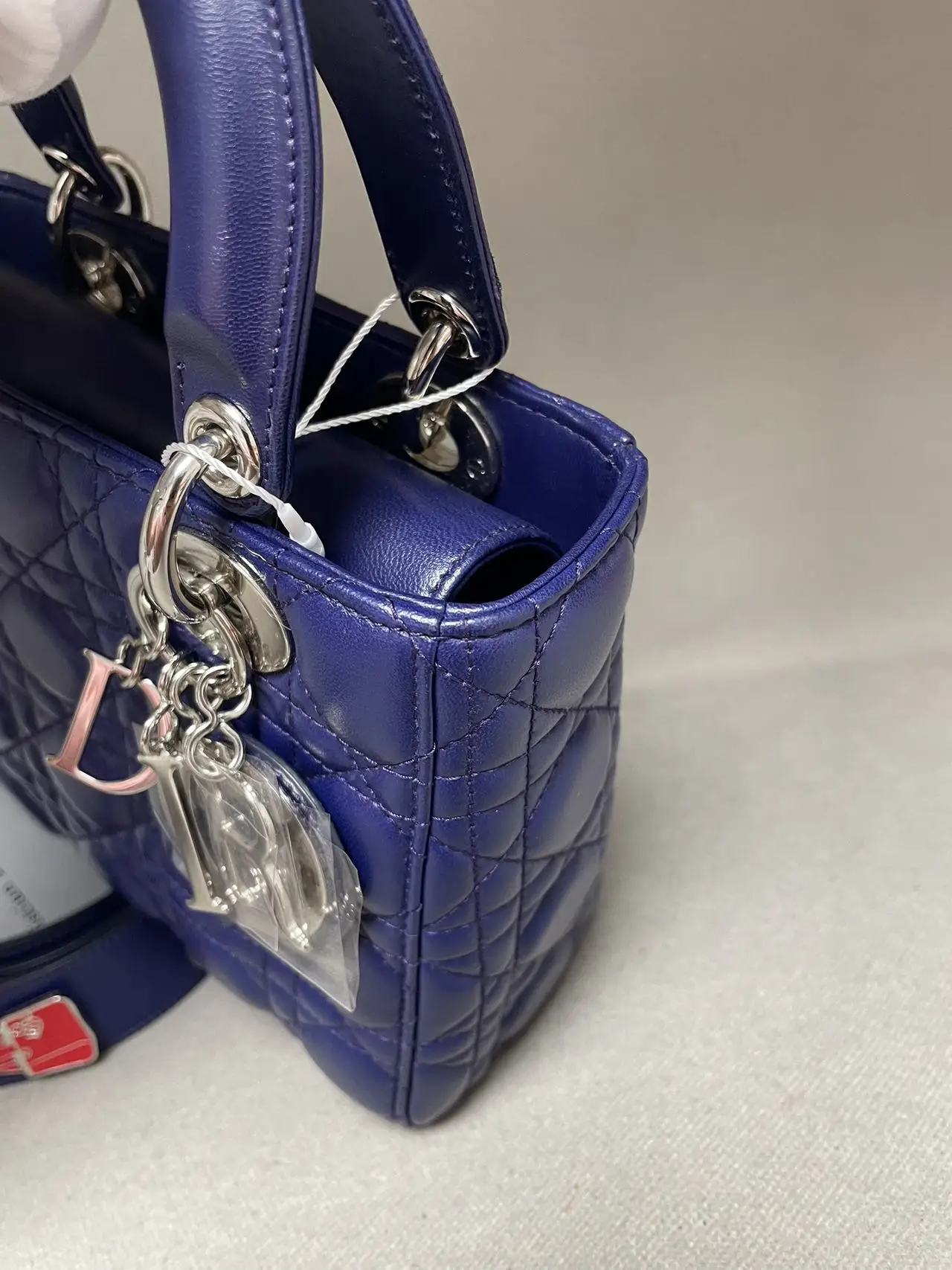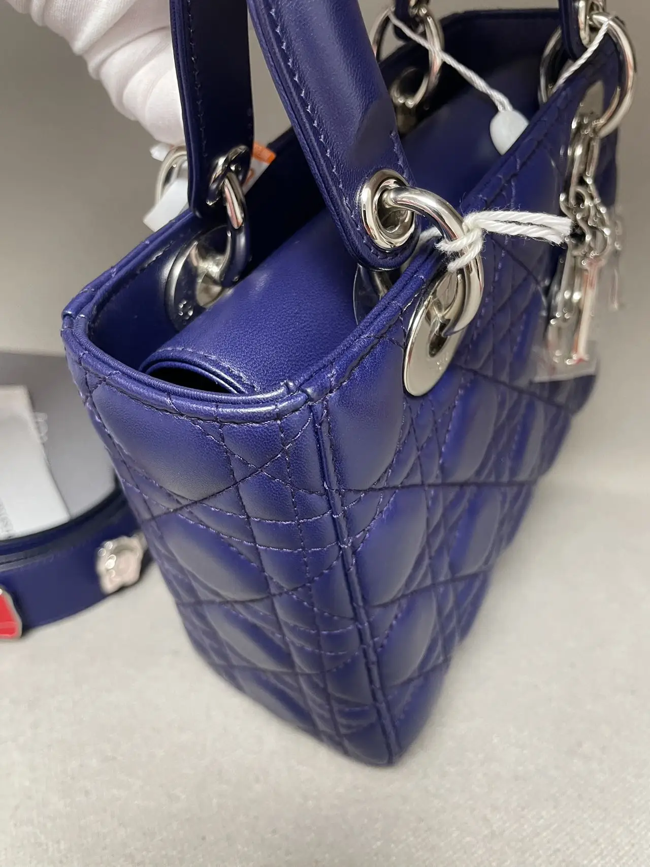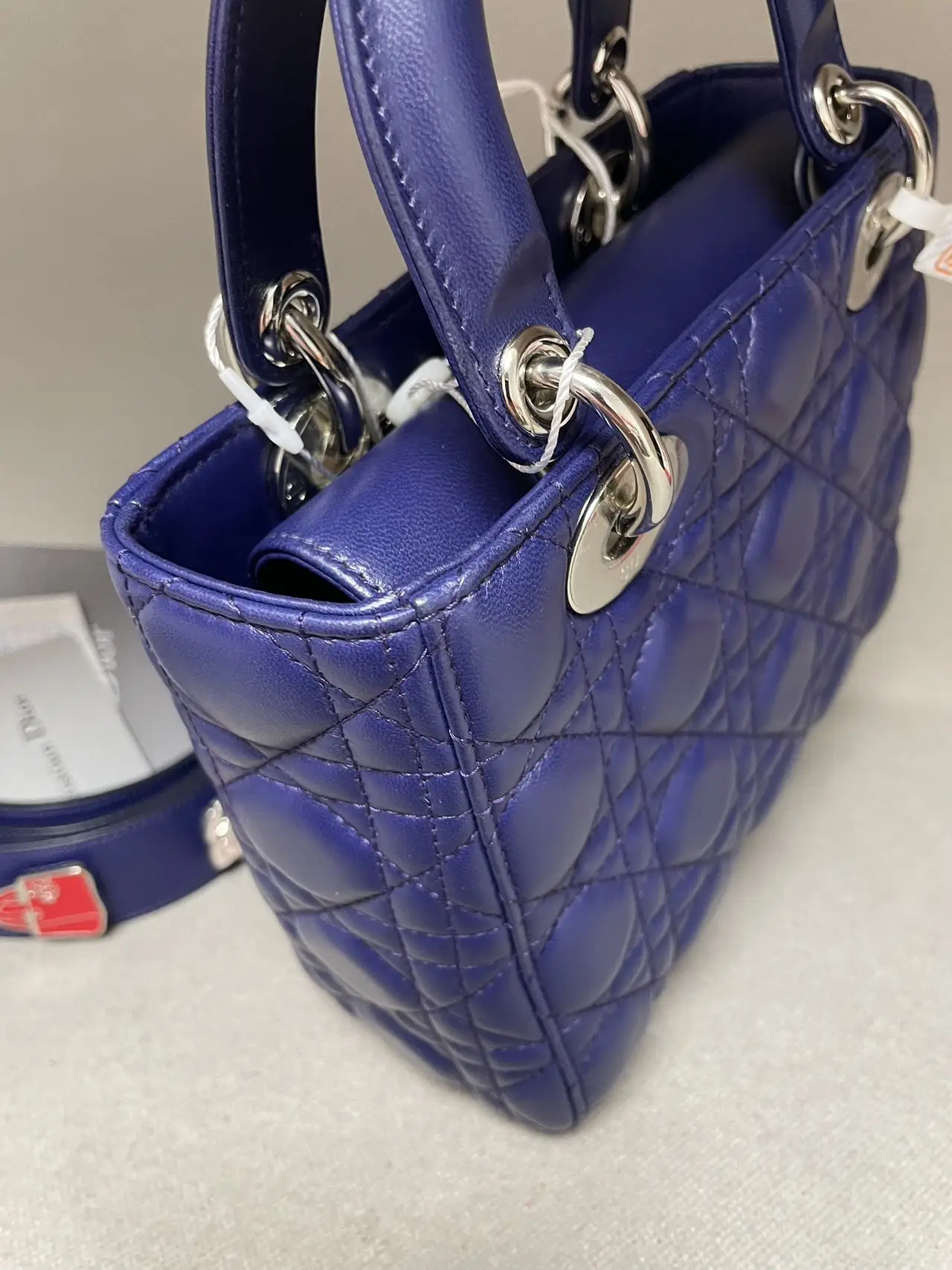 The DIOR Small Lady Dior Bag in purple lambskin is a vibrant statement of contemporary elegance, where the rich jewel tone accentuates the iconic Cannage quilting and polished ‘D.I.O.R.’ charms, offering a perfect blend of timeless design and modern allure.