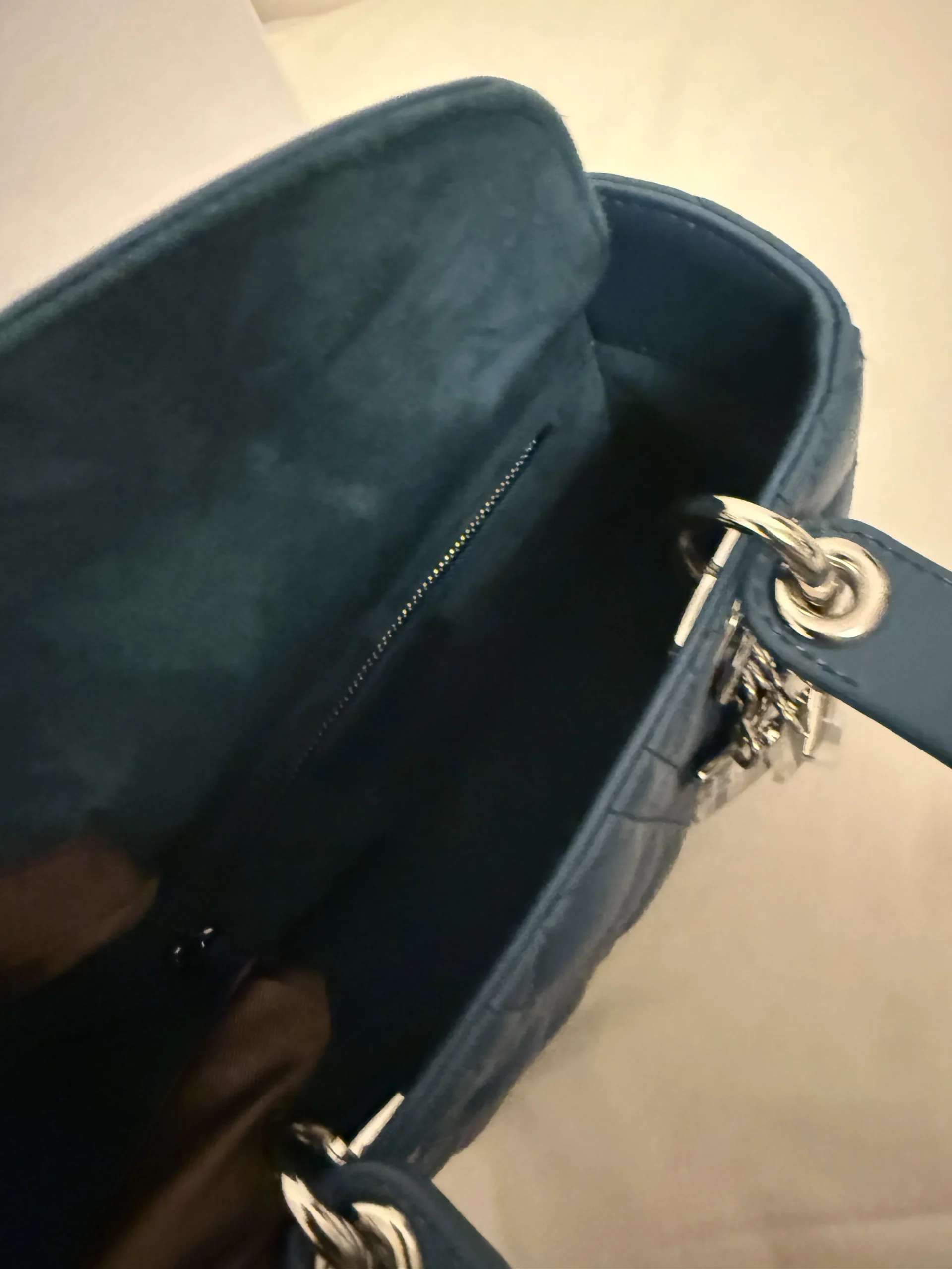 The Dior My ABC Lady Bag in steel blue lambskin is a refined and contemporary take on an iconic design. Finished in a stunning jade-blue tone, the soft quilted lambskin showcases Dior’s signature Cannage stitching beautifully. This new-generation ABC Lady Bag features a customised shoulder strap with three interchangeable decorative badges, allowing for a personalised look. The small size is elegant yet practical, perfect for both day and evening wear. Available at under half the original retail price, this is the UK’s lowest-priced small My ABC Lady Bag in near-new condition.