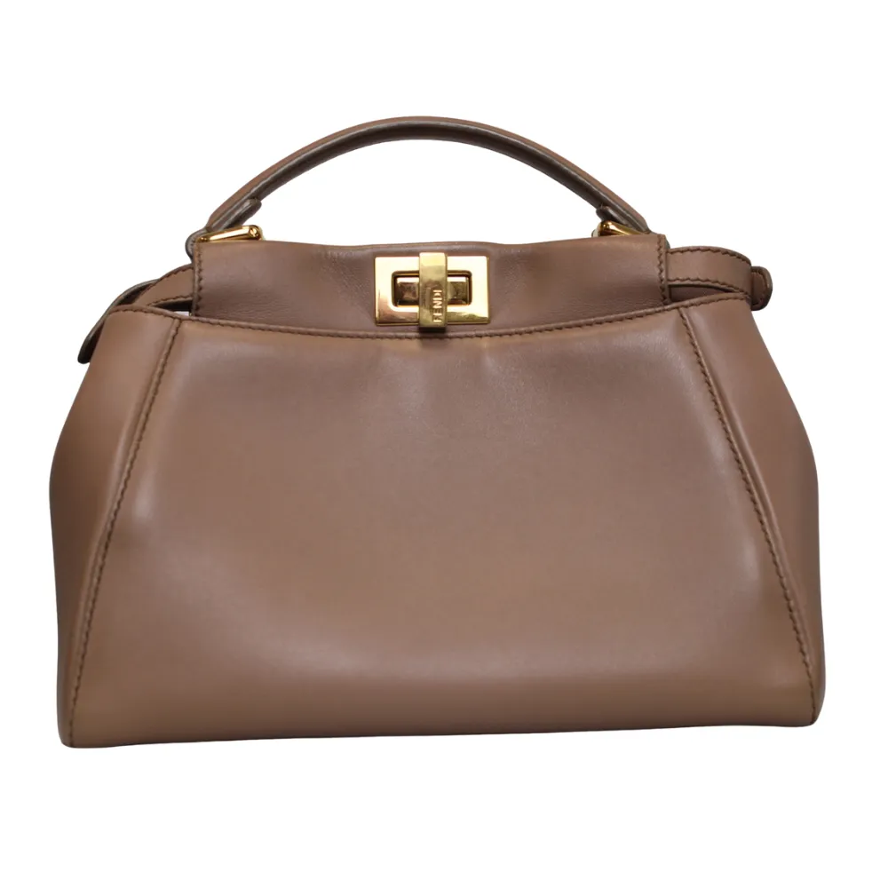 Iconic small Peekaboo bag, made of sand-colored leather and embellished with the classic twist lock on both sides. Features a fabric lining with a jacquard FF motif, a bar bound in leather, two interior compartments separated by a stiff partition, an inner zip pocket, and gold-finish metalware. The bag can be carried by hand or worn either on the shoulder or cross-body thanks to the handle and adjustable, detachable shoulder strap.