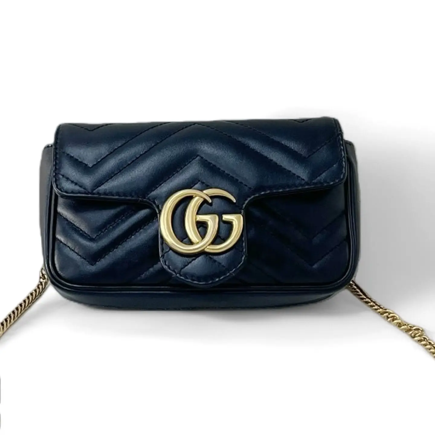 A new introduction to the GG Marmont line for Cruise 2019, the small GG Marmont top handle bag has a softly structured shape and an oversized flap closure with Double G hardware. Equipped with a leather top handle and chain shoulder strap, made in matelassé chevron leather with a heart on the back.