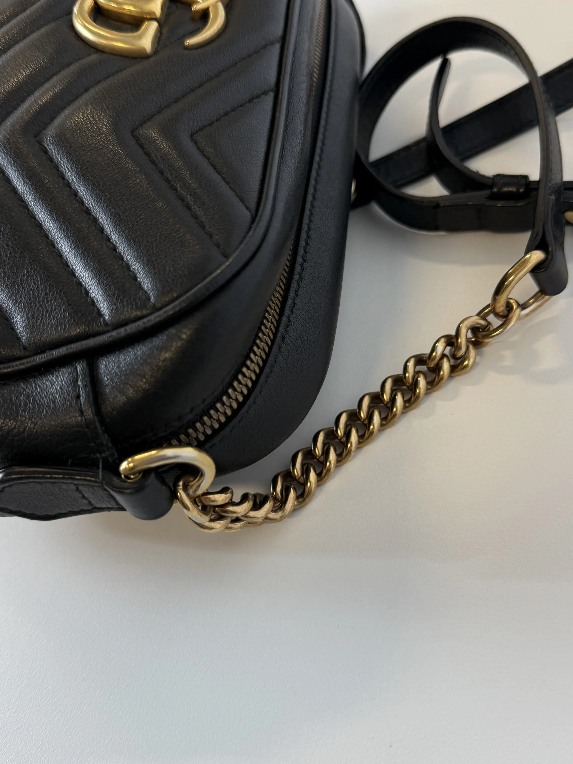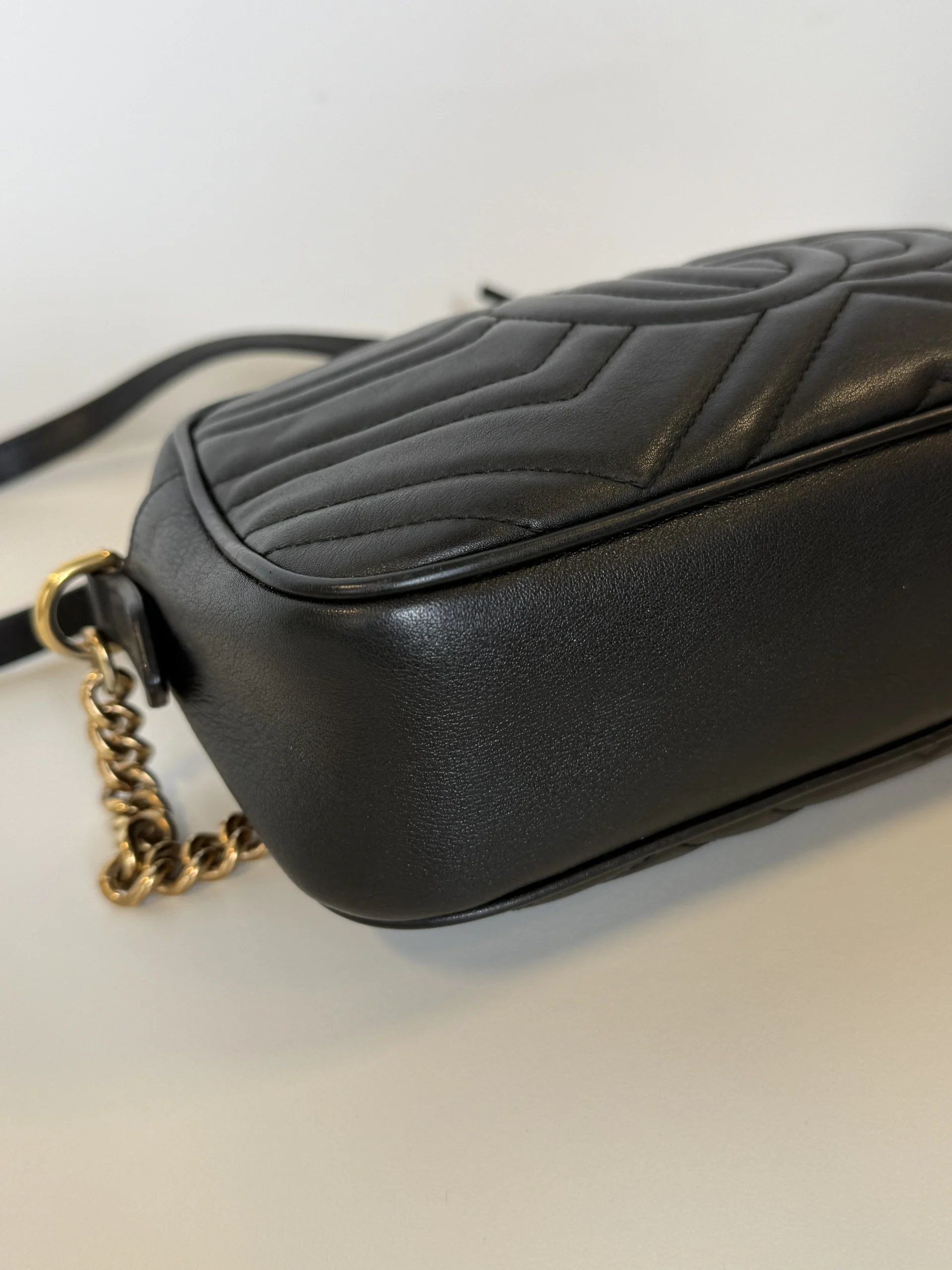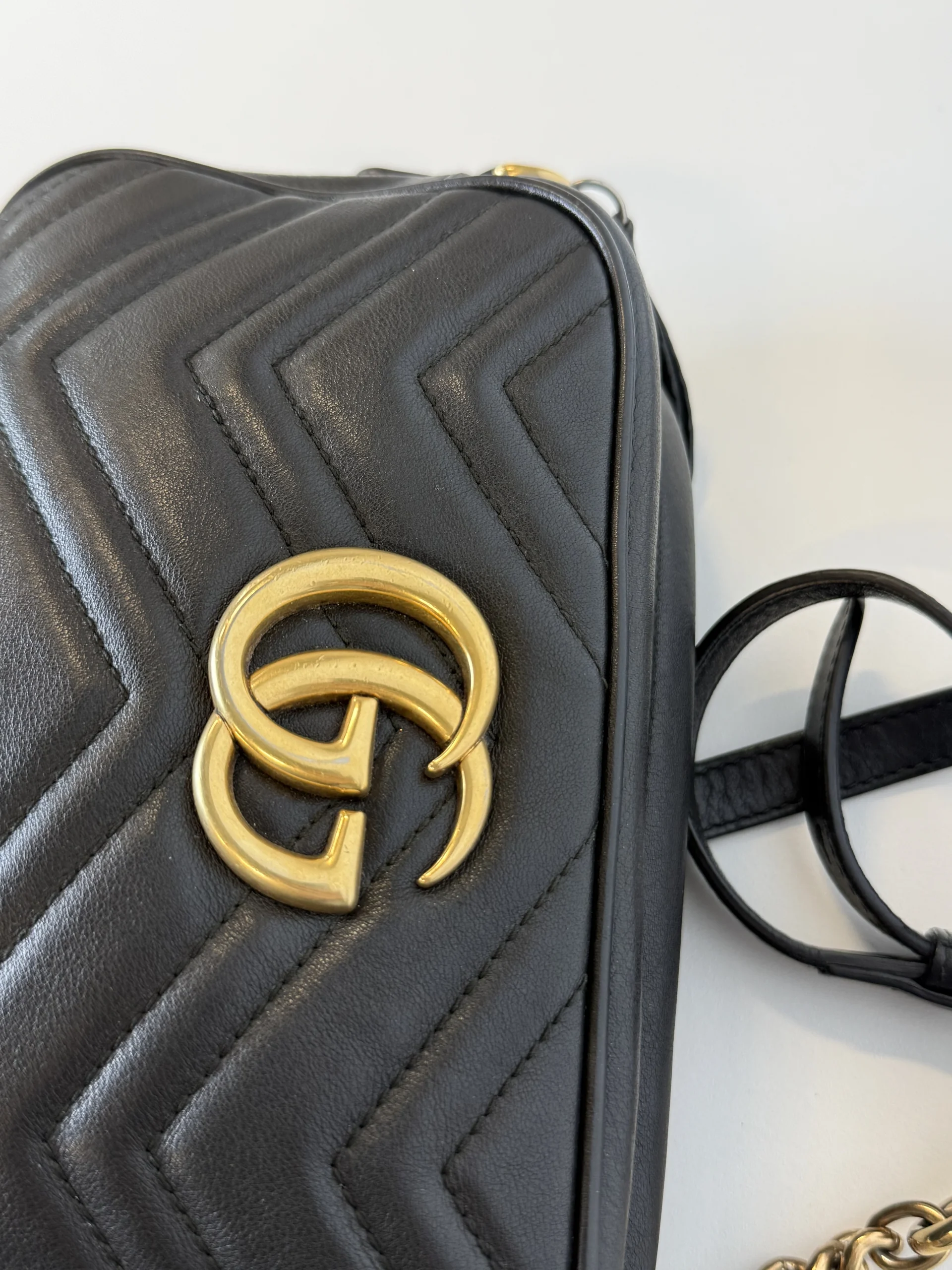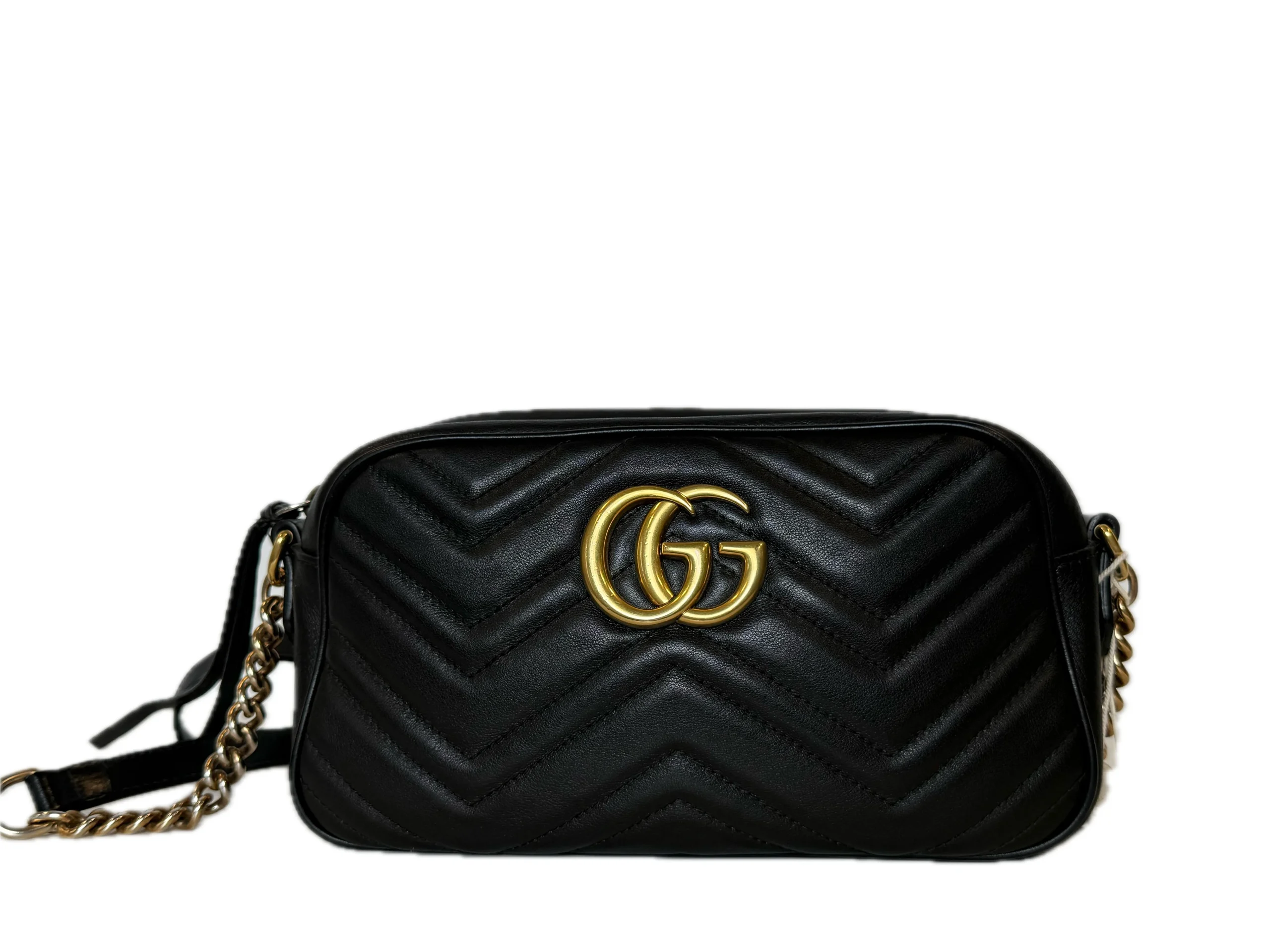 The Small GG Marmont chain shoulder bag, a signature collection of the House, features the emblematic Double G, a faceted chain strap, and contemporary silhouettes. The new camera bag highlights fine craftsmanship with exceptionally supple leather and intricate hardware details in light gold-toned finish.