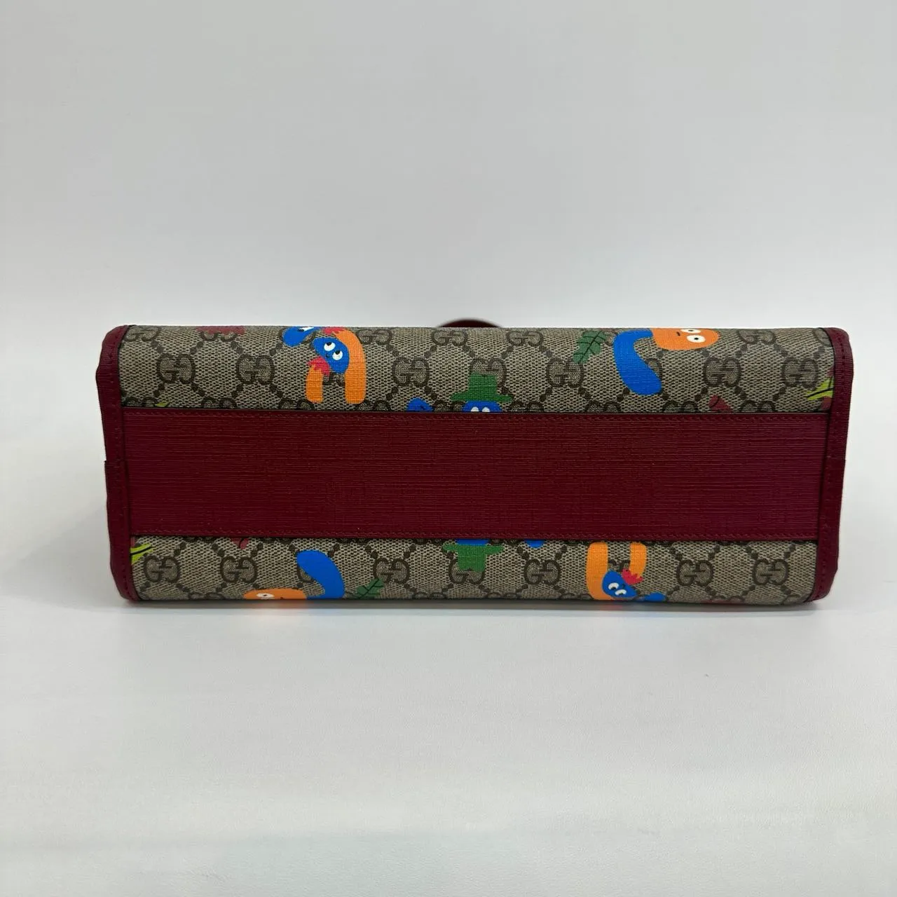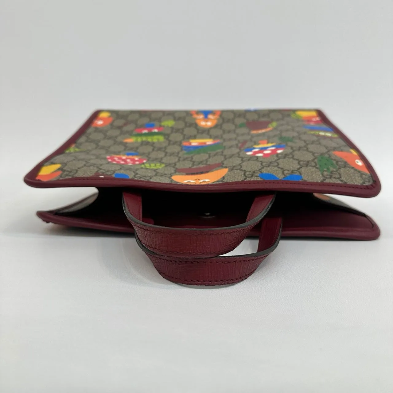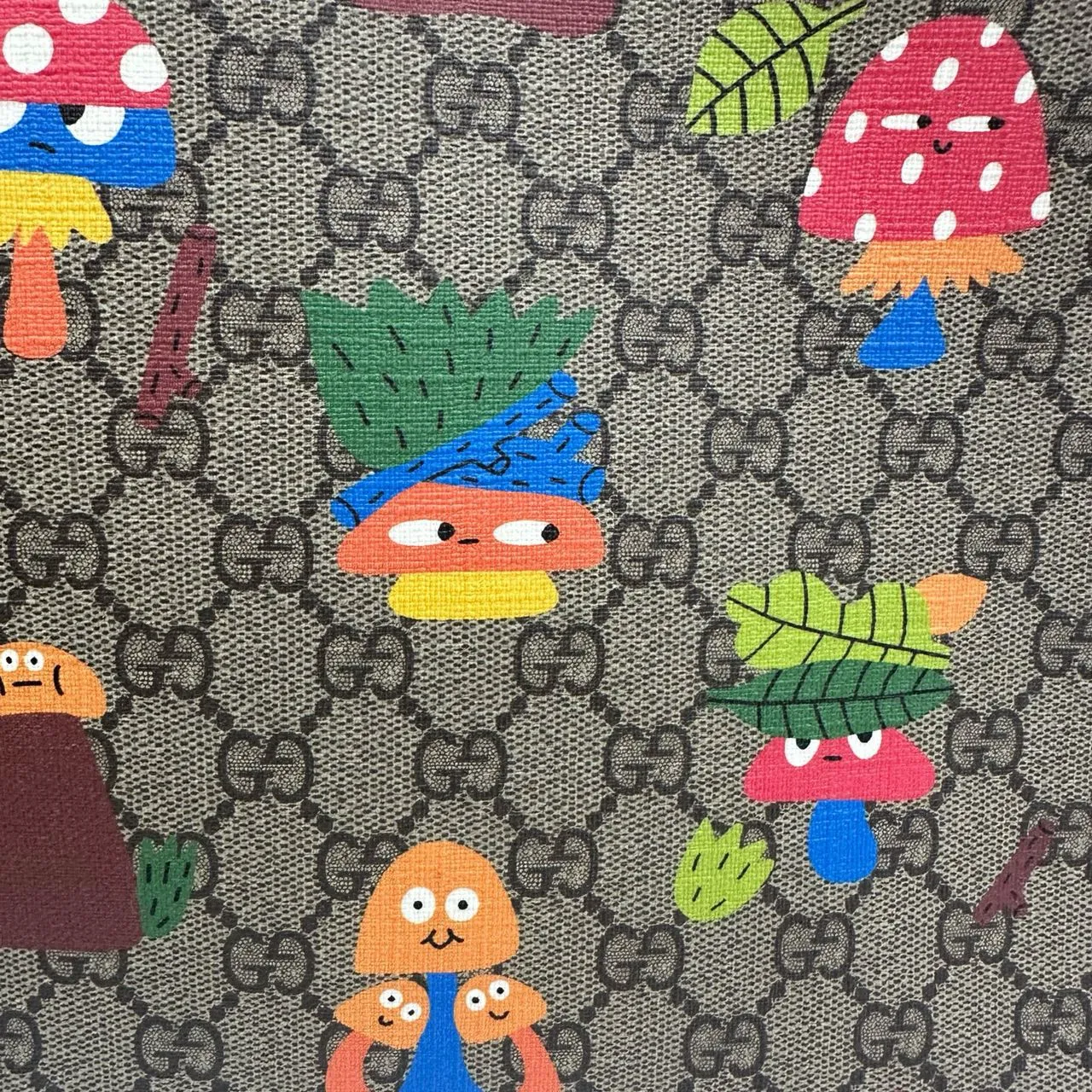 GUCCI Kids’ GG Printed Mushroom Woodland Tote with Red Handle – a playful yet practical tote bag for little adventurers. Crafted from beige and ebony GG Supreme canvas, it features a charming woodland characters print and a vibrant red handle. Durable, lightweight, and perfect for everyday use.