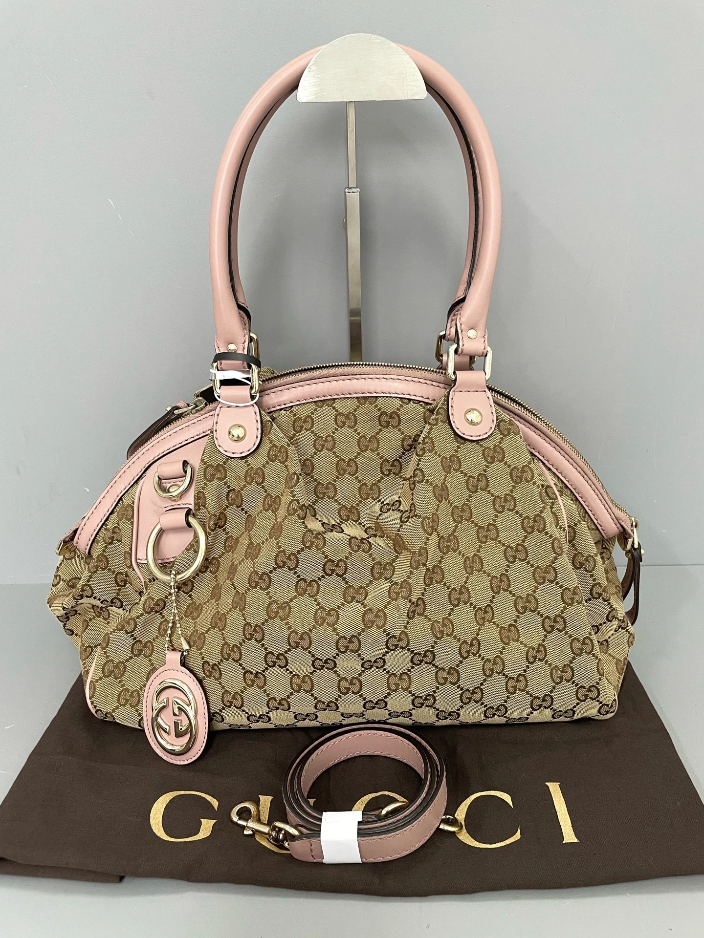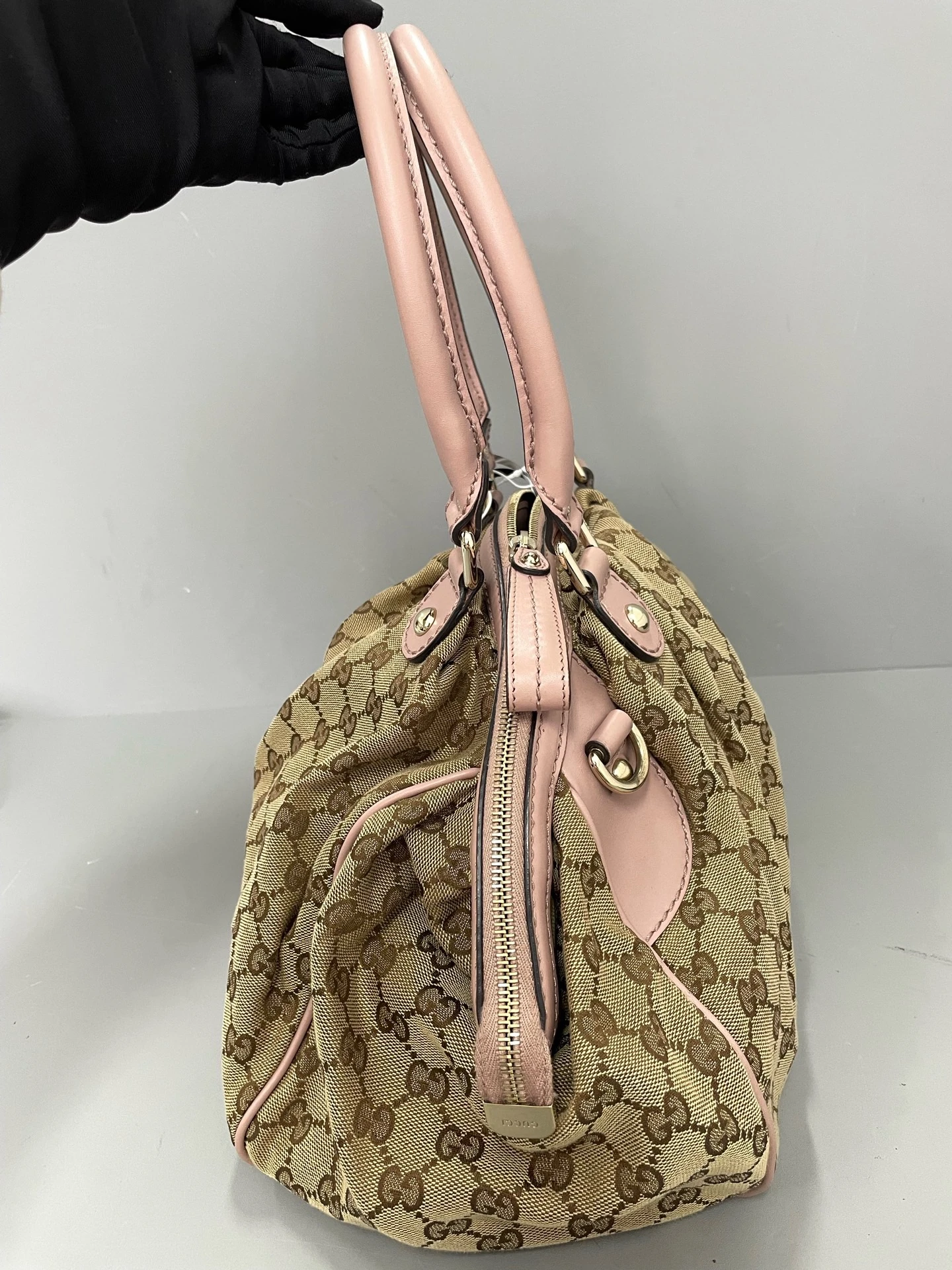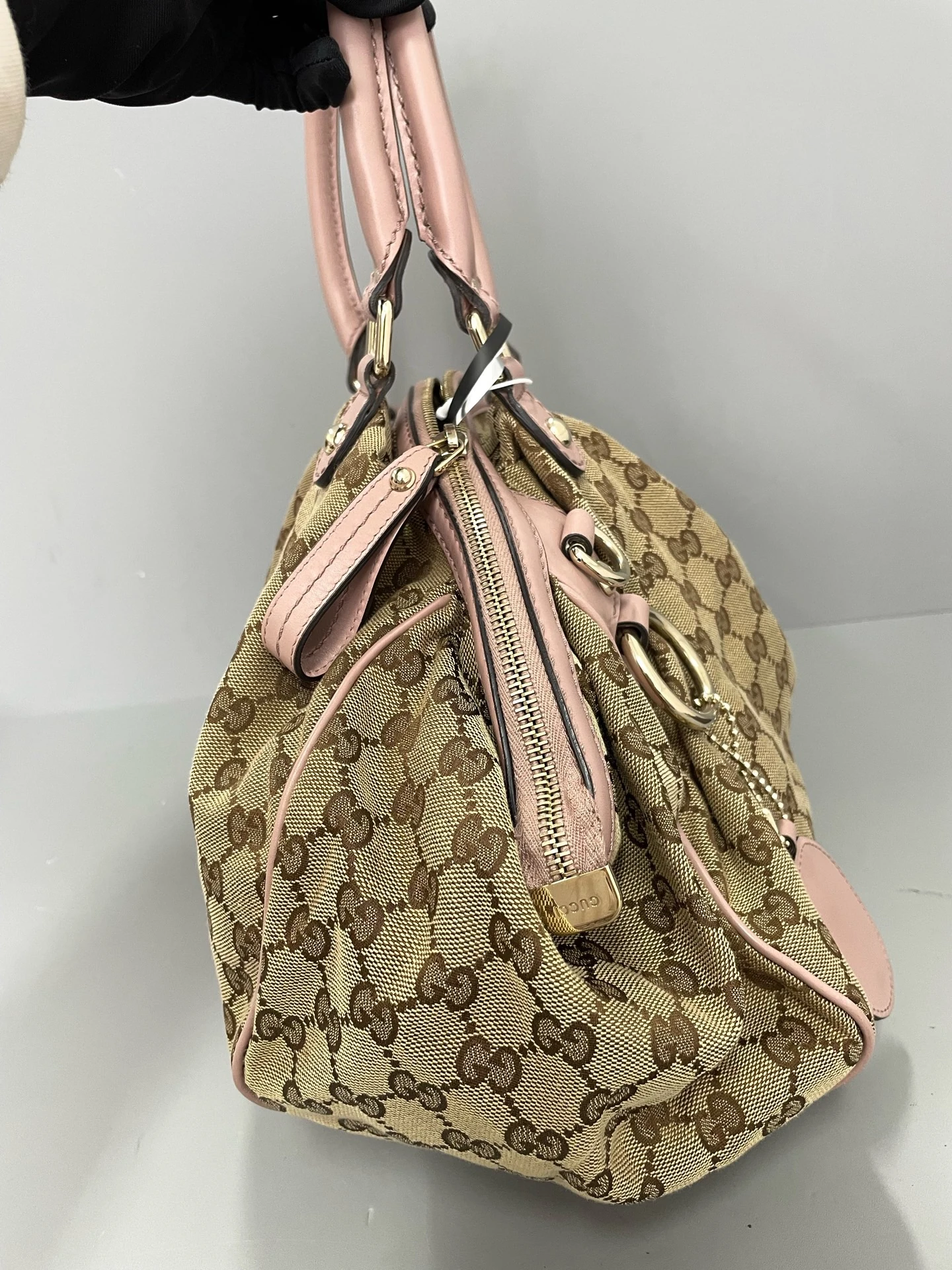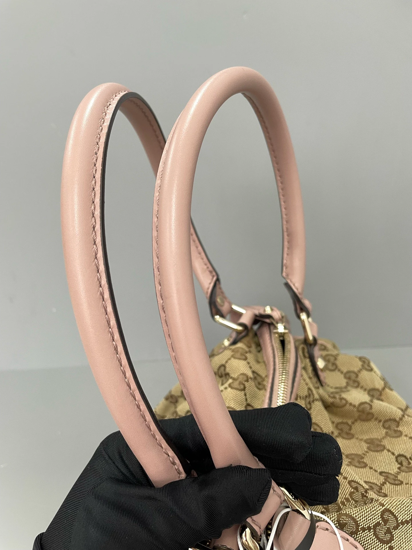 Gucci Sukey Medium Boston Top Handle Pink GG Canvas Bag is a timeless everyday piece combining practicality with classic Gucci elegance.Crafted from signature GG canvas with soft pink leather trim, this structured Boston-style bag offers a spacious interior ideal for daily essentials. The curved silhouette is complemented by gold-tone hardware and the iconic interlocking GG charm, adding a refined yet feminine touch. Designed with both top handles and a detachable strap, it can be worn as a handbag or crossbody for versatile styling.