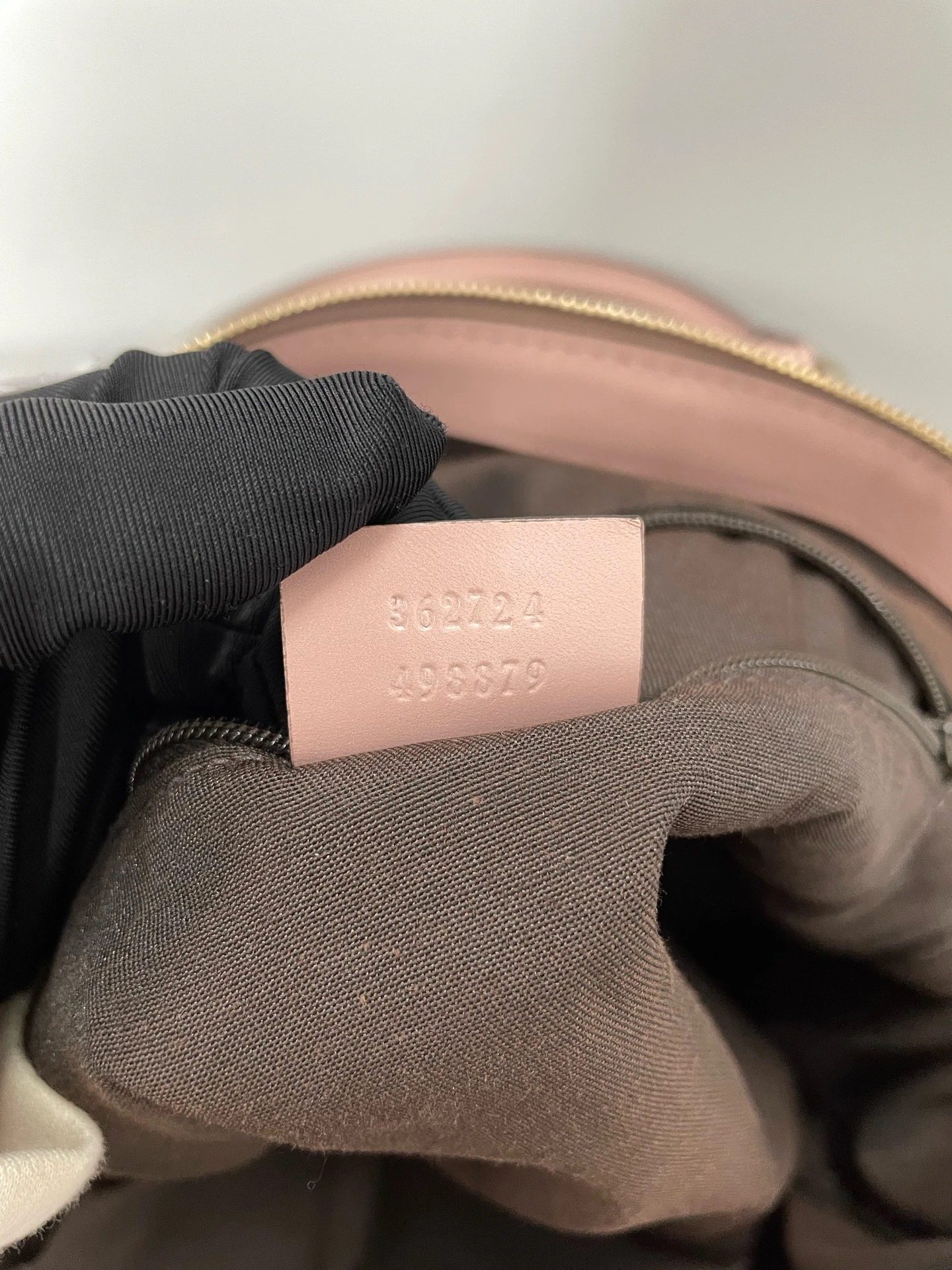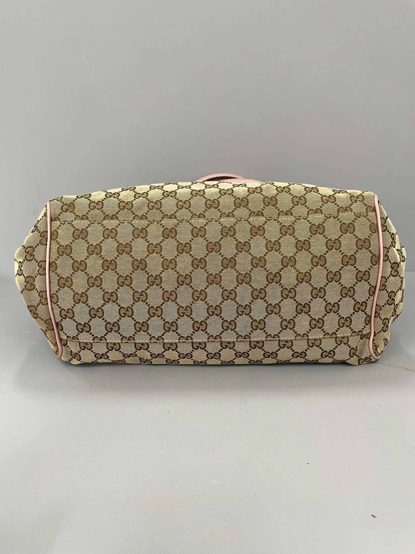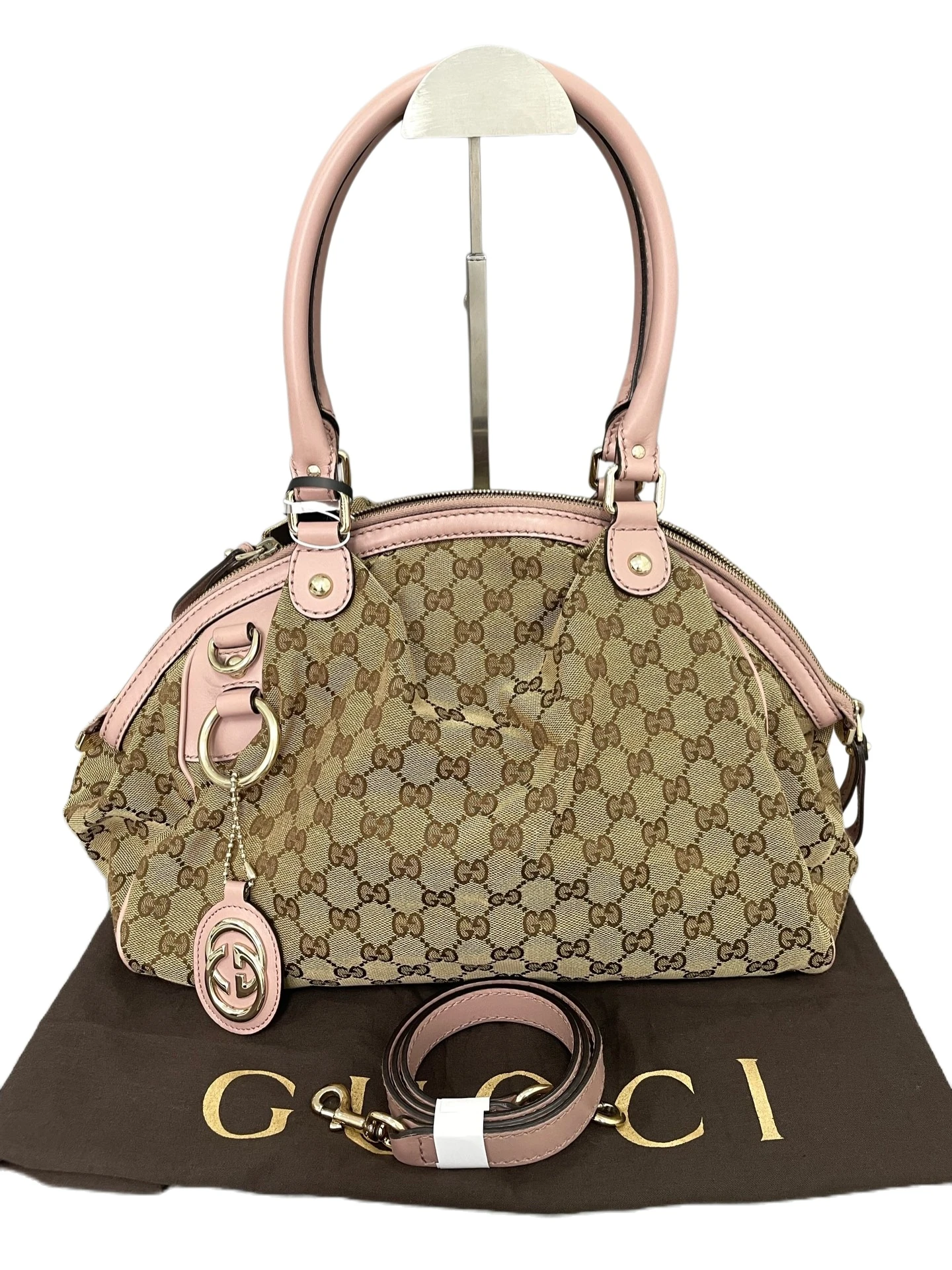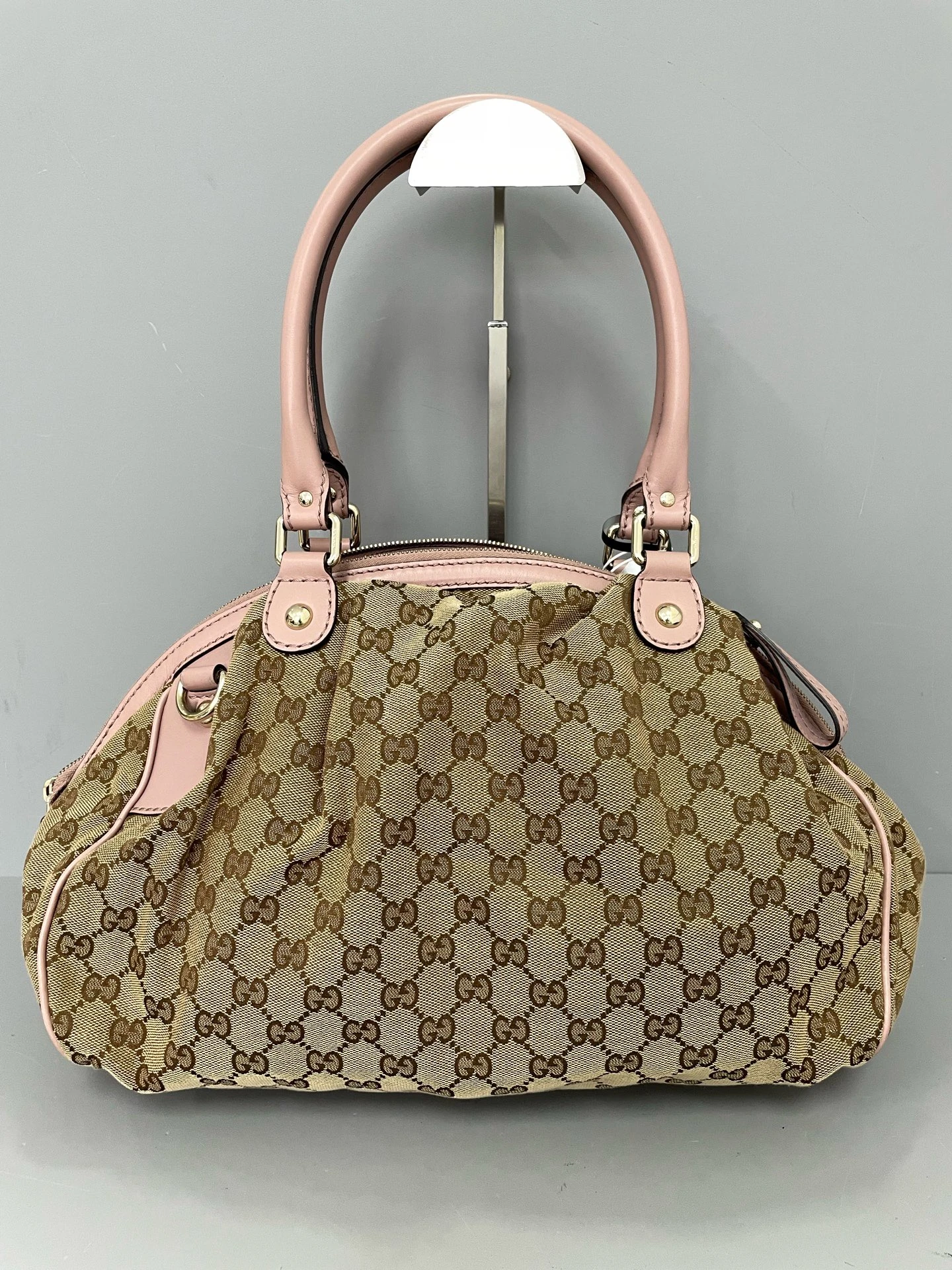Gucci Sukey Medium Boston Top Handle Pink GG Canvas Bag is a timeless everyday piece combining practicality with classic Gucci elegance.Crafted from signature GG canvas with soft pink leather trim, this structured Boston-style bag offers a spacious interior ideal for daily essentials. The curved silhouette is complemented by gold-tone hardware and the iconic interlocking GG charm, adding a refined yet feminine touch. Designed with both top handles and a detachable strap, it can be worn as a handbag or crossbody for versatile styling.