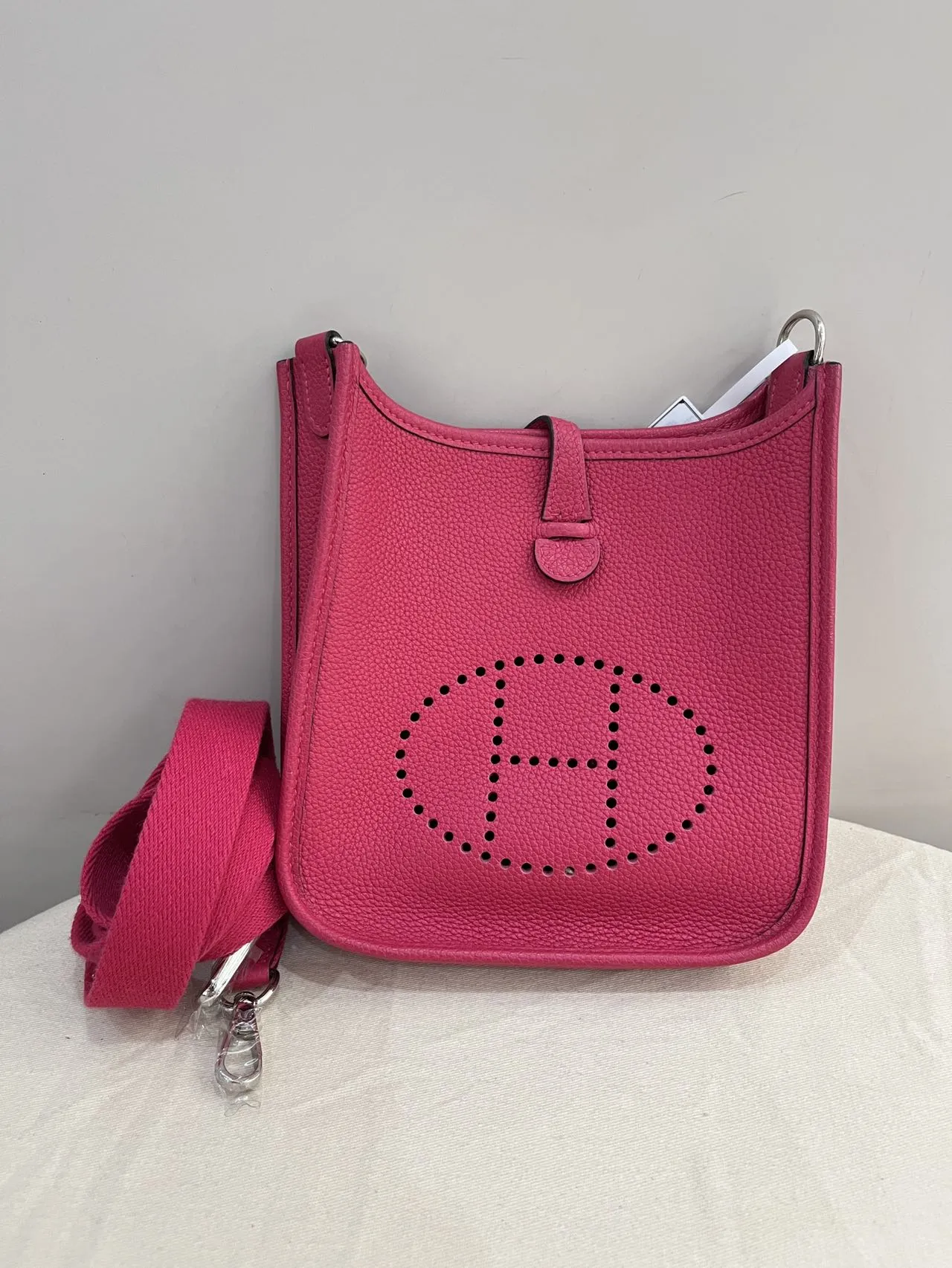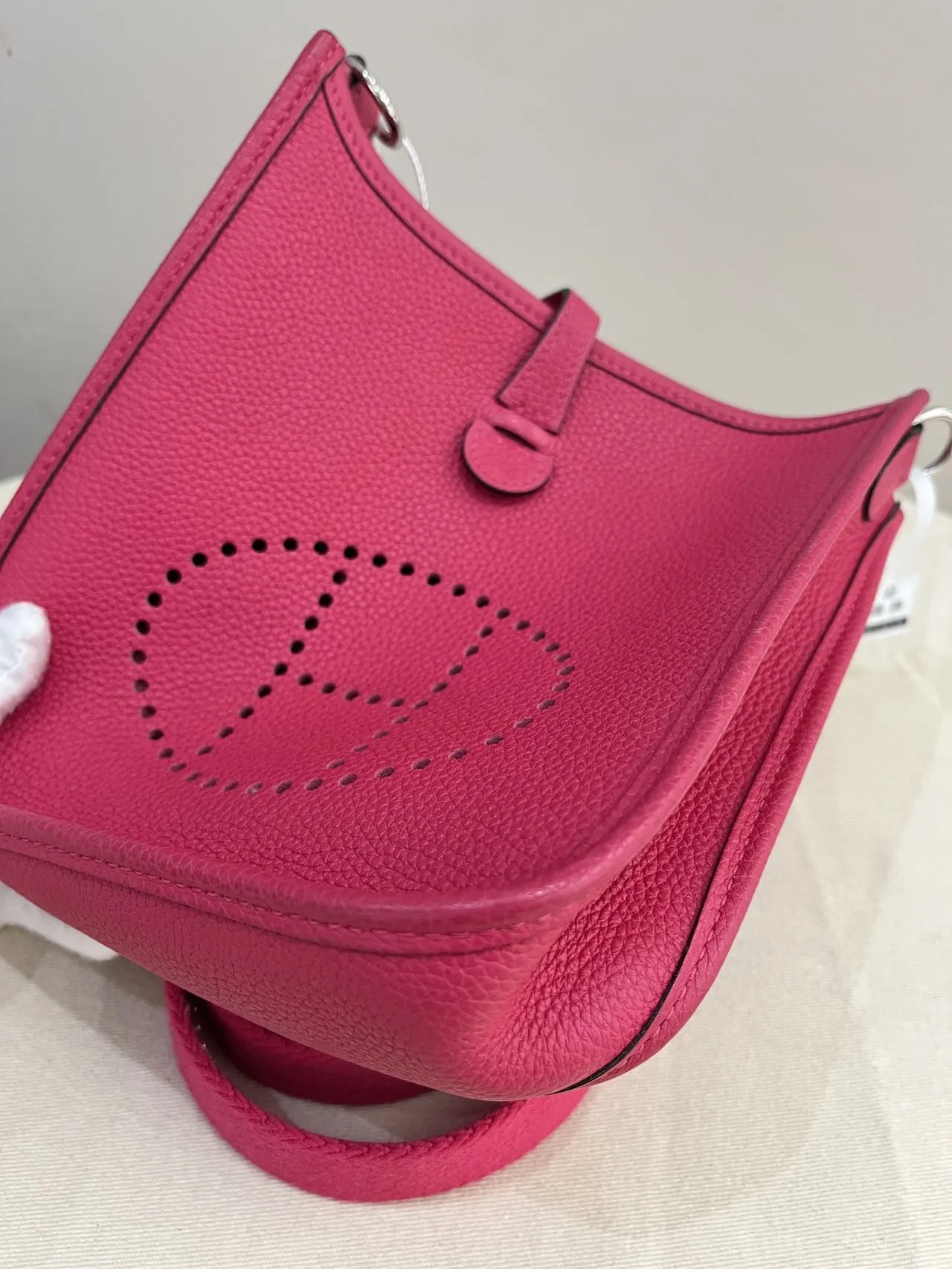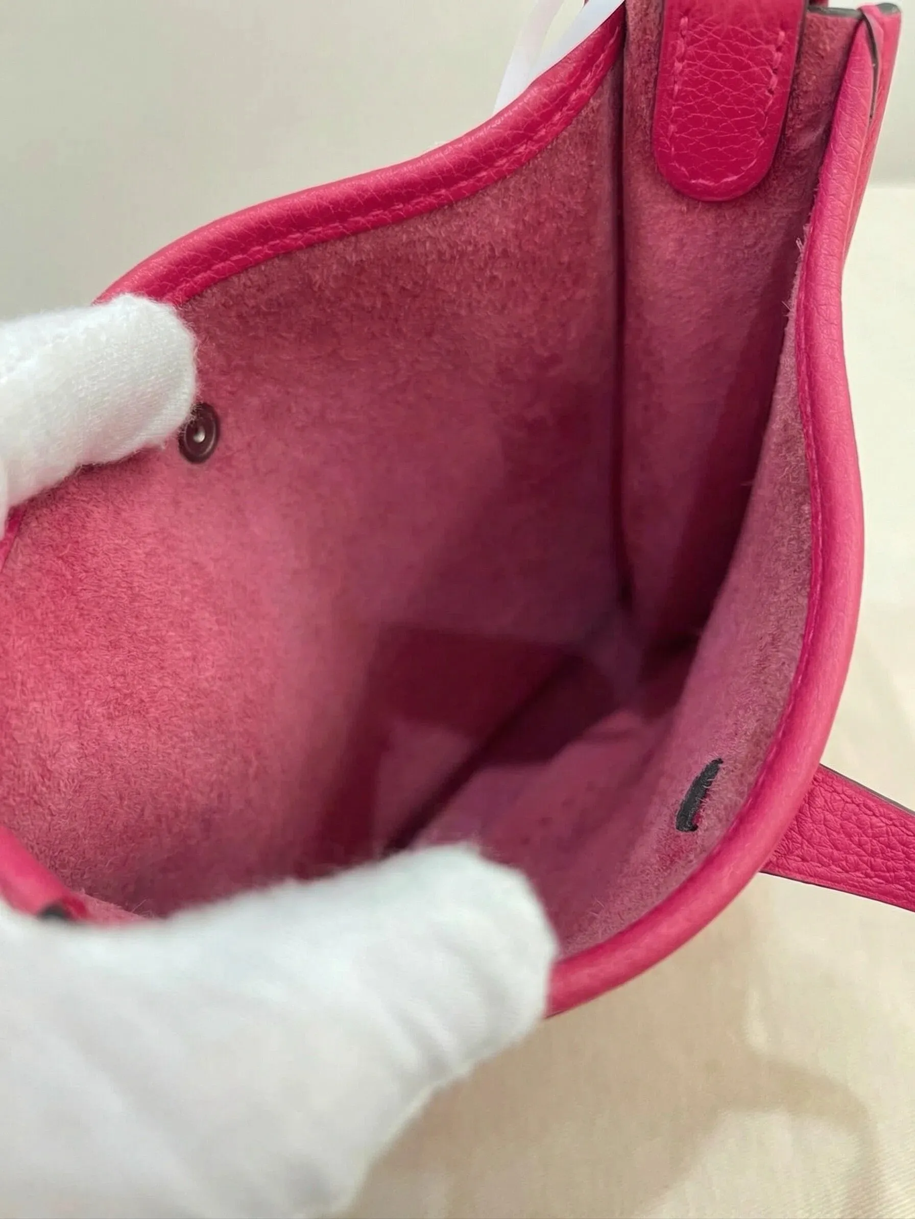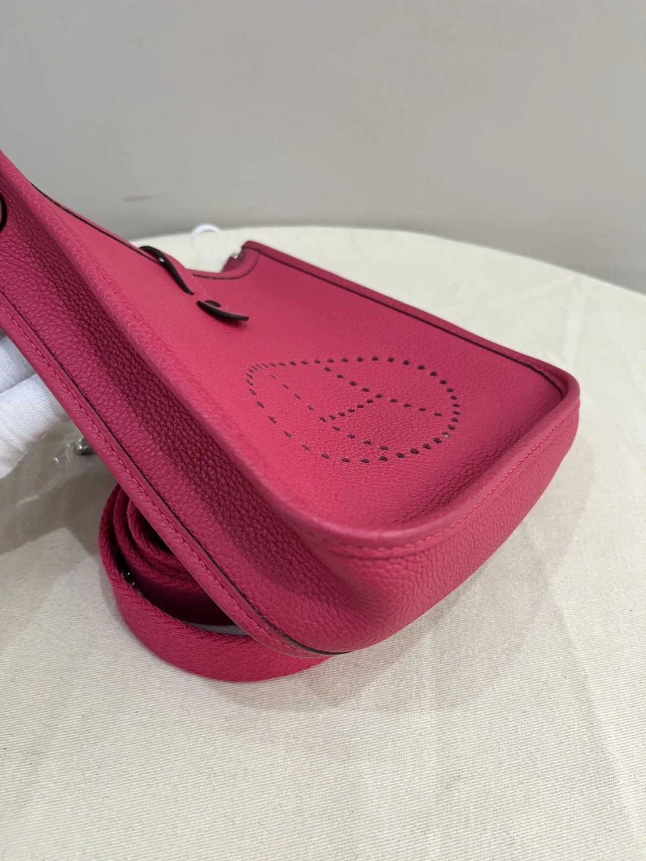 The Hermès Evelyne TPM 16 in Rose Pink Clemence leather with palladium hardware is a timeless casual-chic crossbody bag. Featuring the iconic perforated “H” logo and an adjustable canvas strap, it offers effortless elegance and everyday practicality.